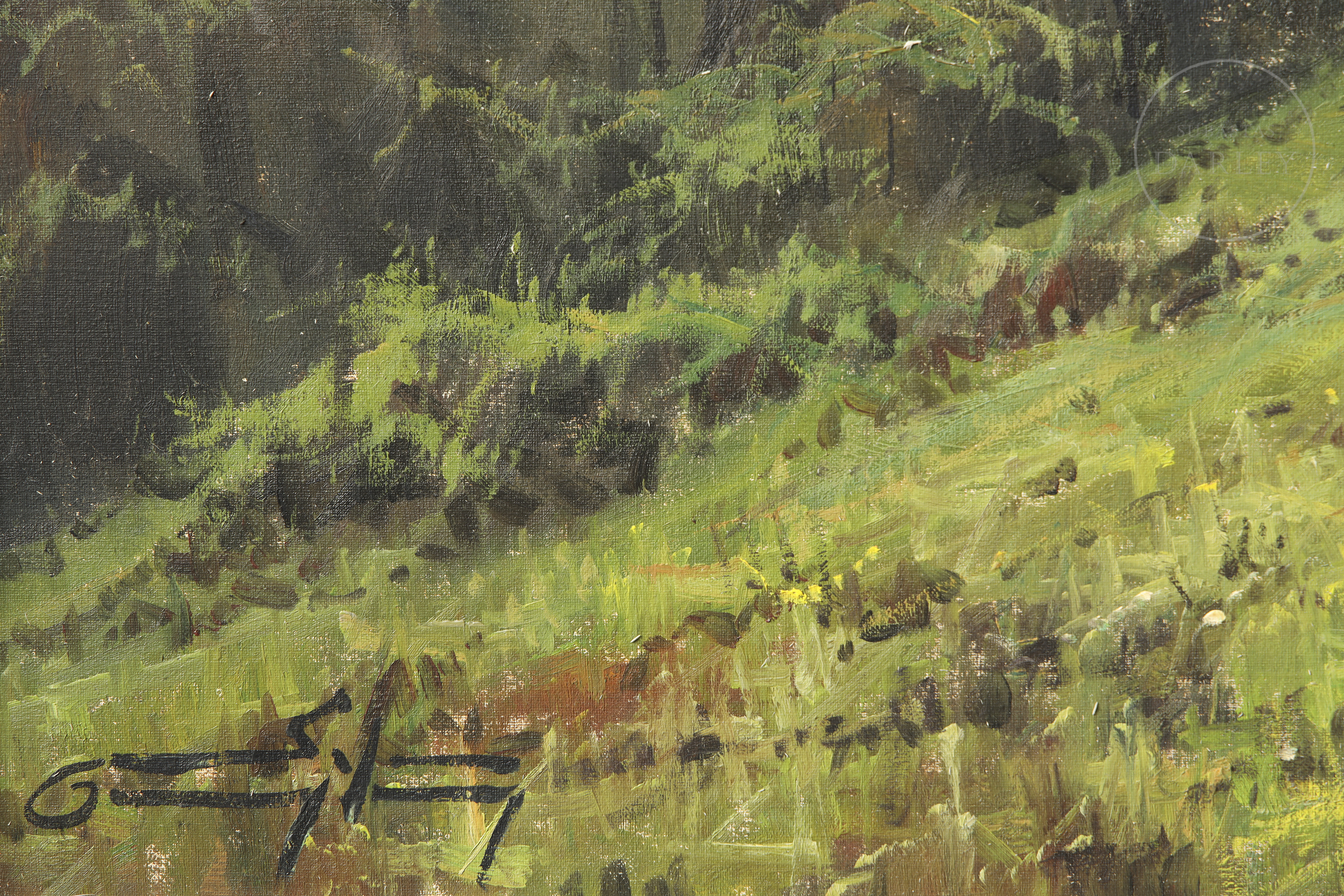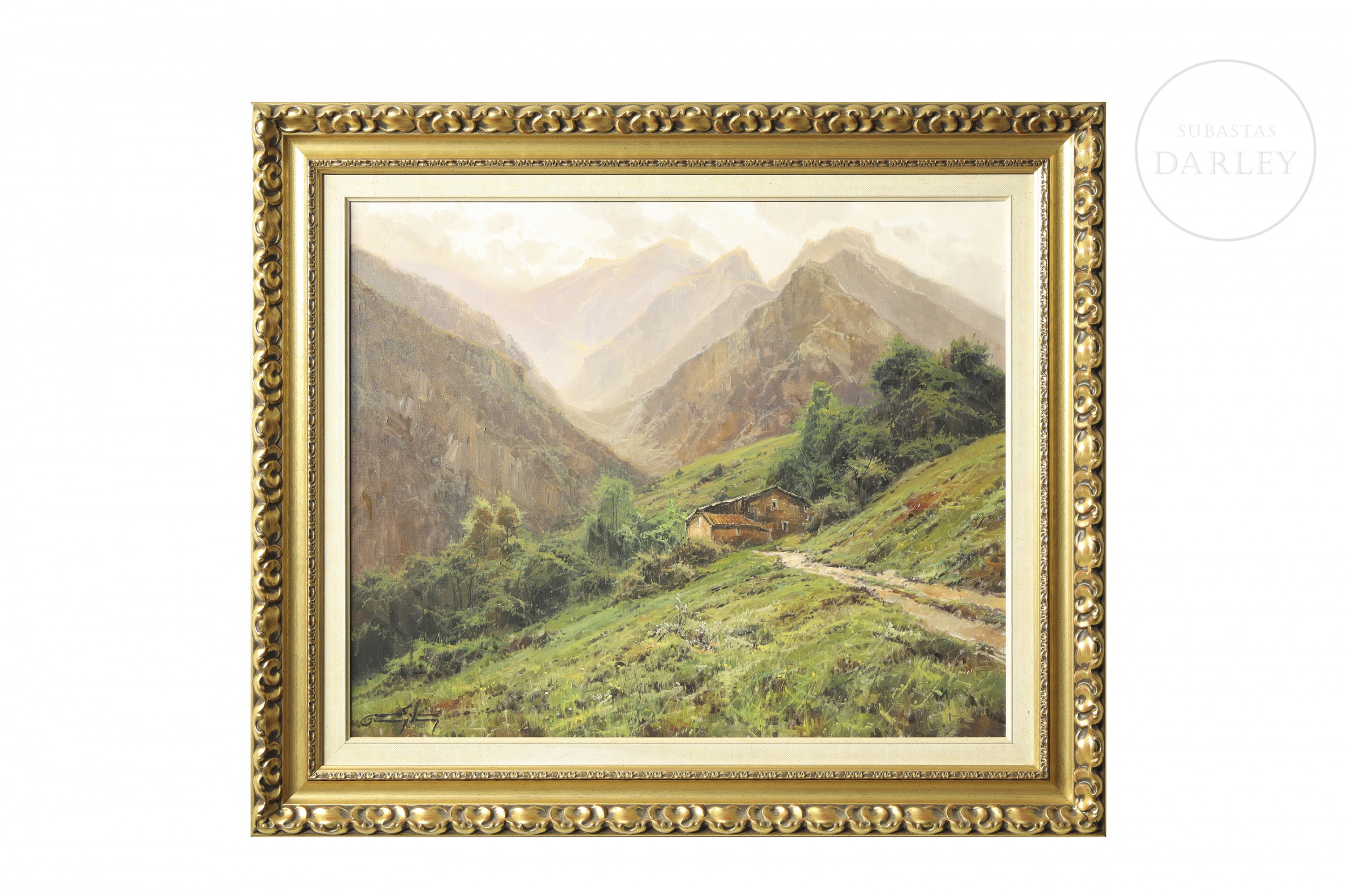 Óleo sobre lienzo. Vigoroso paisaje que ofrece una vista panorámica de un valle. En la lejanía se divisa una casa a los pies de las montañas. Firmado "Solé González" en la esquina inferior izquierda.