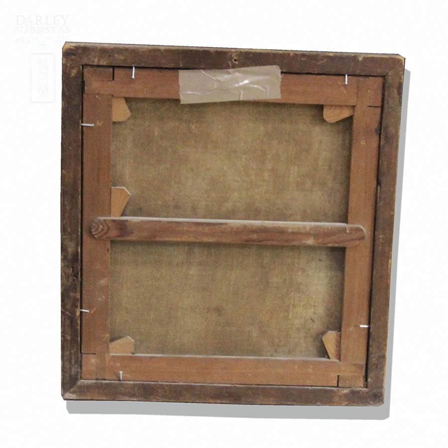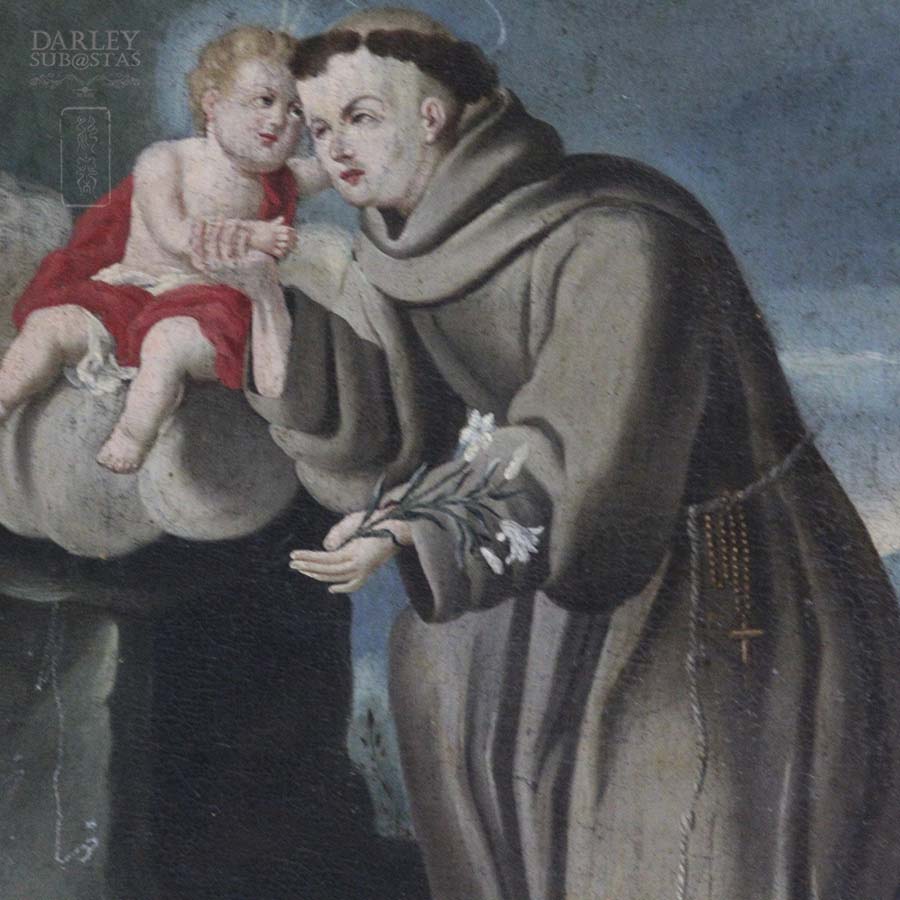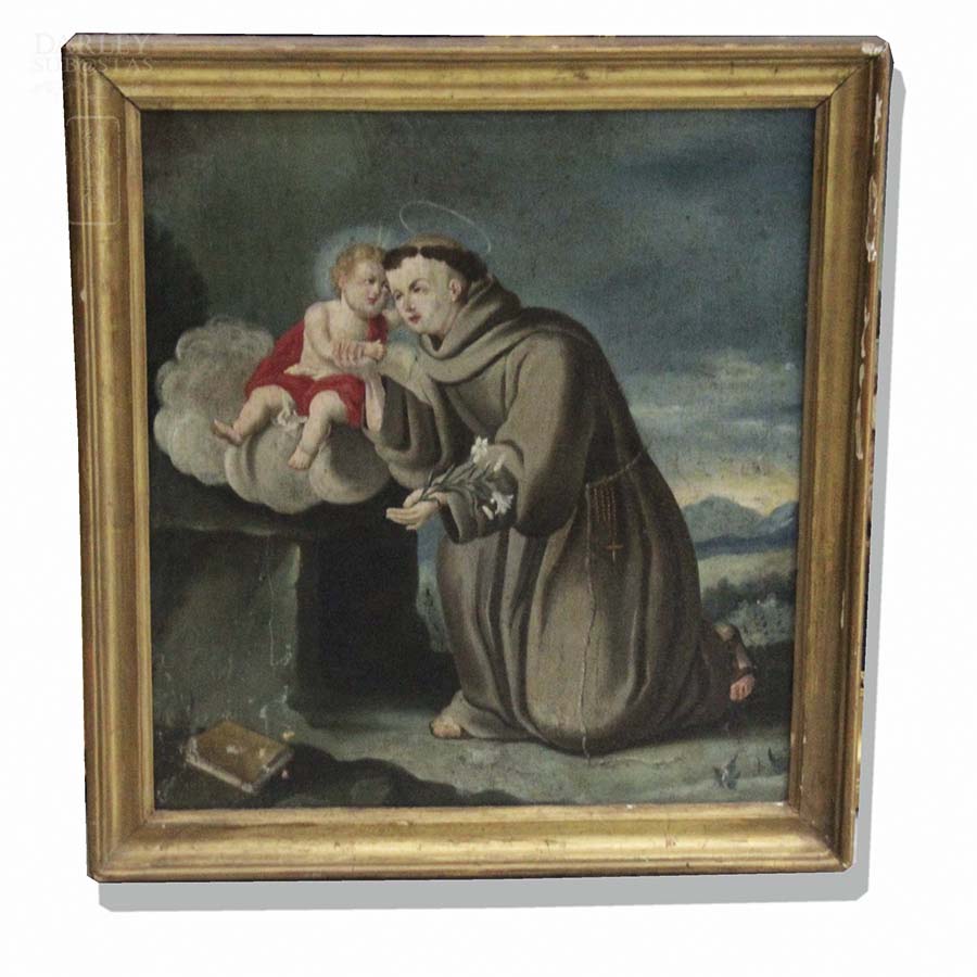 Lienzo de escuela española del siglo XVIII con imagen de San Antonio de Padua con el niño Jesús.