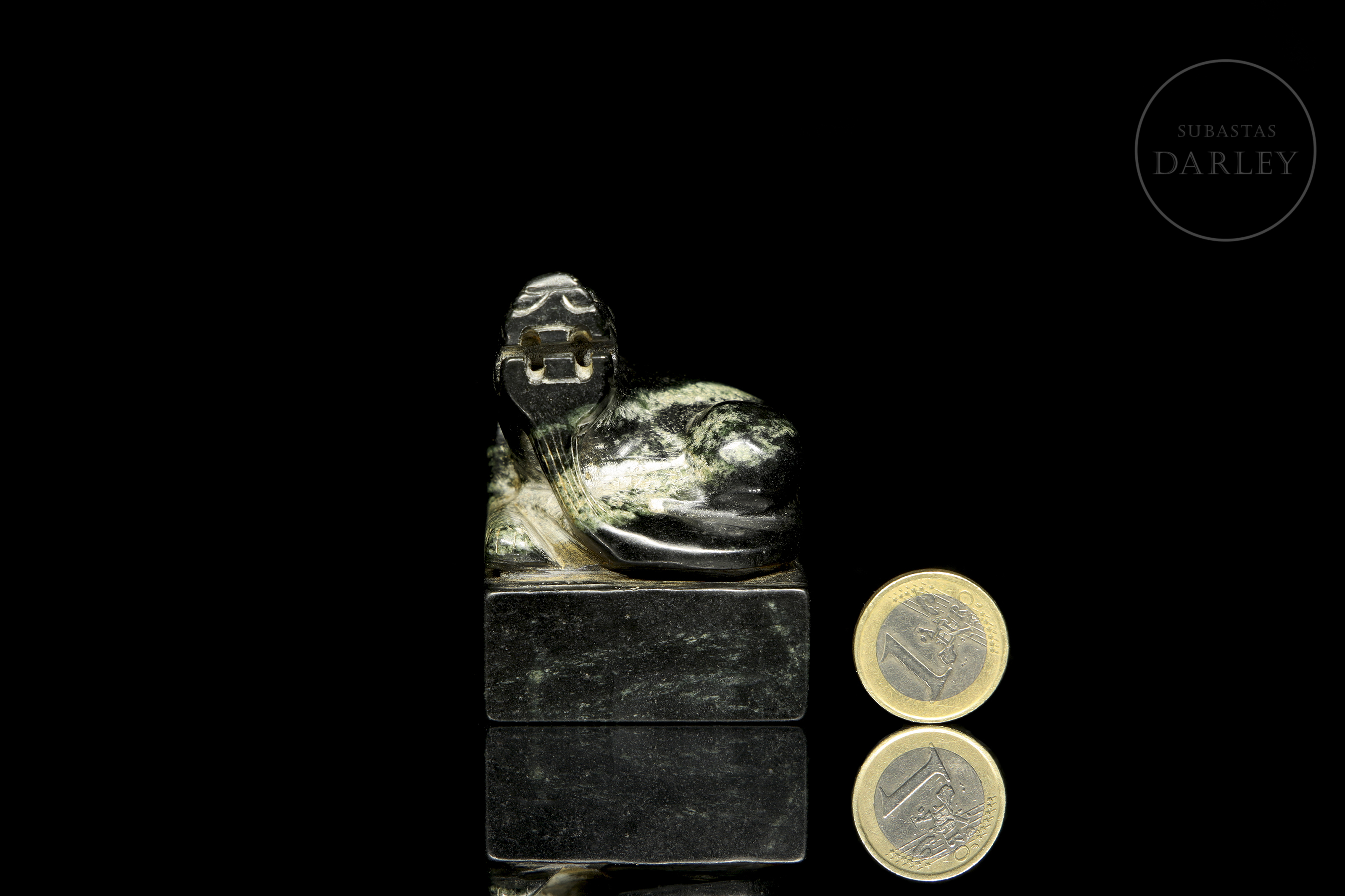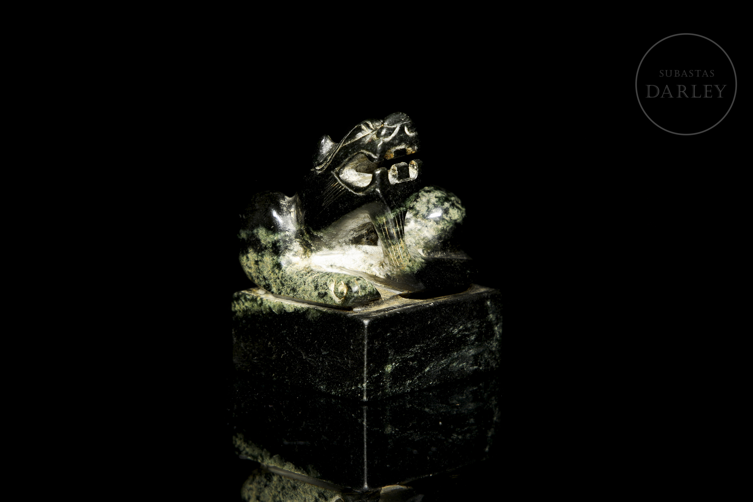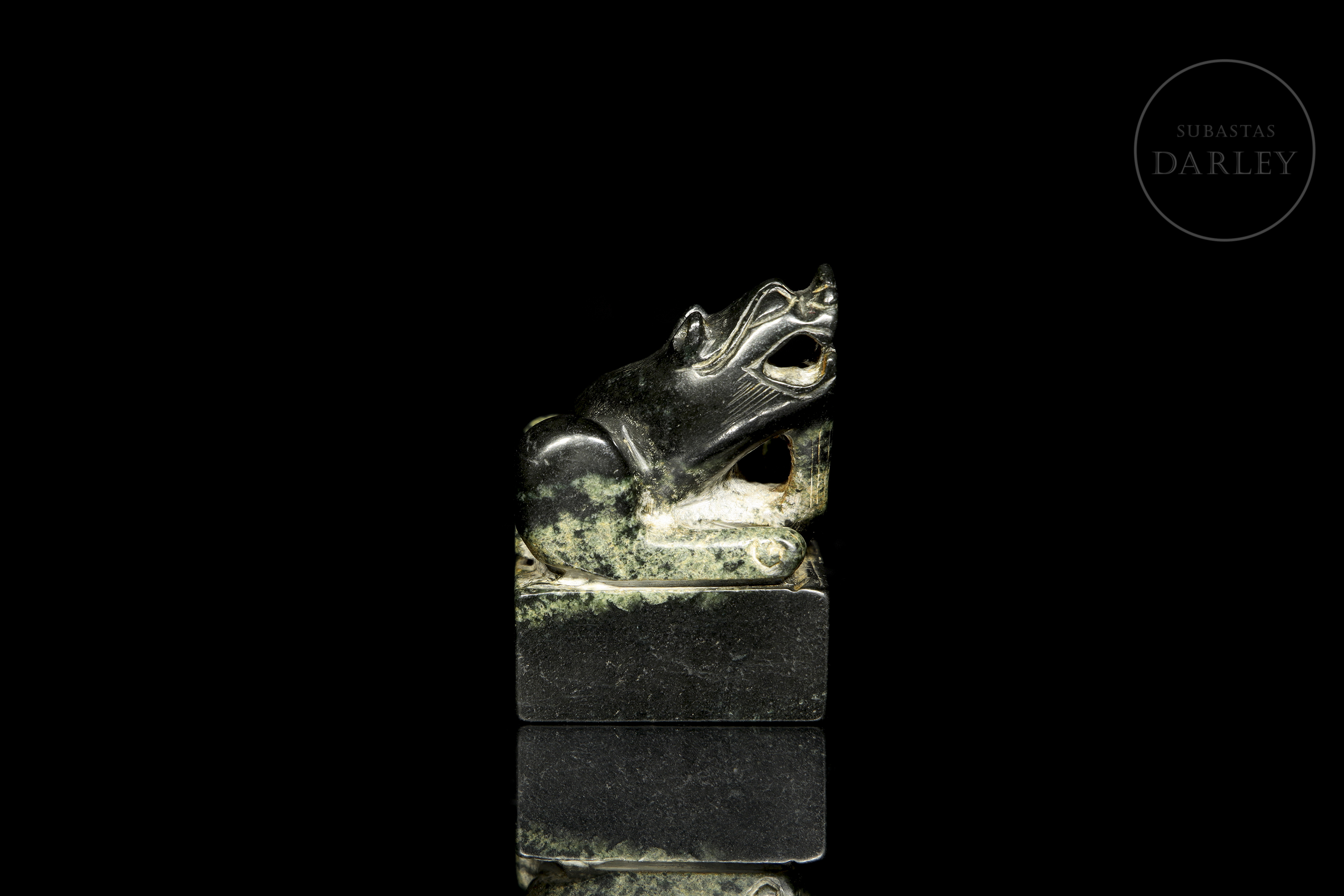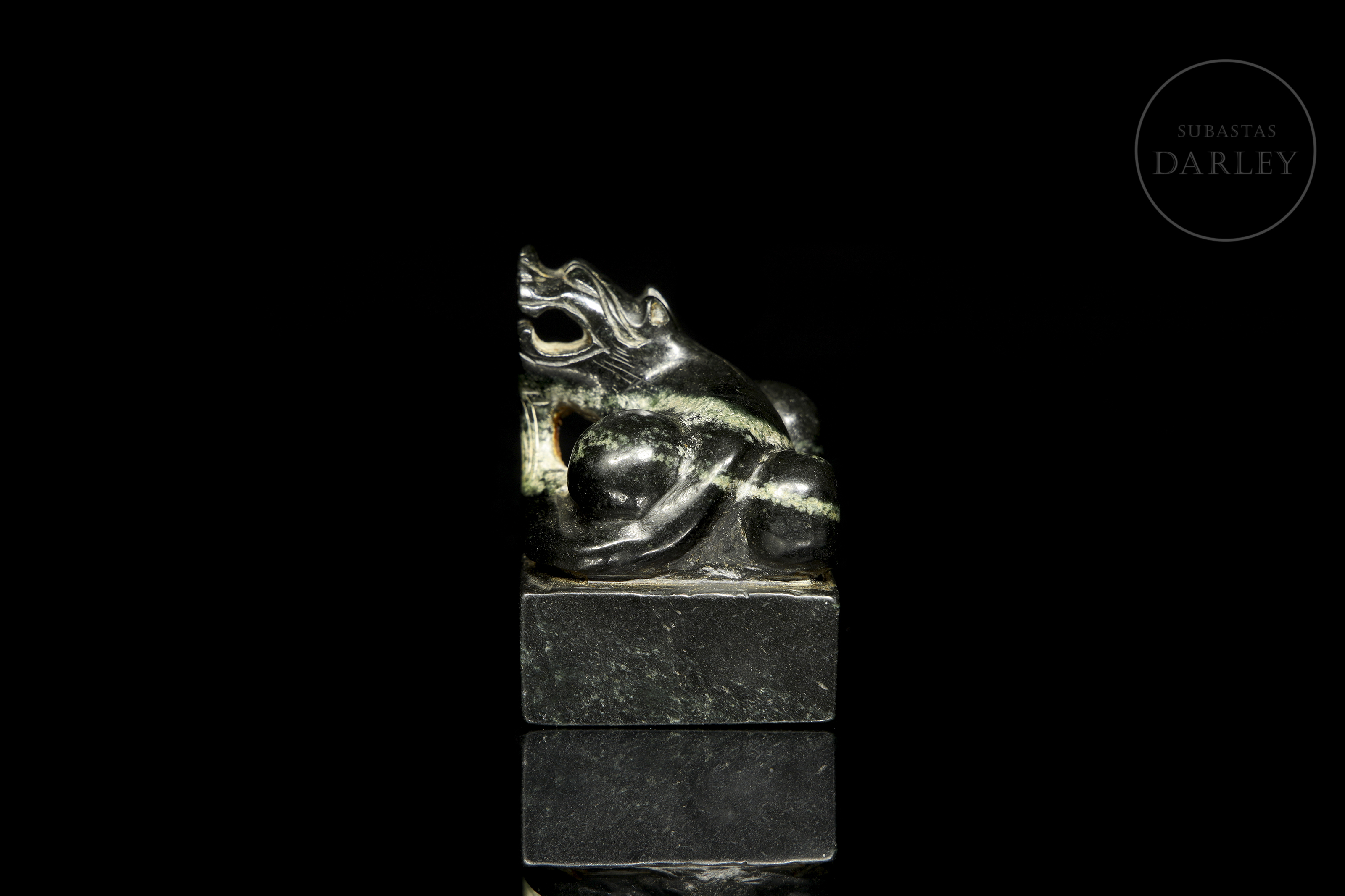 Jade de tonalidad verde oscuro, casi negra, con marcadas vetas verde claro y ocre que se distribuyen por la superficie. La pieza posee una base cuadrangular, coronada por la talla de una criatura mítica en actitud vigilante. La bestia se dispone recostada, con el cuerpo arqueado y la cabeza alzada, mostrando las fauces entreabiertas en una expresión de fuerza. La base del sello posee caracteres incisos en estilo sigilar.