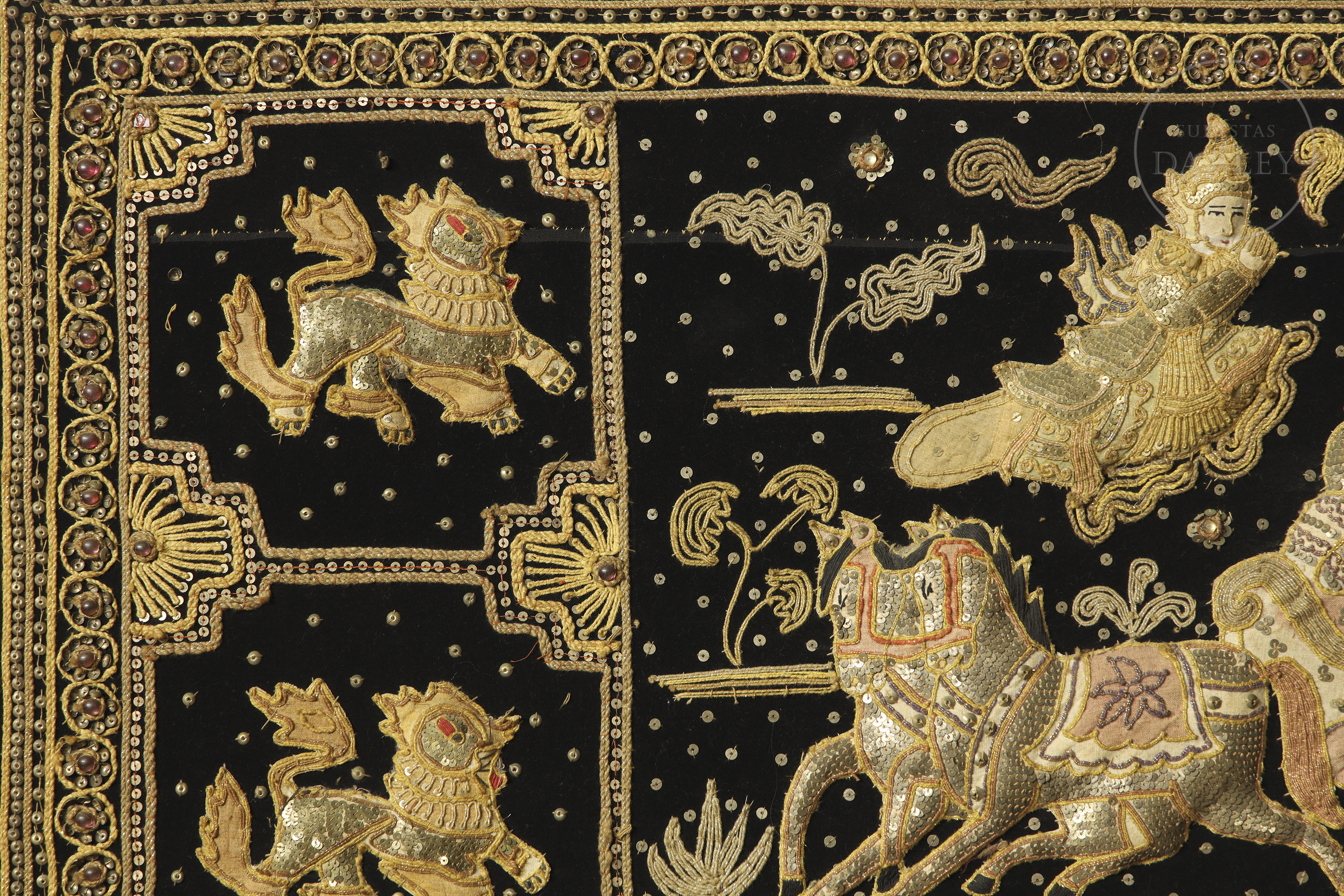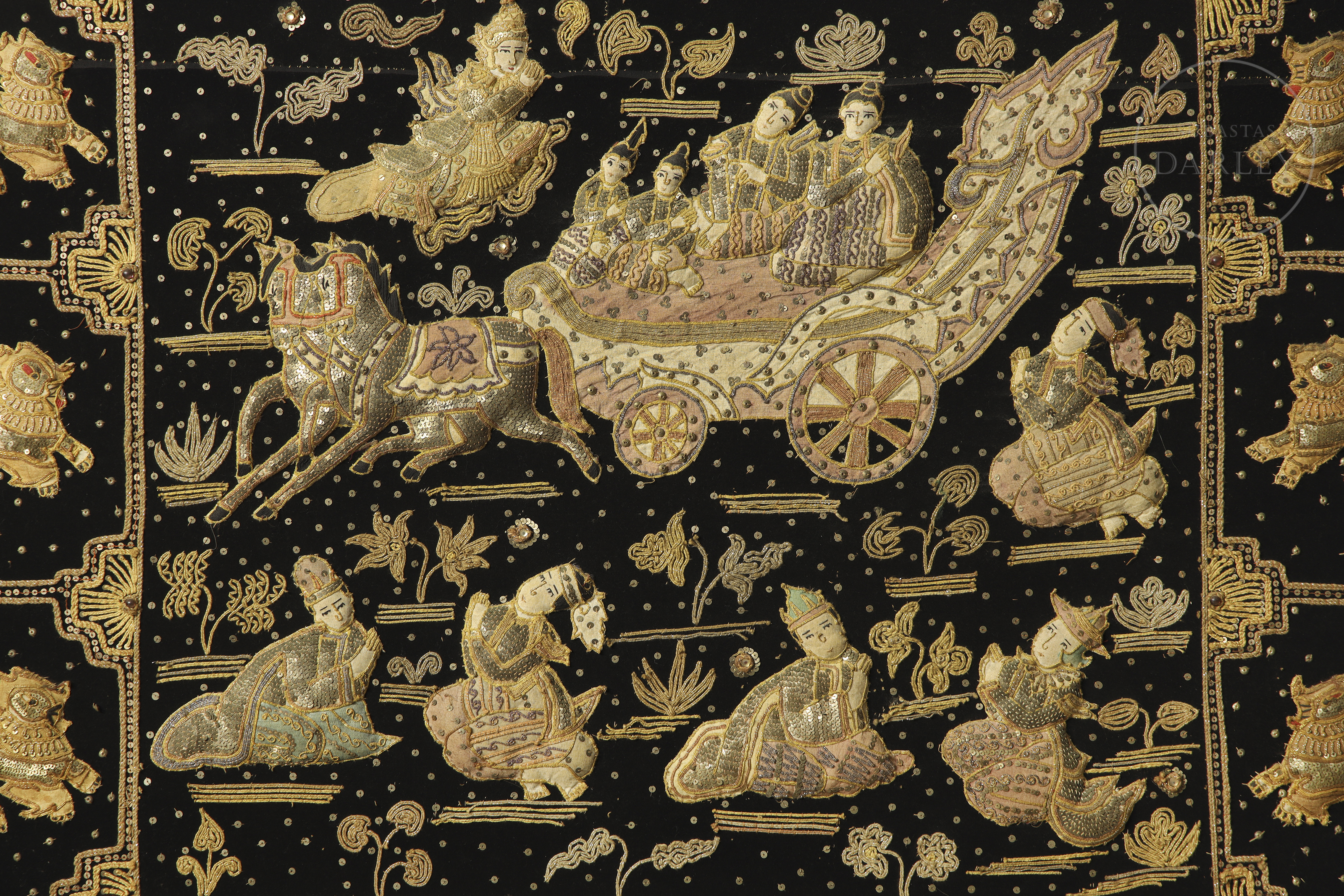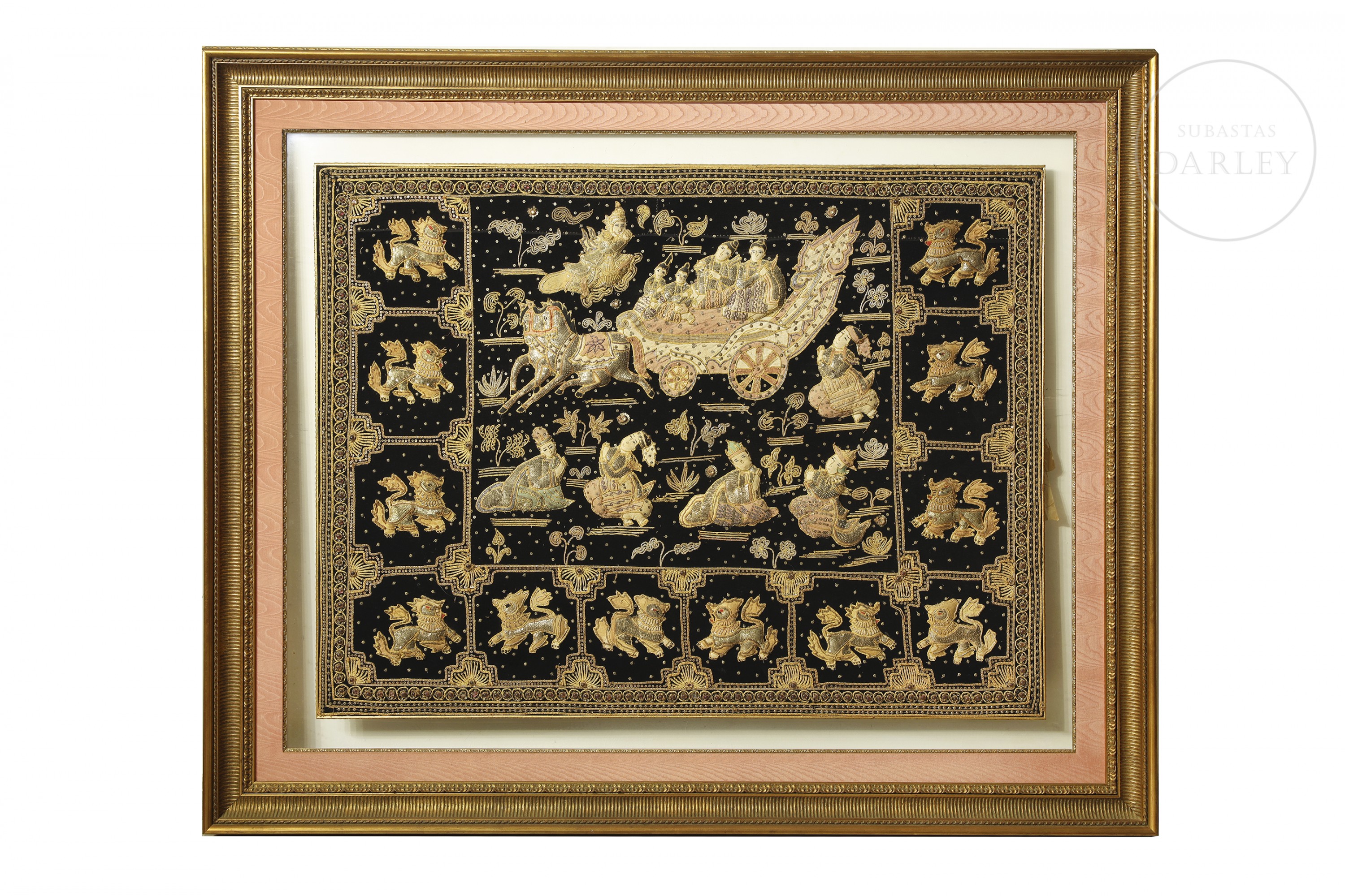 Tapiz bordado sobre fondo negro con hilos dorados y coloridos que representan una escena de corte real de influencia tailandesa, con personajes montados en un carro tirado por caballos, rodeados de figuras arrodilladas, músicos y asistentes, todo enmarcado por una cenefa con animales mitológicos y motivos florales. El conjunto está rematado con un marco doble de madera tallada y dorada.