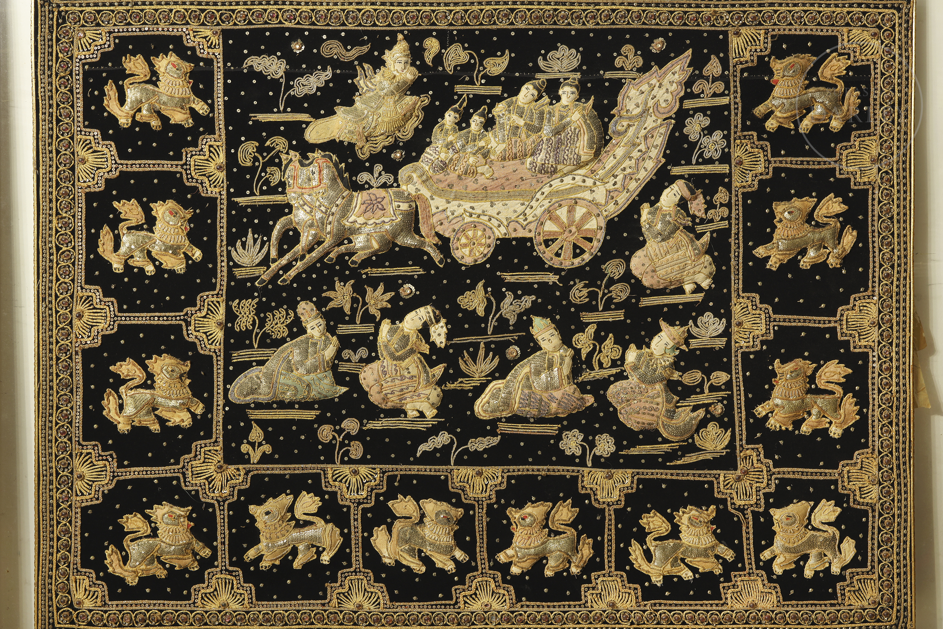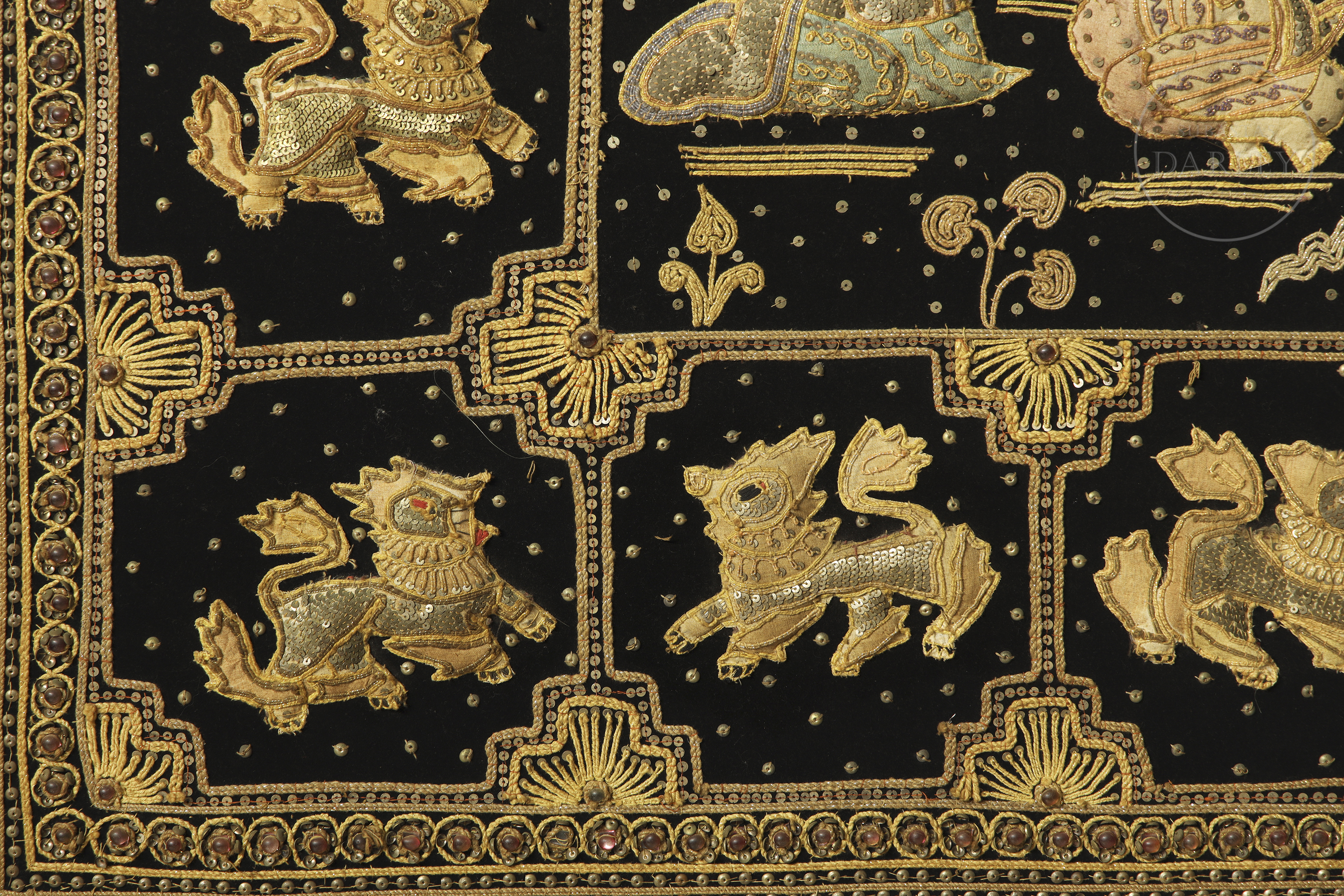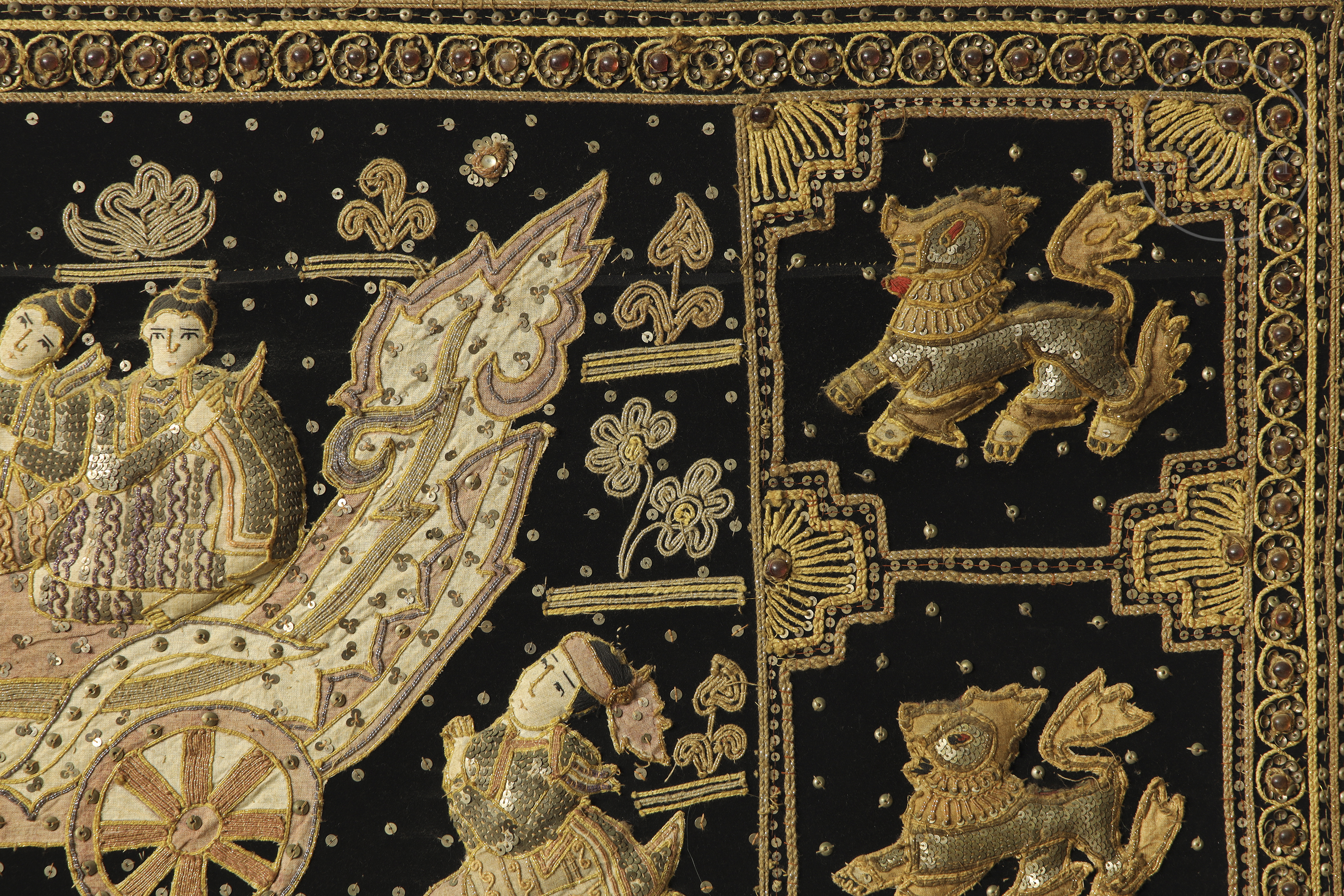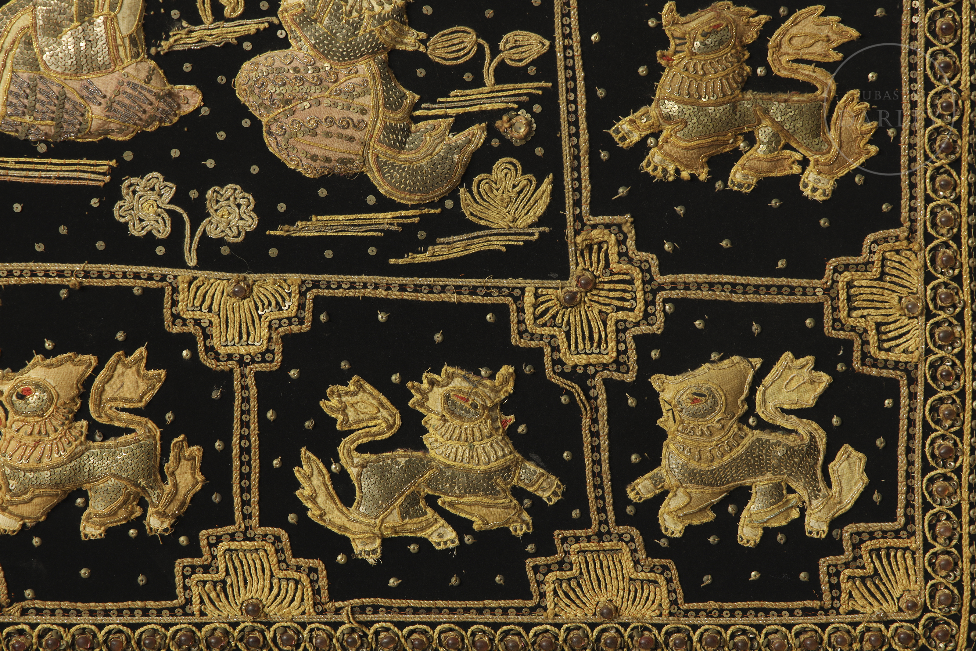 Tapiz bordado sobre fondo negro con hilos dorados y coloridos que representan una escena de corte real de influencia tailandesa, con personajes montados en un carro tirado por caballos, rodeados de figuras arrodilladas, músicos y asistentes, todo enmarcado por una cenefa con animales mitológicos y motivos florales. El conjunto está rematado con un marco doble de madera tallada y dorada.