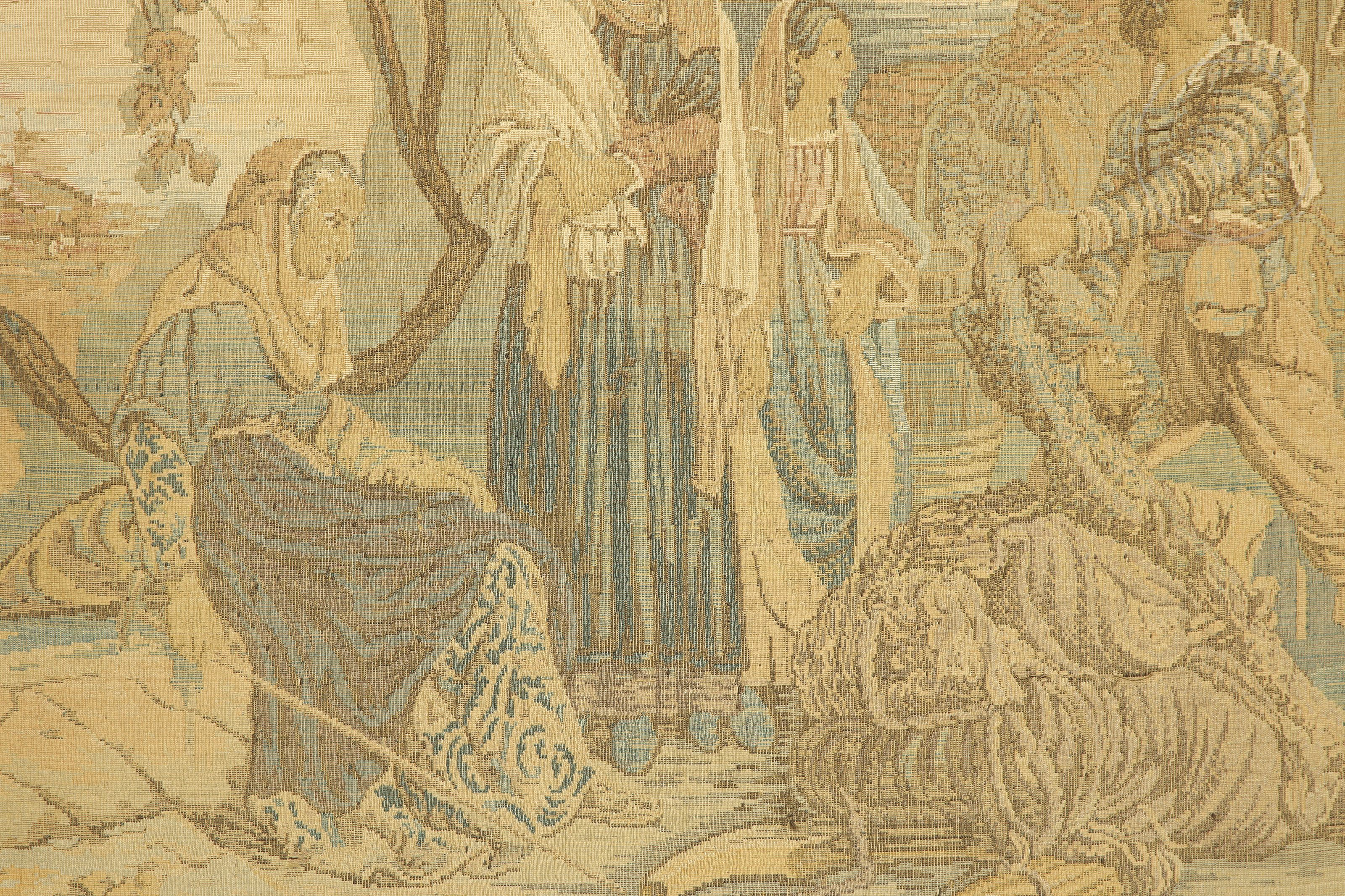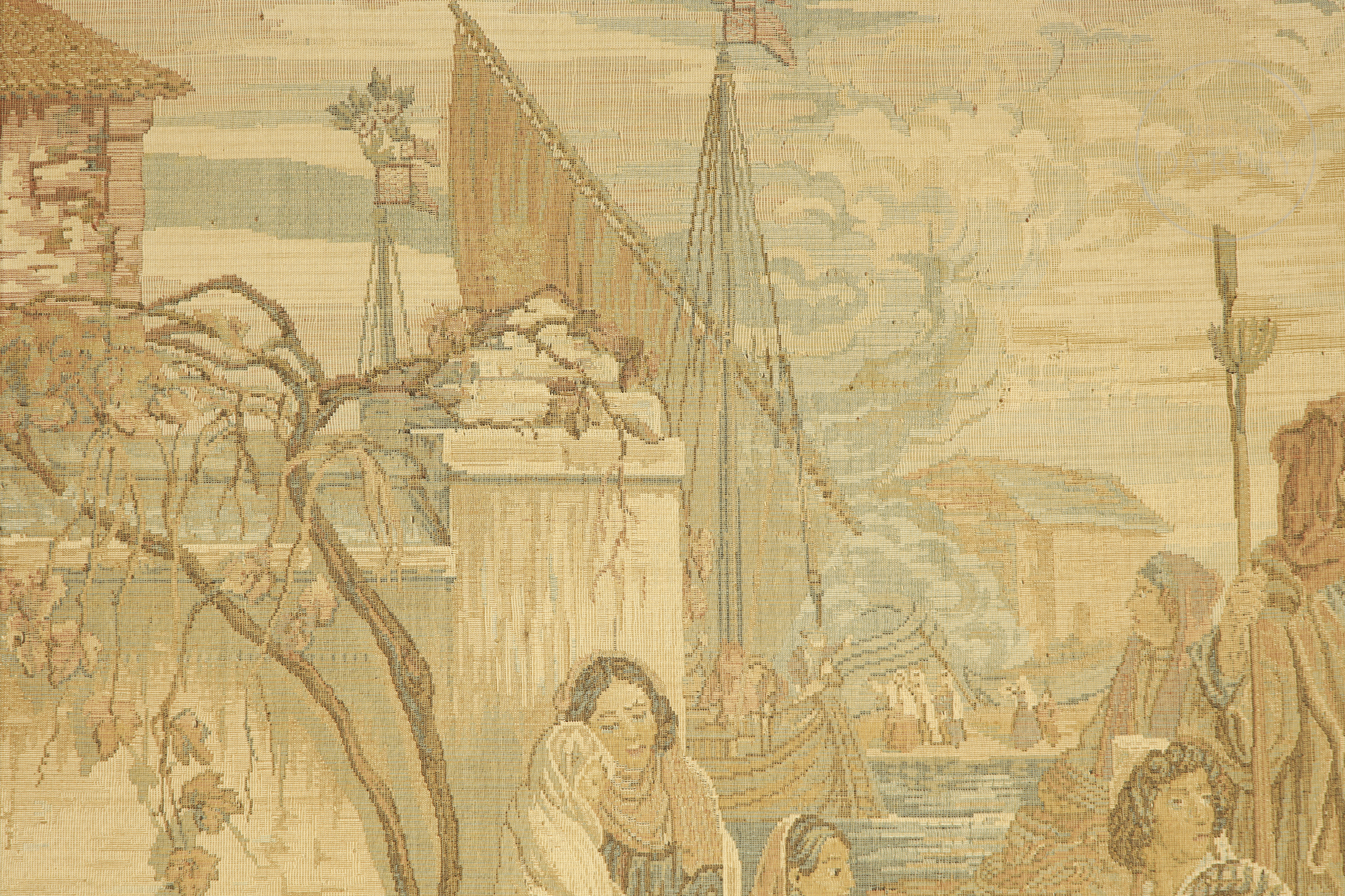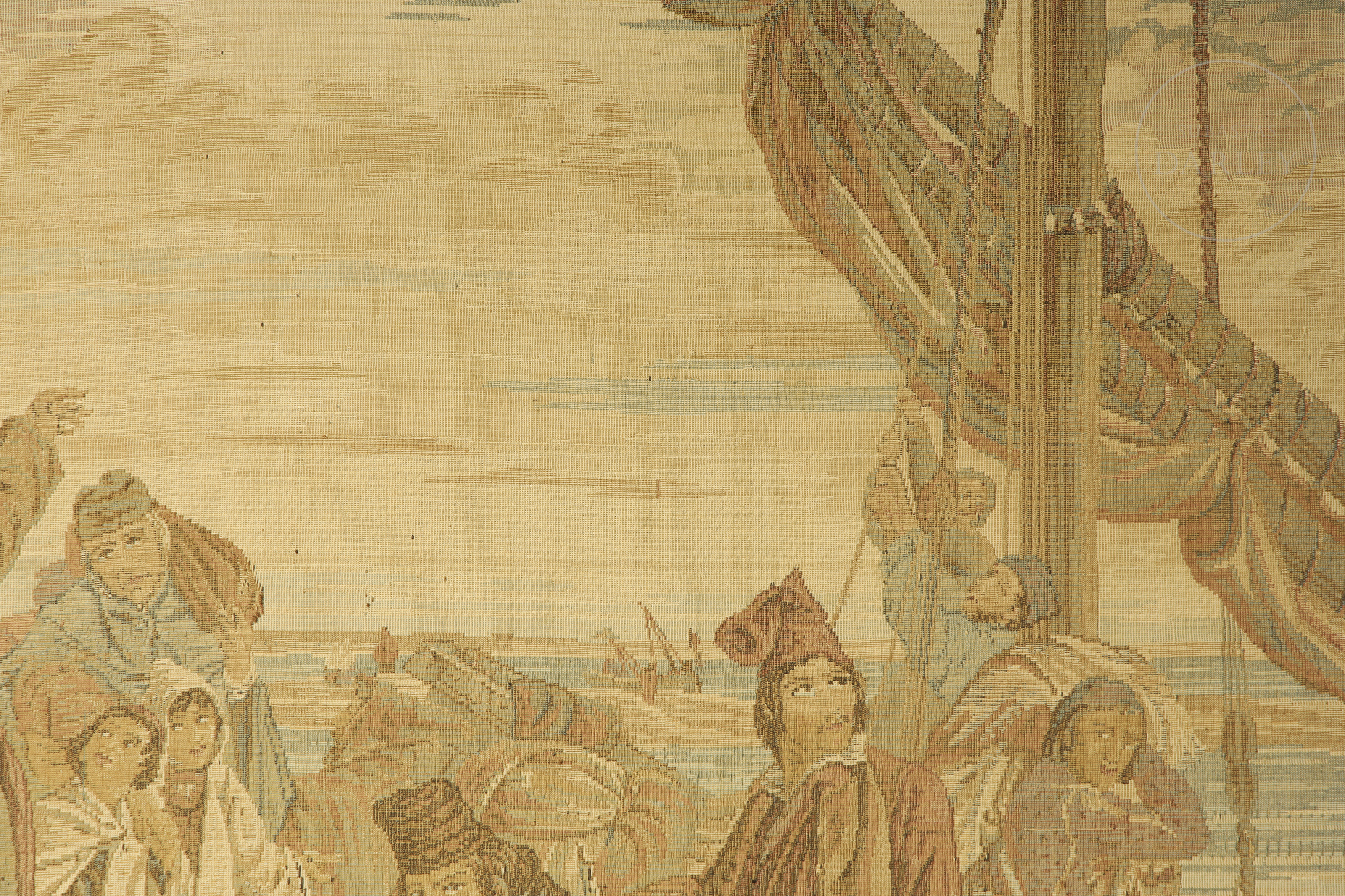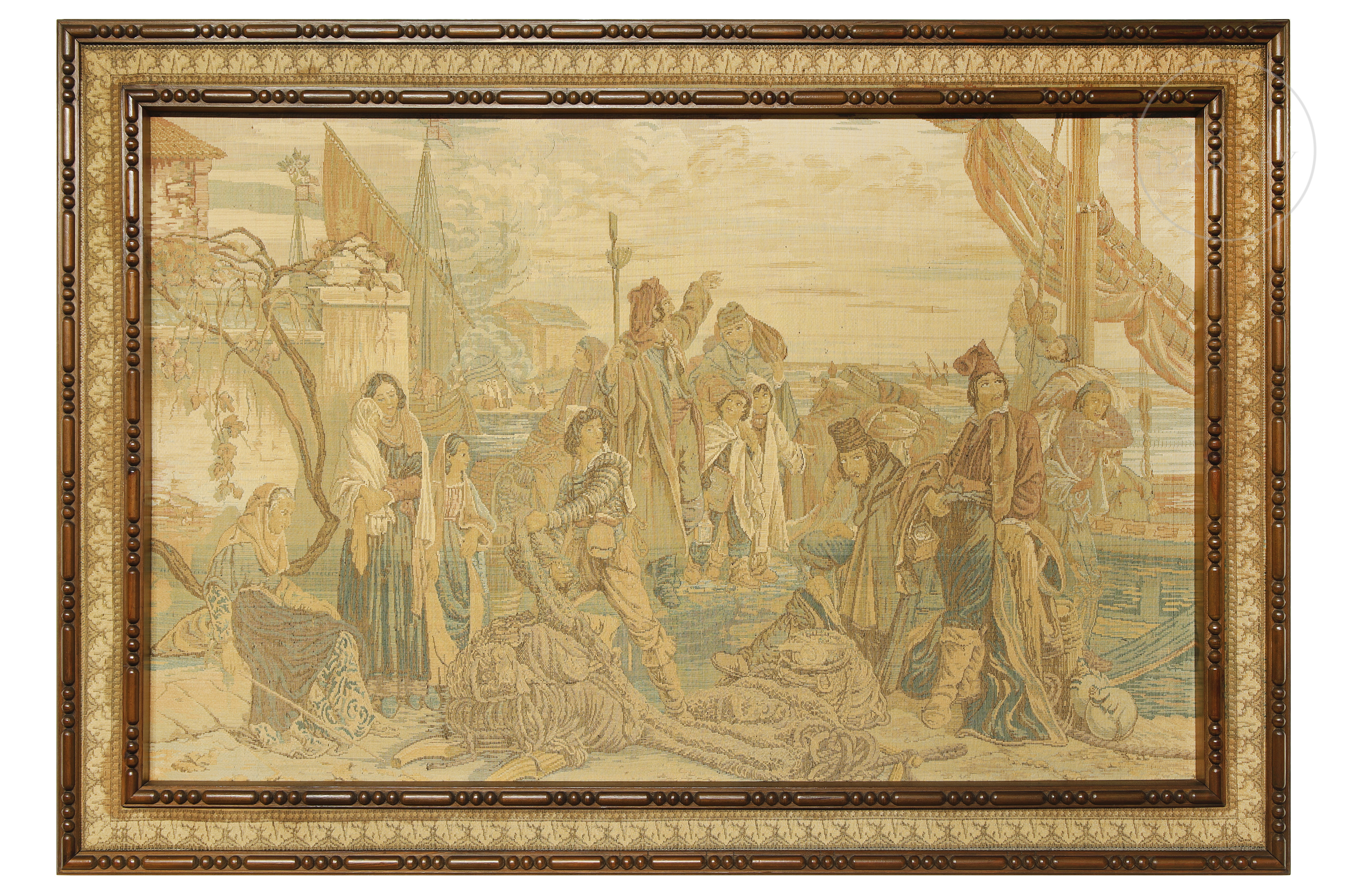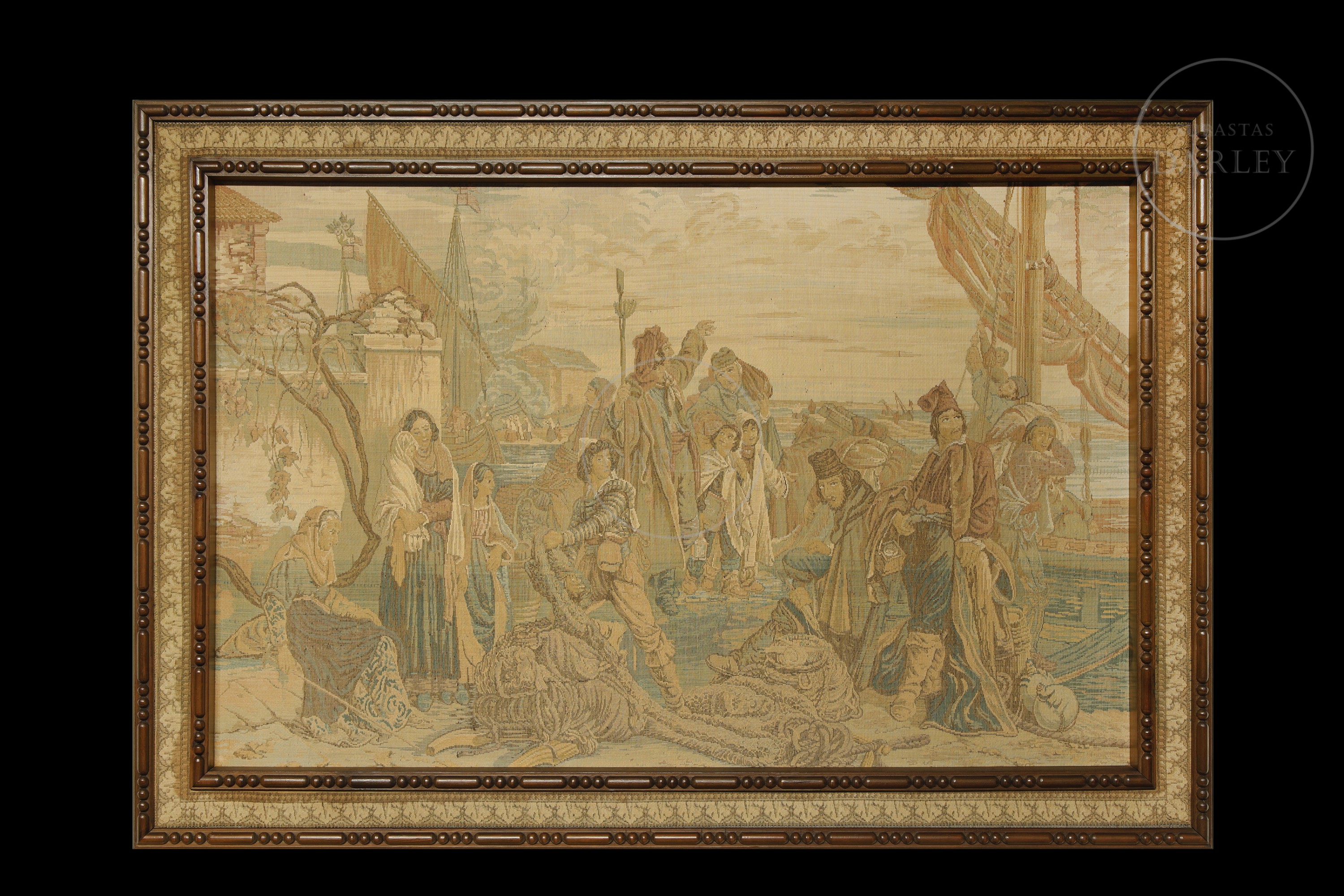 Lana y otros tejidos en tapiz. Muestra una escena portuaria, con personajes haciendo labores. Se encuentra enmarcado y sin firma visible.