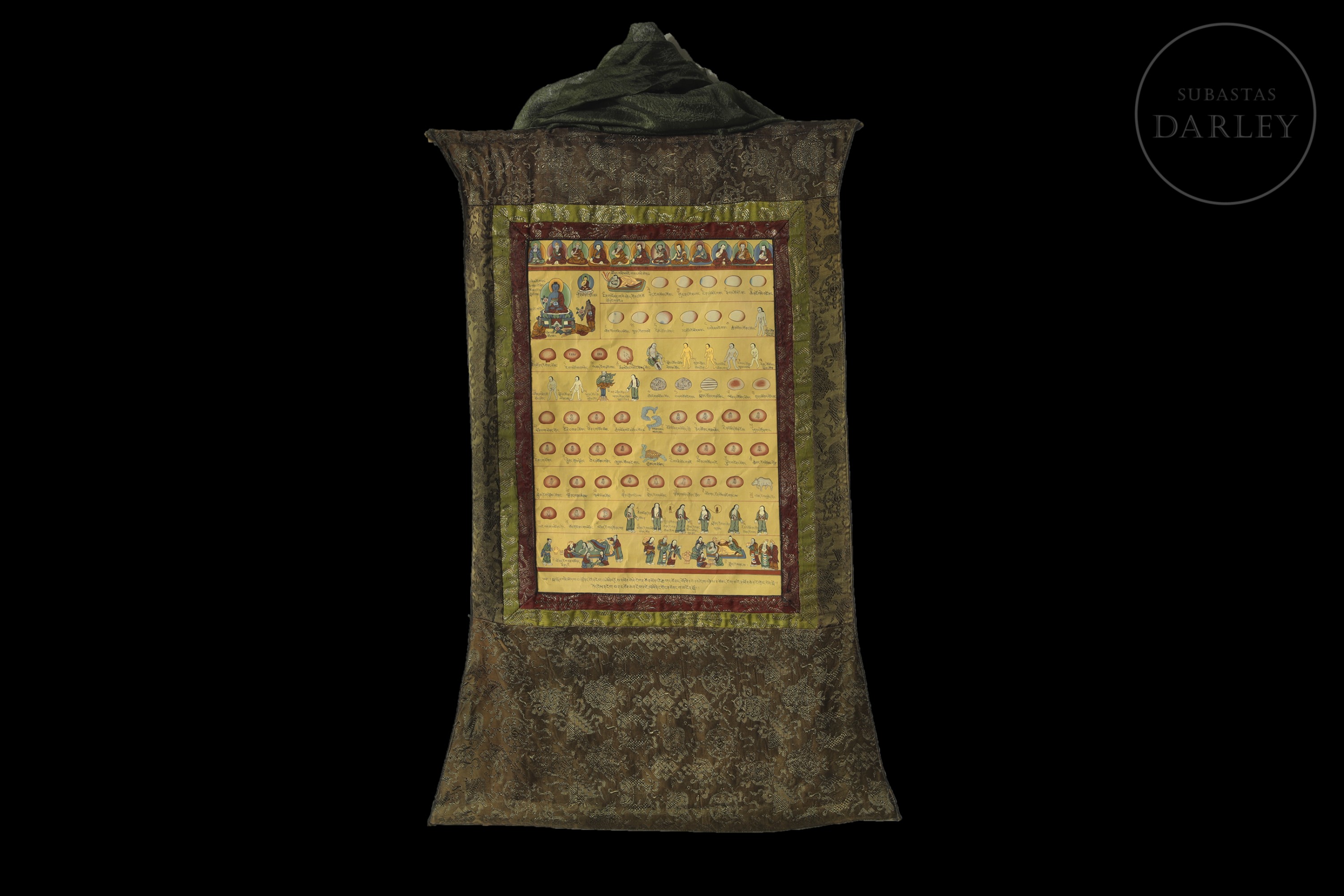 Pintura realizada en pigmentos minerales sobre tela, montada en un marco de seda brocada con funda protectora en tejido verde. La obra representa de manera didáctica las fases de la concepción, gestación y nacimiento según la tradición médica tibetana, en registros horizontales, acompañado de inscripciones y figuras de maestros y deidades protectoras en la parte superior.