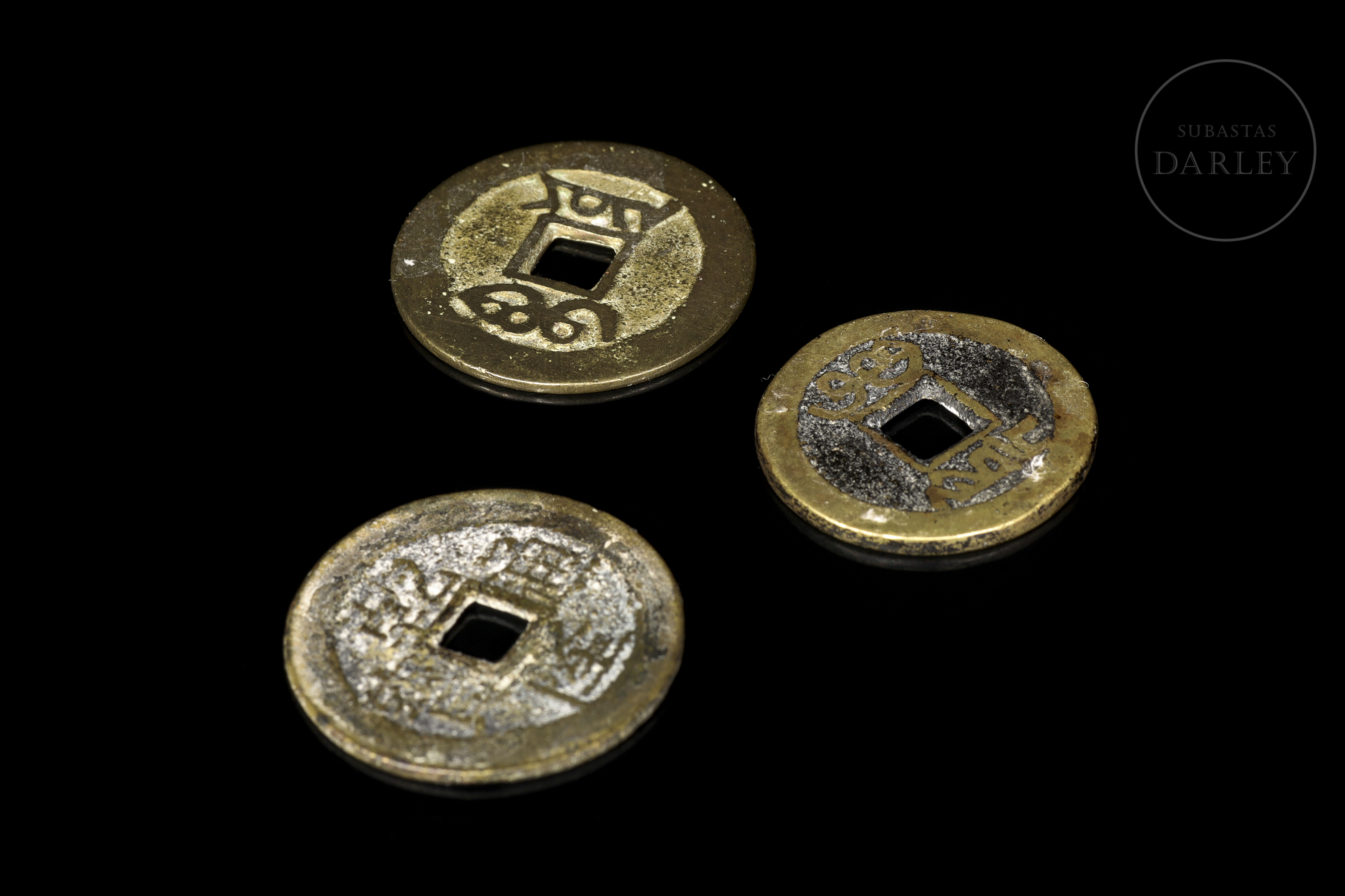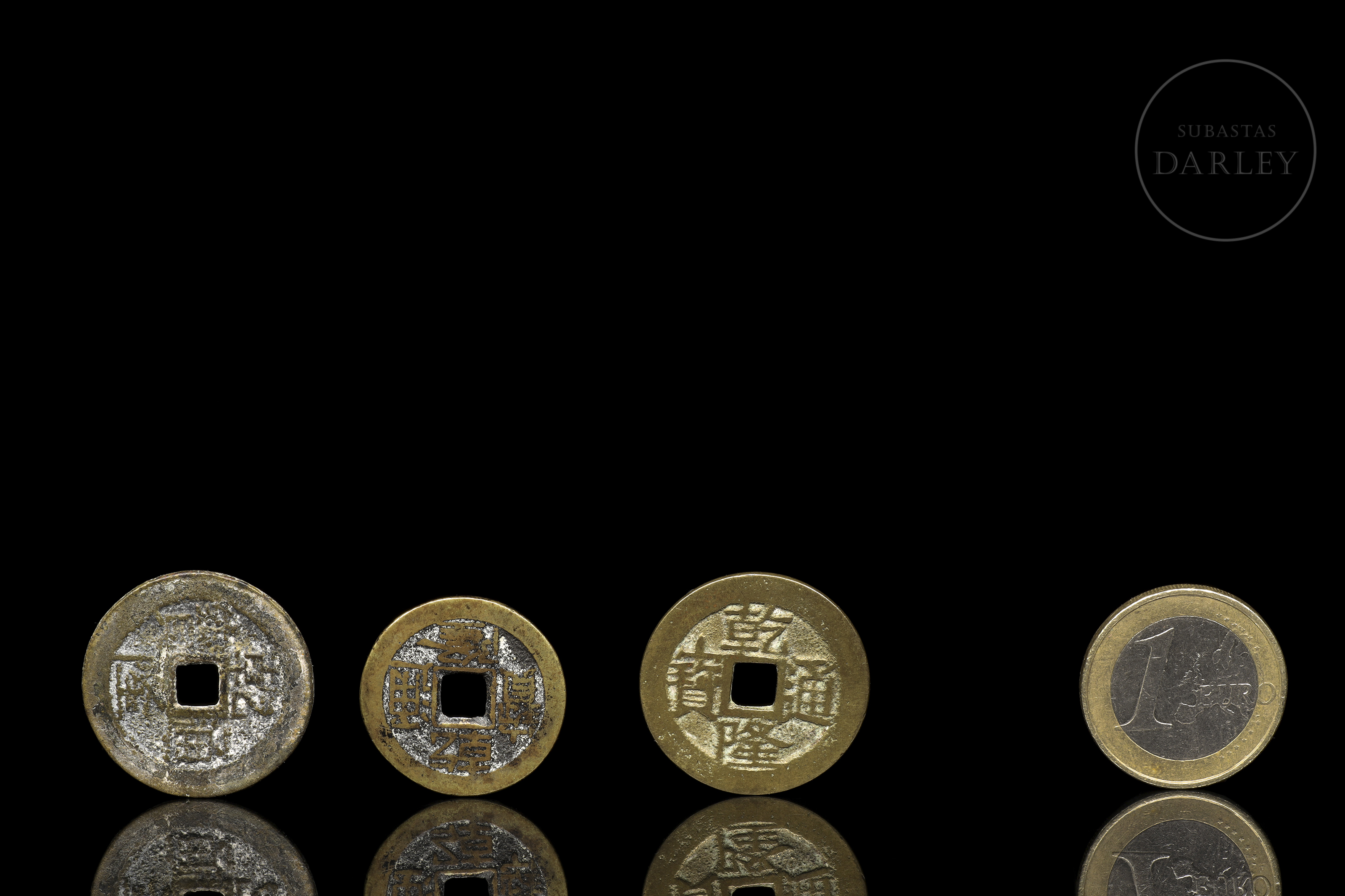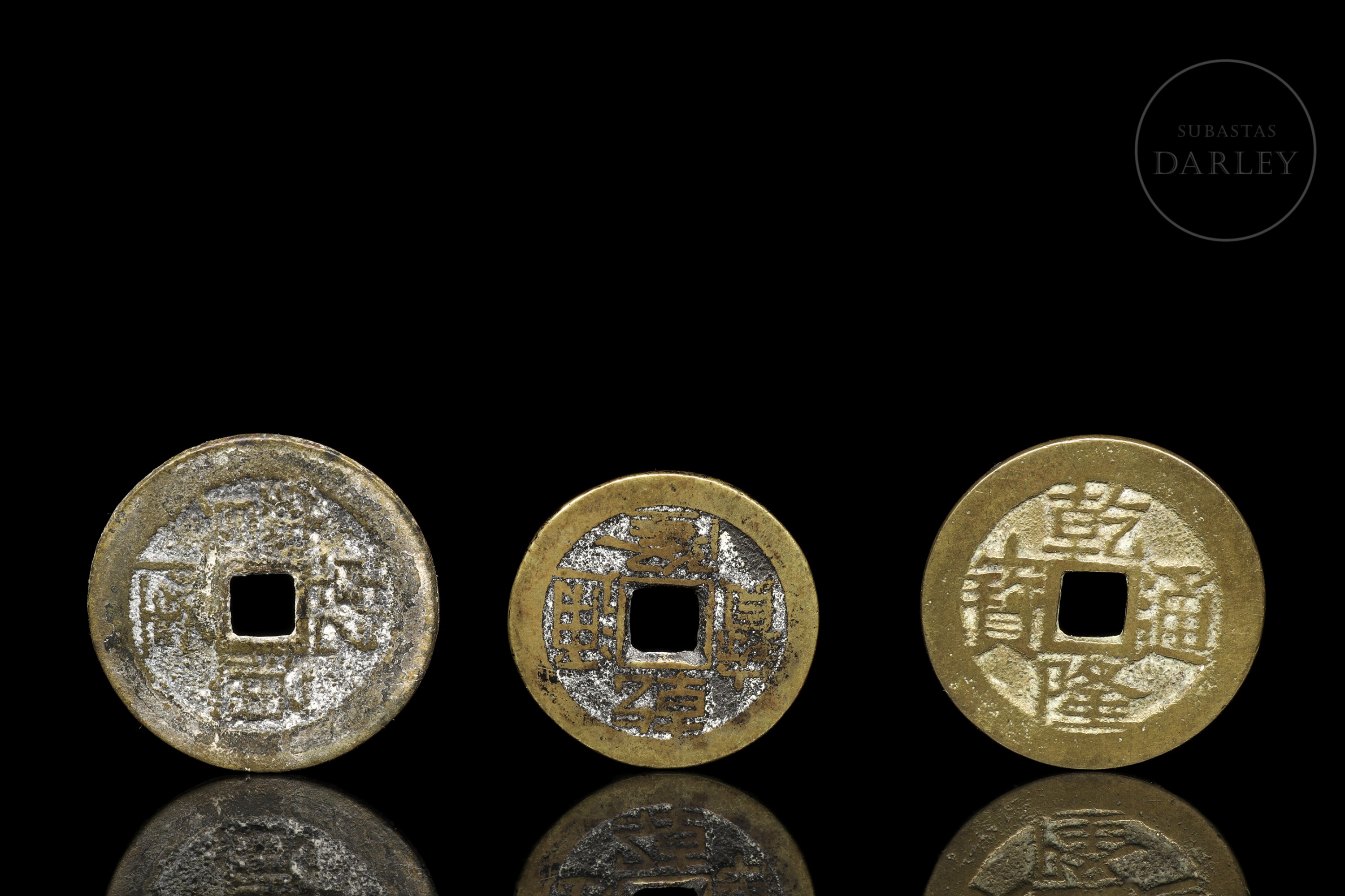 Monedas chinas en bronce. Con caracteres chinos y en el centro un orificio cuadrado. En los caracteres indica Qianlong. Posible Dinastía Qing (1644-1912), siglo XVIII.
