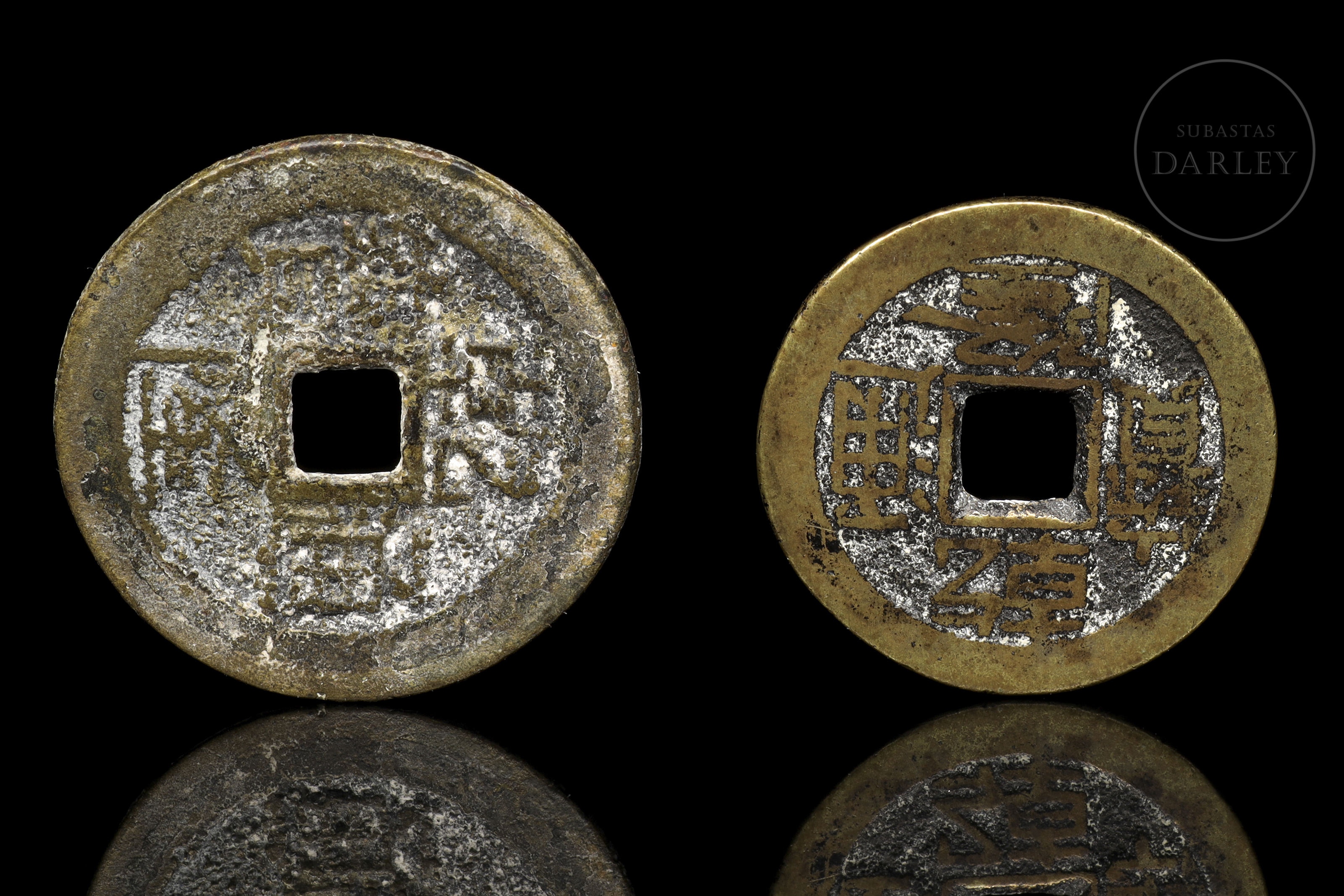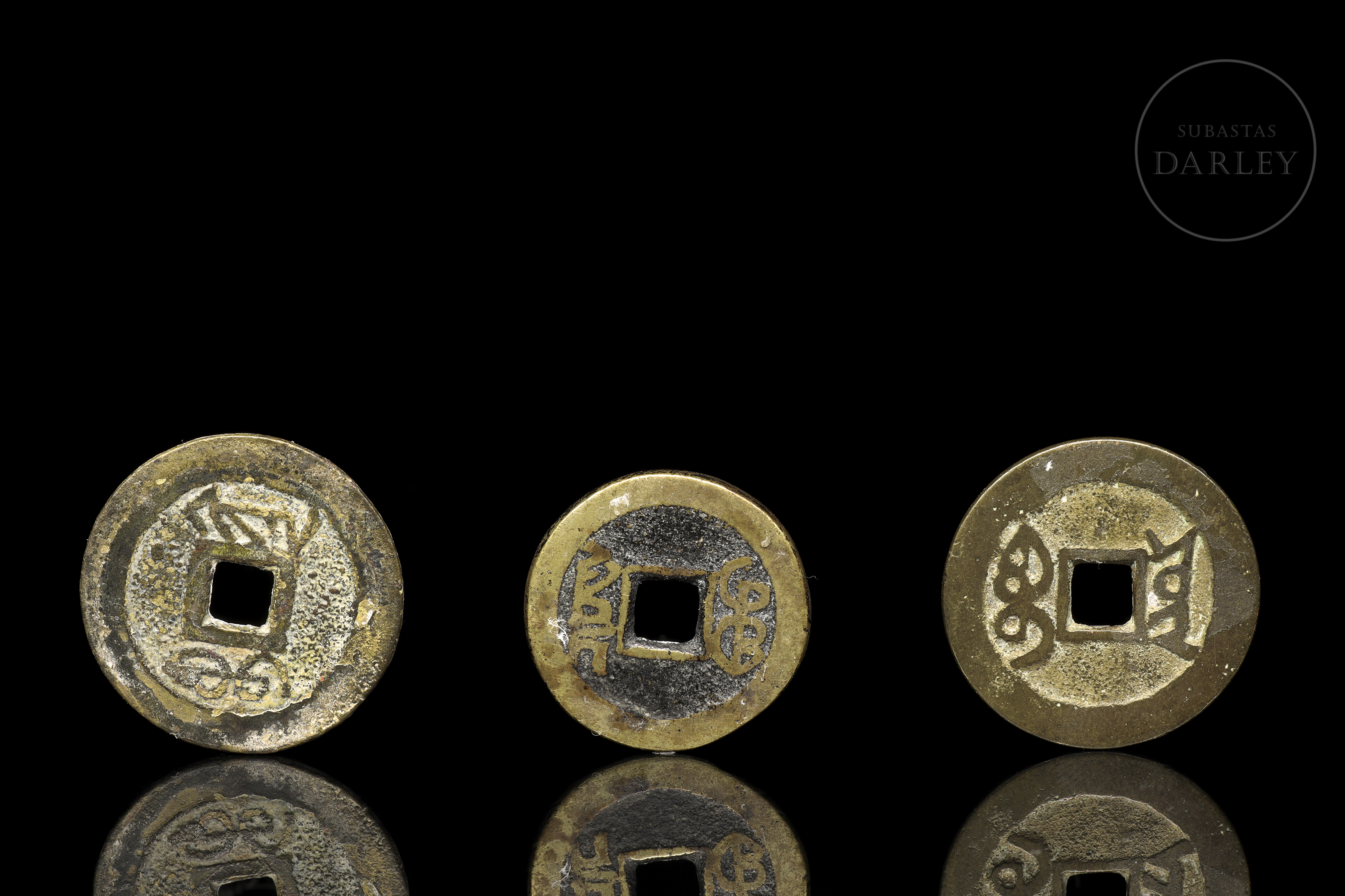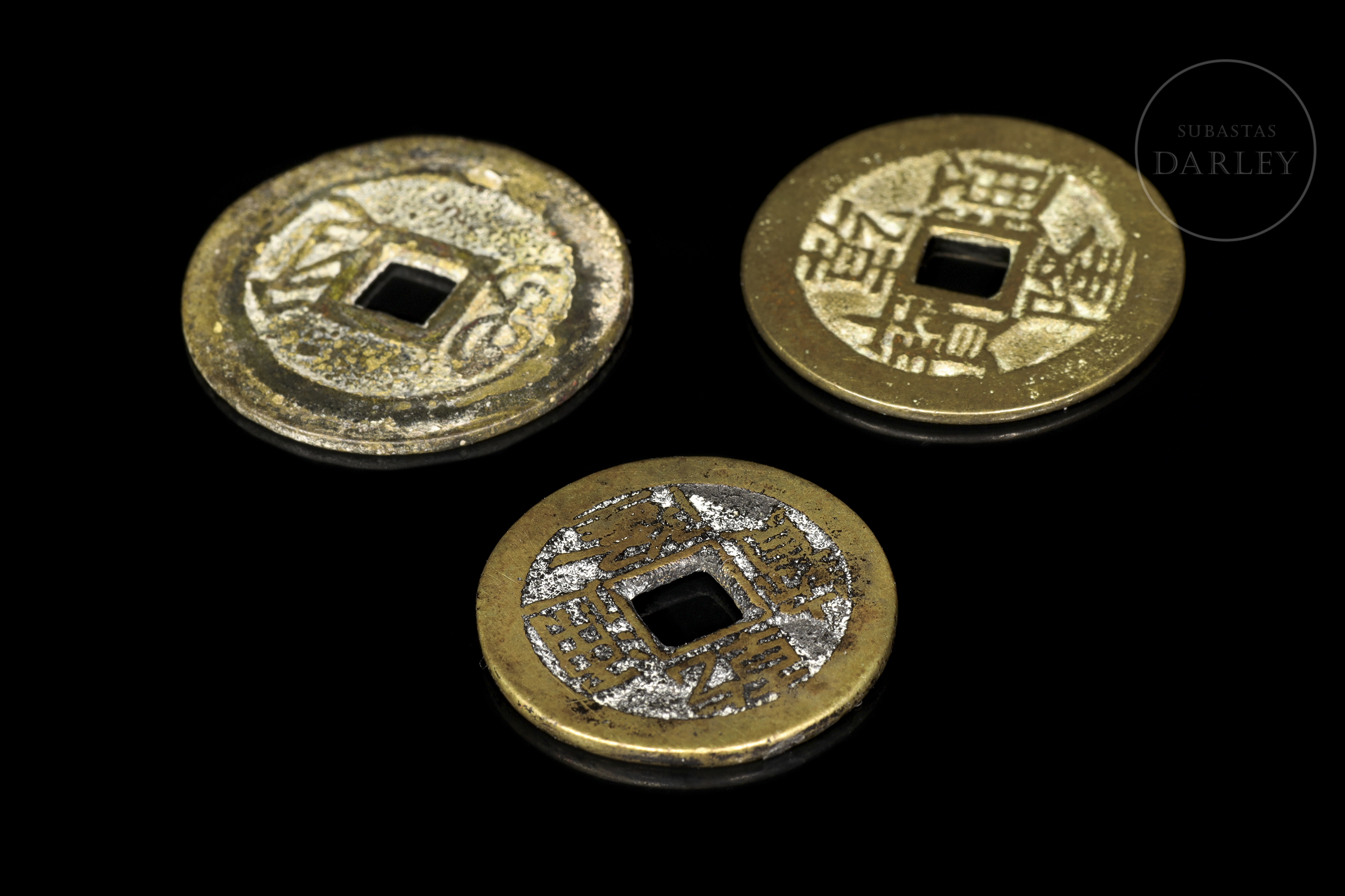 Monedas chinas en bronce. Con caracteres chinos y en el centro un orificio cuadrado. En los caracteres indica Qianlong. Posible Dinastía Qing (1644-1912), siglo XVIII.