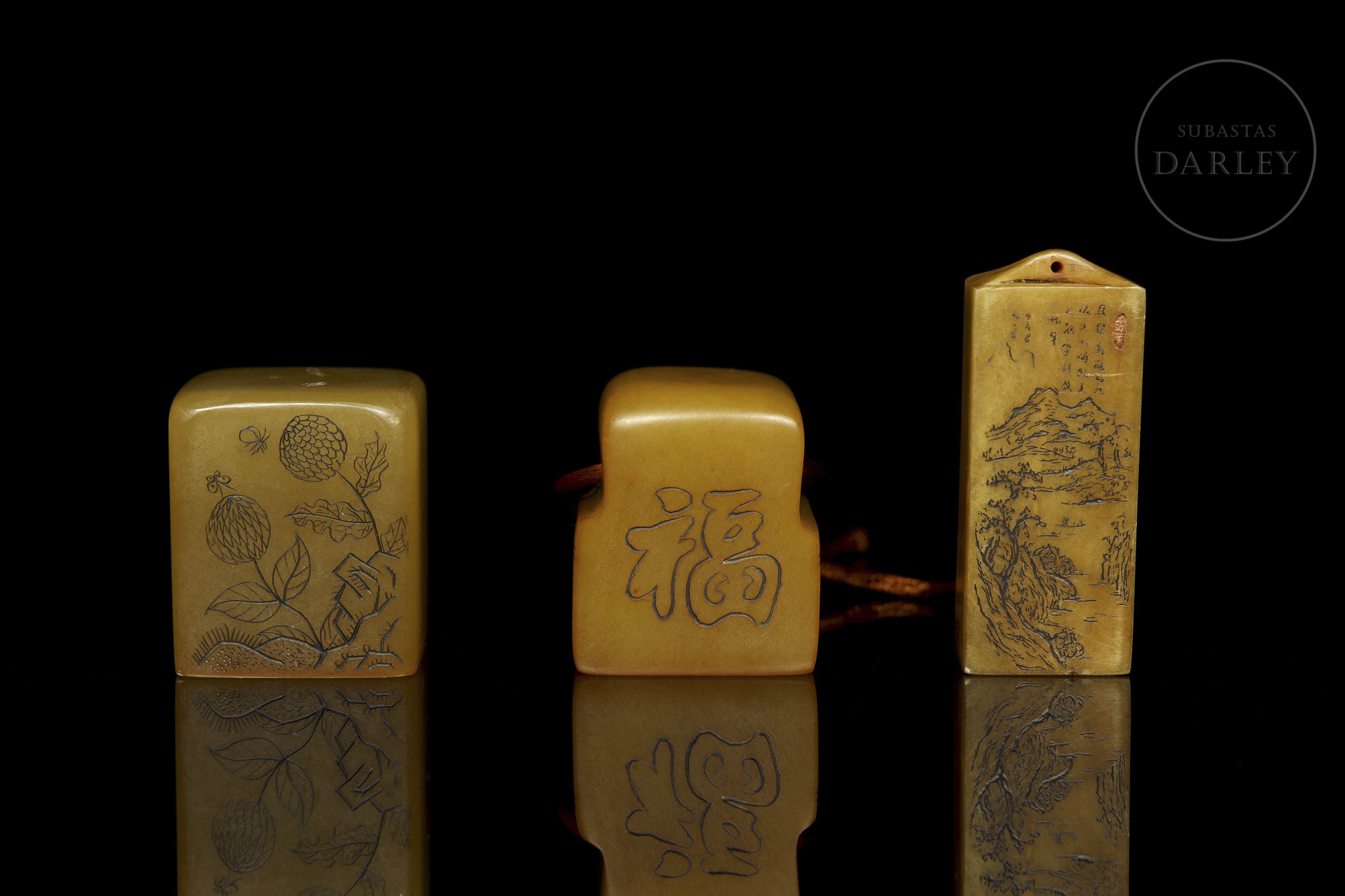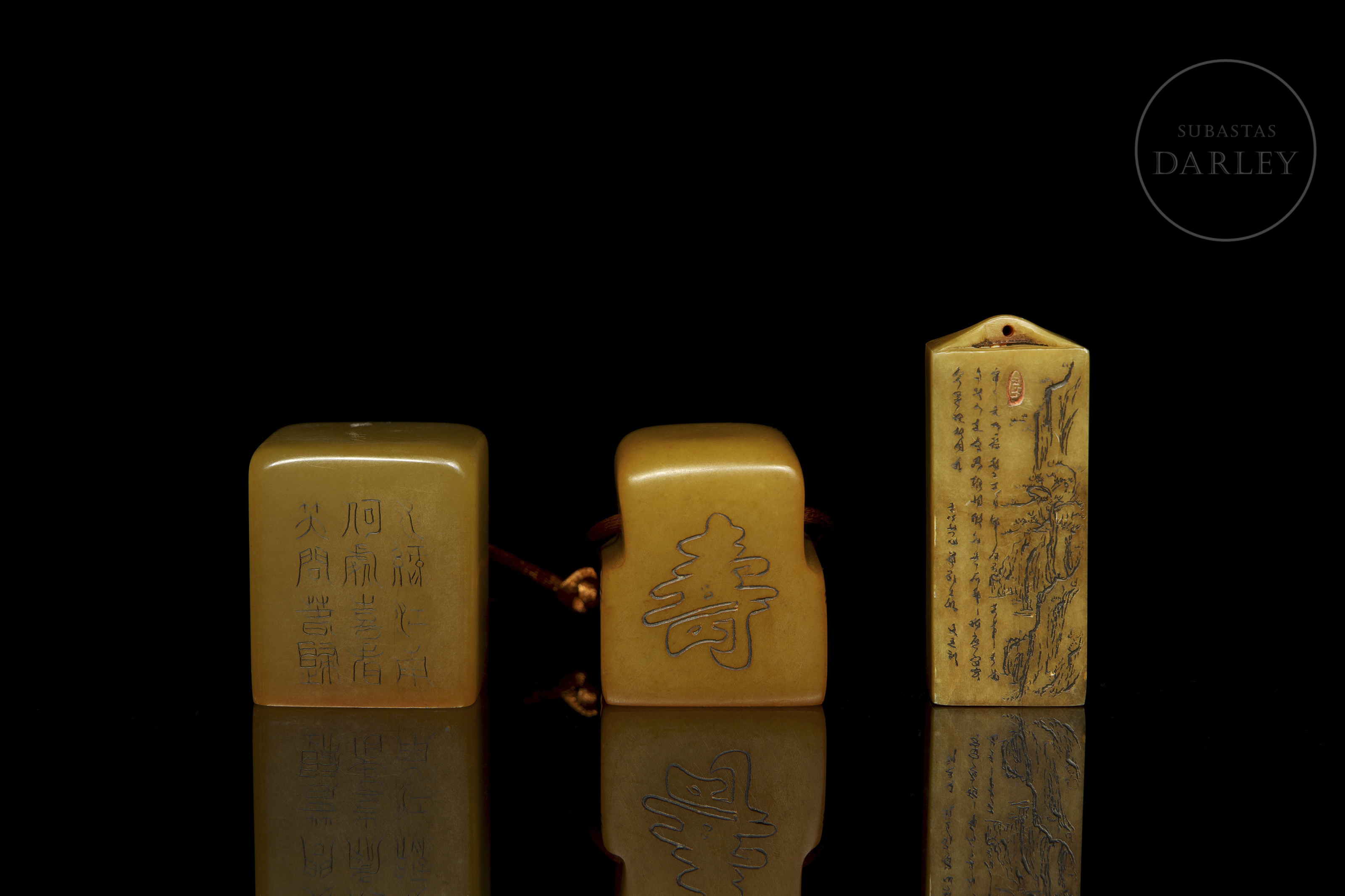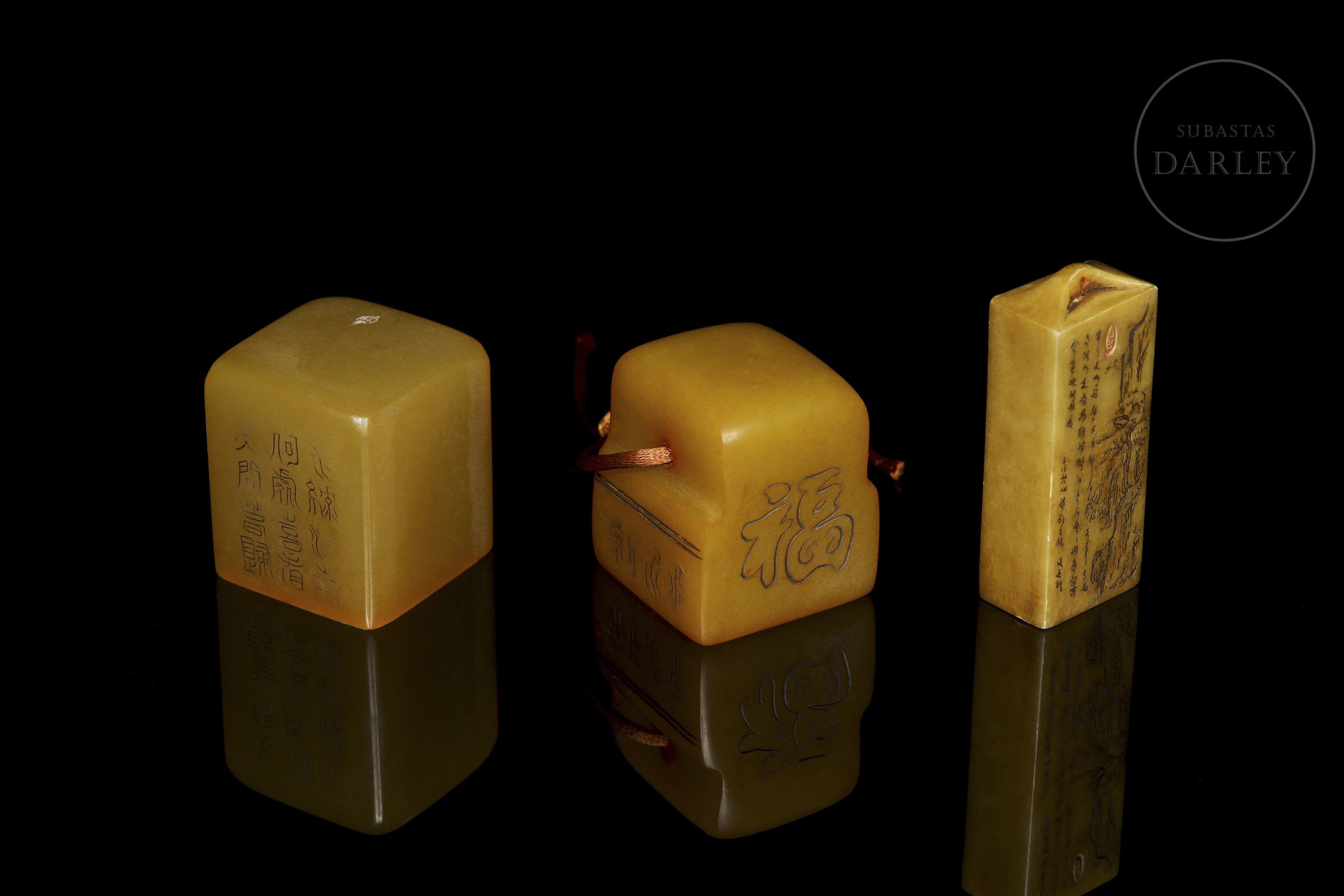Tres sellos de piedra shoushan de tonalidad ámbar. Dos de las piezas son de formato cúbico o rectangular, finamente grabadas con escenas de montañas, flores y poemas. La tercera pieza, de formato rectangular escalonado, presenta caracteres en dos de sus caras. Las tres piezas muestran caracteres de sello en bajorrelieve con restos de lacre rojo.
