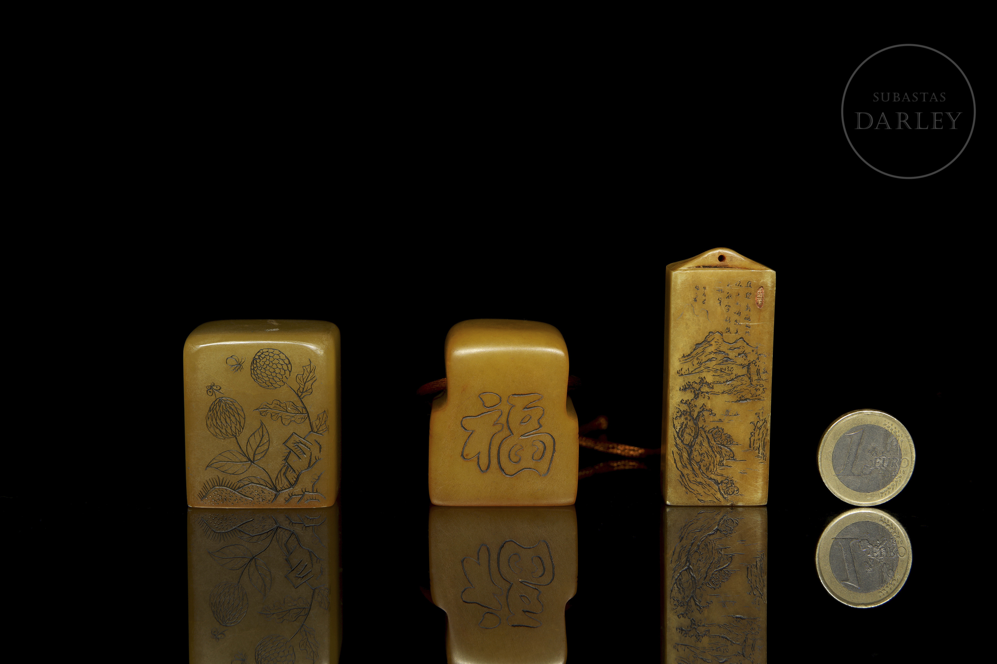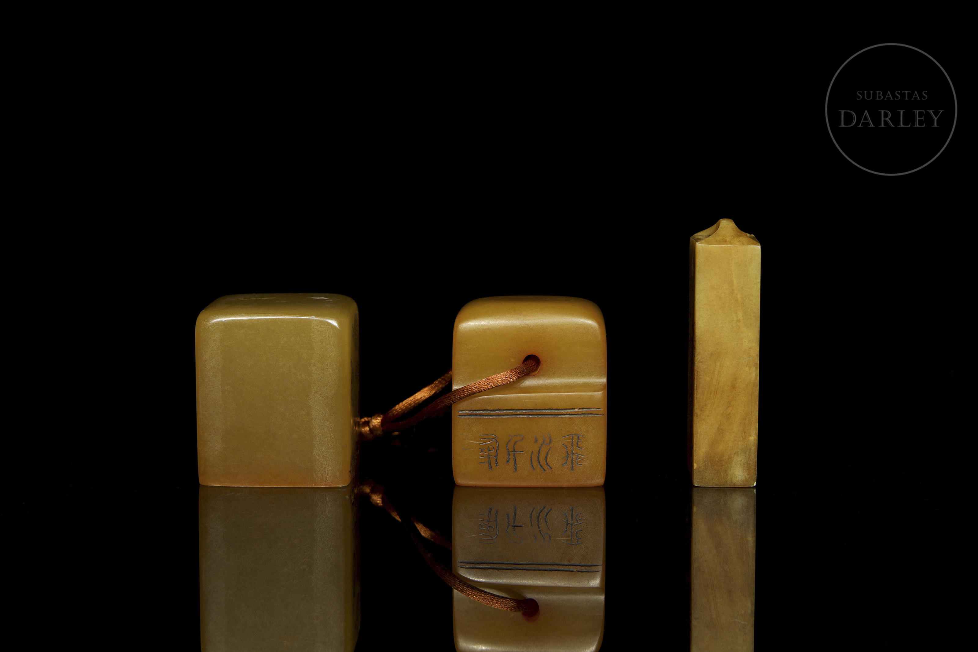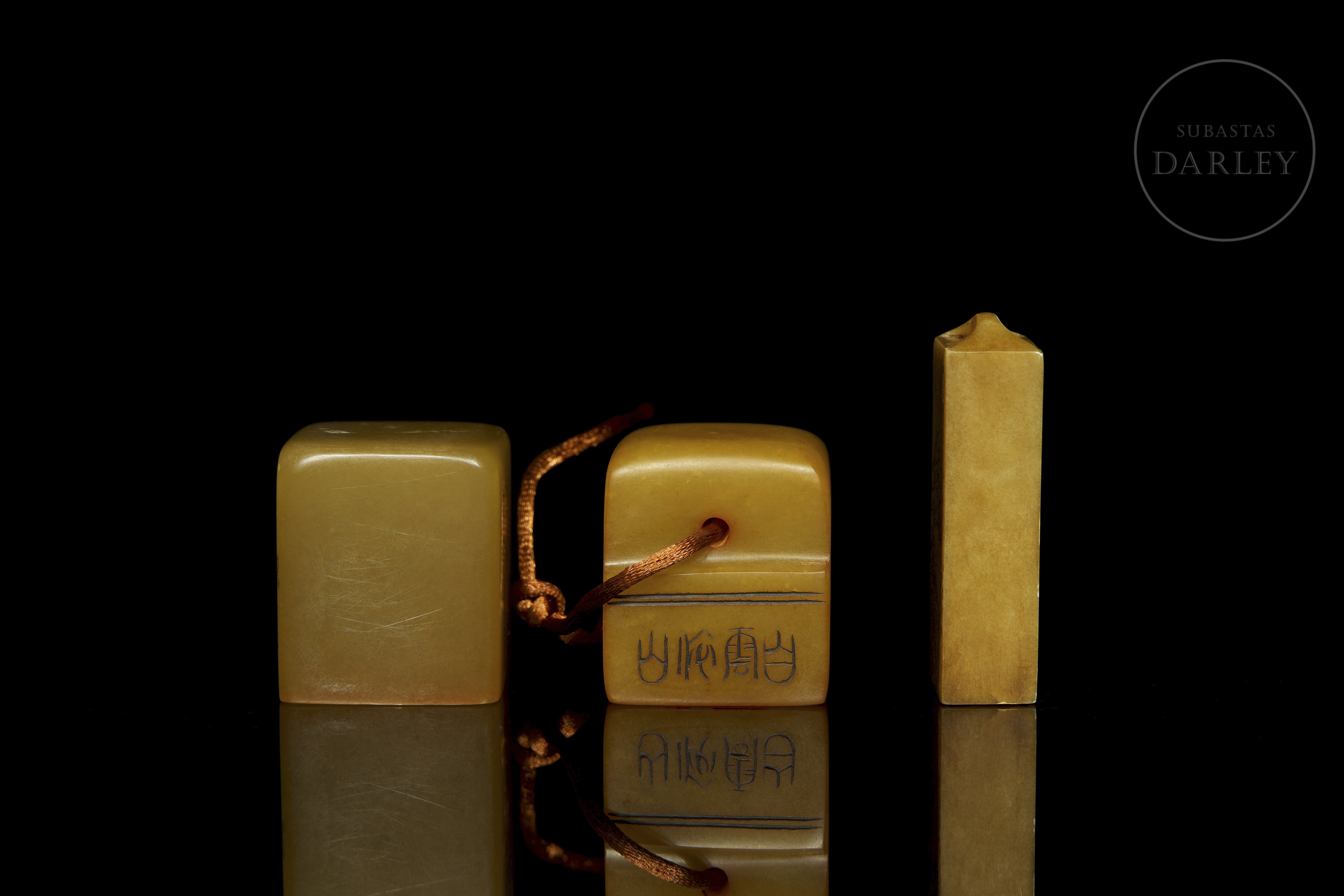 Tres sellos de piedra shoushan de tonalidad ámbar. Dos de las piezas son de formato cúbico o rectangular, finamente grabadas con escenas de montañas, flores y poemas. La tercera pieza, de formato rectangular escalonado, presenta caracteres en dos de sus caras. Las tres piezas muestran caracteres de sello en bajorrelieve con restos de lacre rojo.