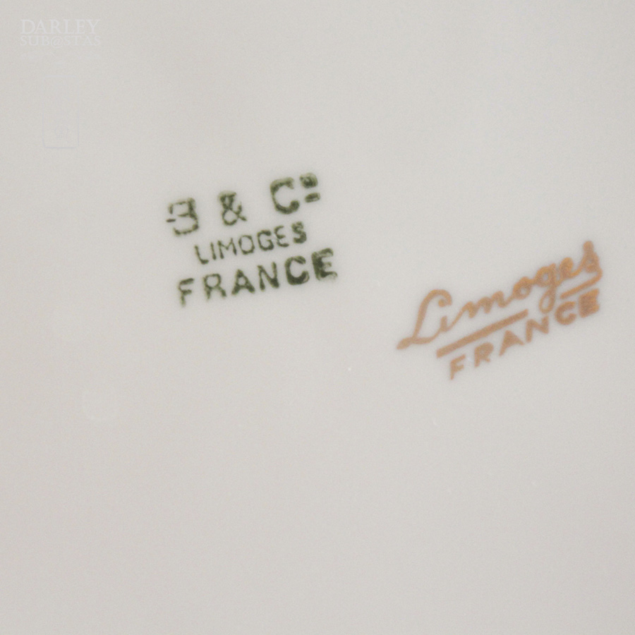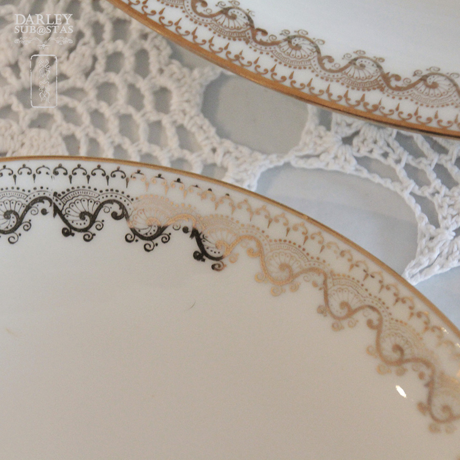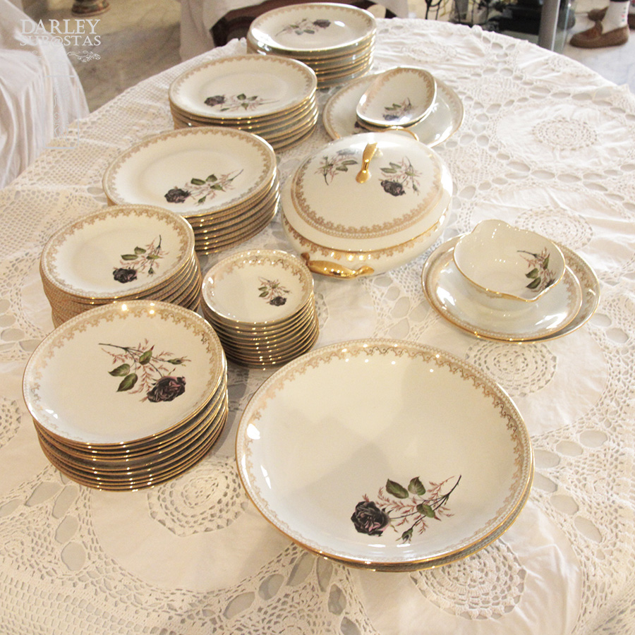 Vajilla clásica de porcelana de Limoges en color blanco con cenefa dorada y decorada con una rosa en color.