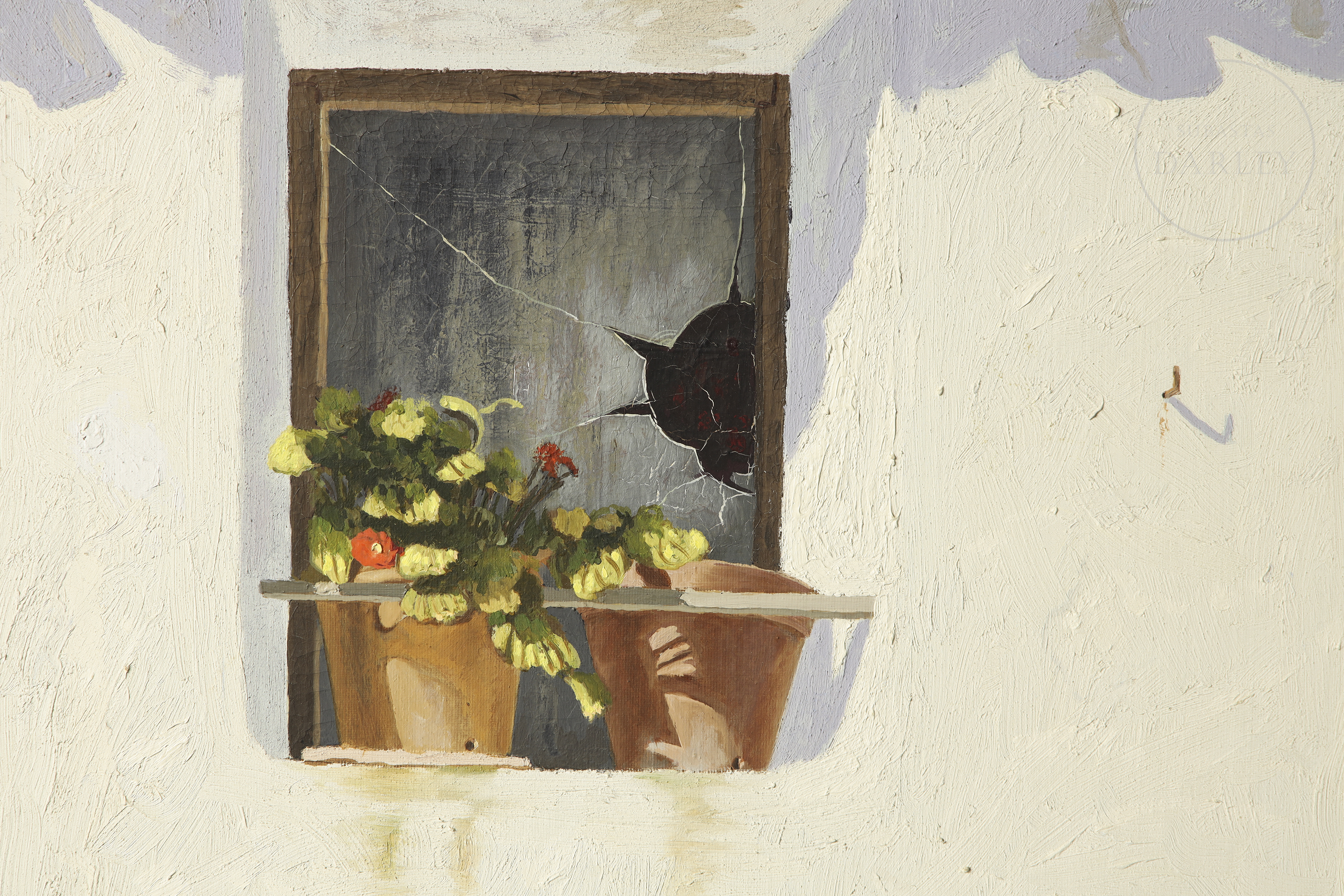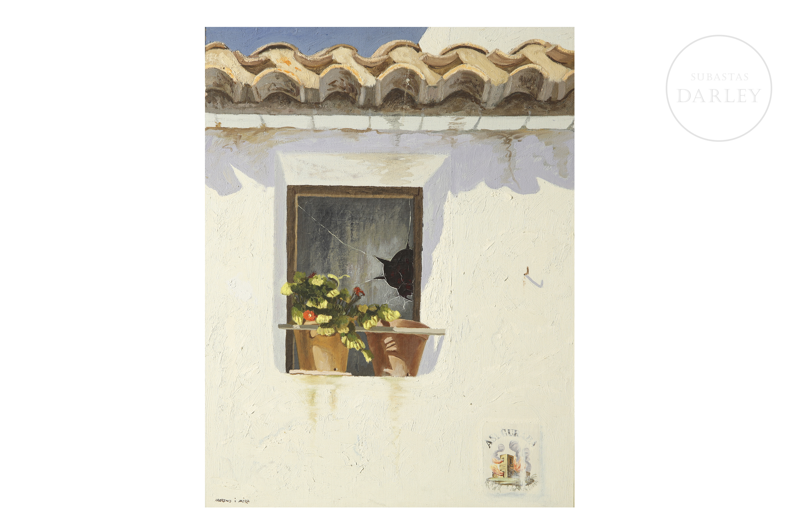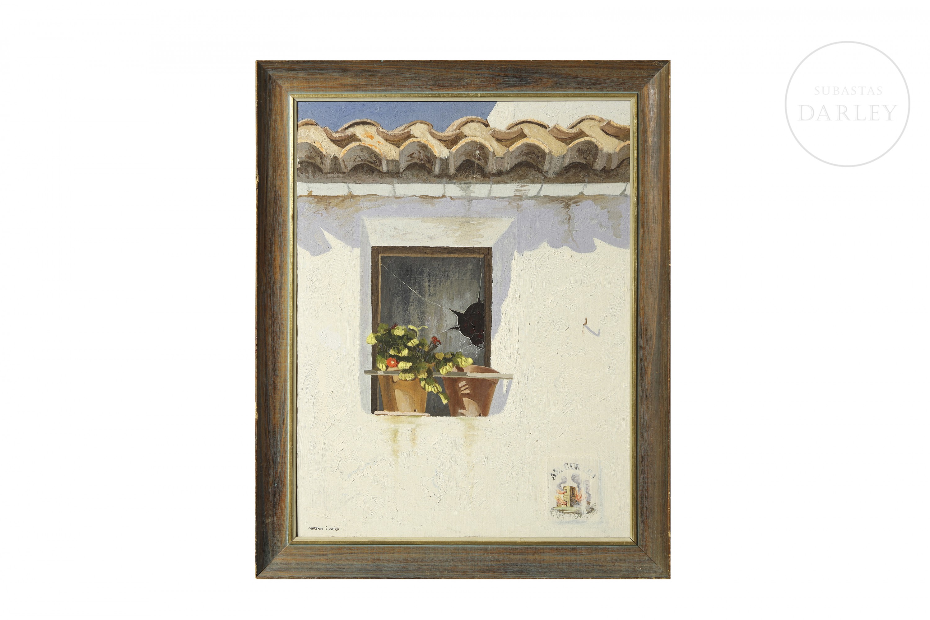 Óleo sobre lienzo. Pintura que representa una ventana y el tejado de una casa de muros blancos con dos macetas en el alféizar y una rotura en el cristal de la ventana. Firmado "Moreno i Mira" en la esquina inferior izquierda de la obra. Firmado, titulado y fechado en el reverso.