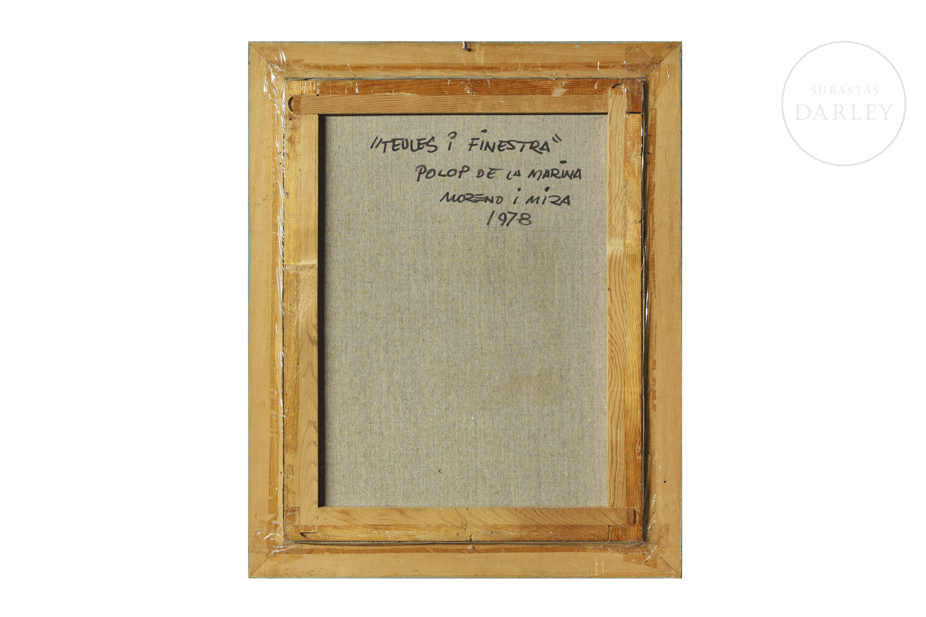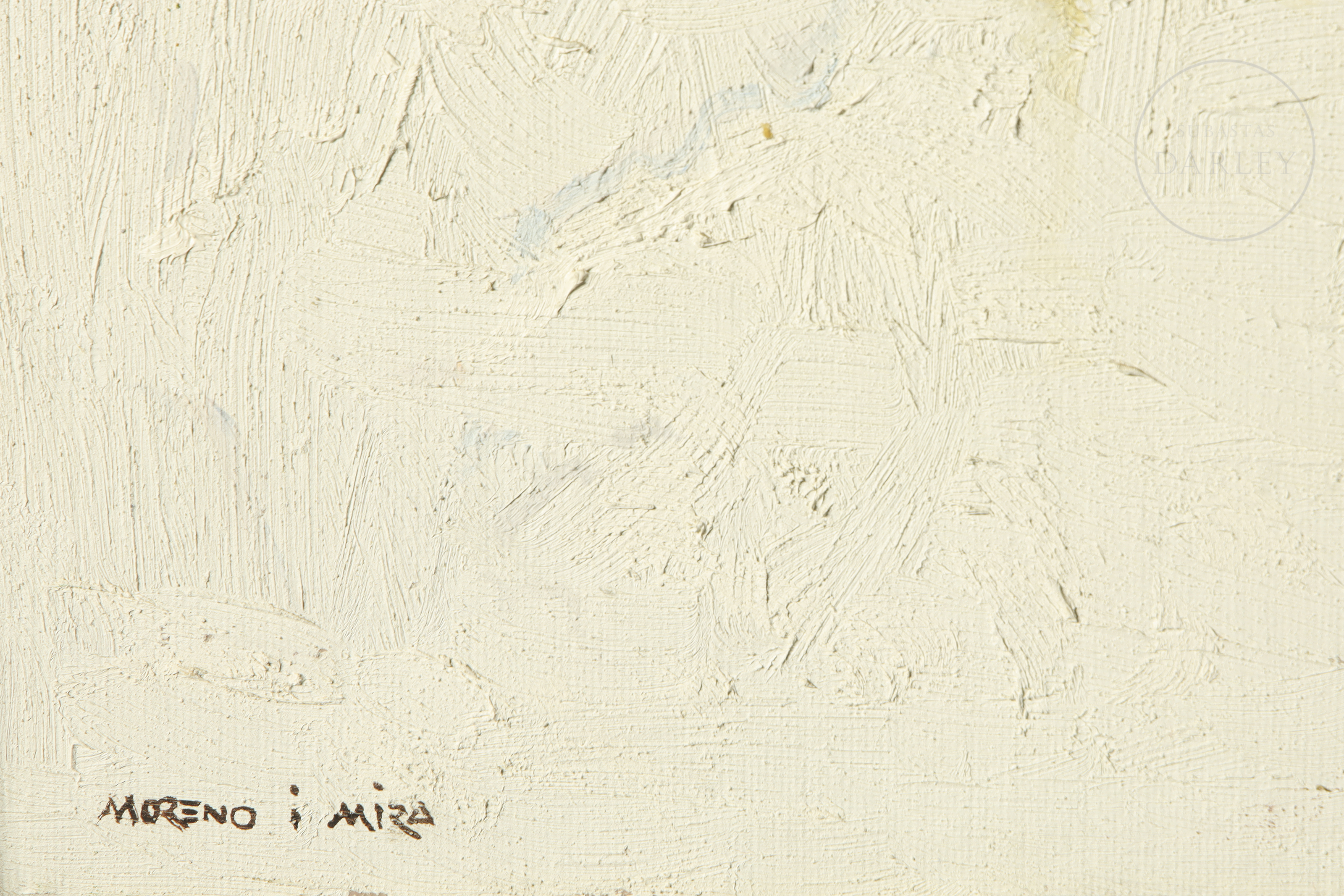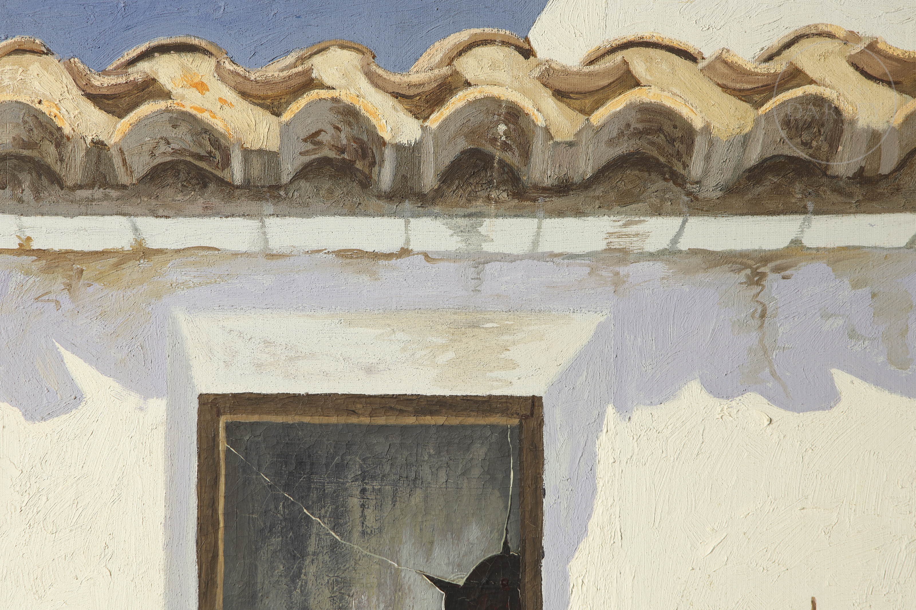 Óleo sobre lienzo. Pintura que representa una ventana y el tejado de una casa de muros blancos con dos macetas en el alféizar y una rotura en el cristal de la ventana. Firmado "Moreno i Mira" en la esquina inferior izquierda de la obra. Firmado, titulado y fechado en el reverso.