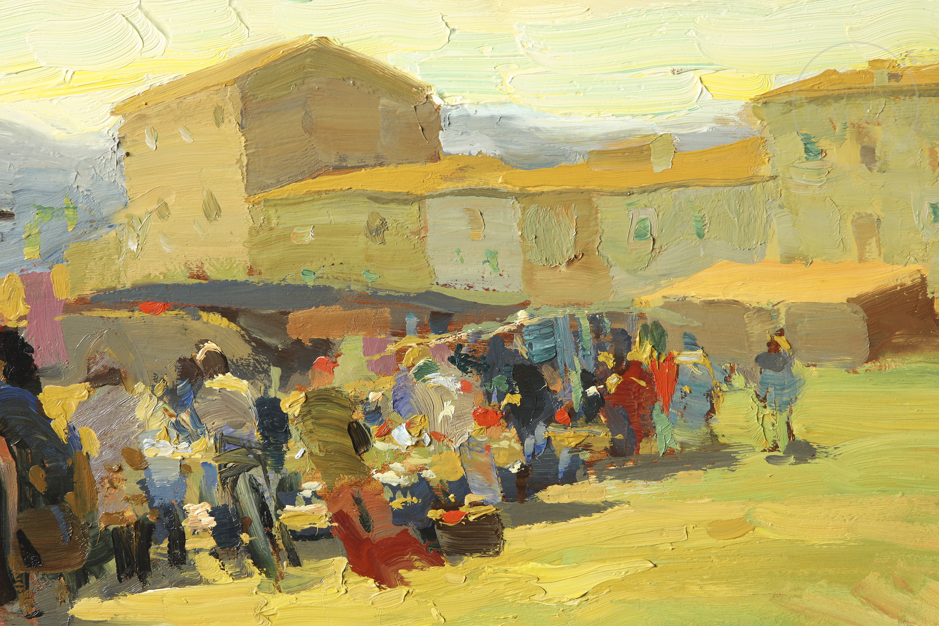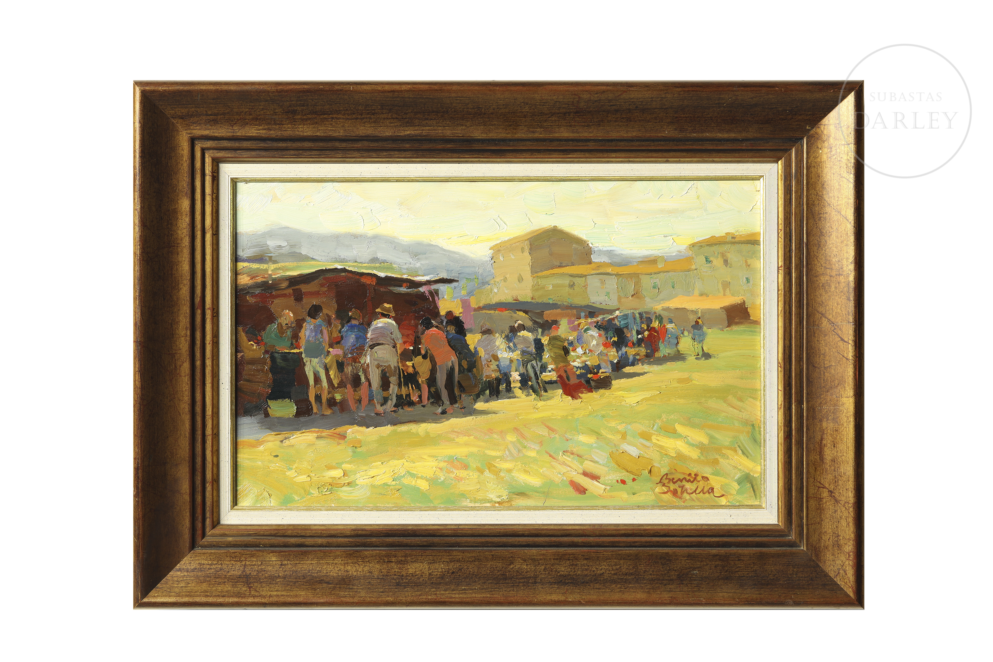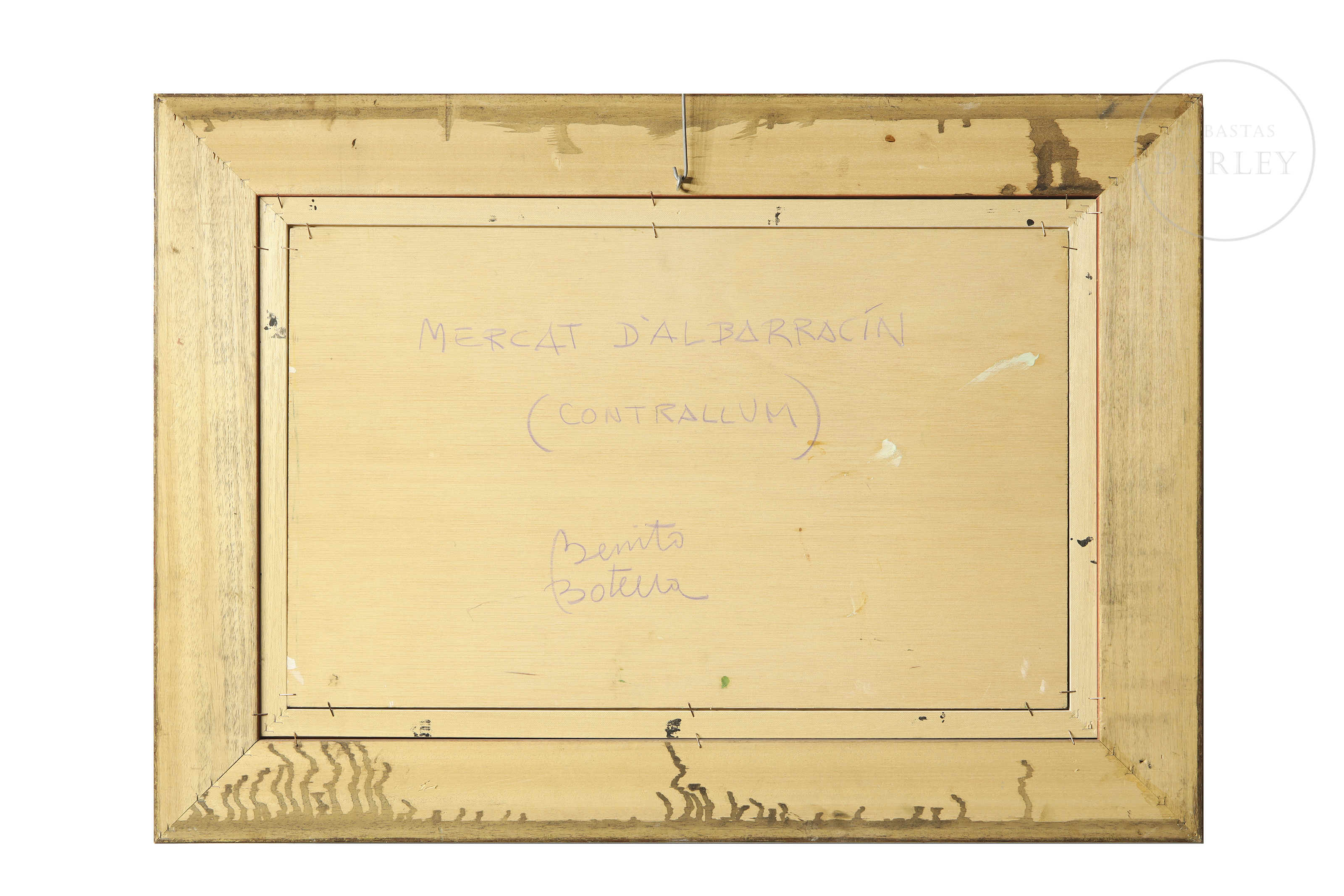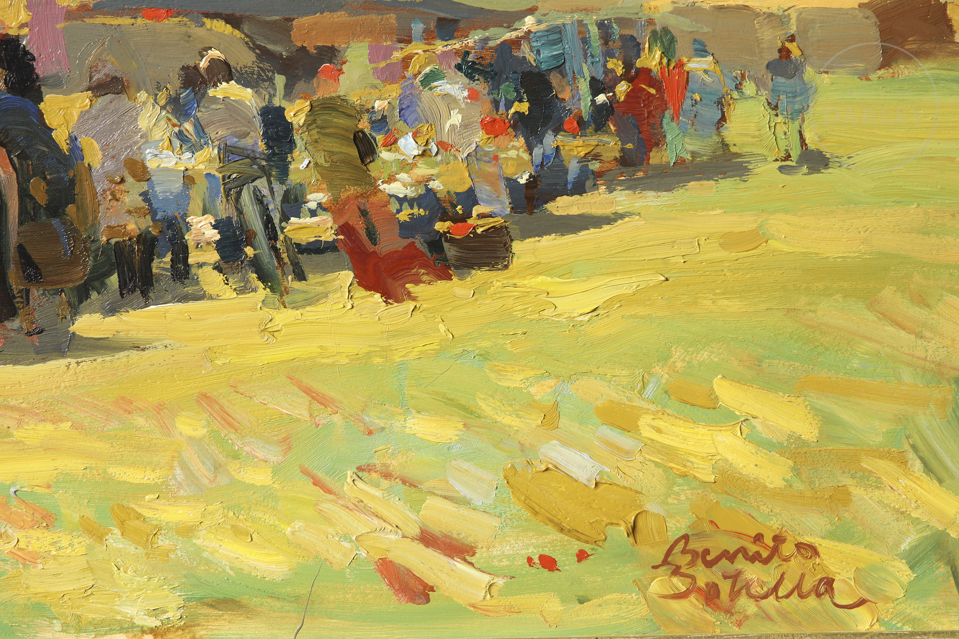 Óleo sobre tabla. Escena costumbrista que representa un mercado al aire libre, de estilo impresionista. Firmado "Benito Botella" en la esquina inferior derecha. Titulado y firmado en el reverso.