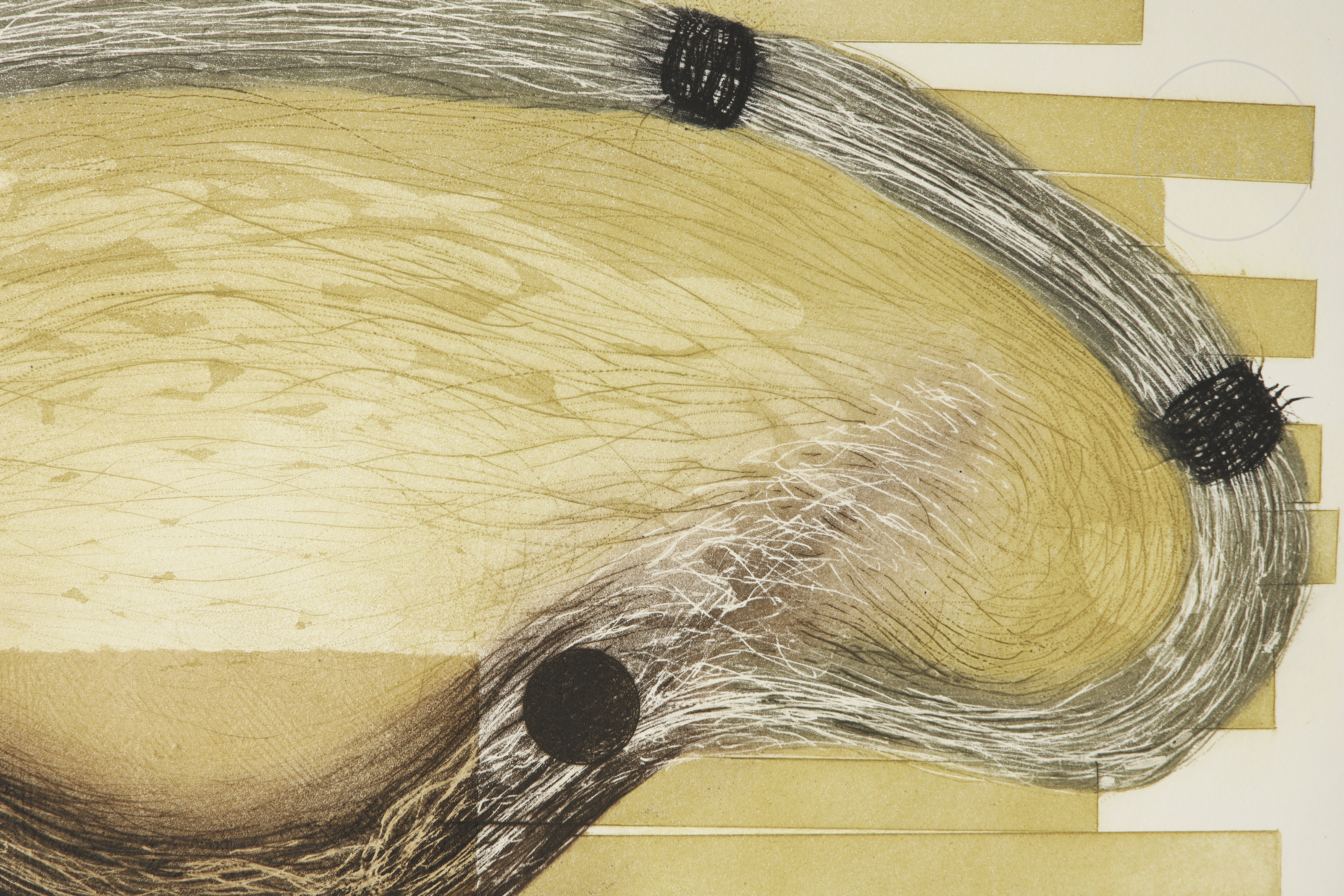 Técnica mixta sobre papel. Composición que reinterpreta la imagen de un objeto volador no identificado en tonos ocre. Firmado en la esquina inferior derecha y numerado "58/99" en esquina inferior izquierda con marca de agua "LA SIEMPRE HABANA". Pertenece a una serie de 6 gráficas firmadas ante notario en Madrid.