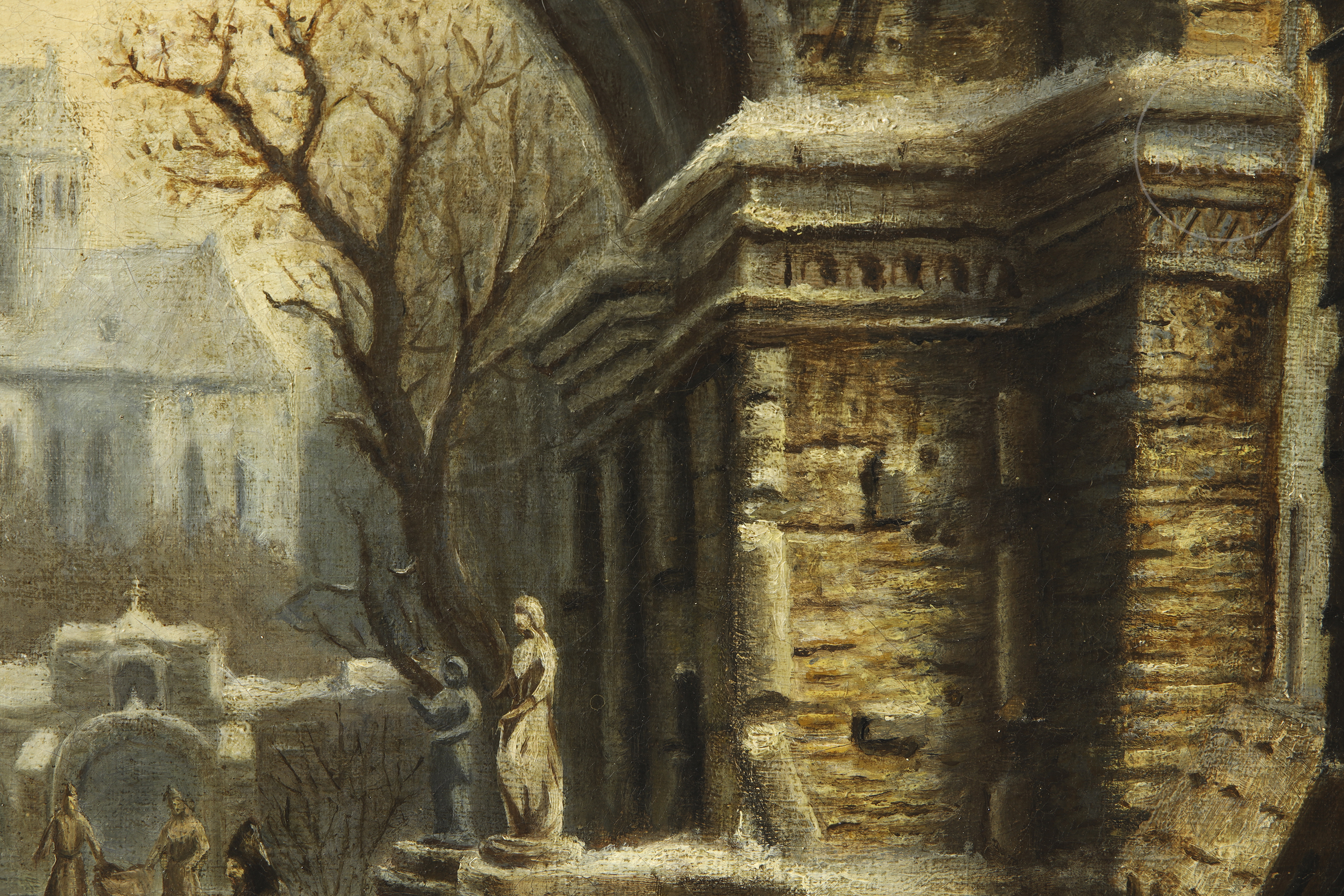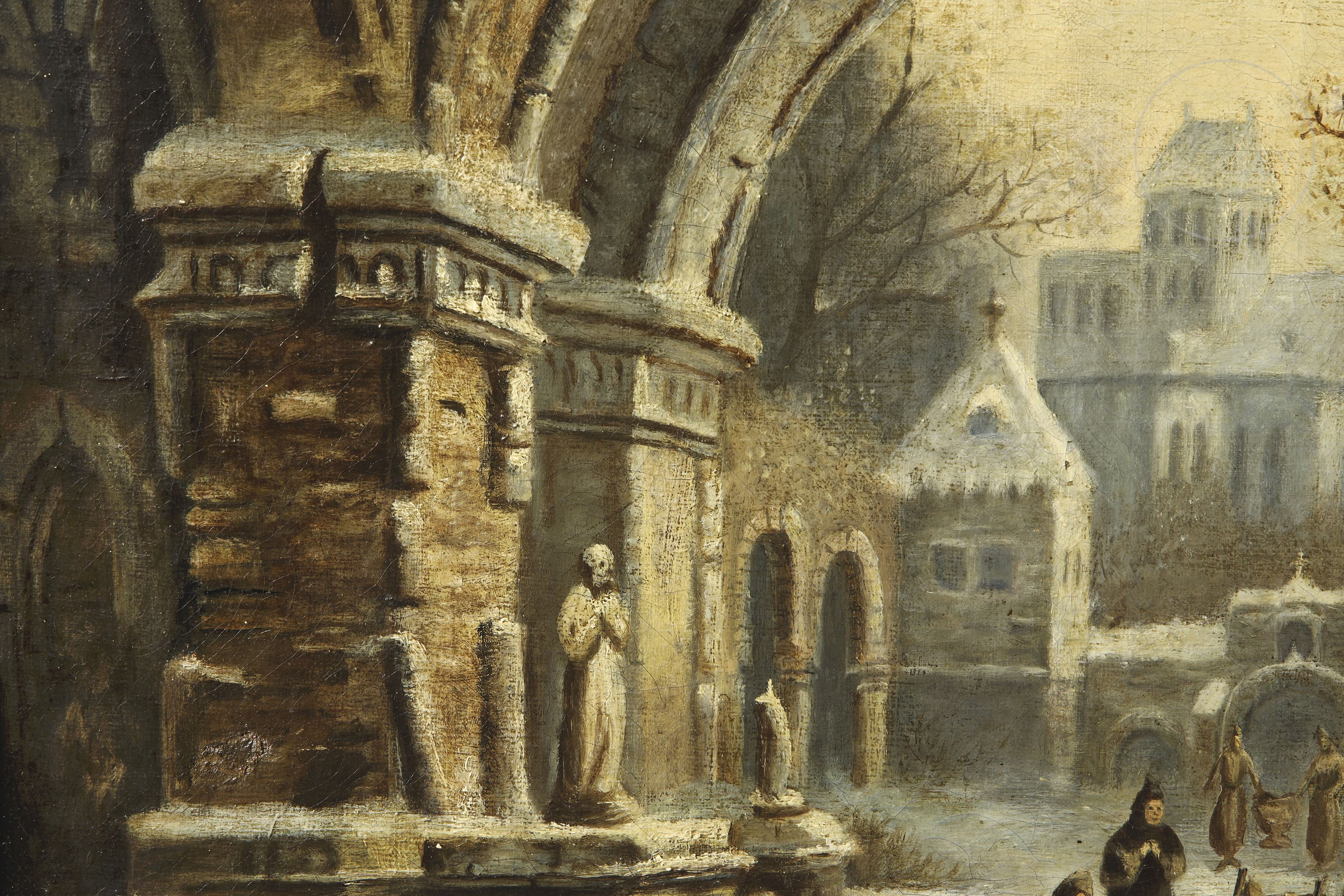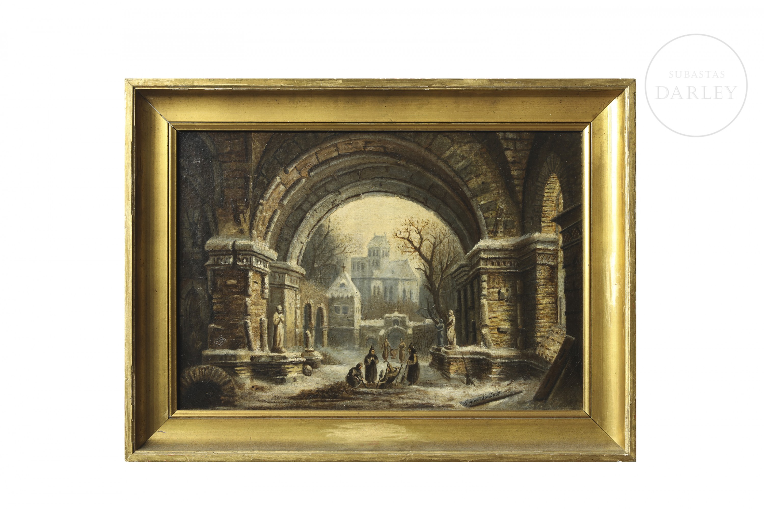 Óleo sobre lienzo. Escena invernal que representa a dos monjes en un claustro gótico nevado, siguiendo la obra original de Albert Bredow realizada circa 1885. Firmada en el margen inferior derecho.