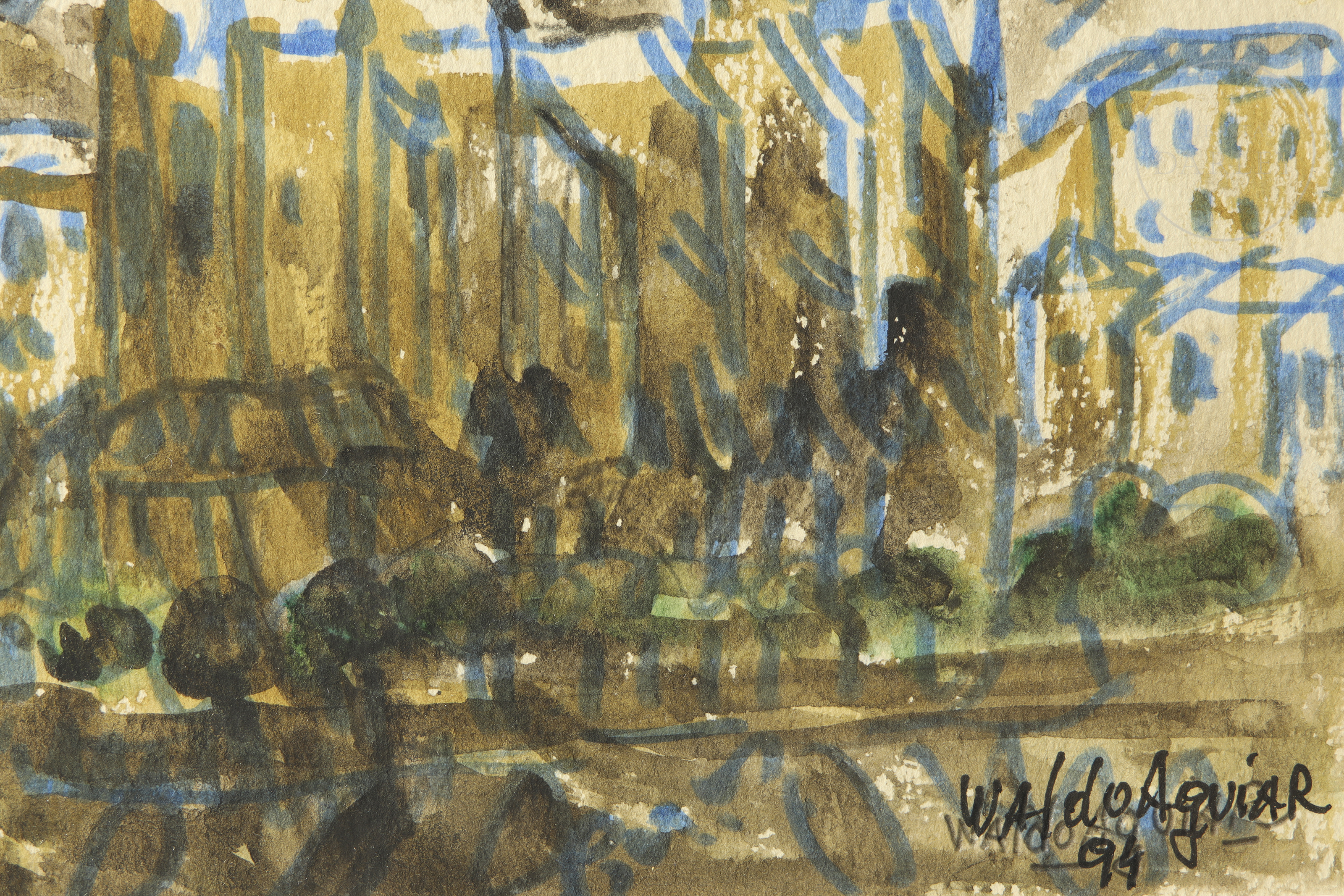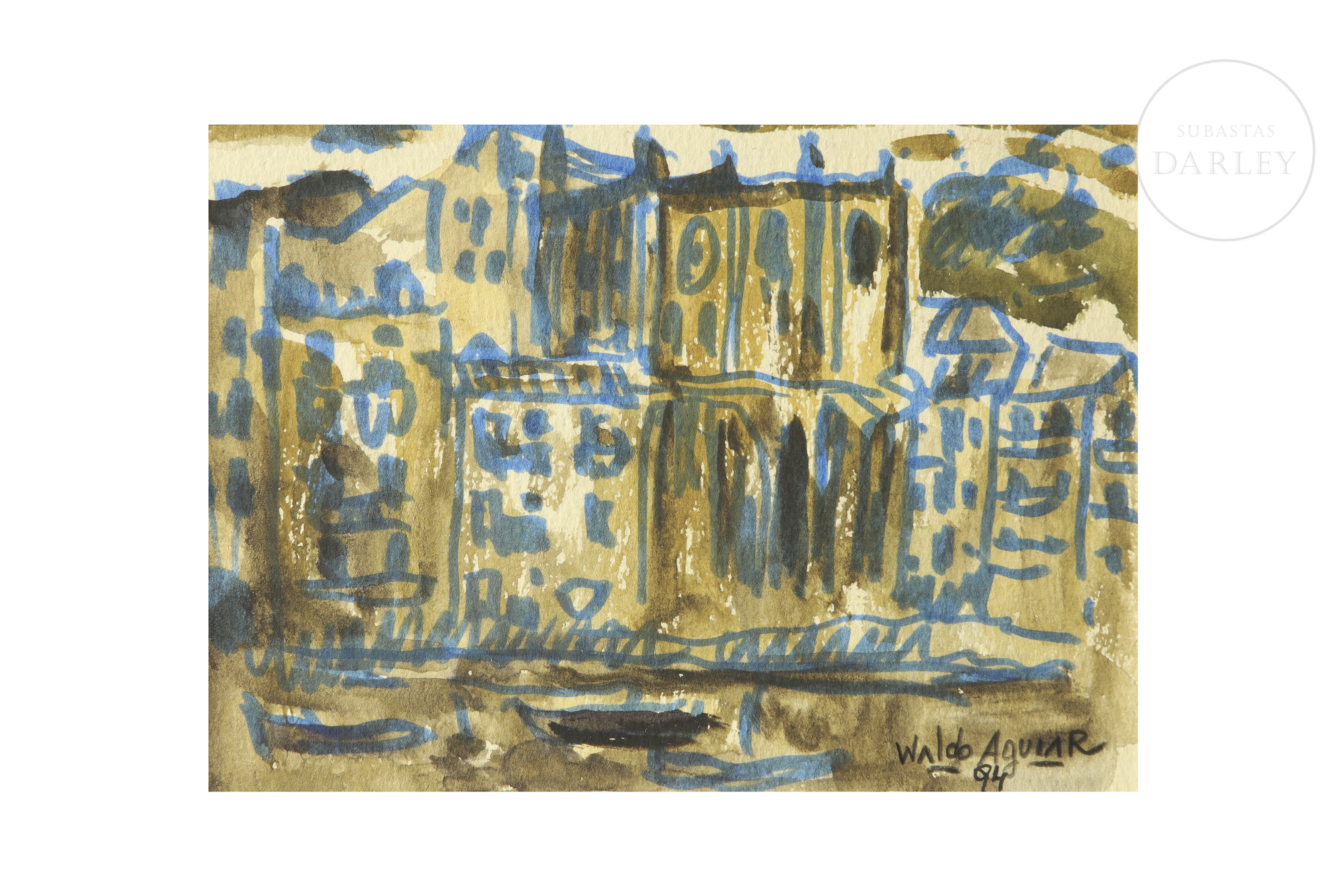 Técnica mixta sobre papel. Pareja de pequeños apuntes de paisajes urbanos, resueltos con un trazo rápido y gestual. Ambas obras firmadas y fechadas "Waldo Aguiar "94" en la esquina inferior derecha.