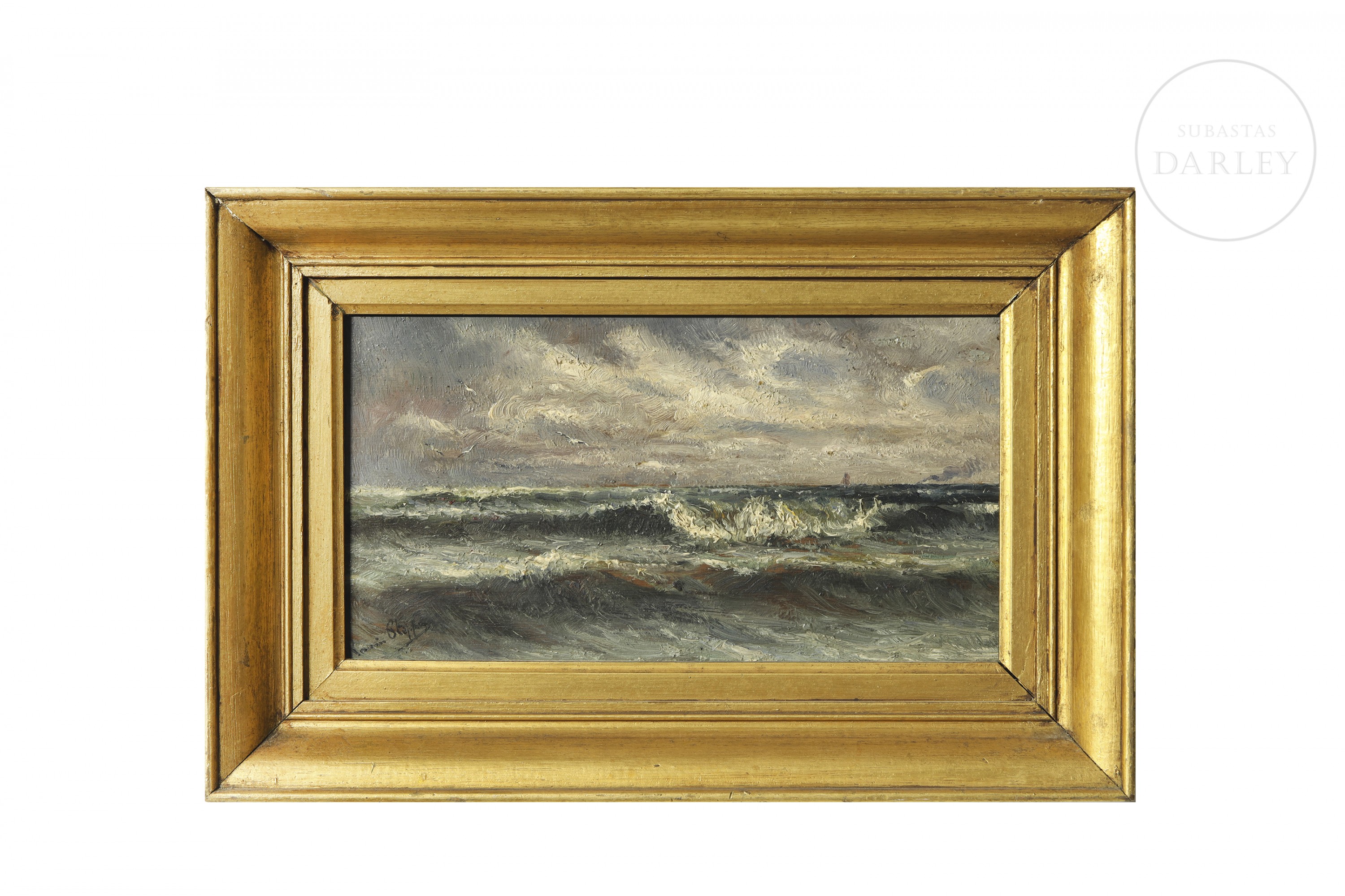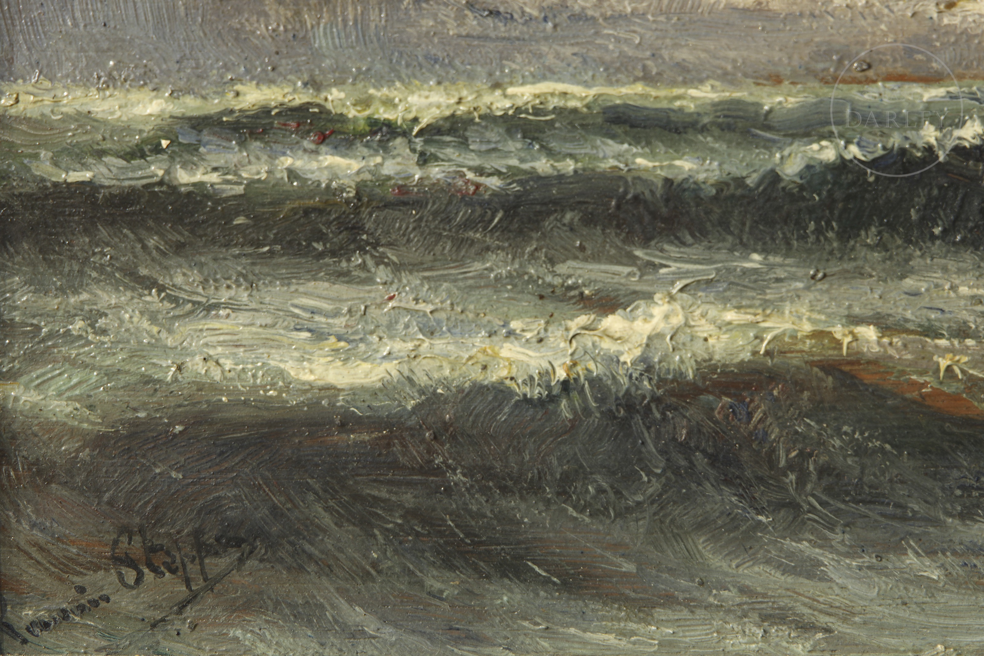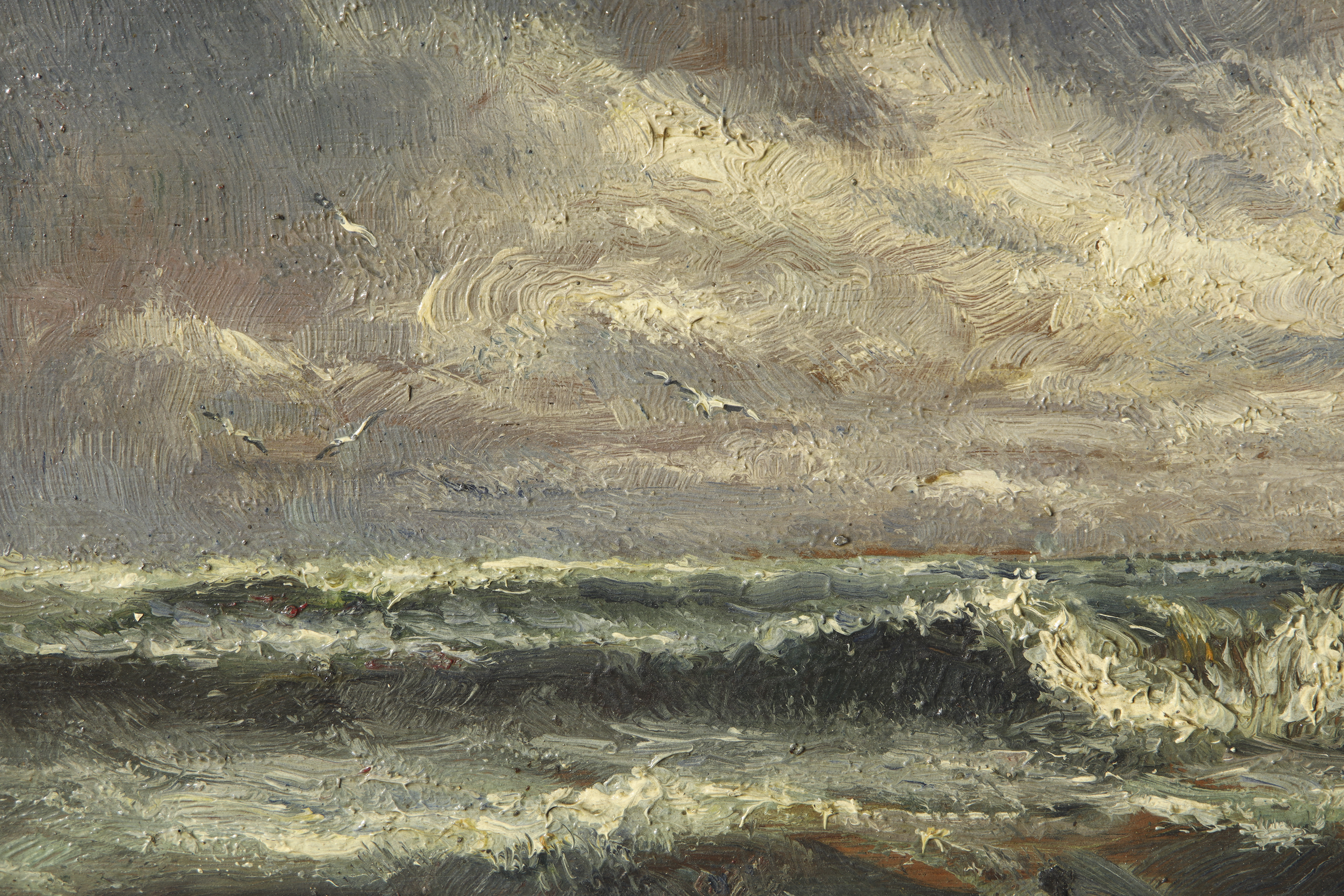 Oil on panel. Seascape depicting rough waves under a stormy sky, with small white seagulls flying overhead. Signed in the lower right corner.