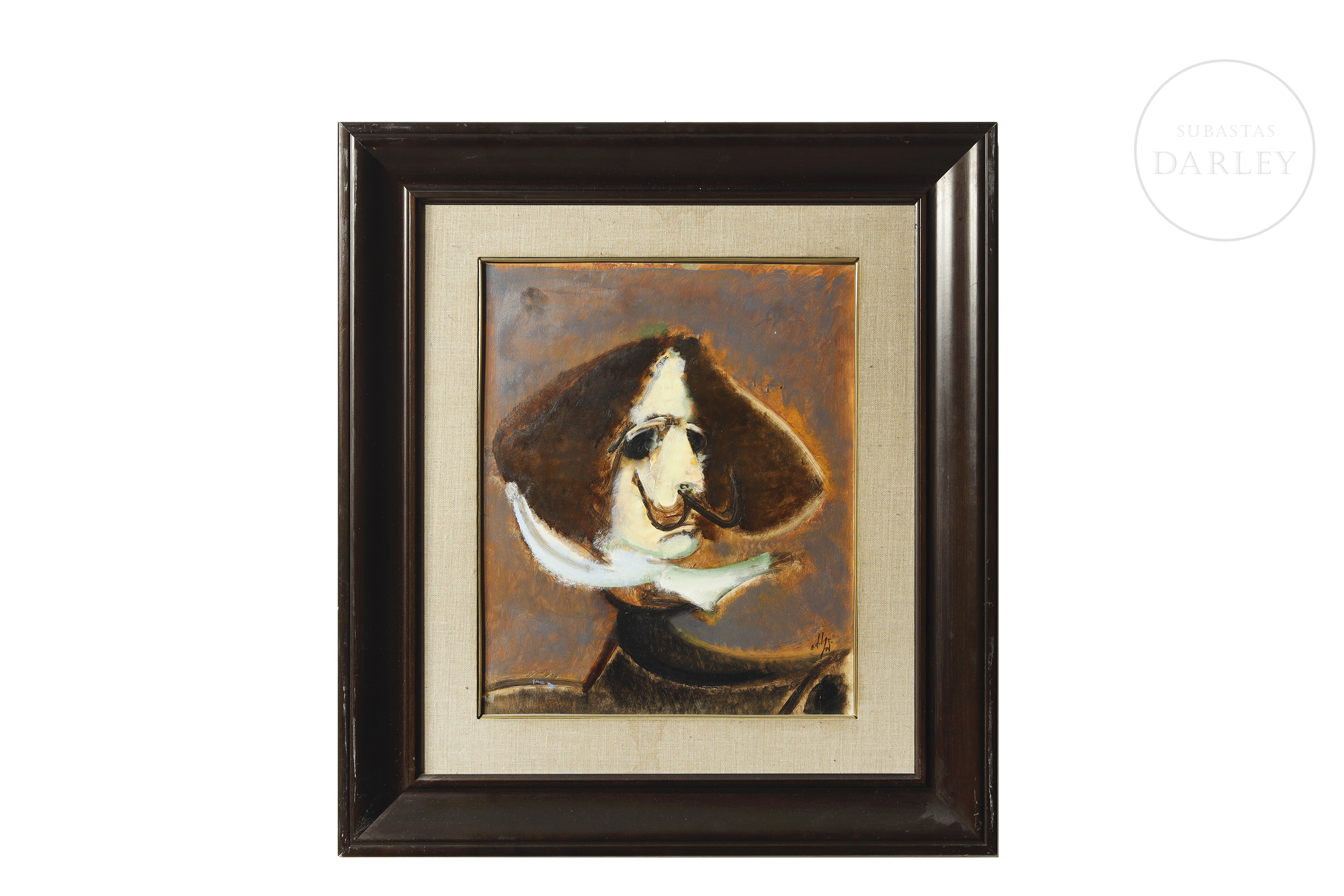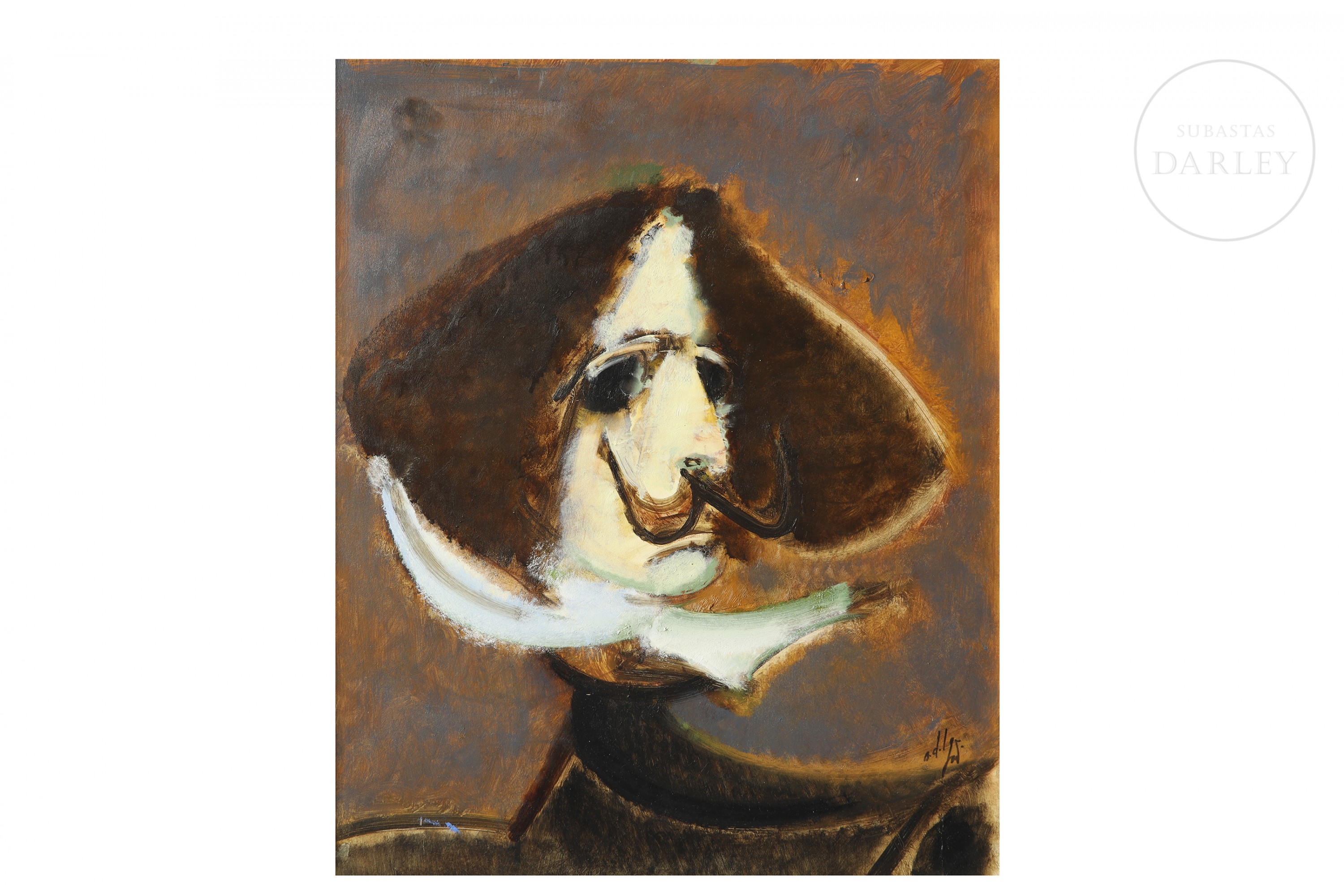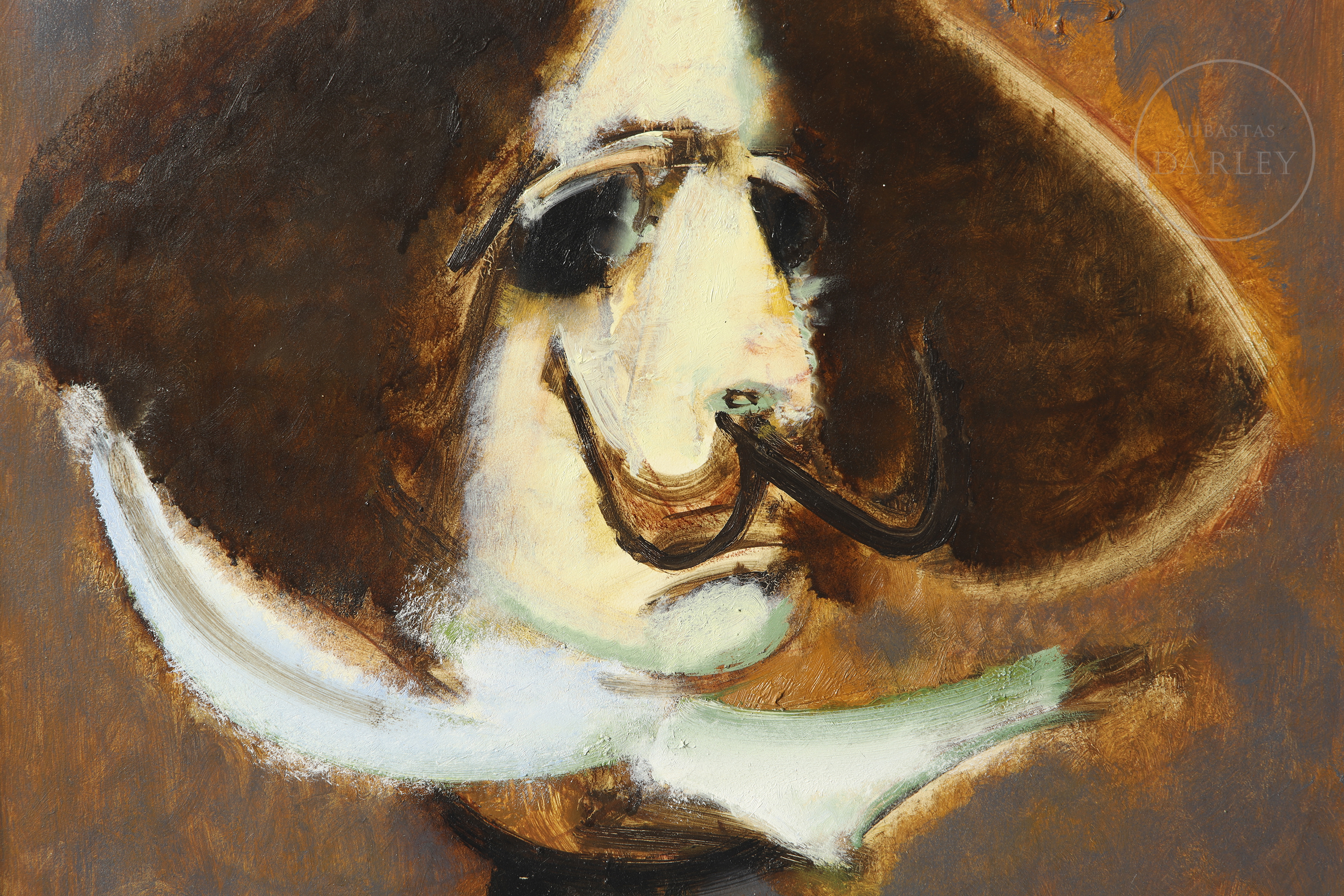 委拉斯开兹肖像,戴宽檐帽蓄须,以浓密表现主义笔触绘制。暗色调以棕褐与赭石为主,与中央面部光泽形成鲜明对比。右下角签名“A. D. L.”。背面签名、题年份并附题词。