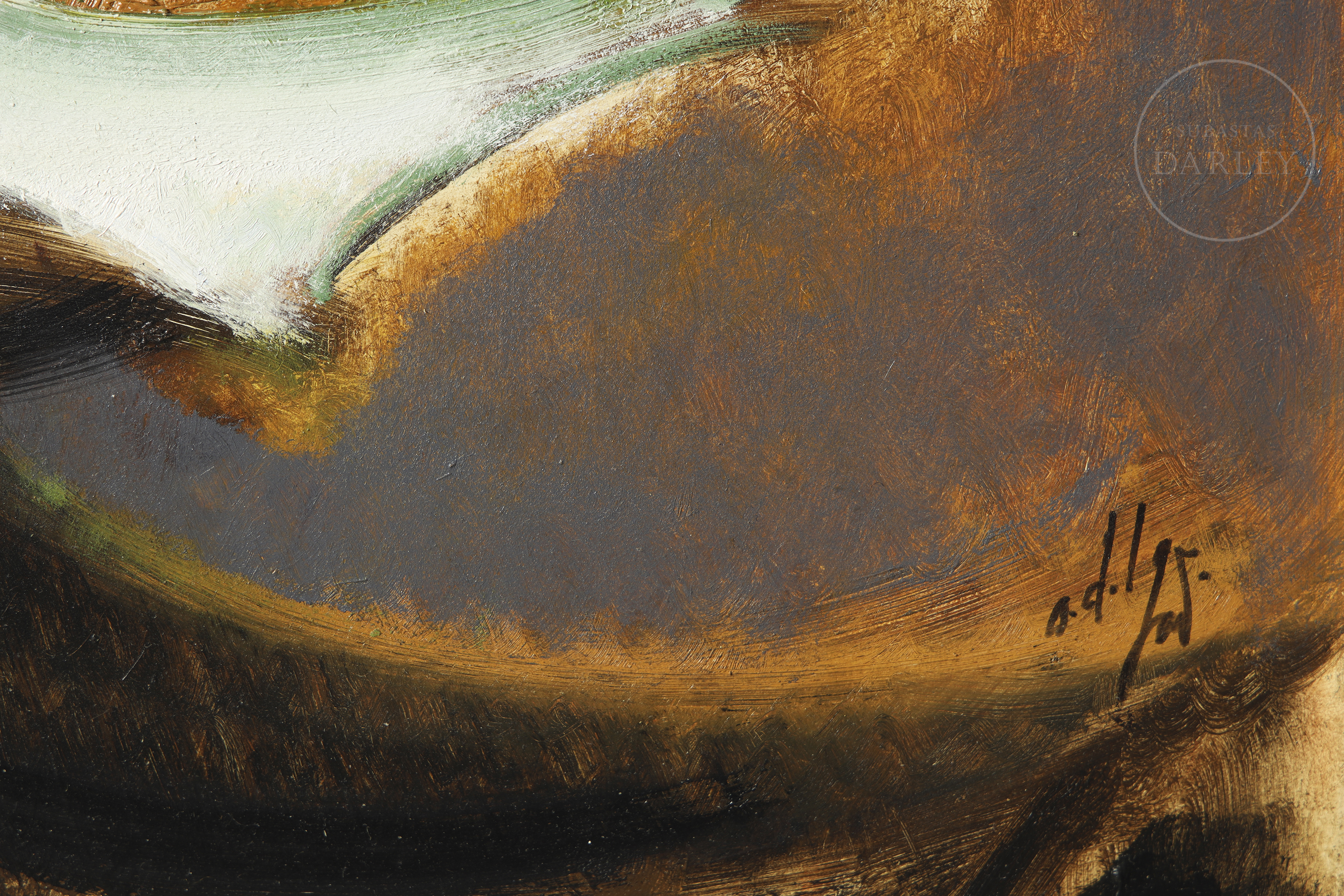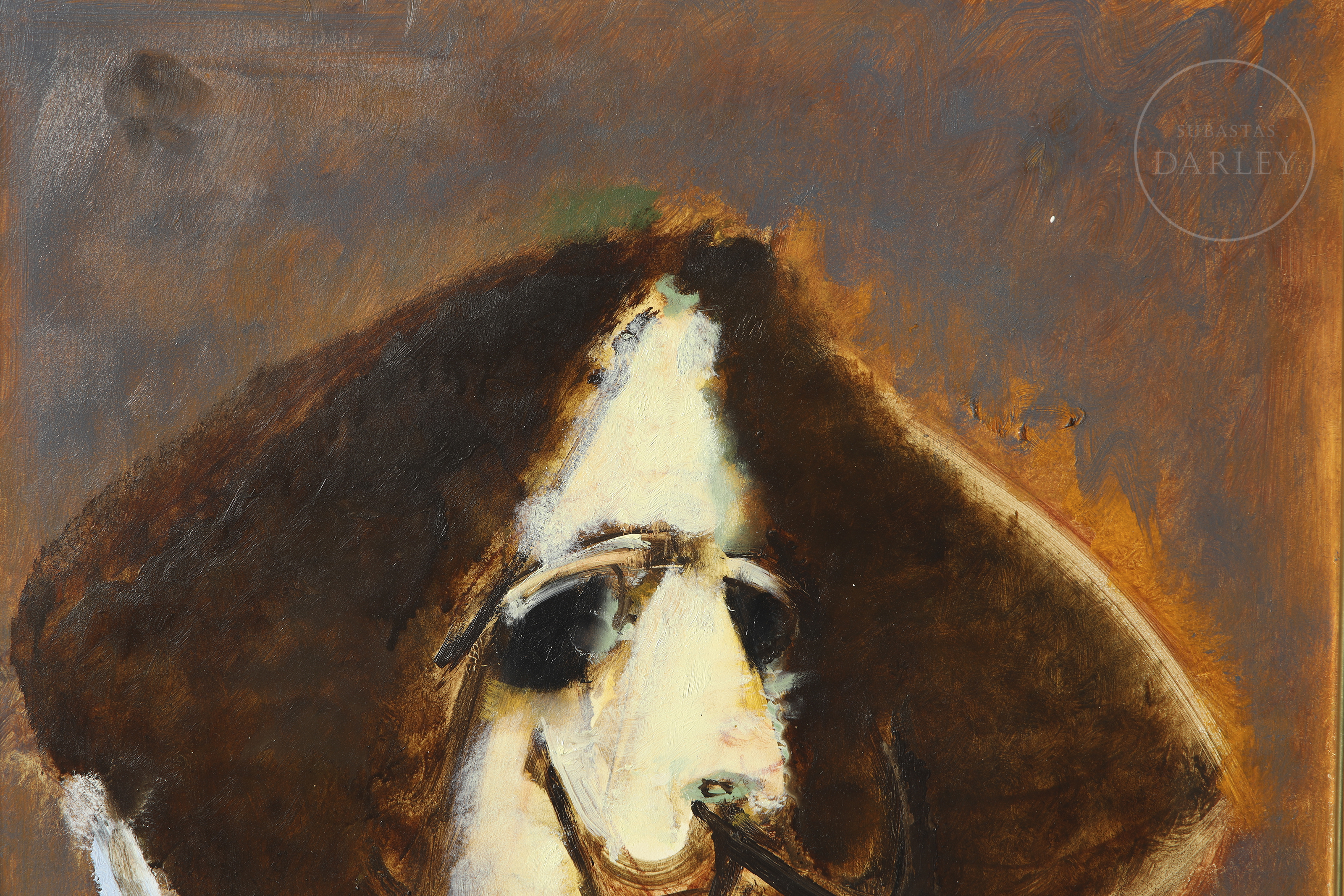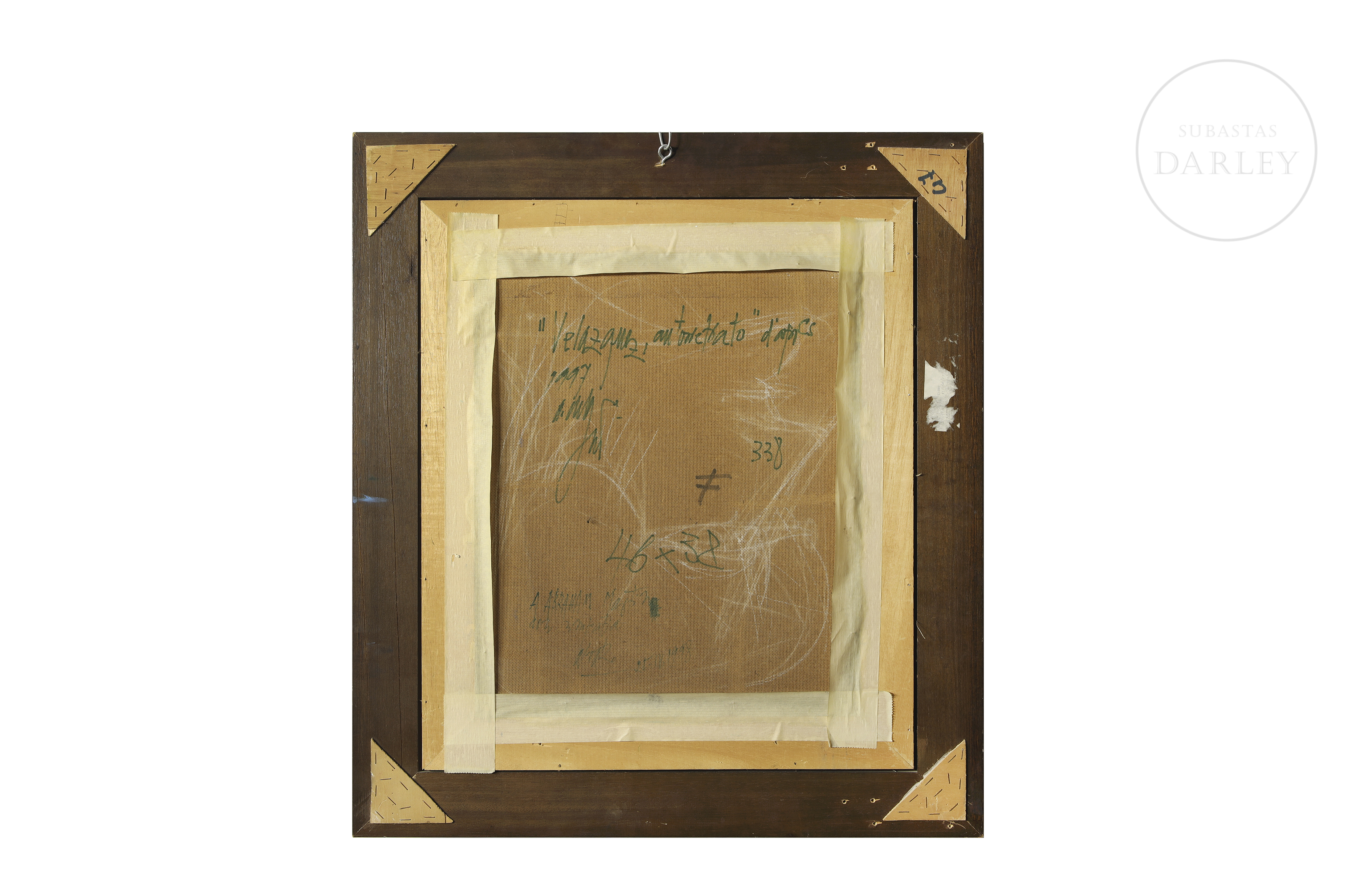 委拉斯开兹肖像,戴宽檐帽蓄须,以浓密表现主义笔触绘制。暗色调以棕褐与赭石为主,与中央面部光泽形成鲜明对比。右下角签名“A. D. L.”。背面签名、题年份并附题词。