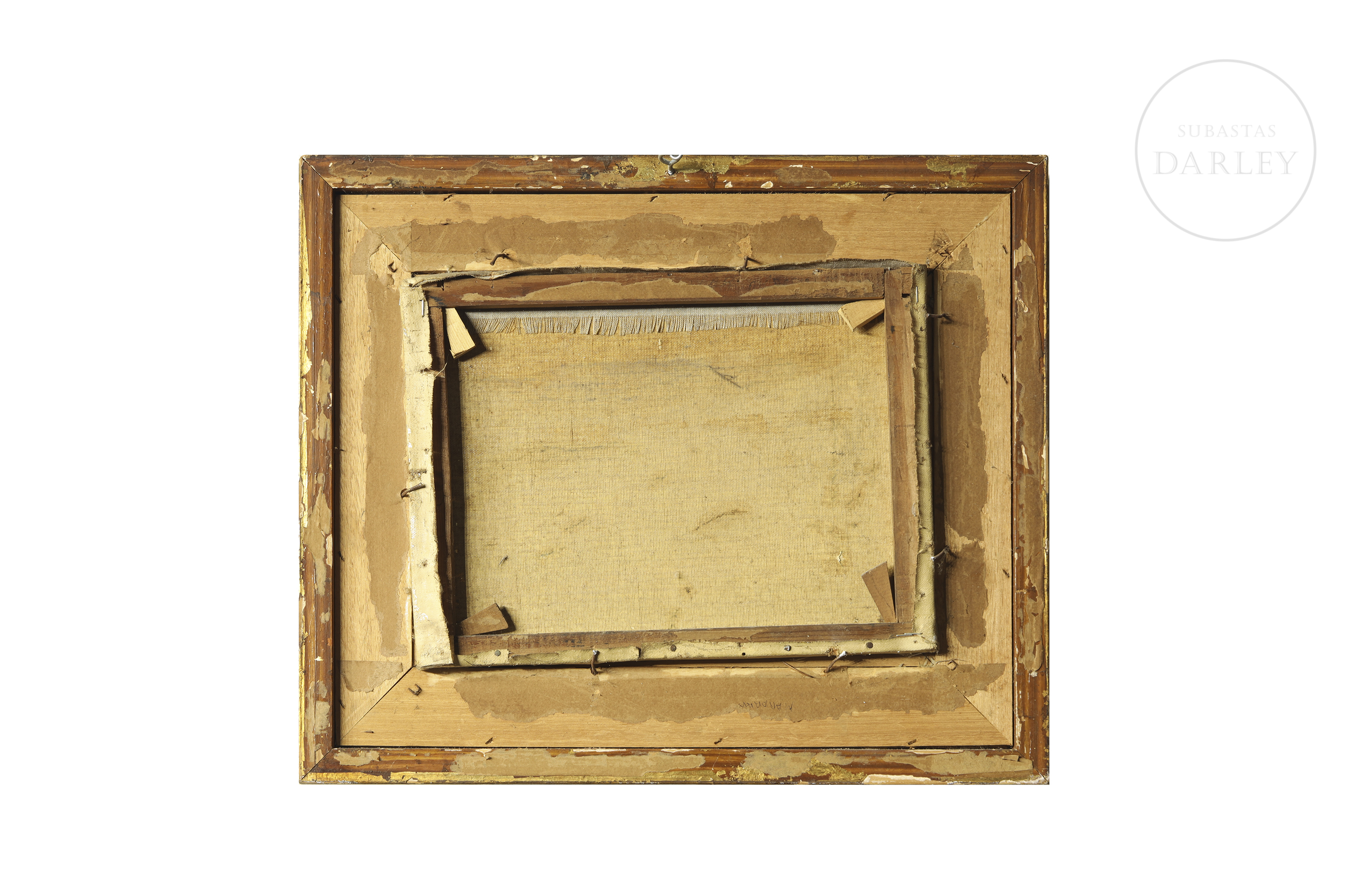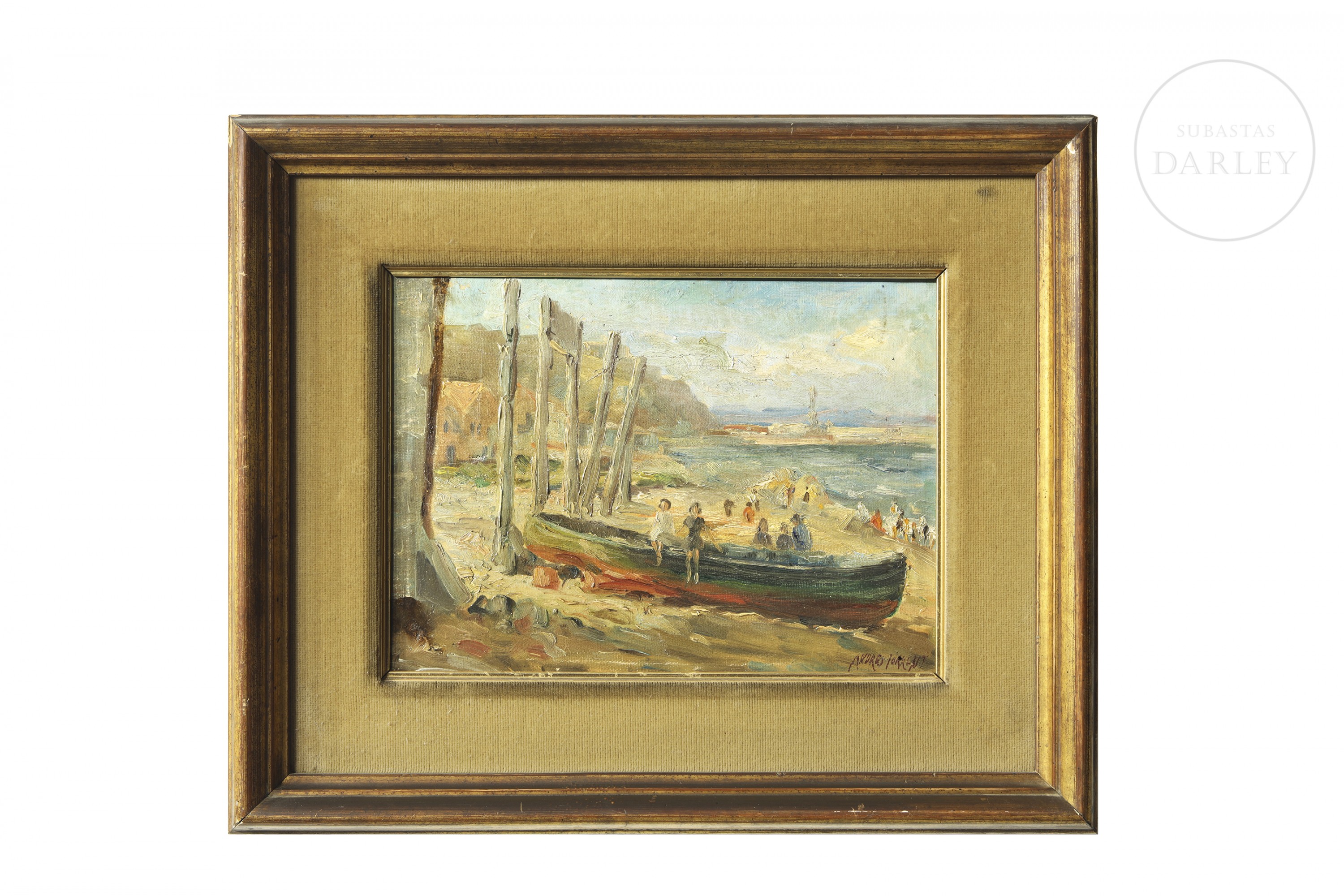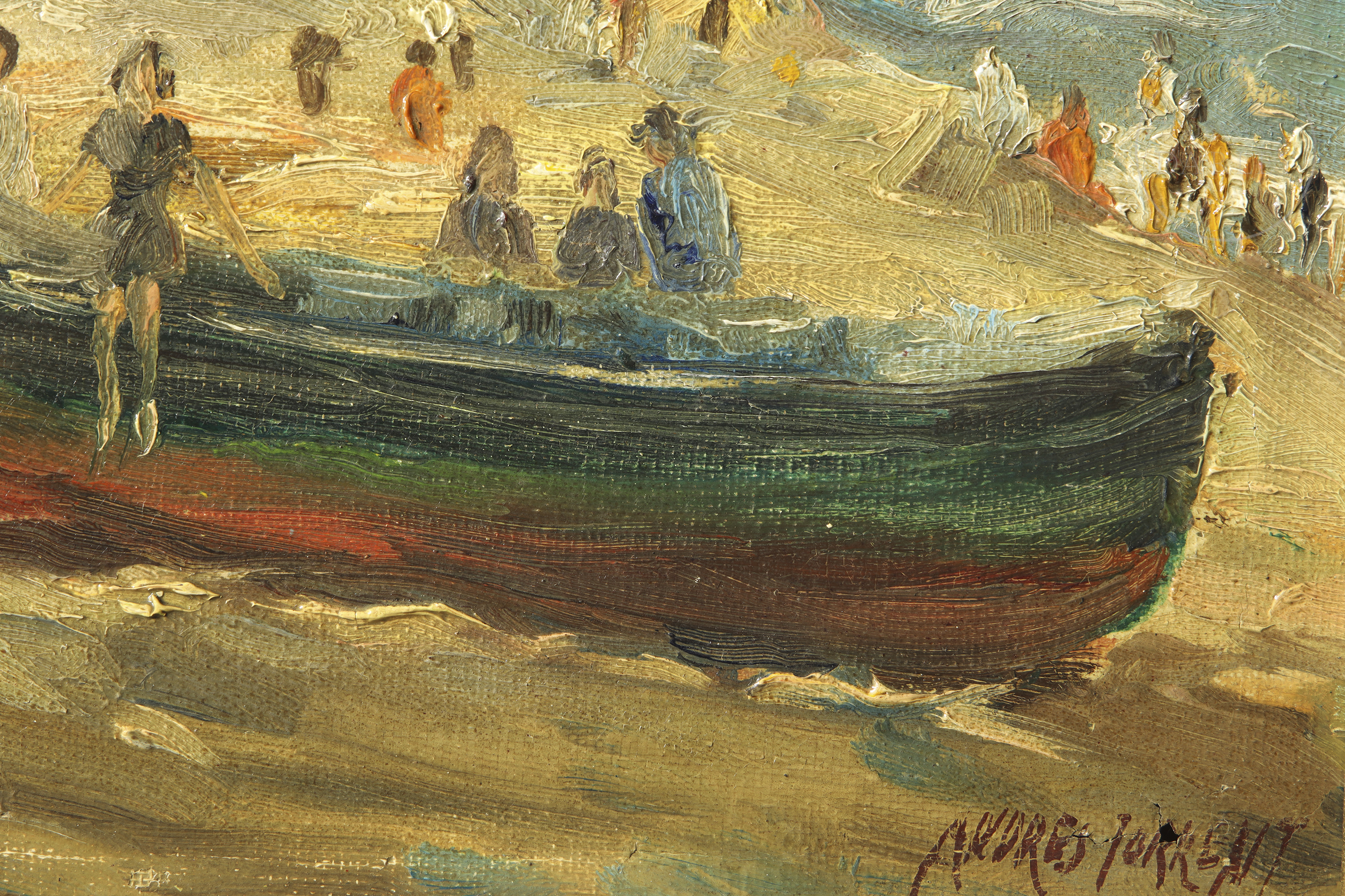 Oil on canvas. A genre scene depicting a crowded beach where two girls sit on a large colourful boat. Signed ‘Andrés Torrent’ in the lower right corner.