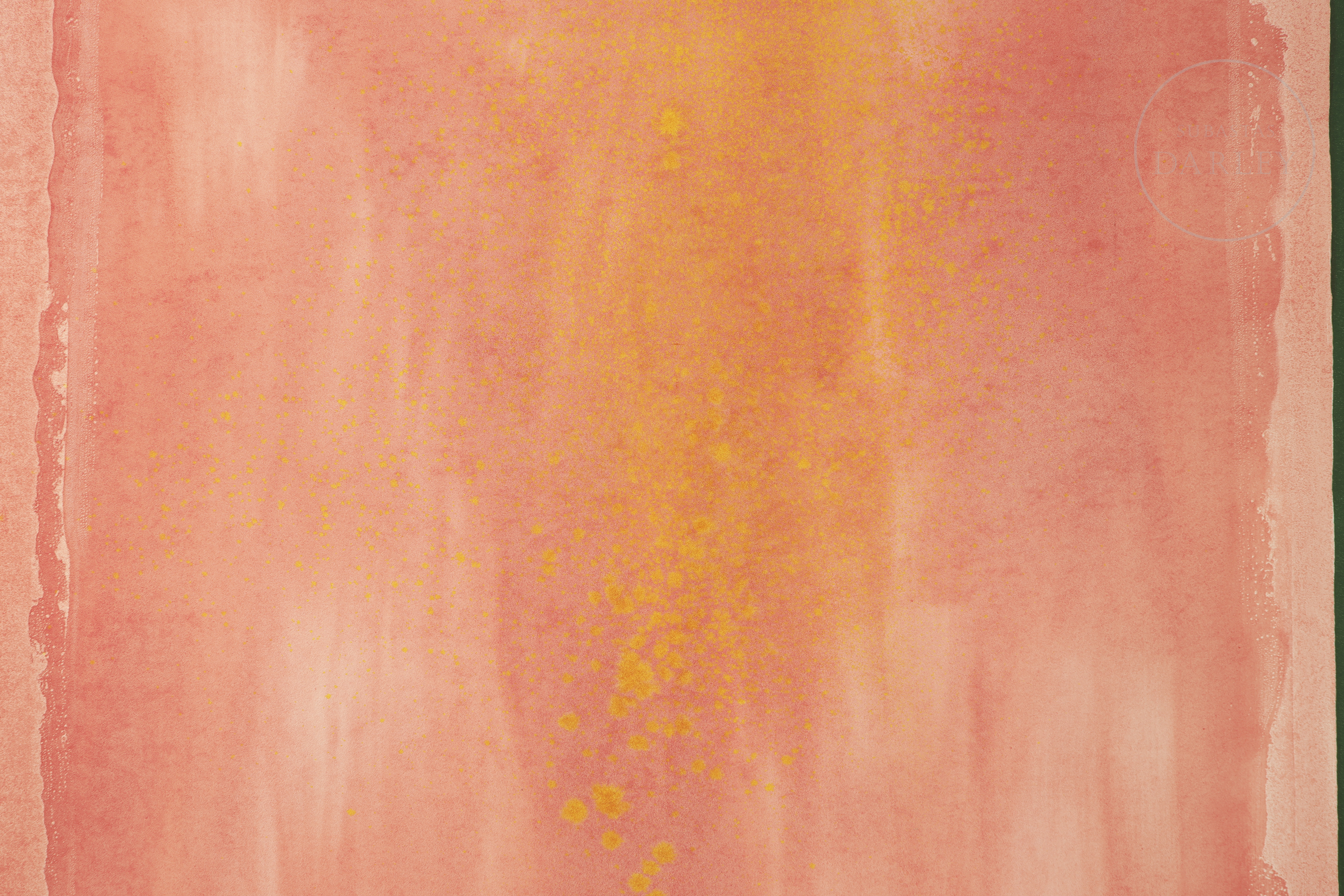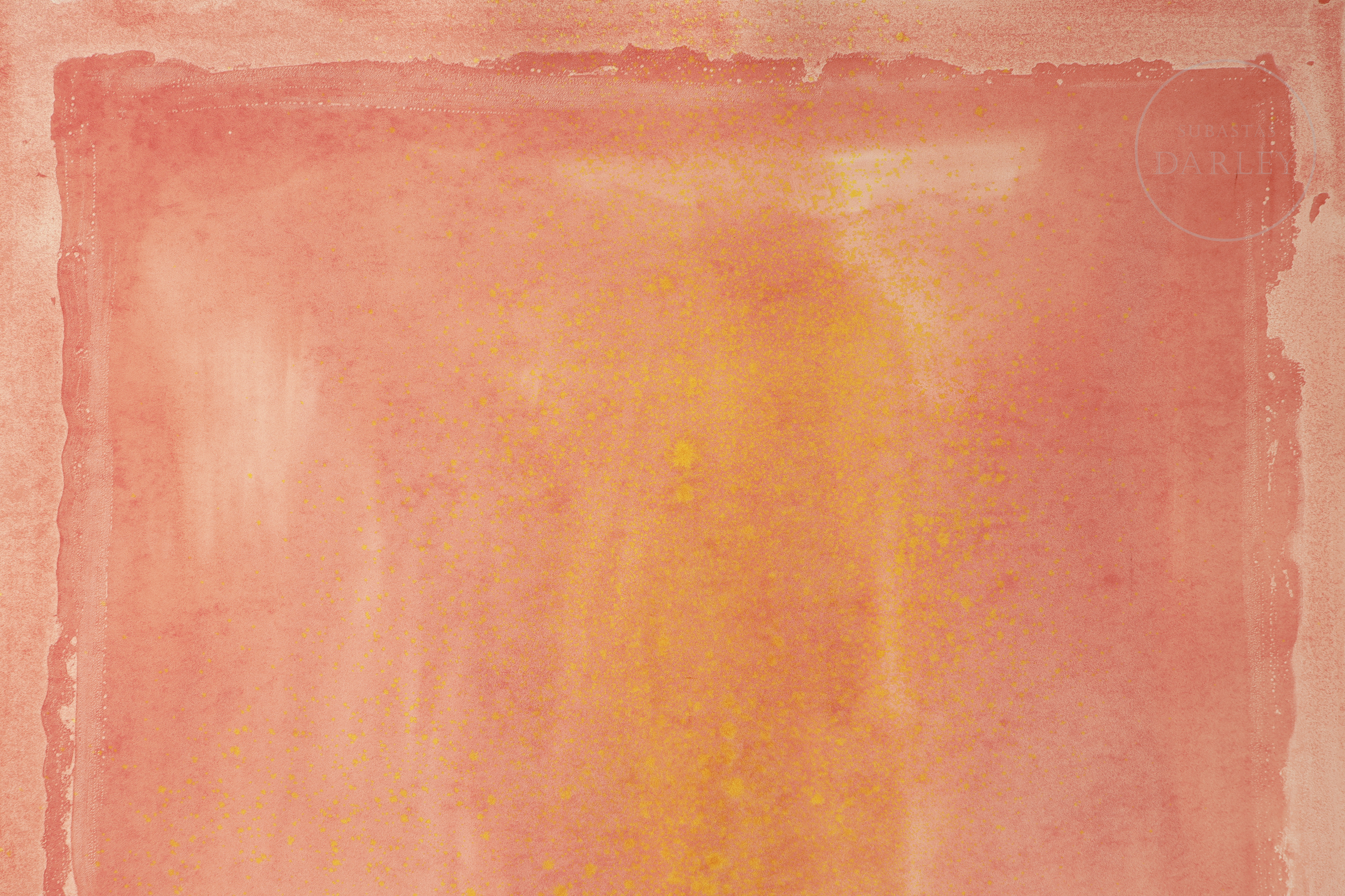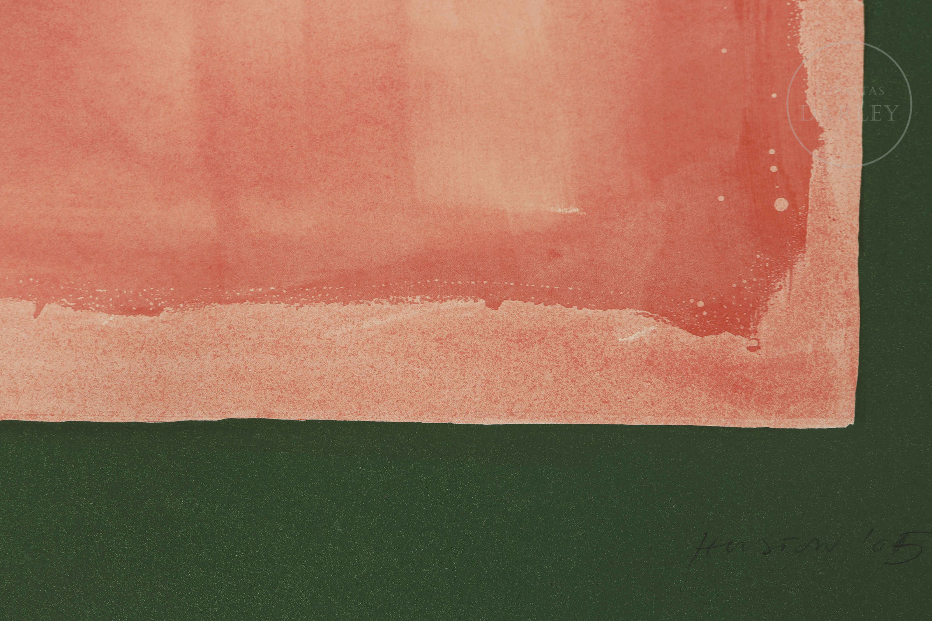 丝网印刷结合手工绘制,纸本。抽象构图呈现渐变粉橙色调的色域,黄色泼溅增添层次与活力,深绿色衬纸镶边。右下角签名并标注日期“Huston 05”,左下角铅笔编号“26/75”。