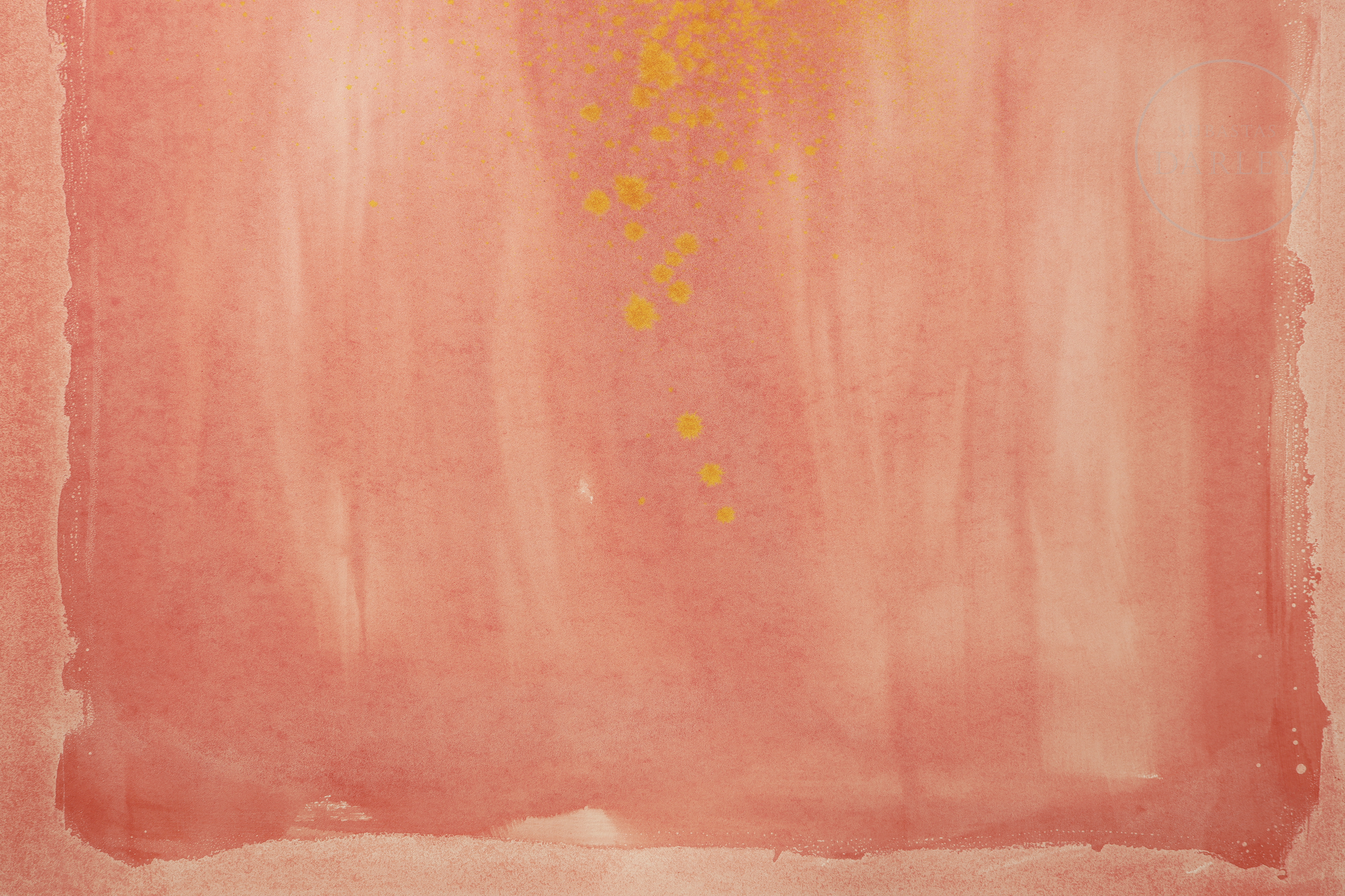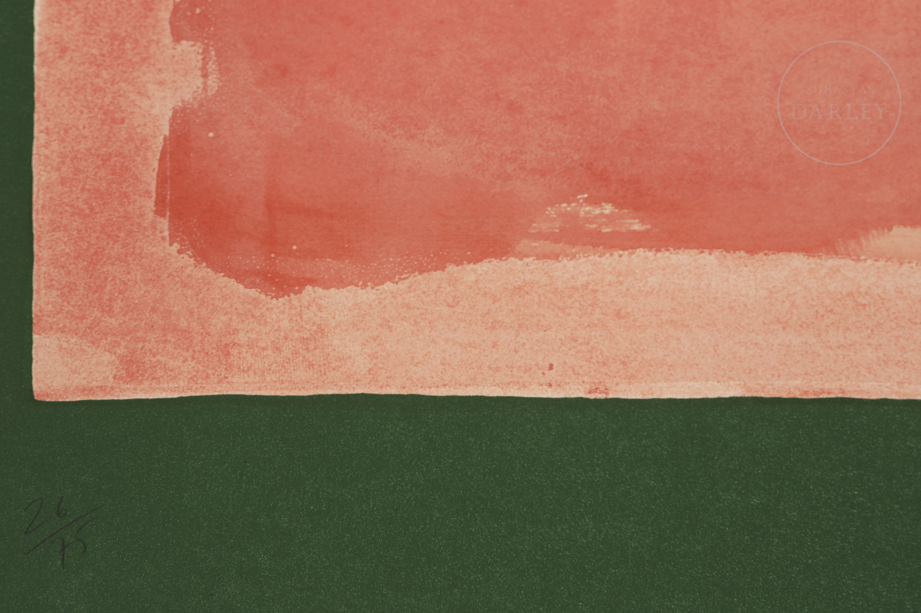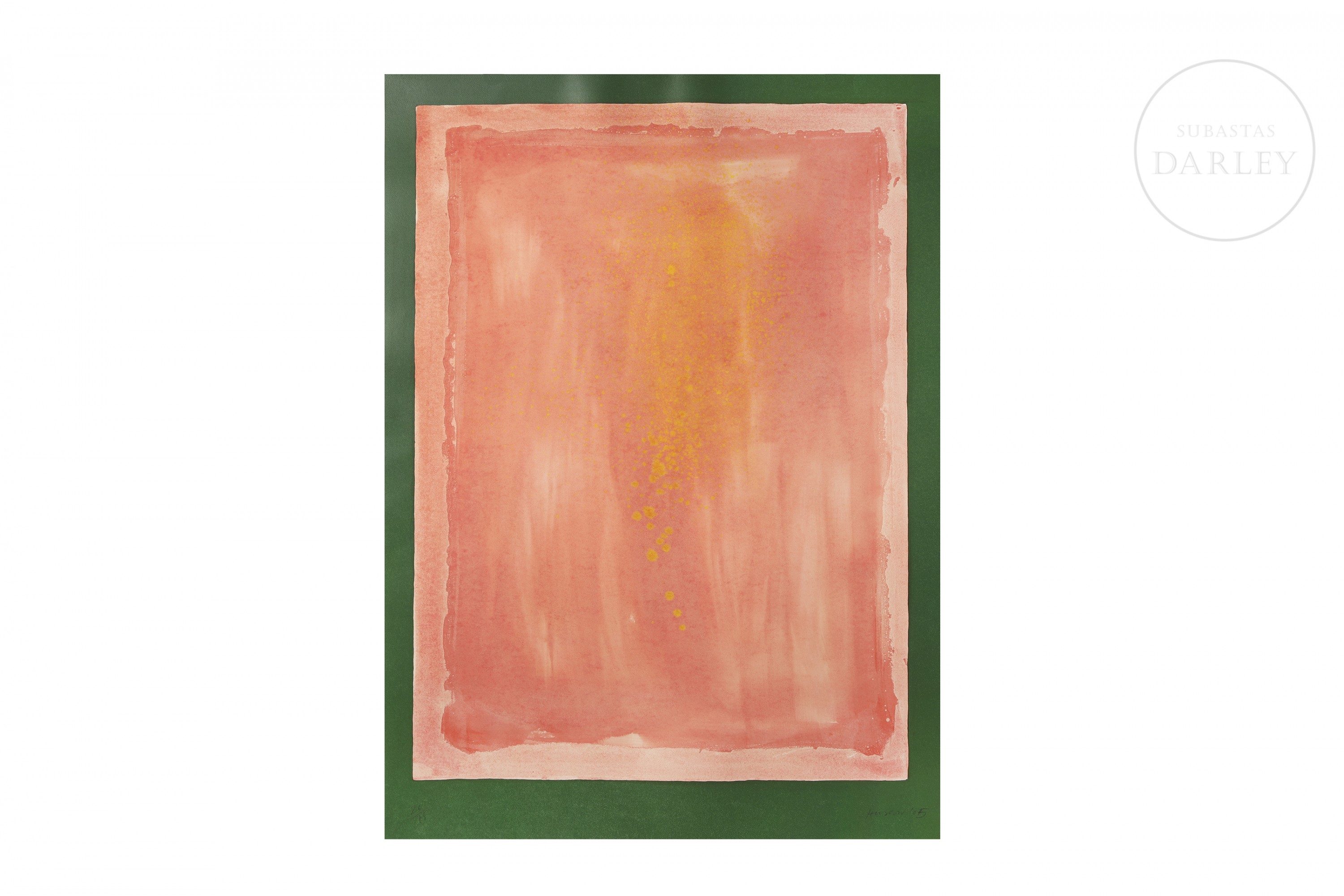 丝网印刷结合手工绘制,纸本。抽象构图呈现渐变粉橙色调的色域,黄色泼溅增添层次与活力,深绿色衬纸镶边。右下角签名并标注日期“Huston 05”,左下角铅笔编号“26/75”。