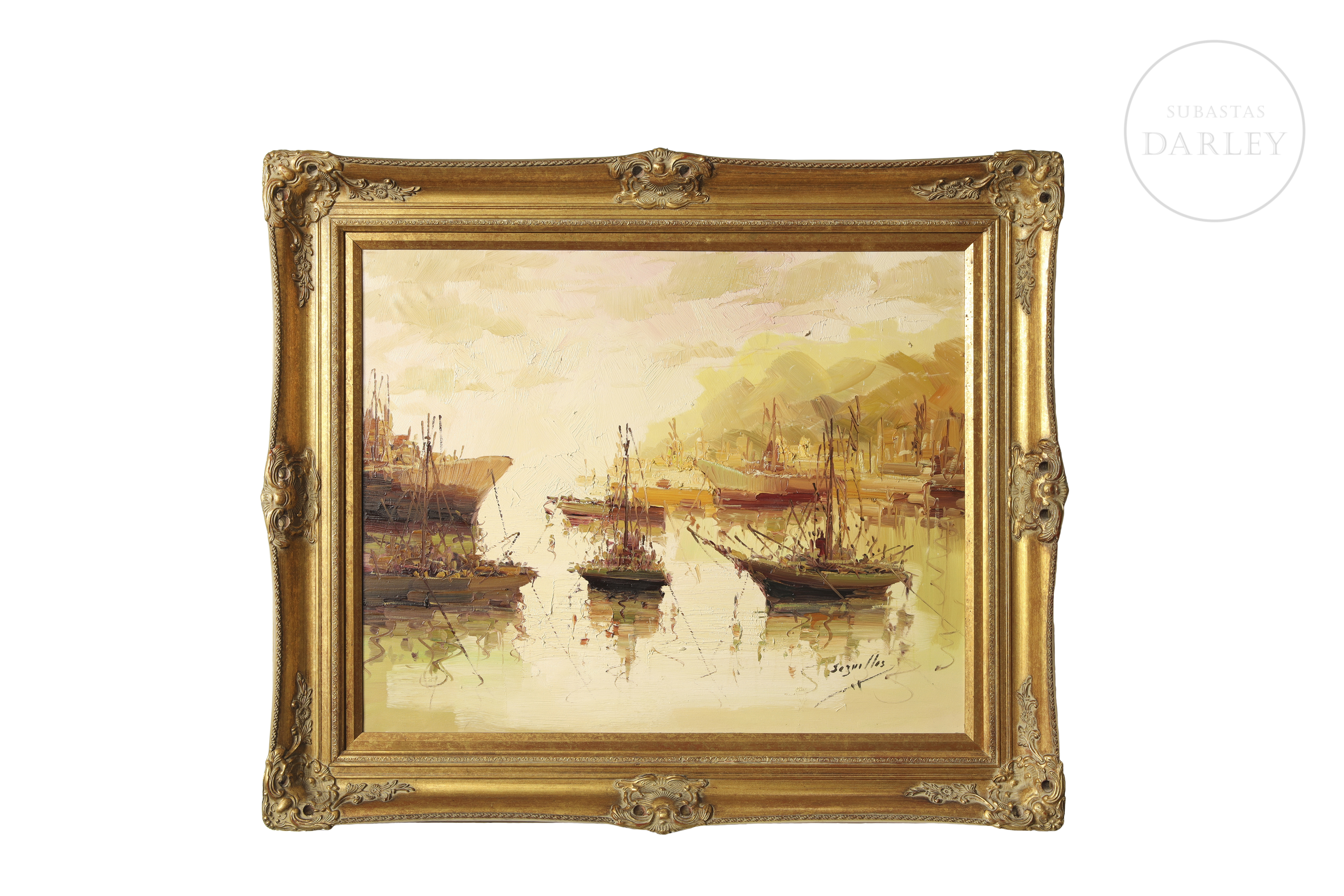 大型海景画作,描绘渔船停泊于港口的景象。右下角签名“Segrelles”。