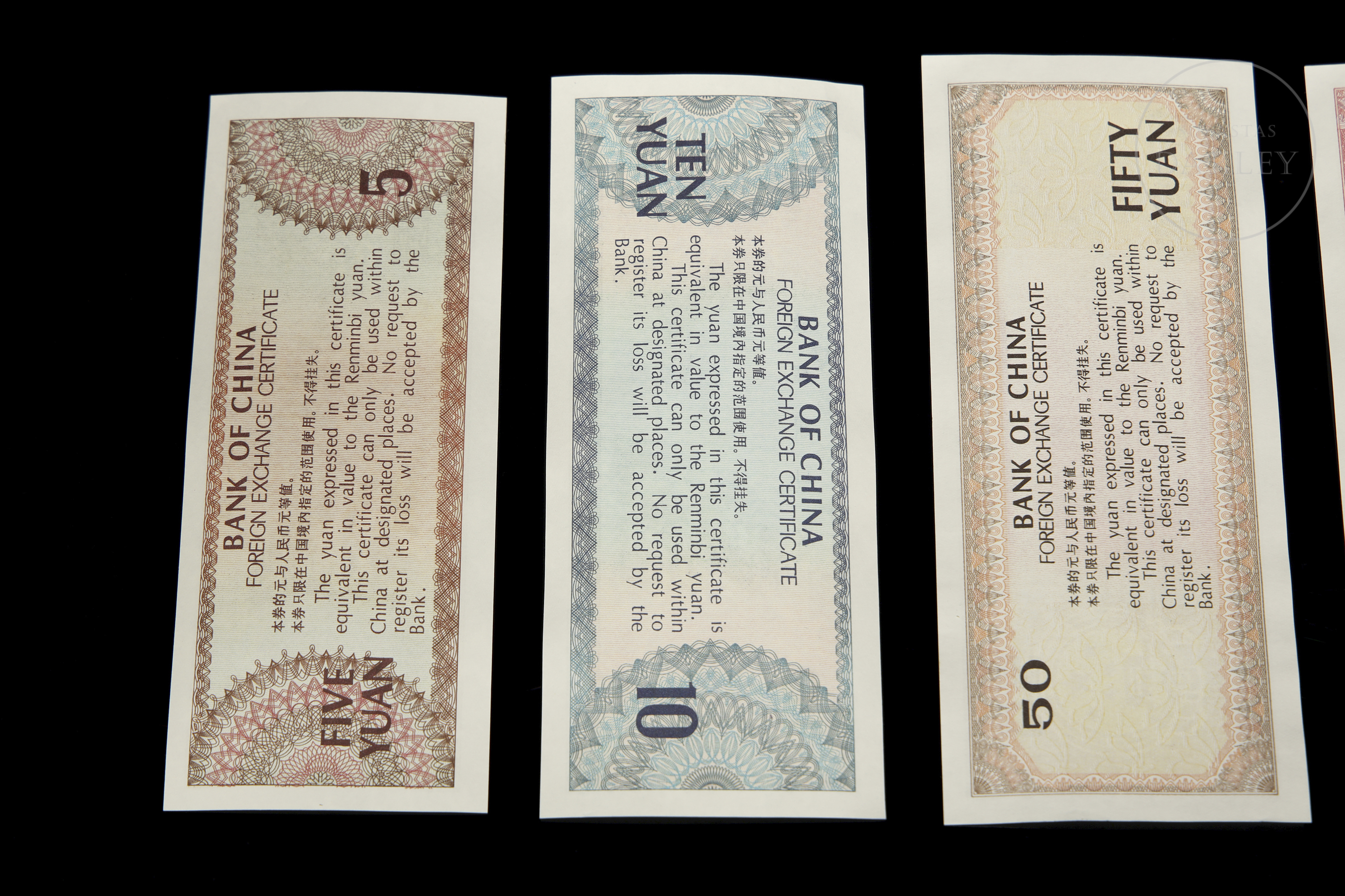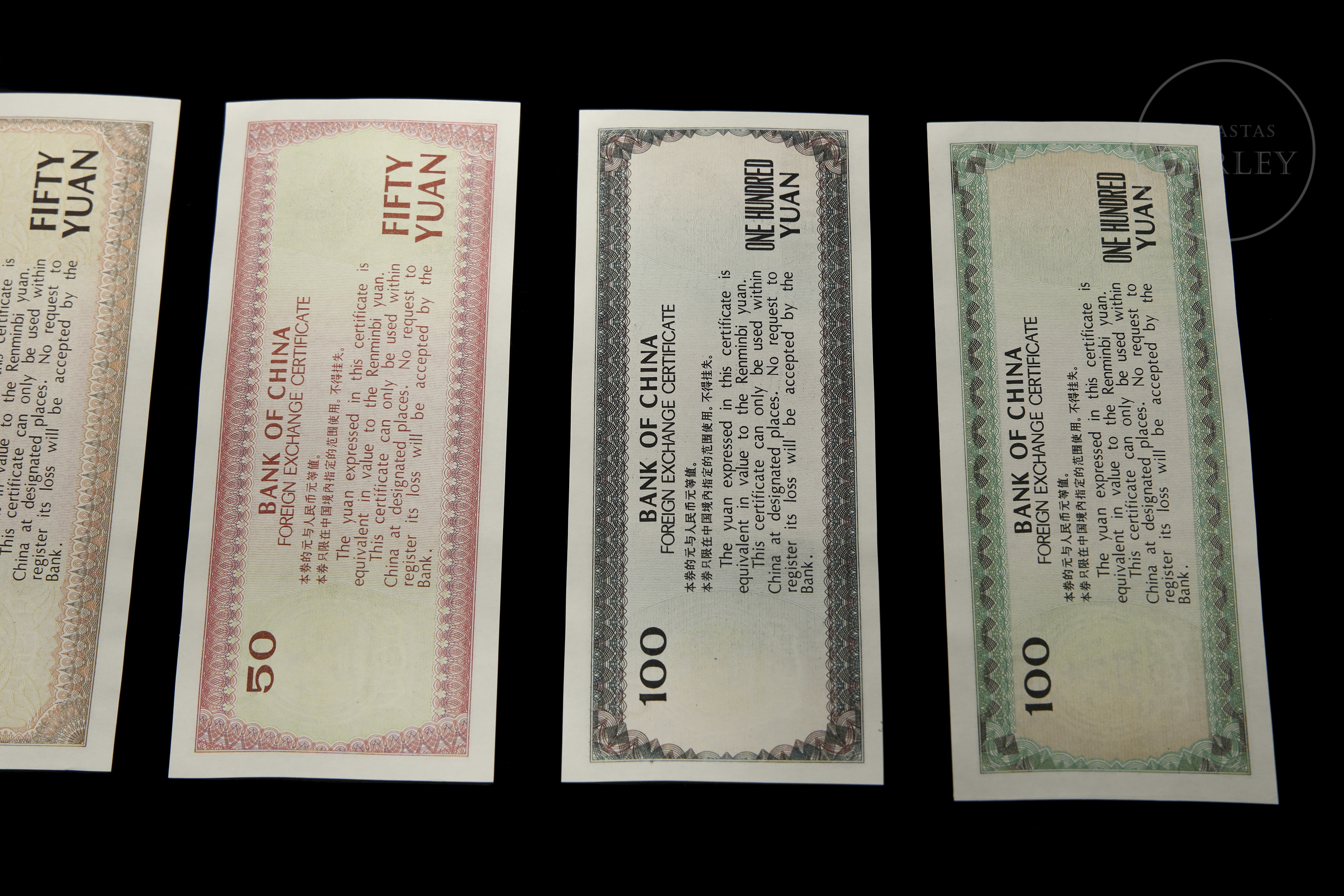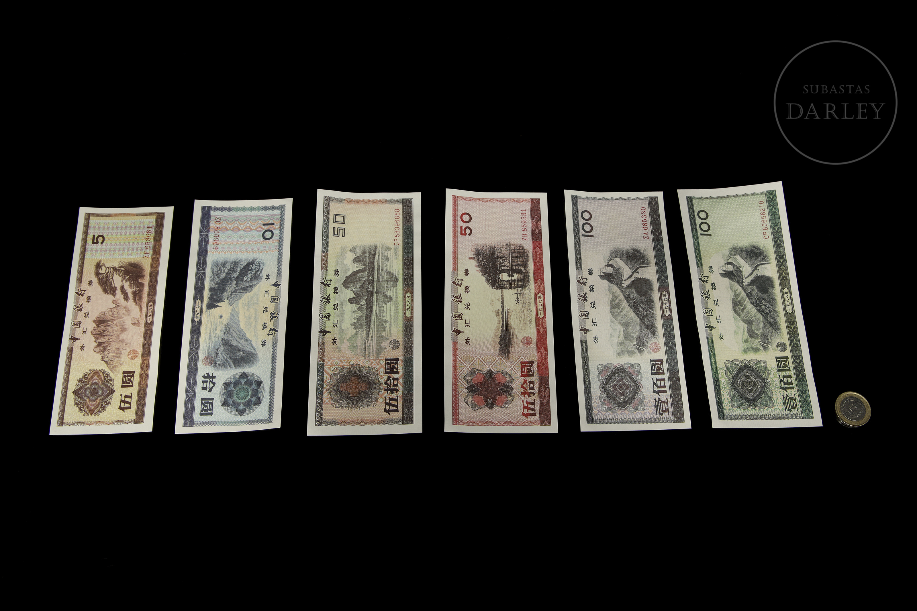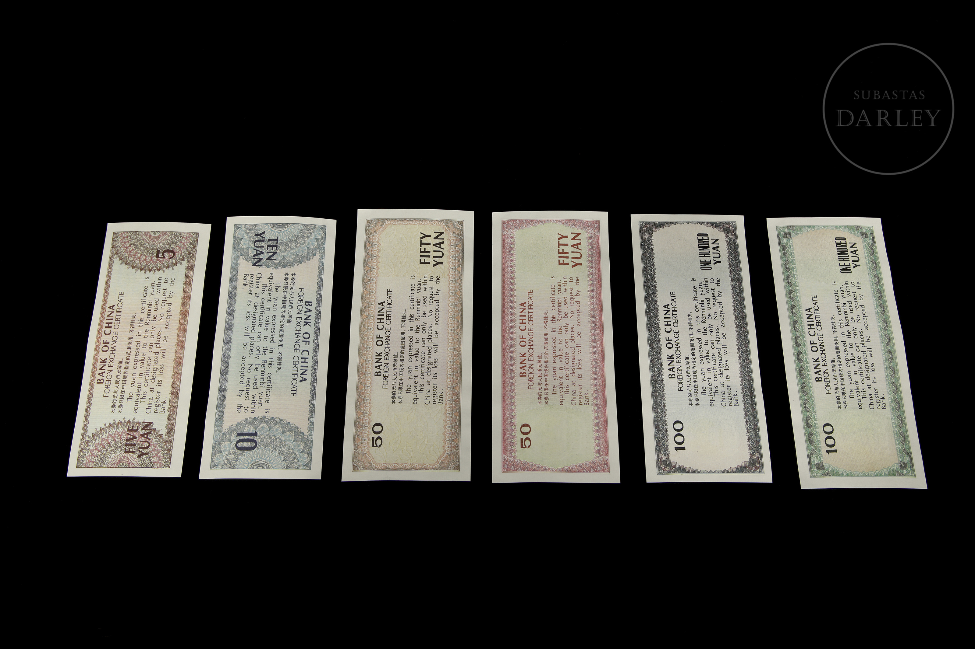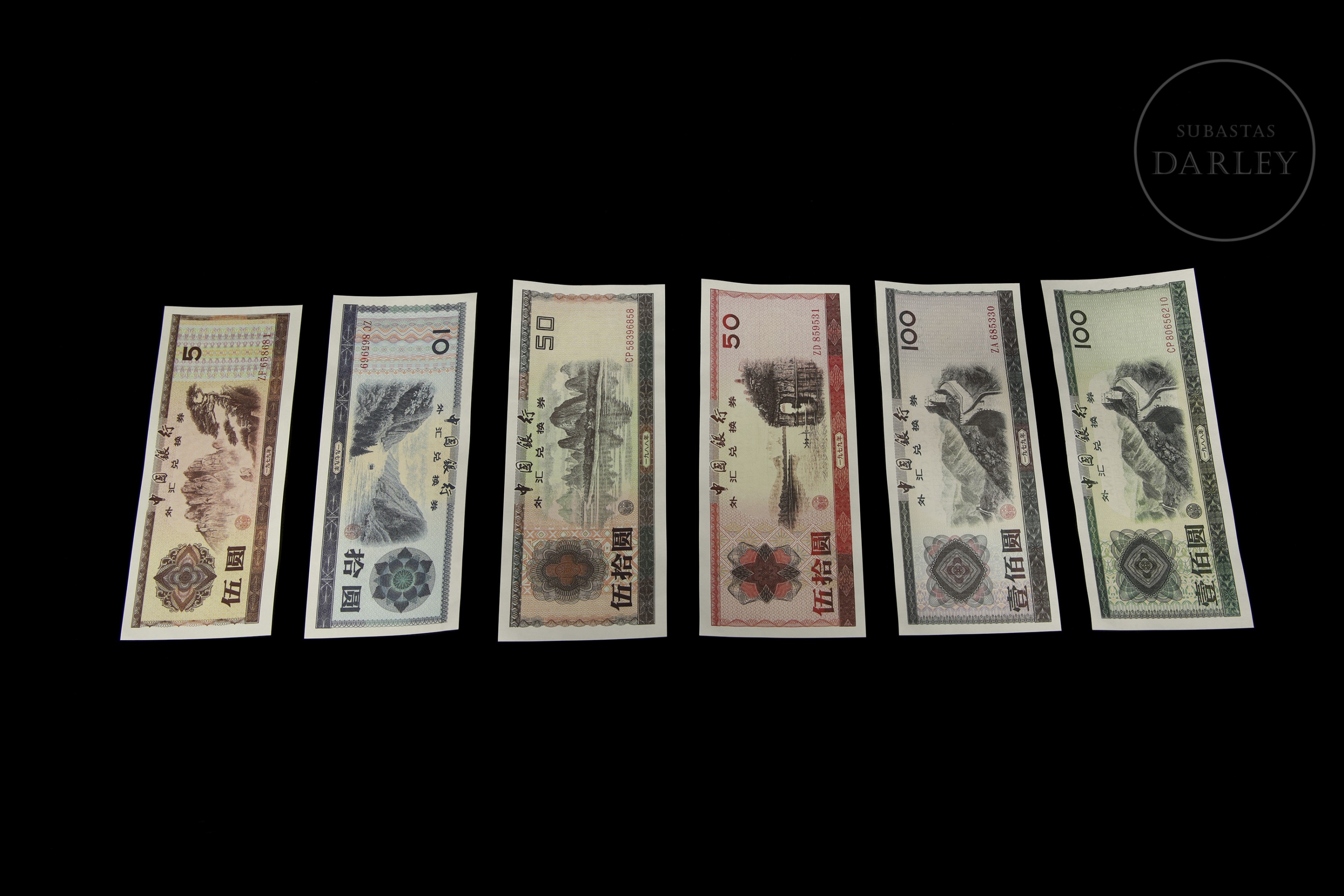Set of six paper banknotes issued by the Bank of China as Foreign Exchange Certificates, in denominations of 5, 10, 50 and 100 yuan. The front features illustrations of Chinese landscapes, and the back has inscriptions in English regarding their validity and circulation.