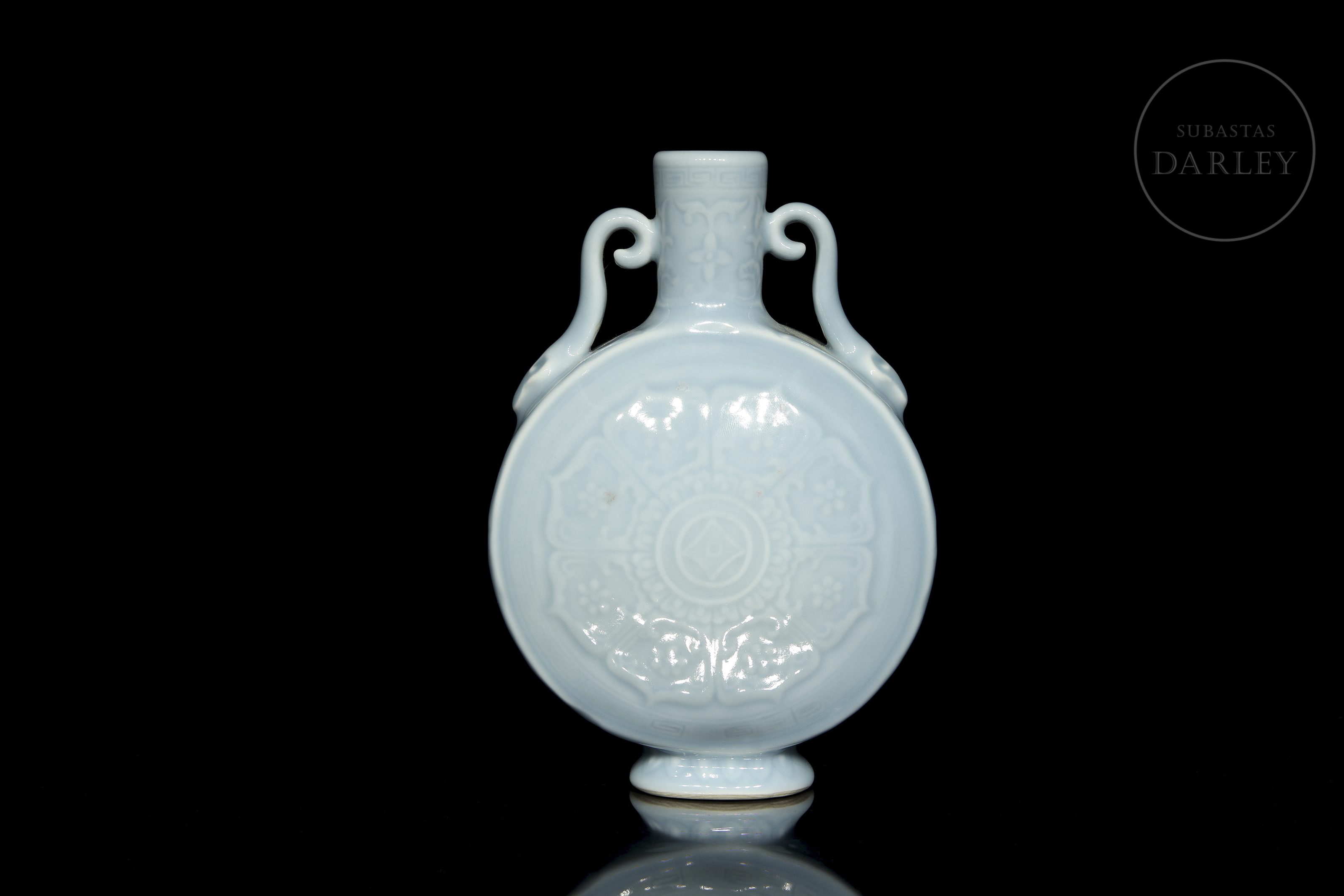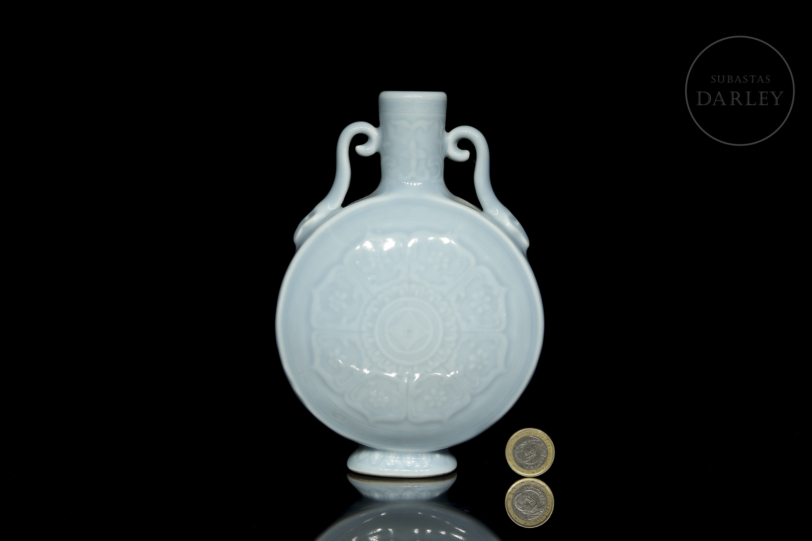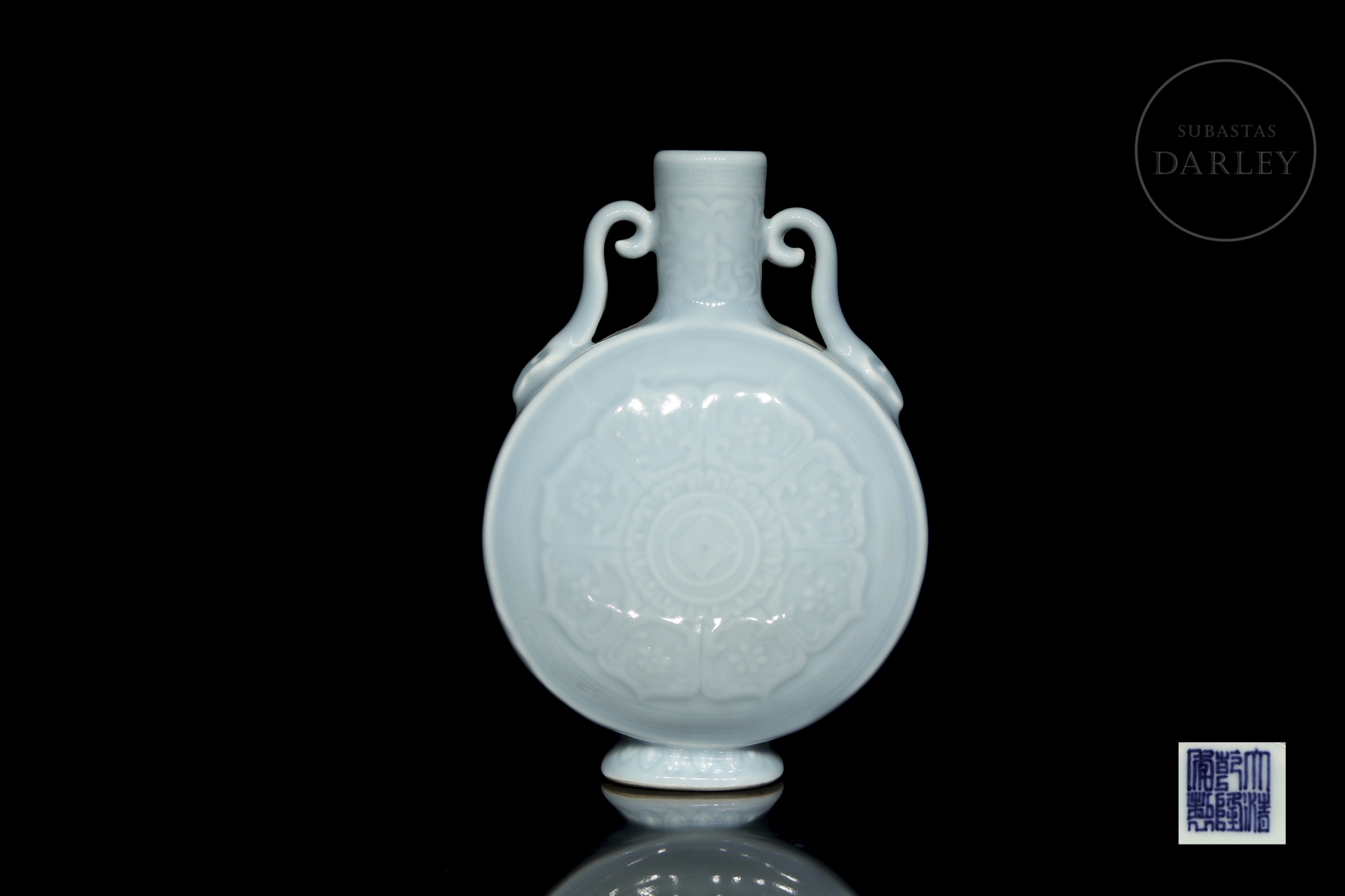 Glazed porcelain in sky blue. It has a circular, flattened body resting on an oval base. Both sides are decorated in relief with a central medallion depicting a lotus flower. The sides feature scroll-shaped handles. The neck is short and cylindrical, adorned with geometric friezes in relief. The base bears a blue underglaze stamp ‘大清乾隆年制’.