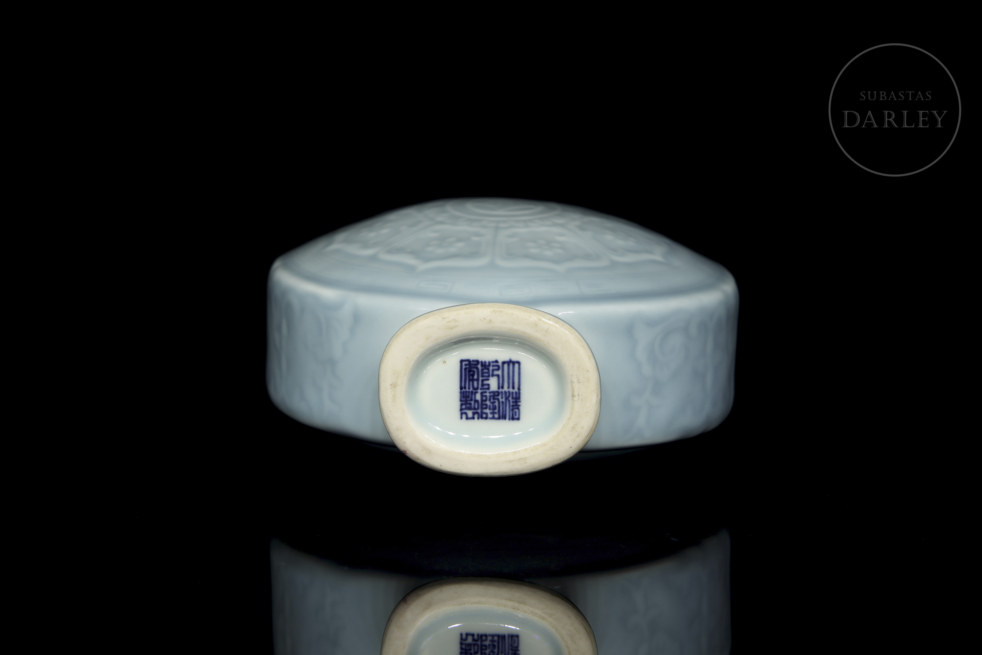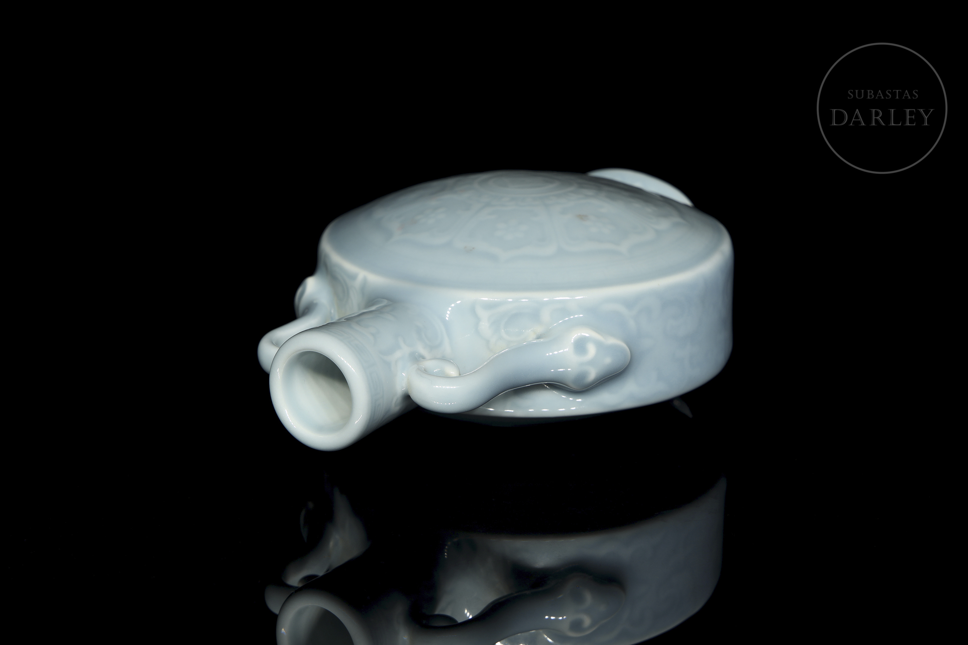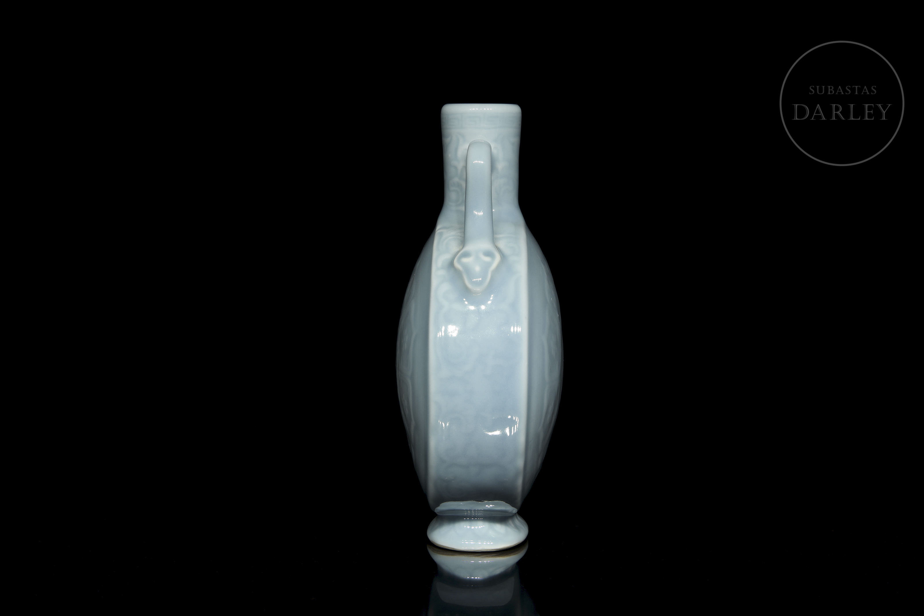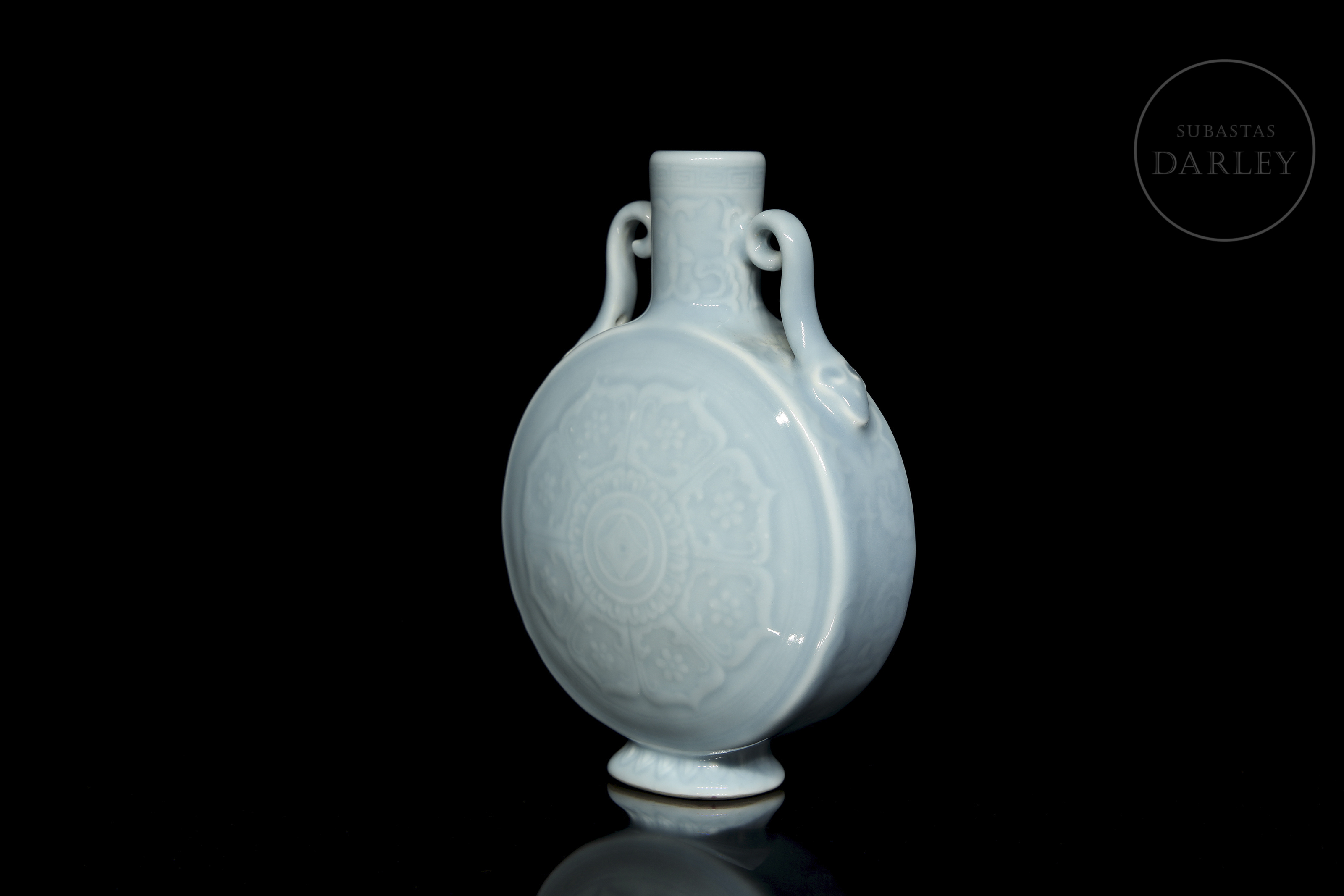 Glazed porcelain in sky blue. It has a circular, flattened body resting on an oval base. Both sides are decorated in relief with a central medallion depicting a lotus flower. The sides feature scroll-shaped handles. The neck is short and cylindrical, adorned with geometric friezes in relief. The base bears a blue underglaze stamp ‘大清乾隆年制’.