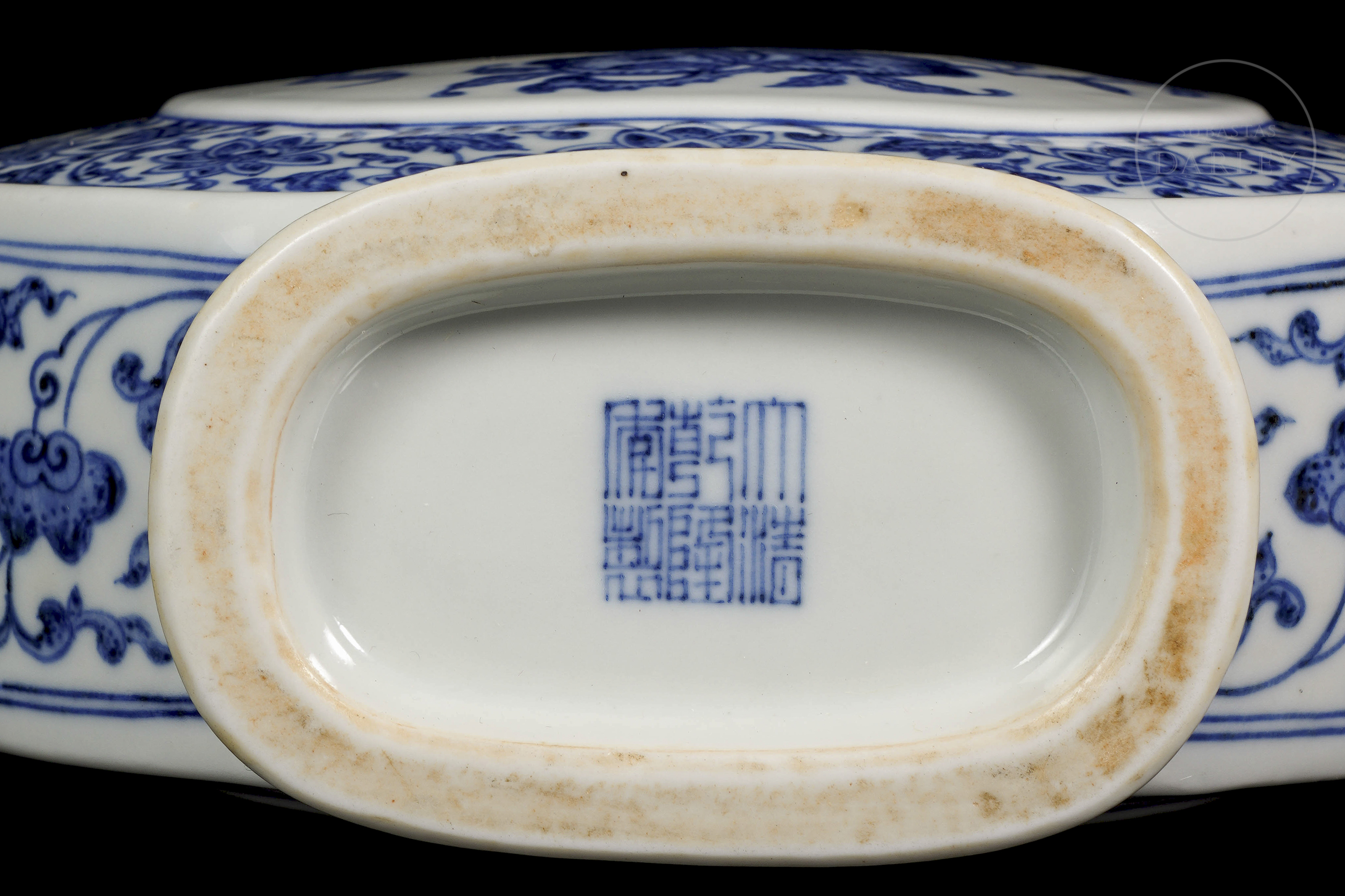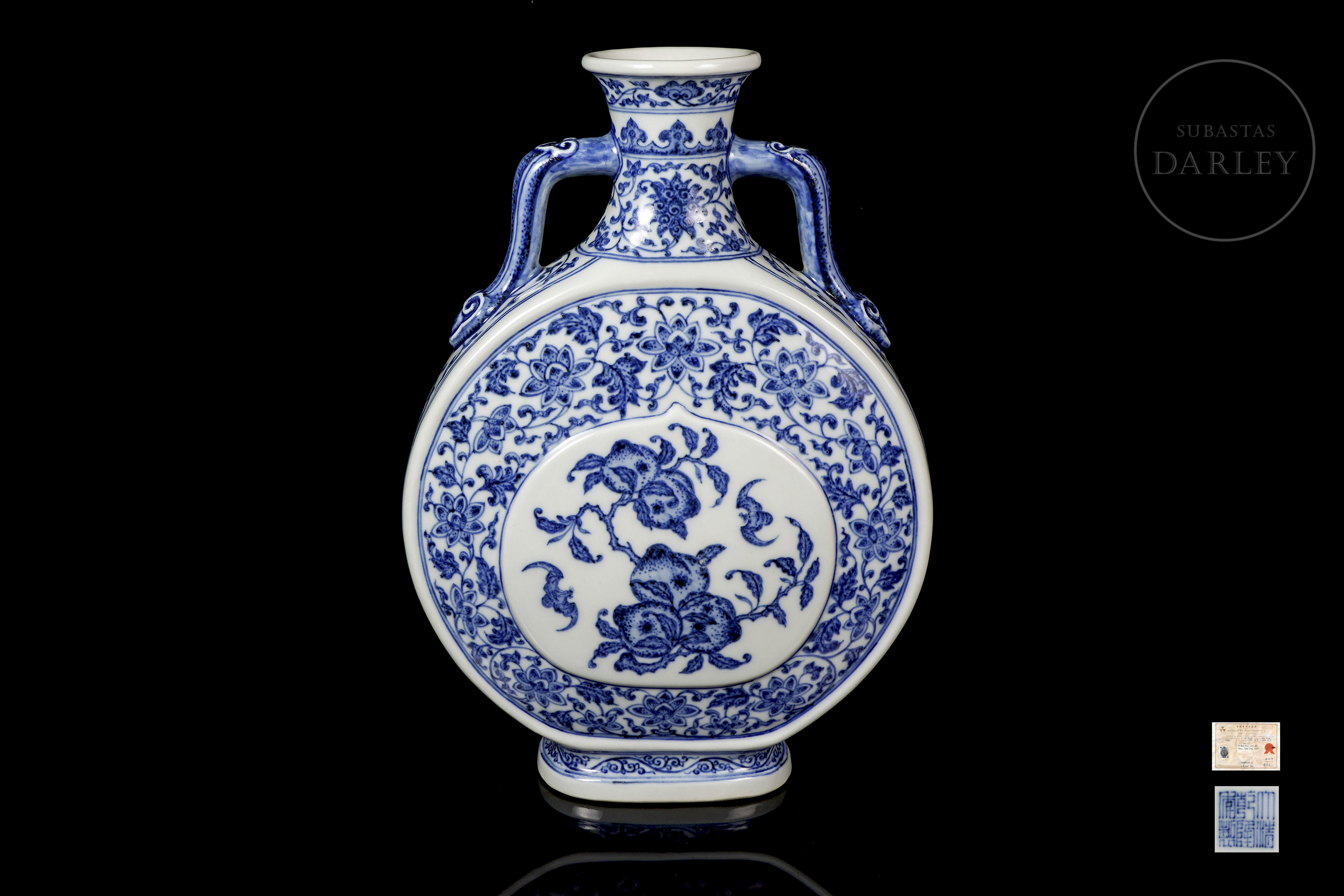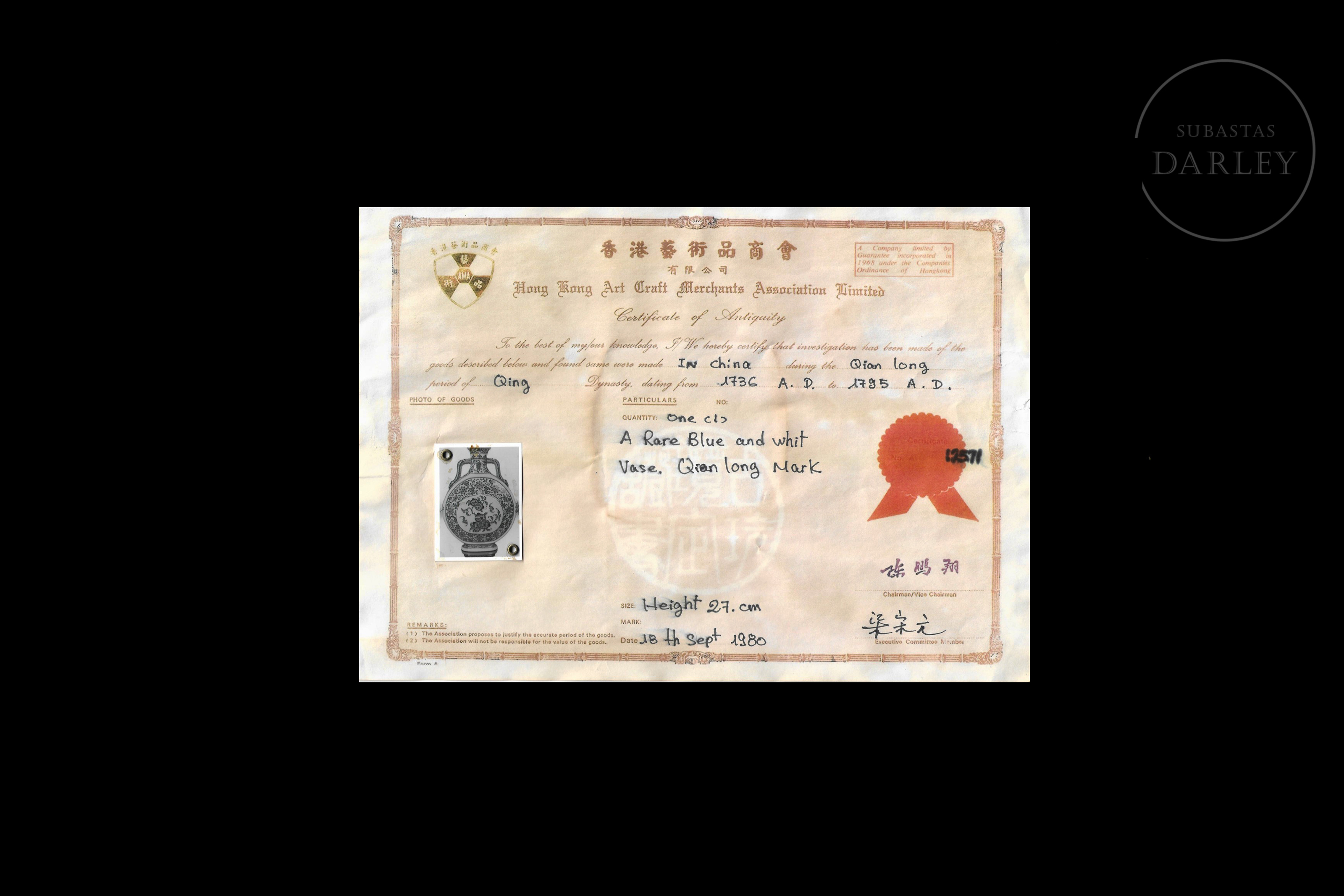 Porcelain moon vase, whose flattened circular body is joined to a cylindrical neck by two elegant scroll-shaped handles. The cobalt blue decoration centres on a large lobed medallion on each side, adorned with a bouquet of peonies in bloom, framed by an intricate design of lotus scrolls. The base bears the six-character mark “大清乾隆年制” in underglaze blue. The lot is accompanied by a Certificate of Antiquity issued by the Hong Kong Art Craft Merchants Association in 1980.