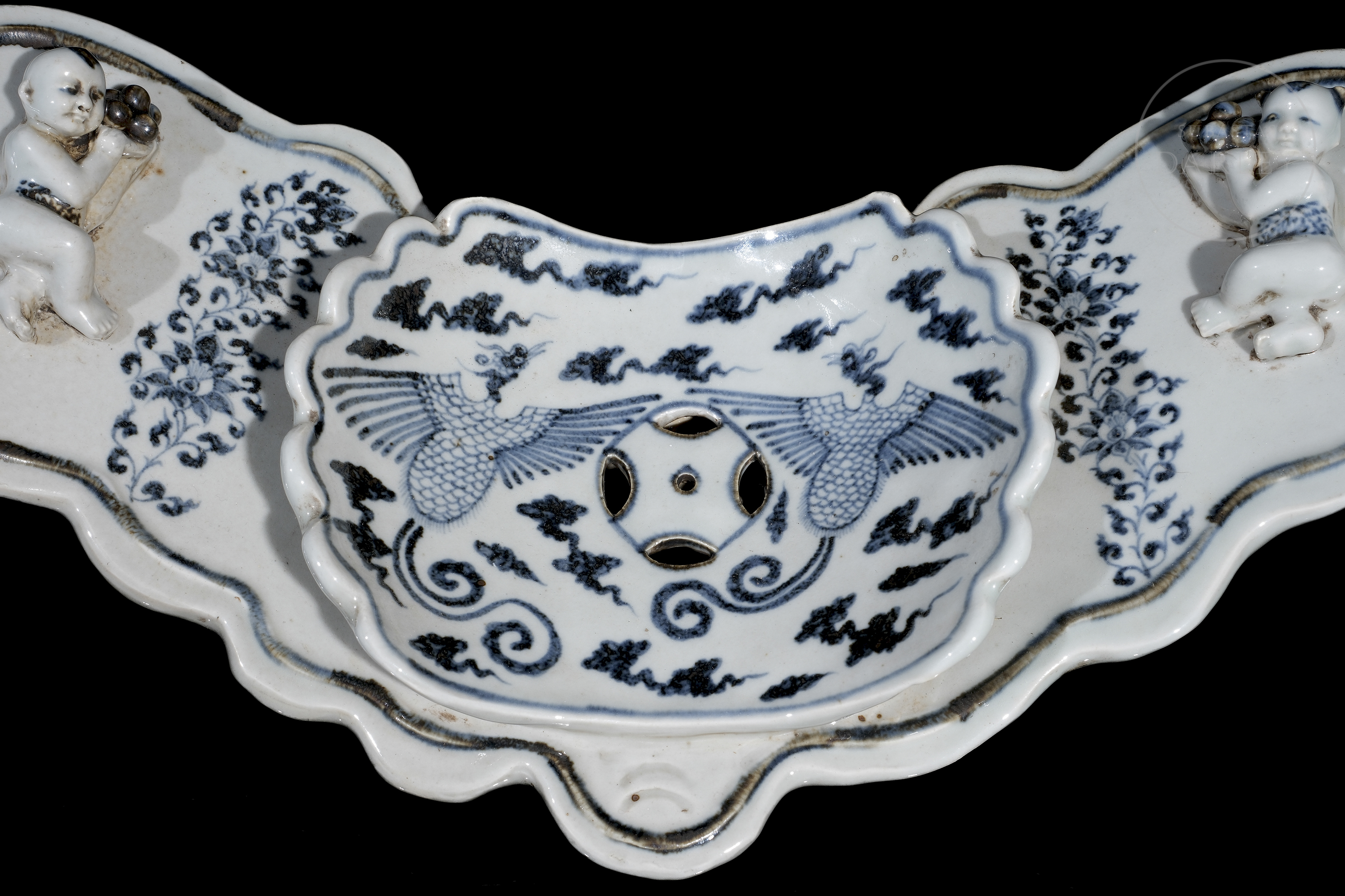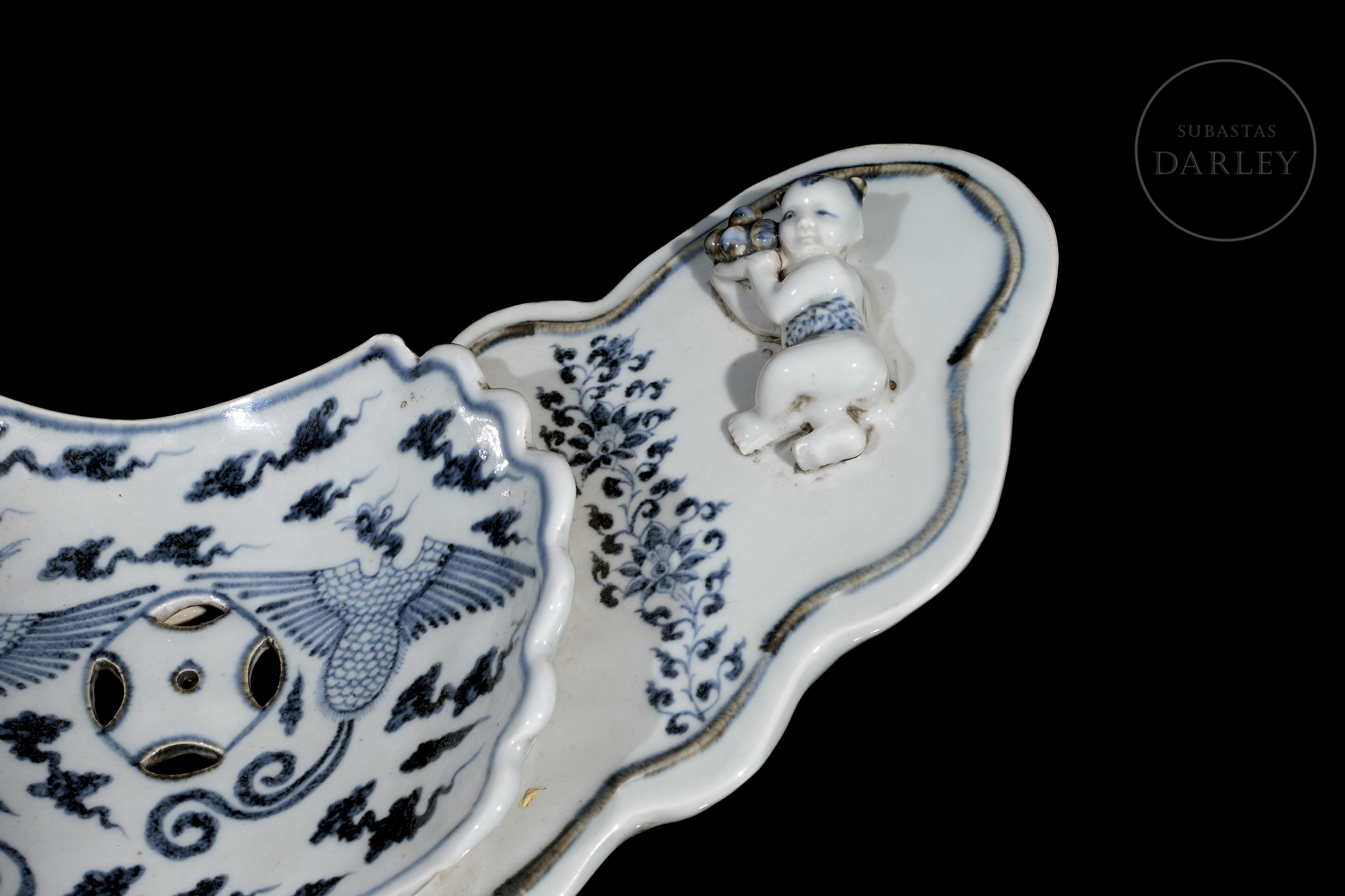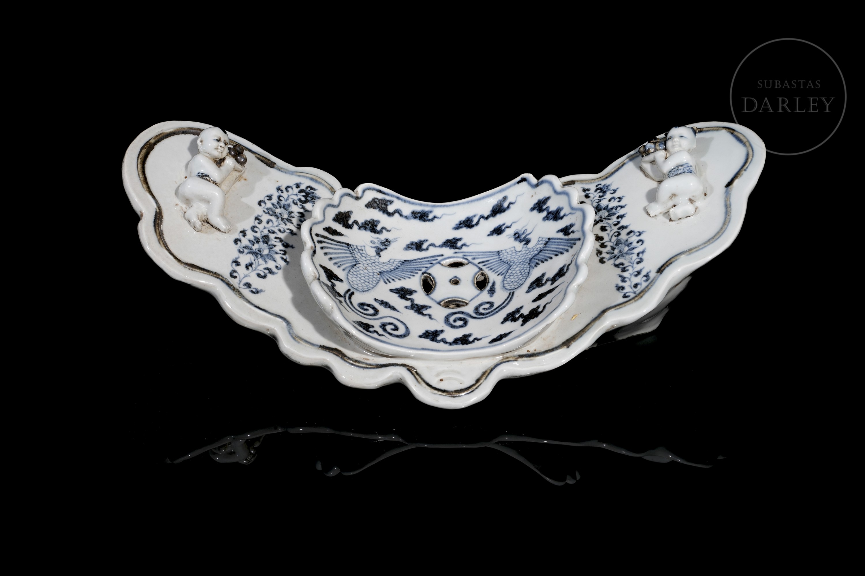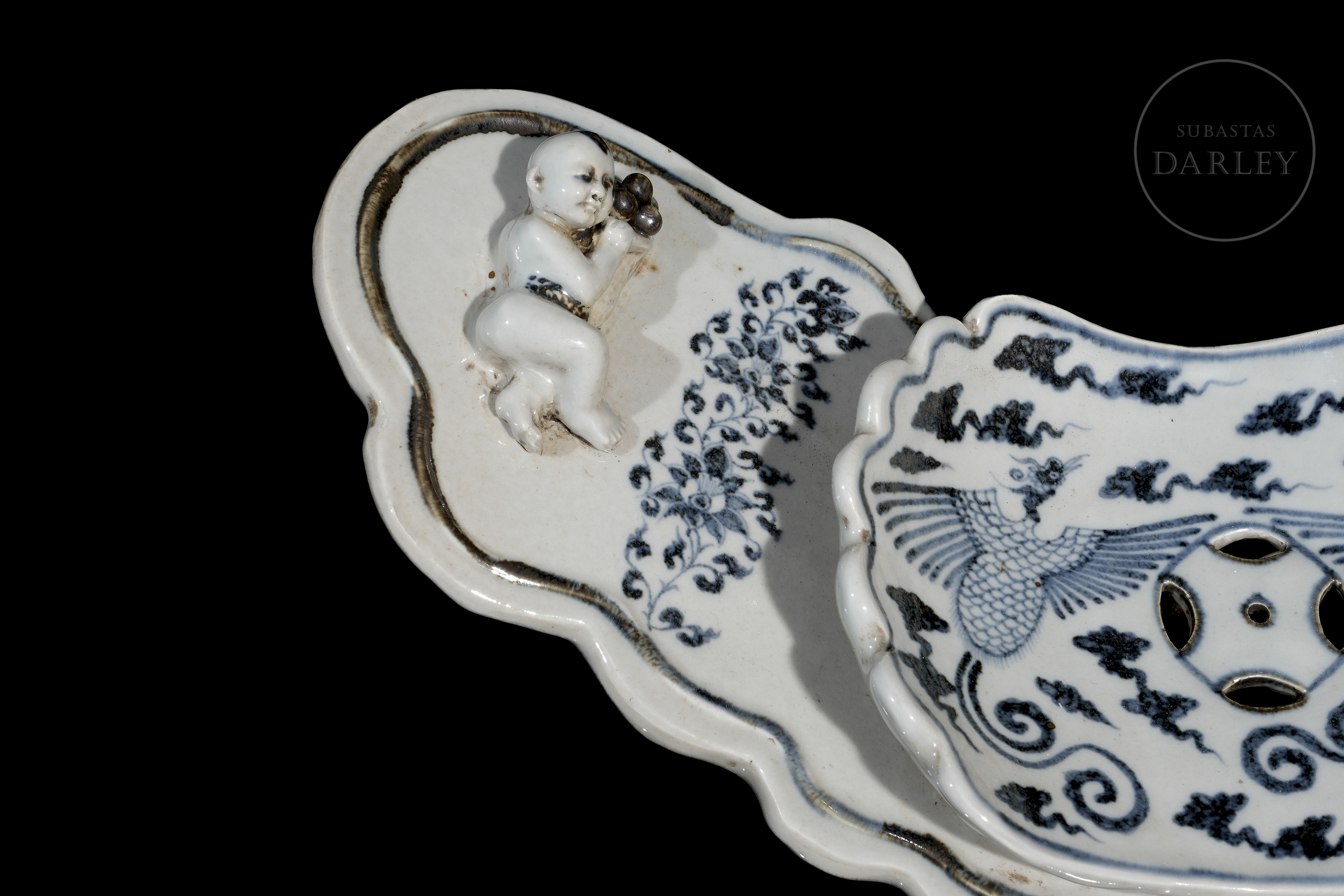 Porcelain pillow with an elongated crescent-shaped base, on which a concave plate rests. The interior is painted in cobalt blue with a scene of two phoenixes flying among clouds. At the ends are two small children, modelled in relief, carrying fruit. Ming dynasty (1368–1644) or later.