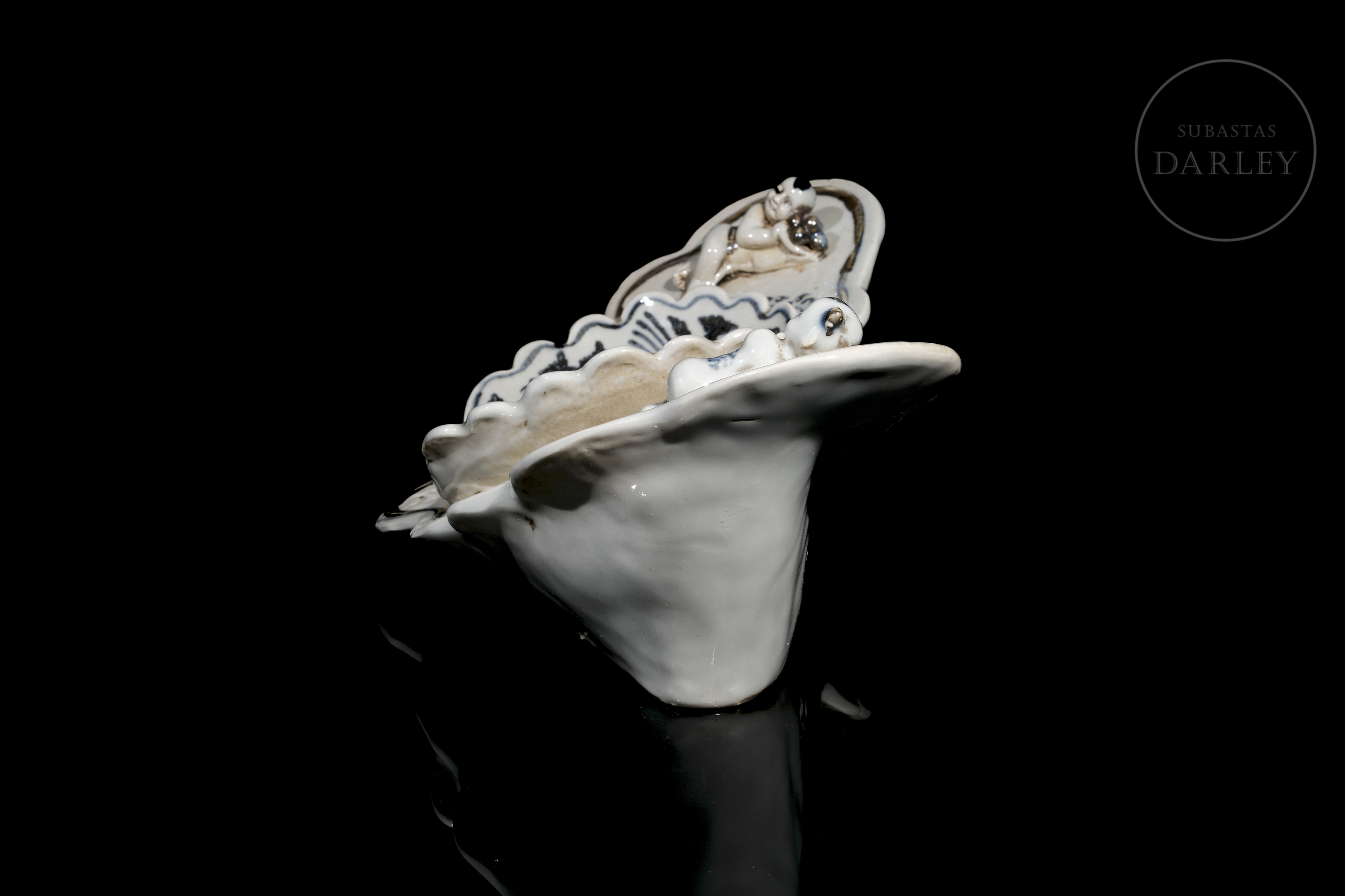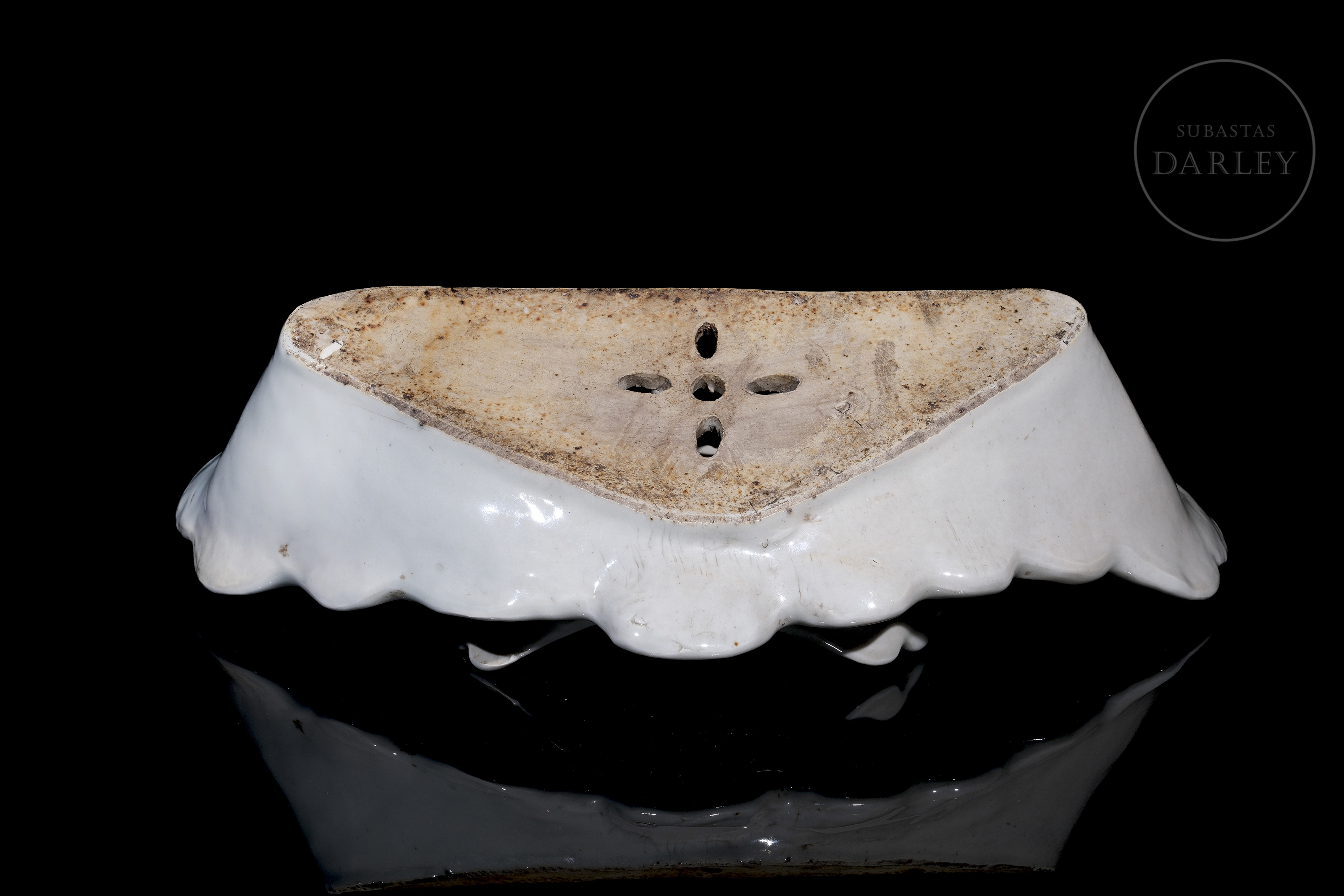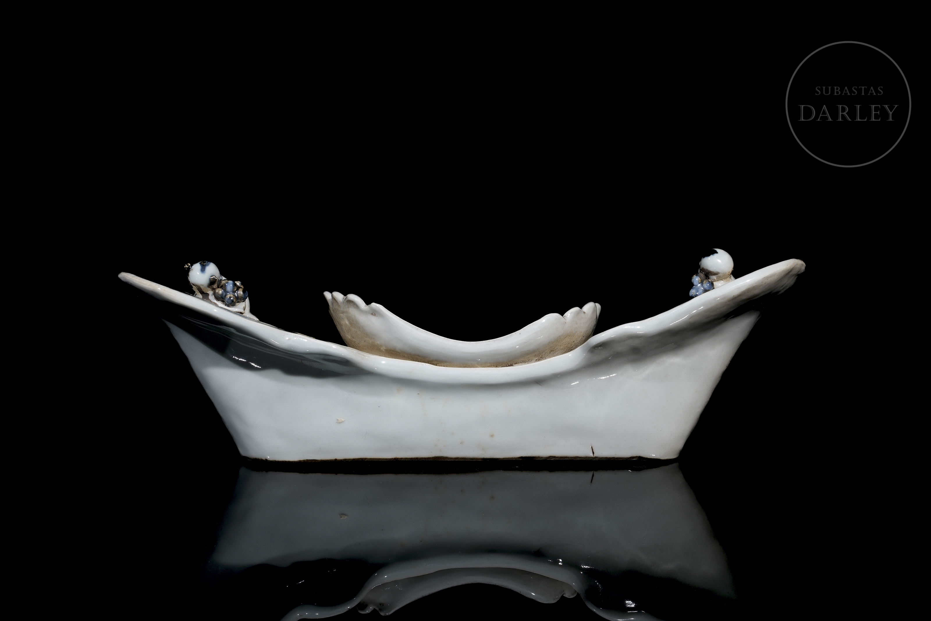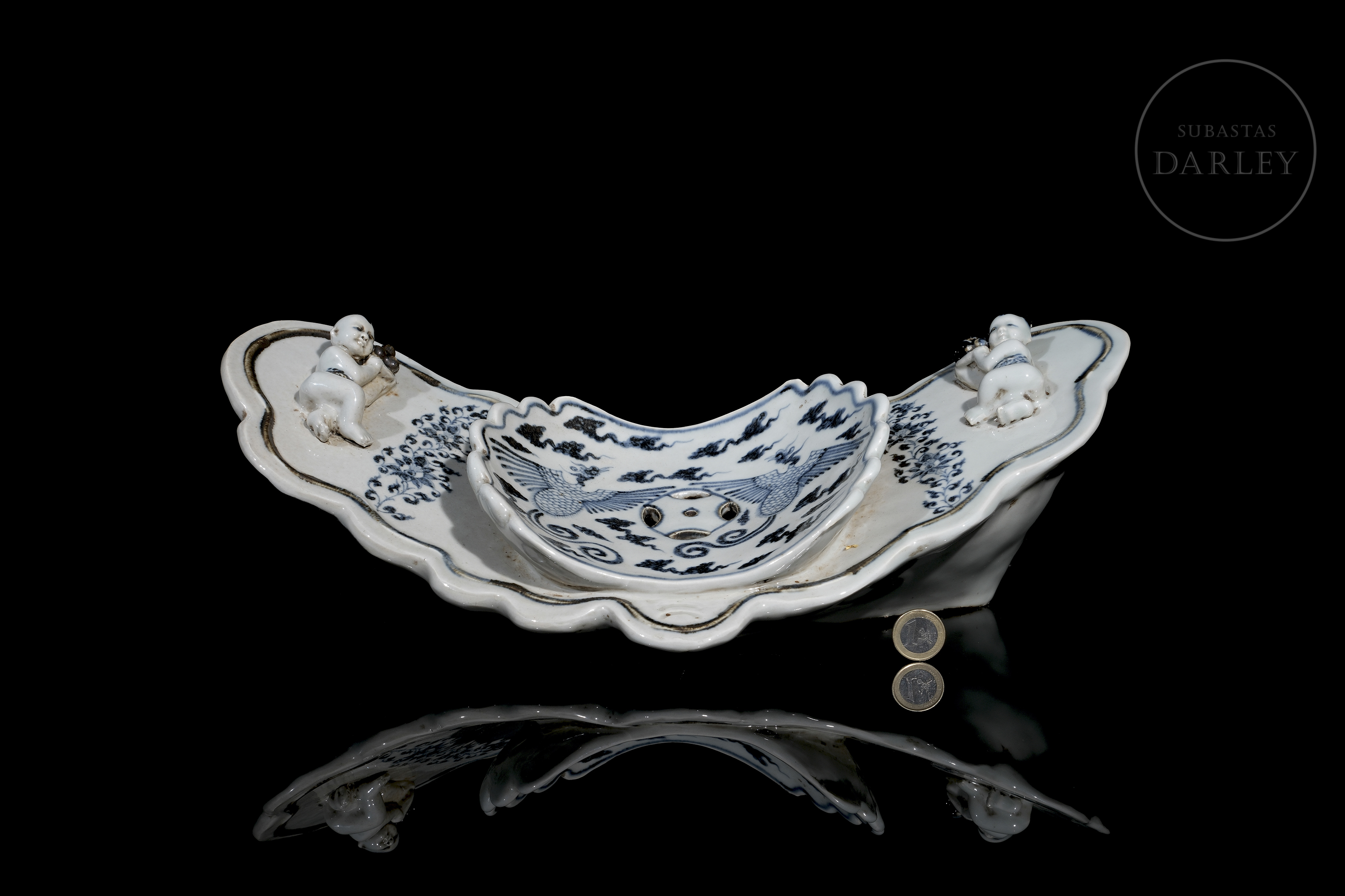 Porcelain pillow with an elongated crescent-shaped base, on which a concave plate rests. The interior is painted in cobalt blue with a scene of two phoenixes flying among clouds. At the ends are two small children, modelled in relief, carrying fruit. Ming dynasty (1368–1644) or later.