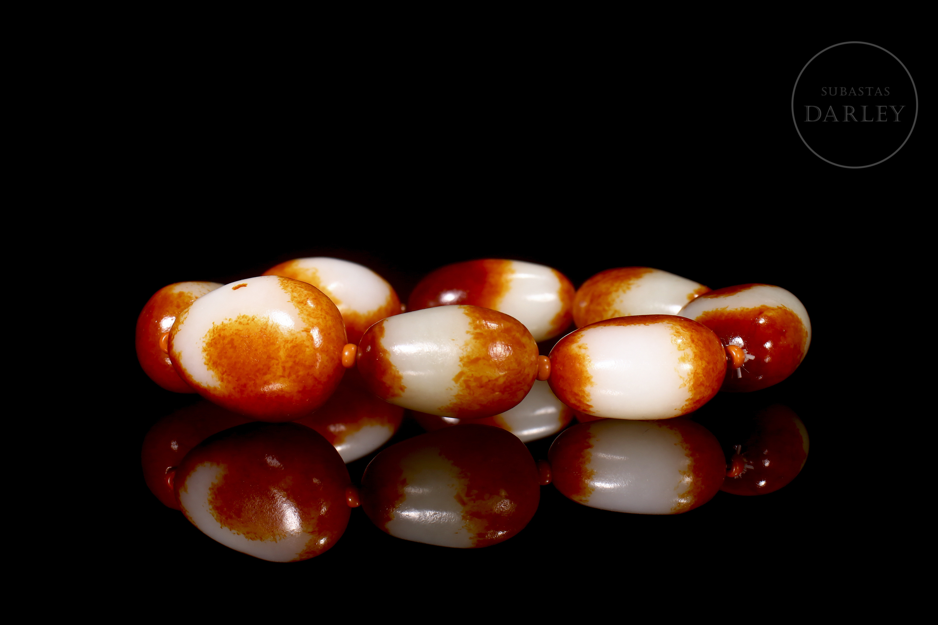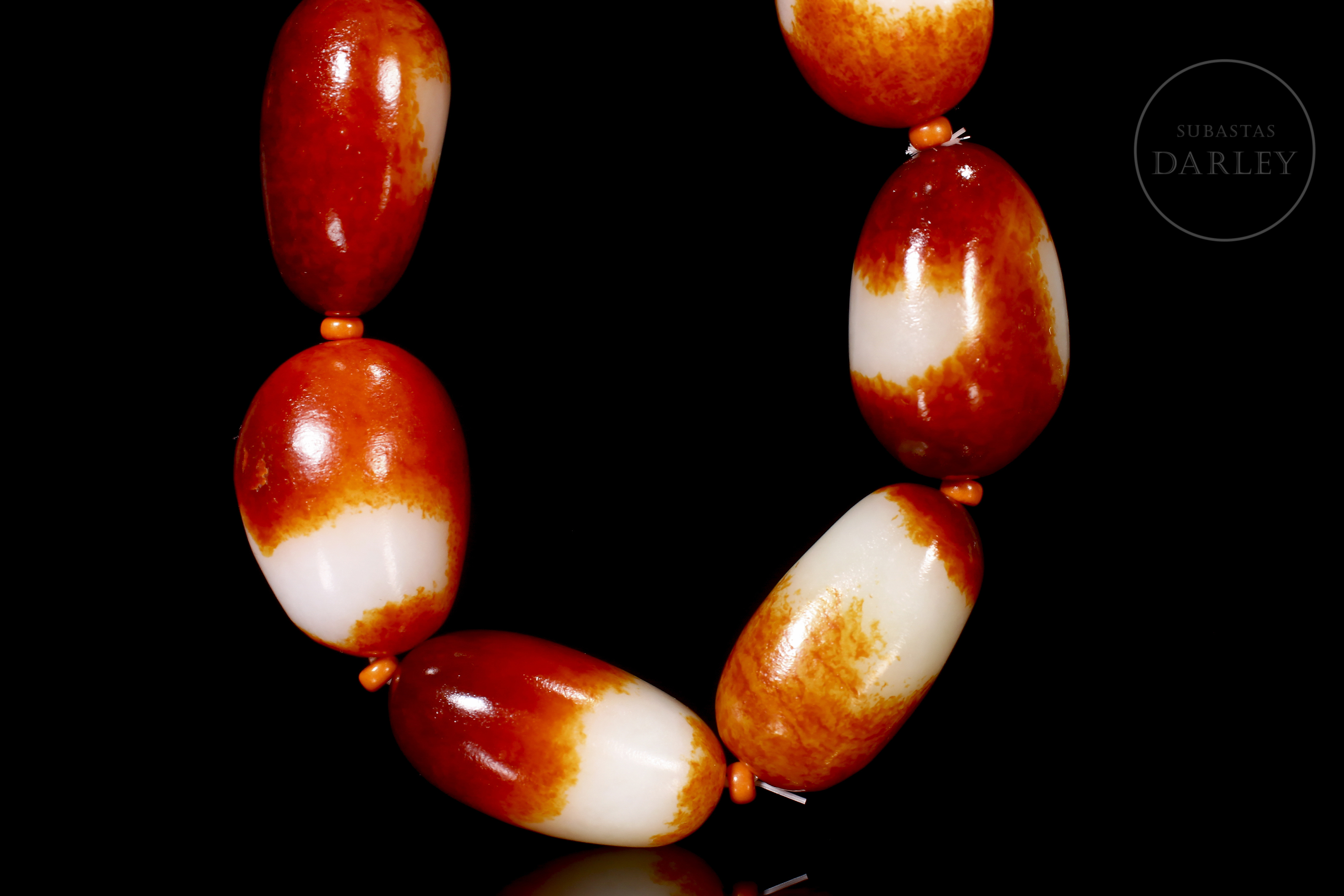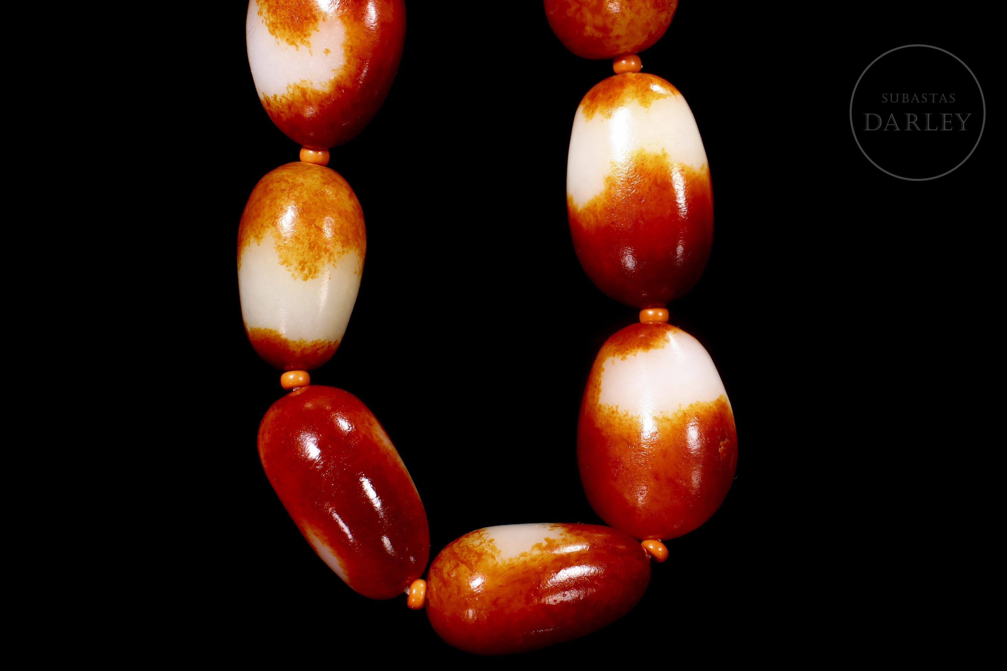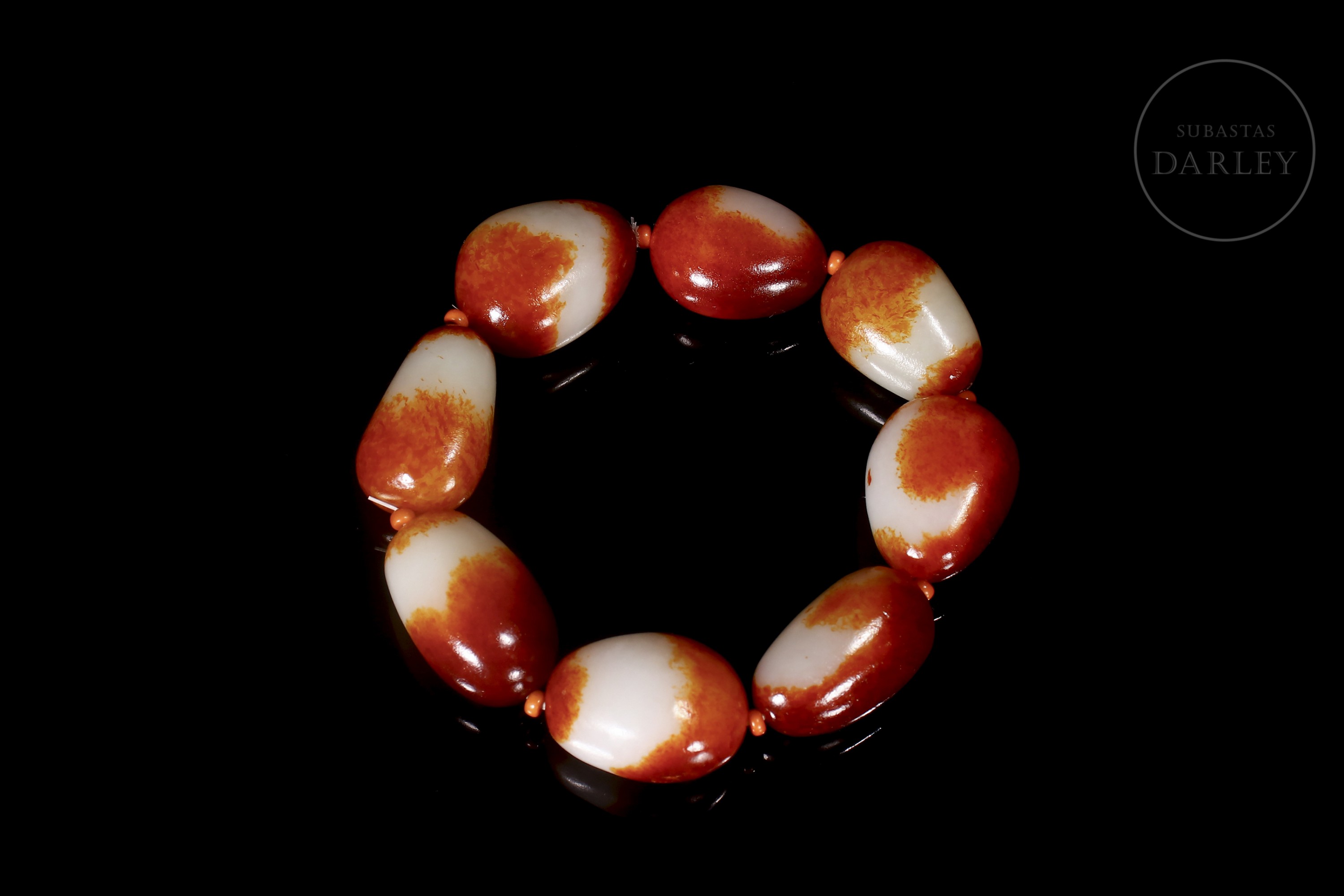Eight oval Hetian jade beads, with colour transitions alternating between creamy white and deep red, an effect produced by the natural oxidation of the stone. Mounted on a modern thread that alternates the jade beads with smaller coral-coloured beads.