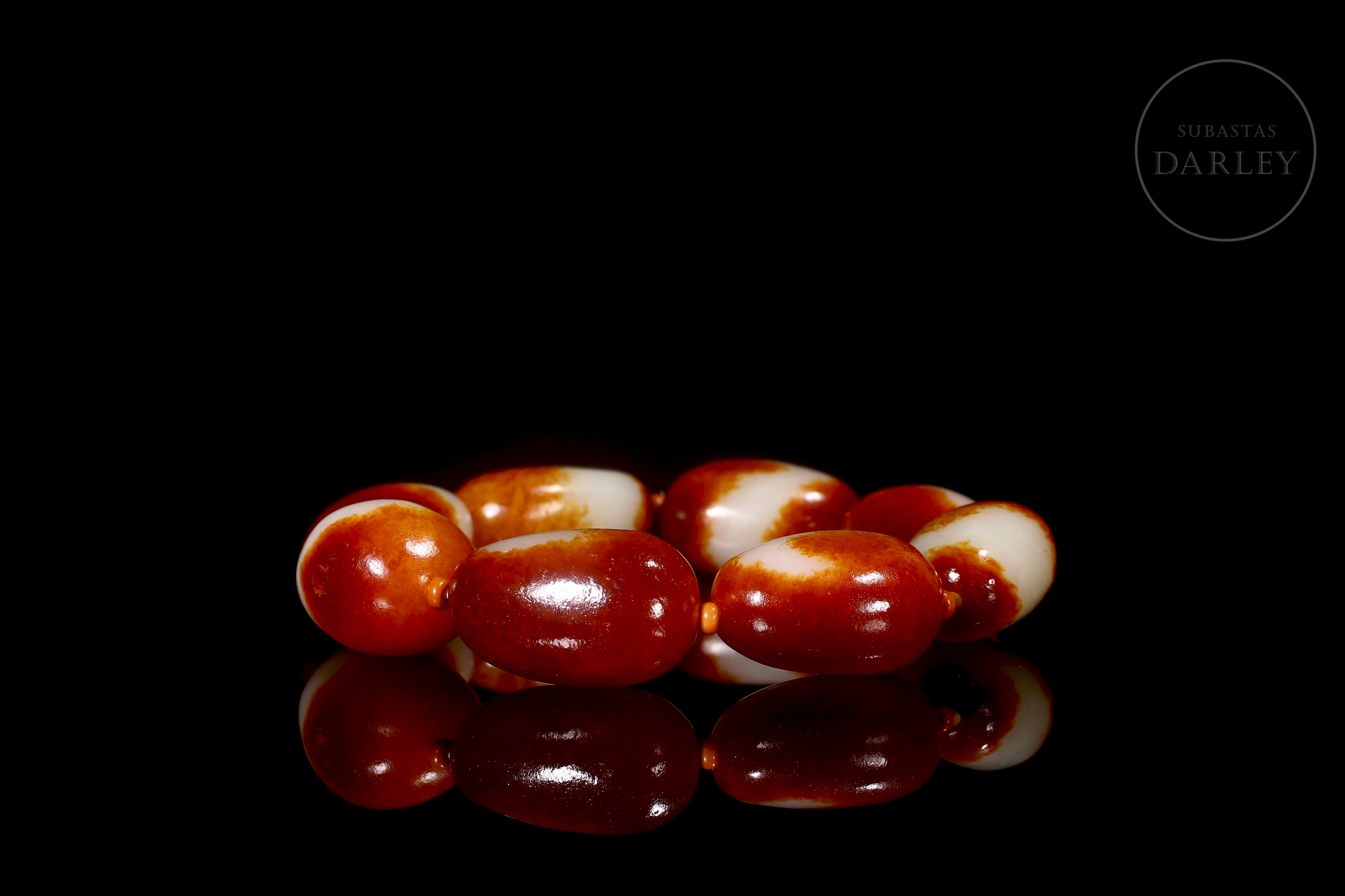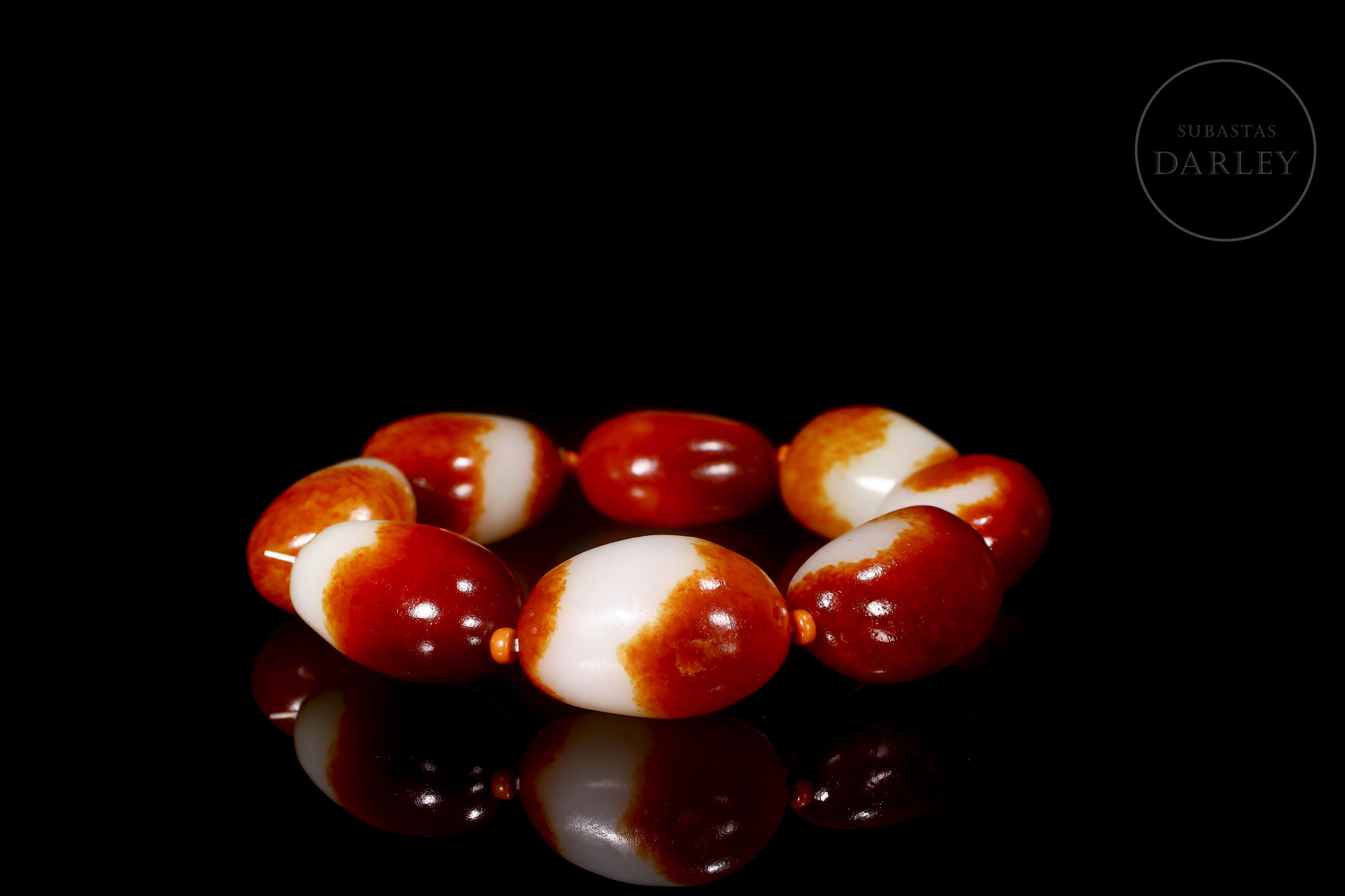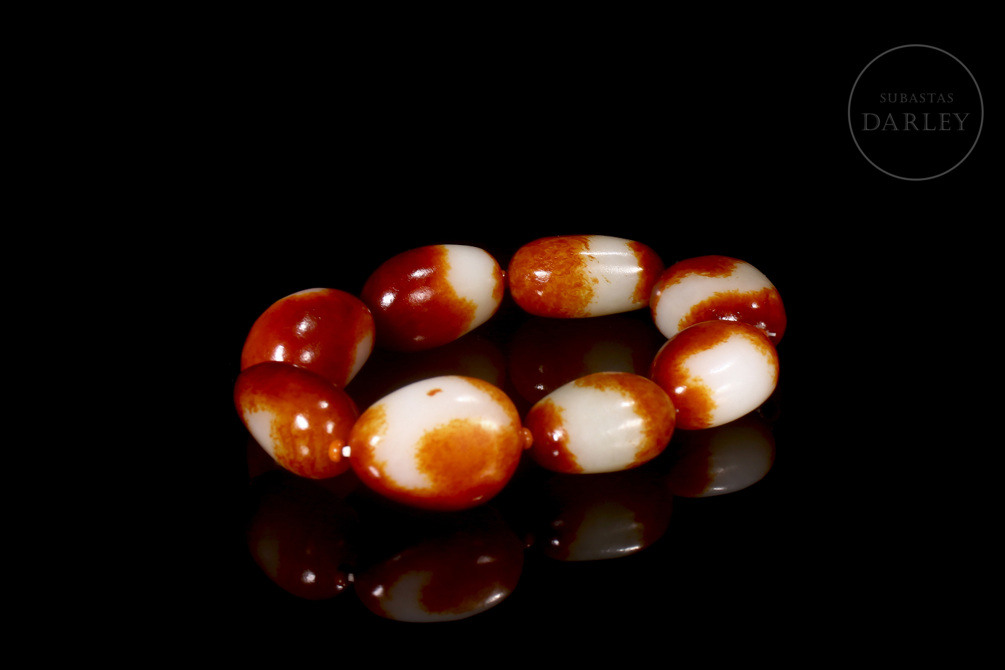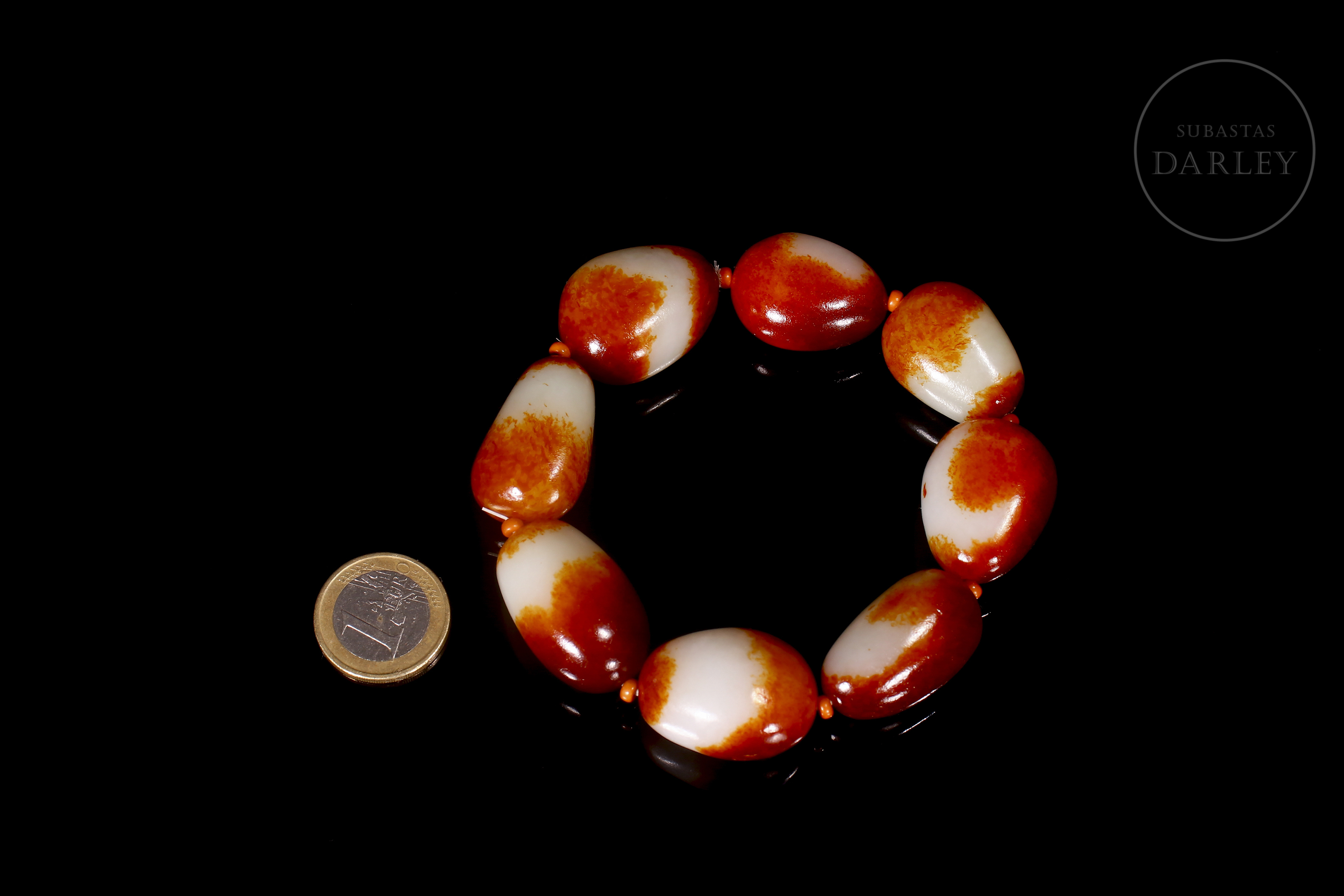 Eight oval Hetian jade beads, with colour transitions alternating between creamy white and deep red, an effect produced by the natural oxidation of the stone. Mounted on a modern thread that alternates the jade beads with smaller coral-coloured beads.