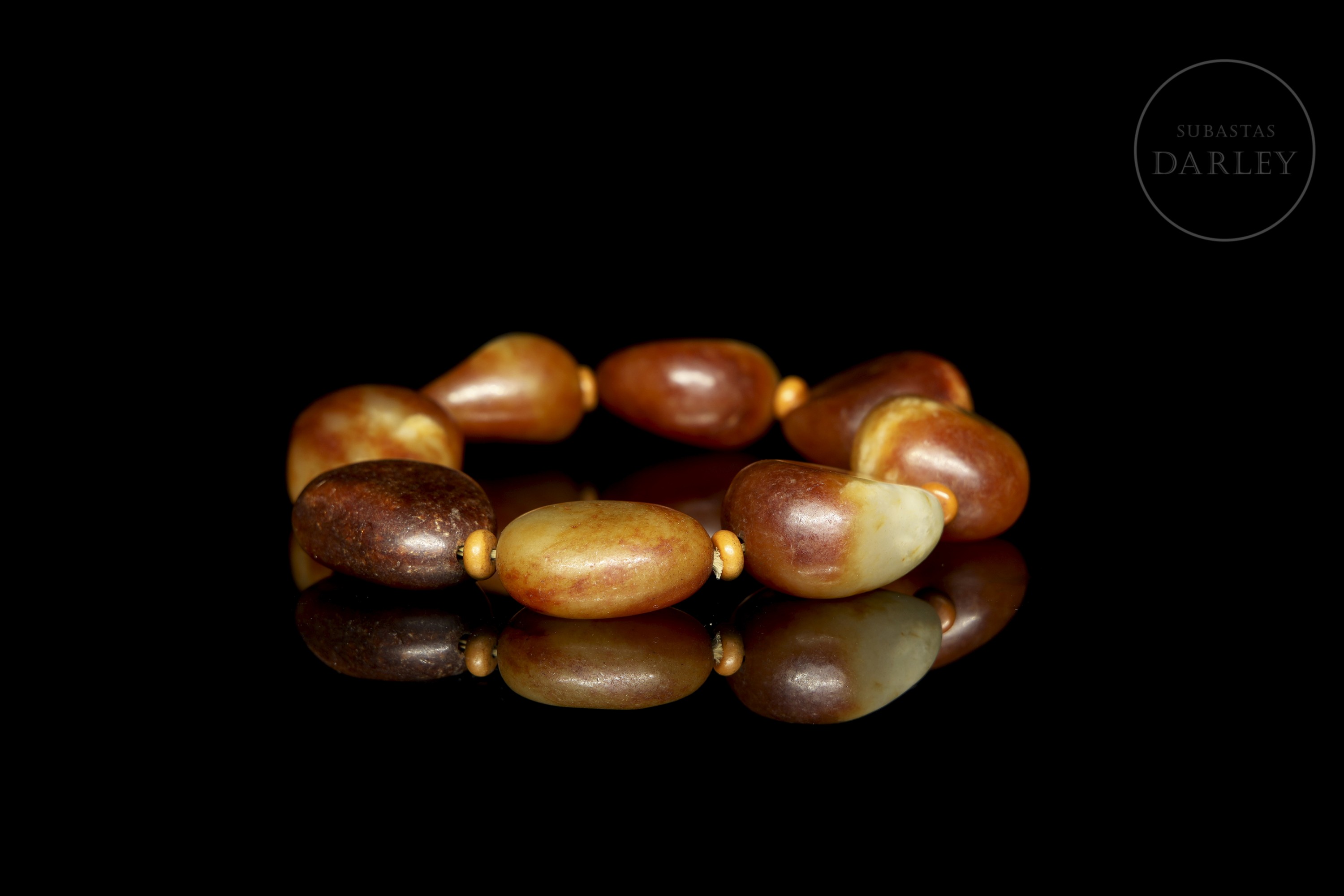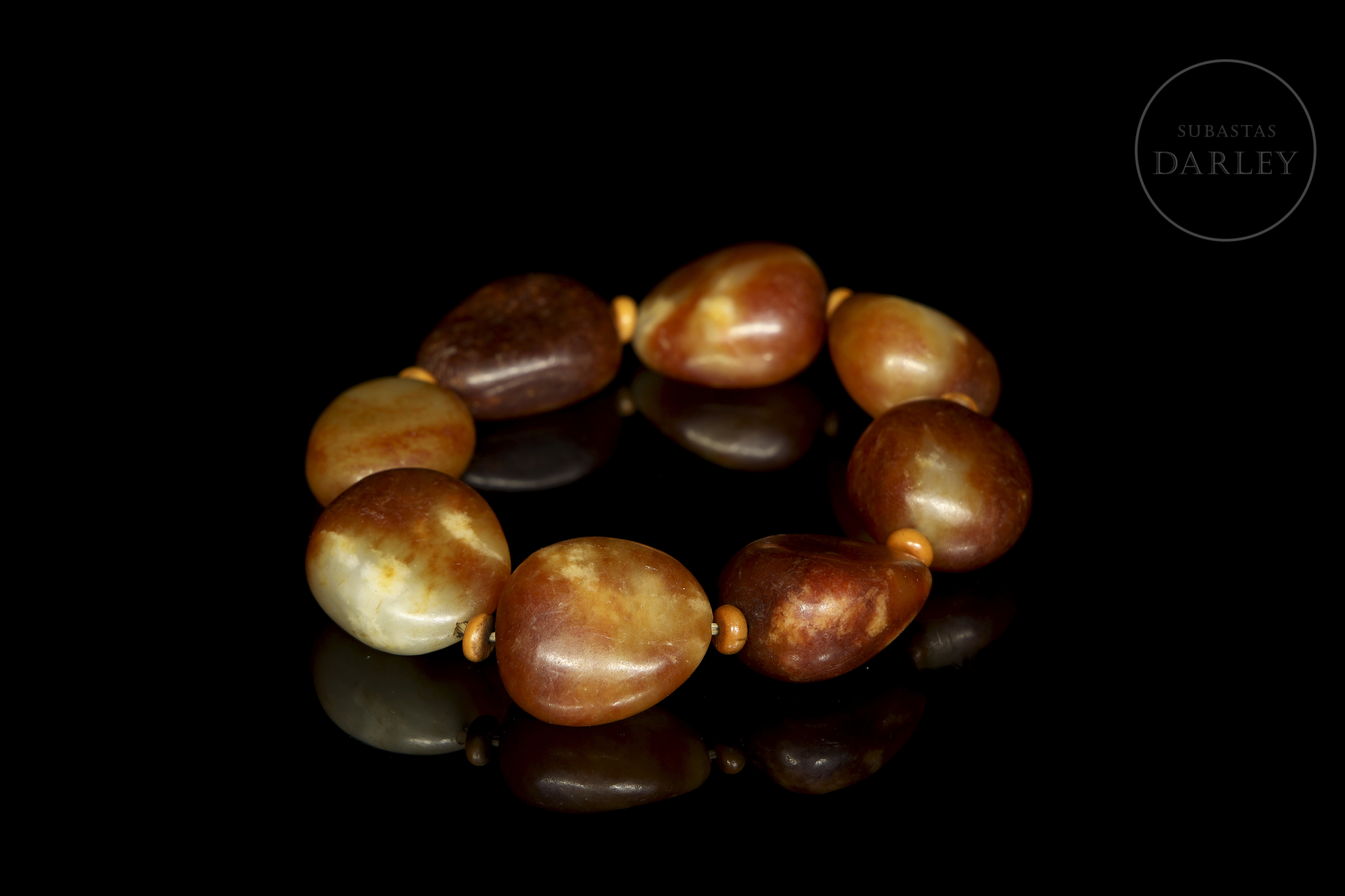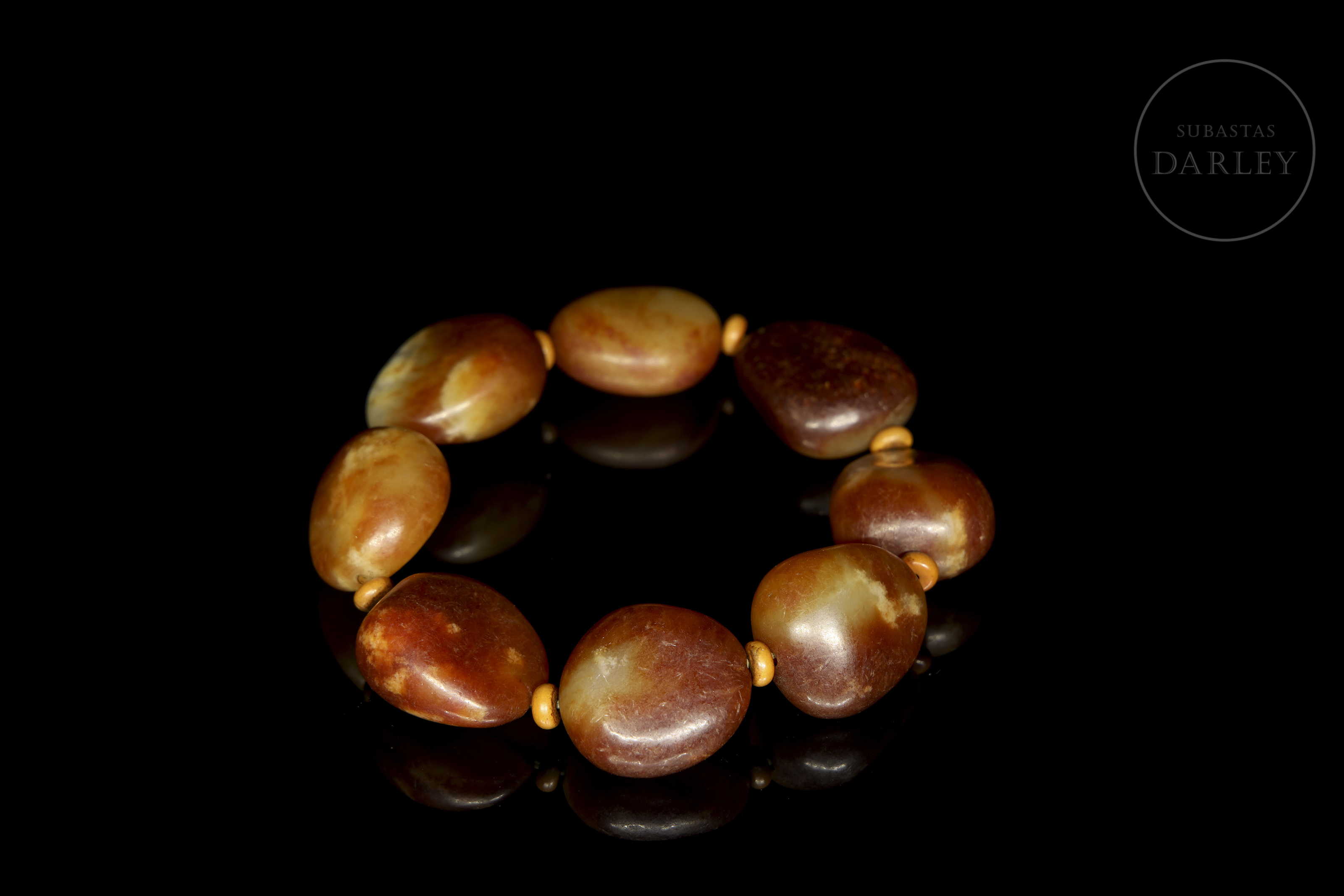 Composed of eight jade beads in brown and ochre tones, with shades ranging from amber to ivory. The irregularly shaped beads have smoothly polished surfaces and are separated by a small ochre-coloured disc, all strung on a modern elastic thread.