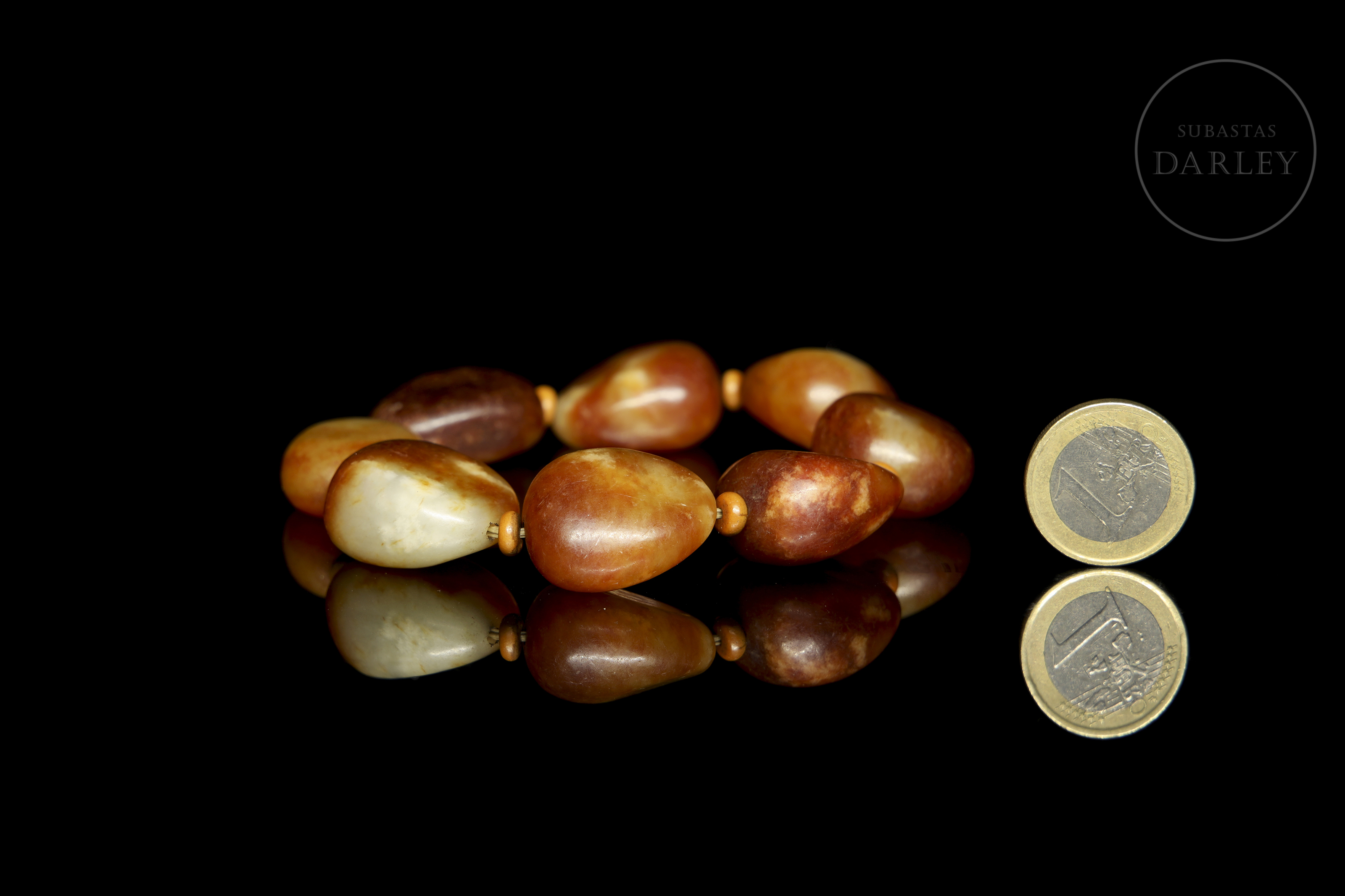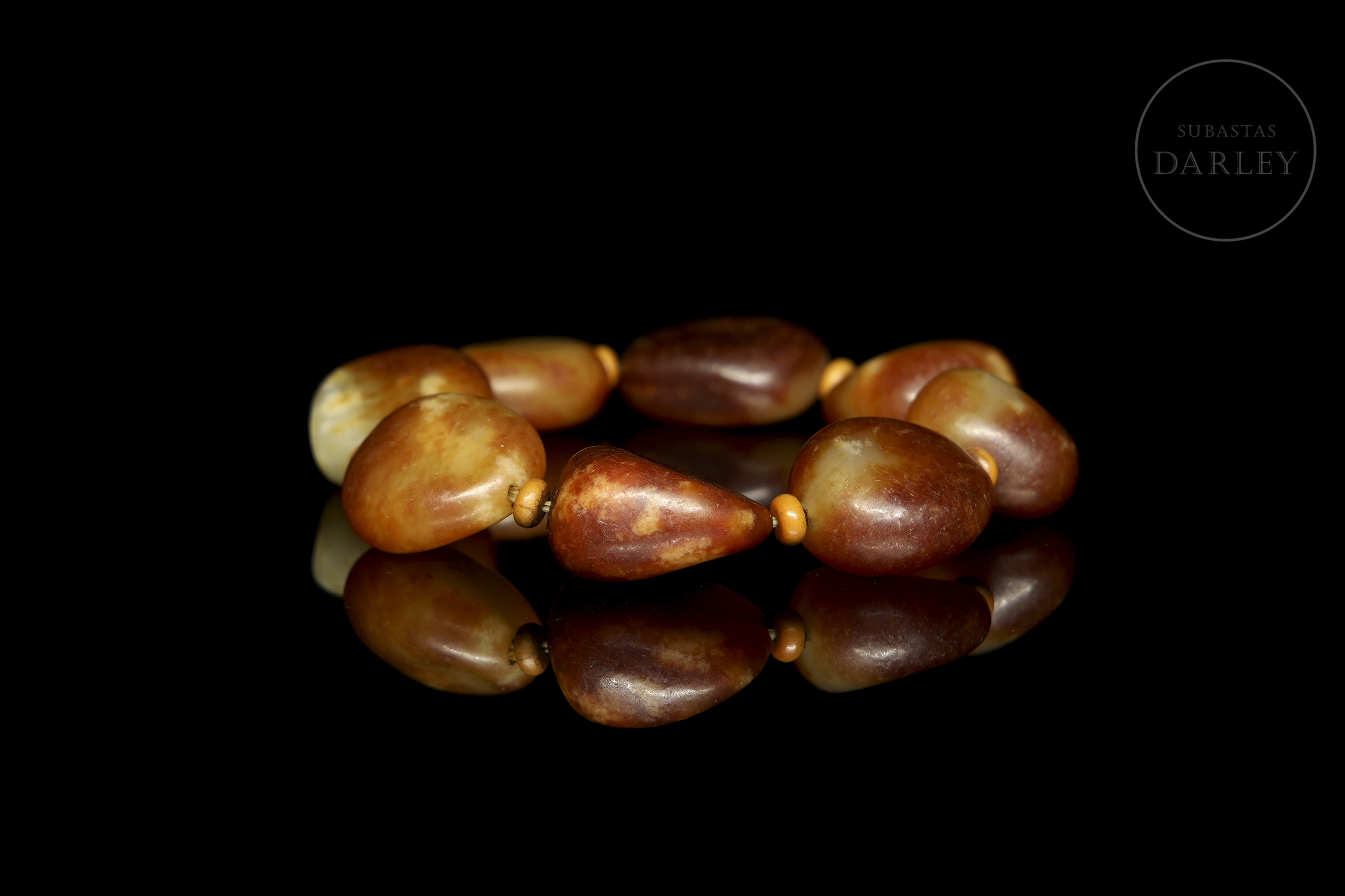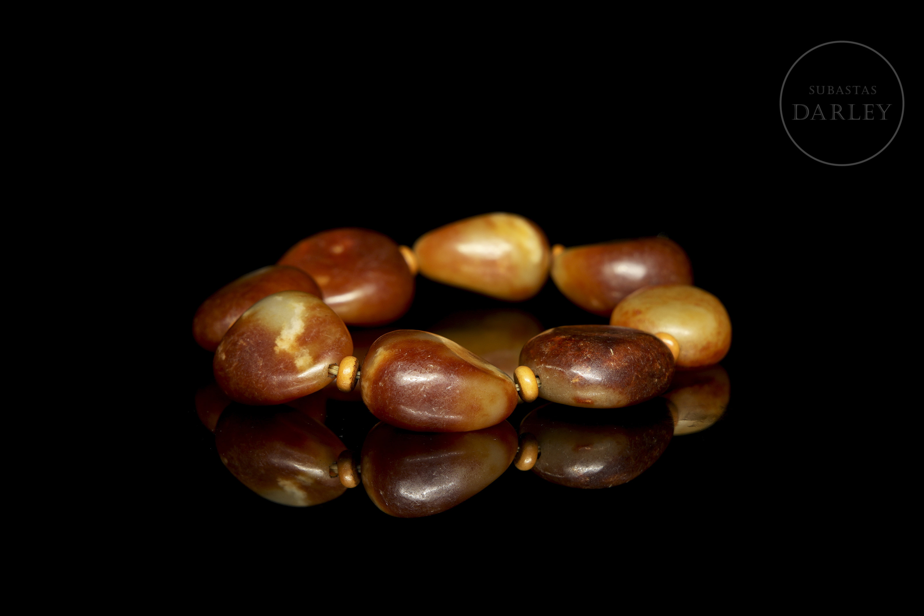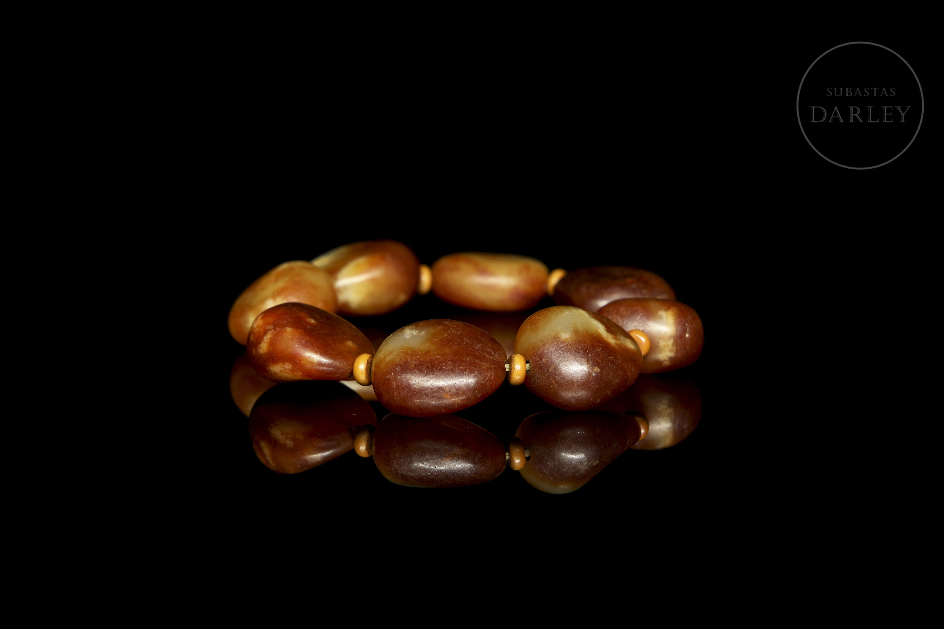 Composed of eight jade beads in brown and ochre tones, with shades ranging from amber to ivory. The irregularly shaped beads have smoothly polished surfaces and are separated by a small ochre-coloured disc, all strung on a modern elastic thread.