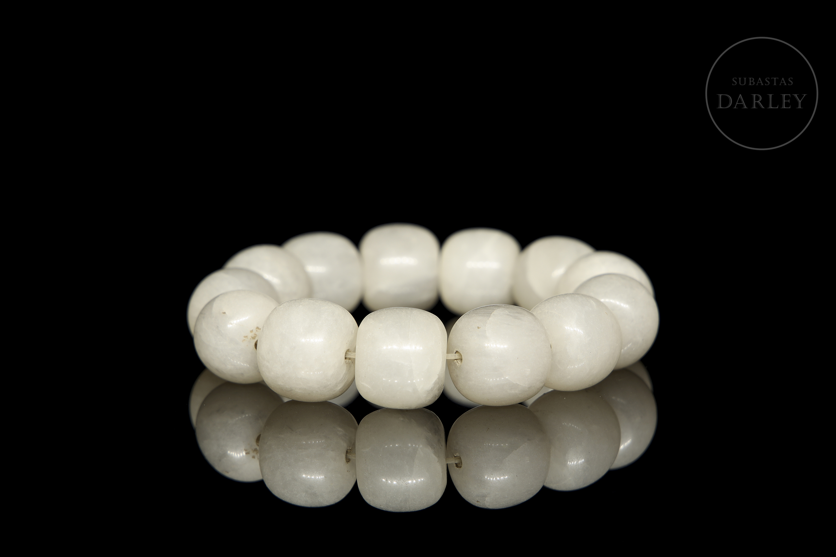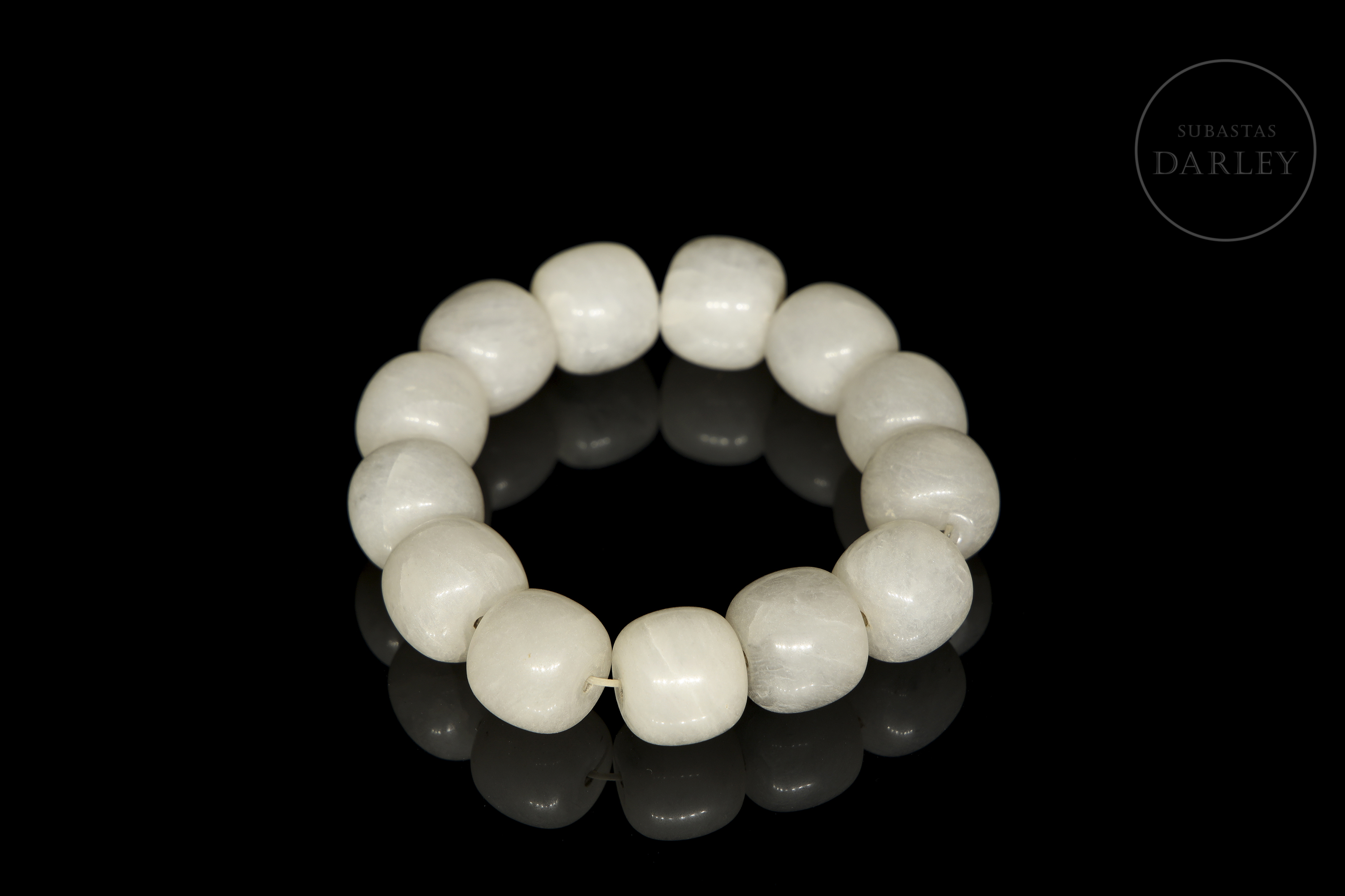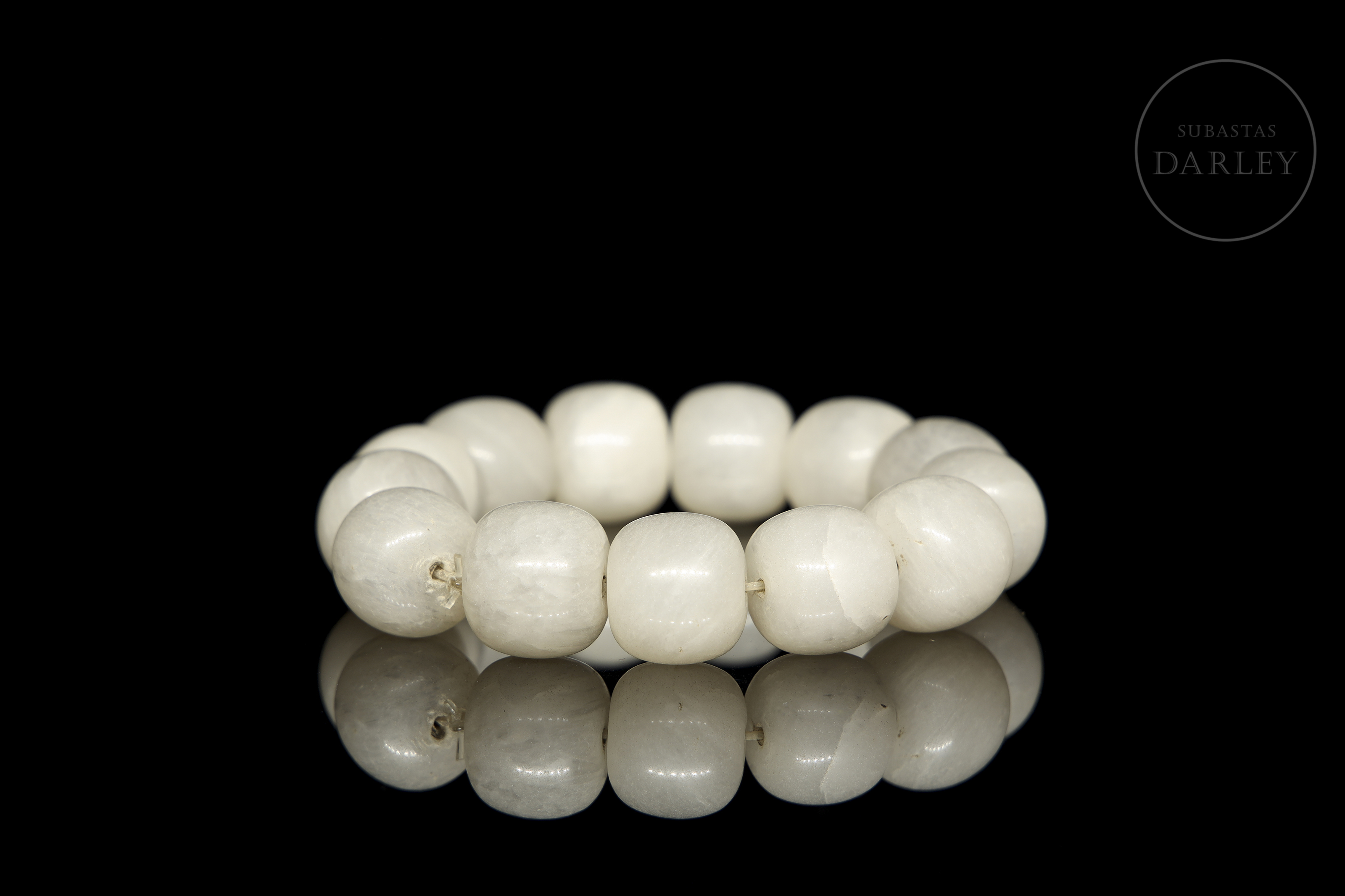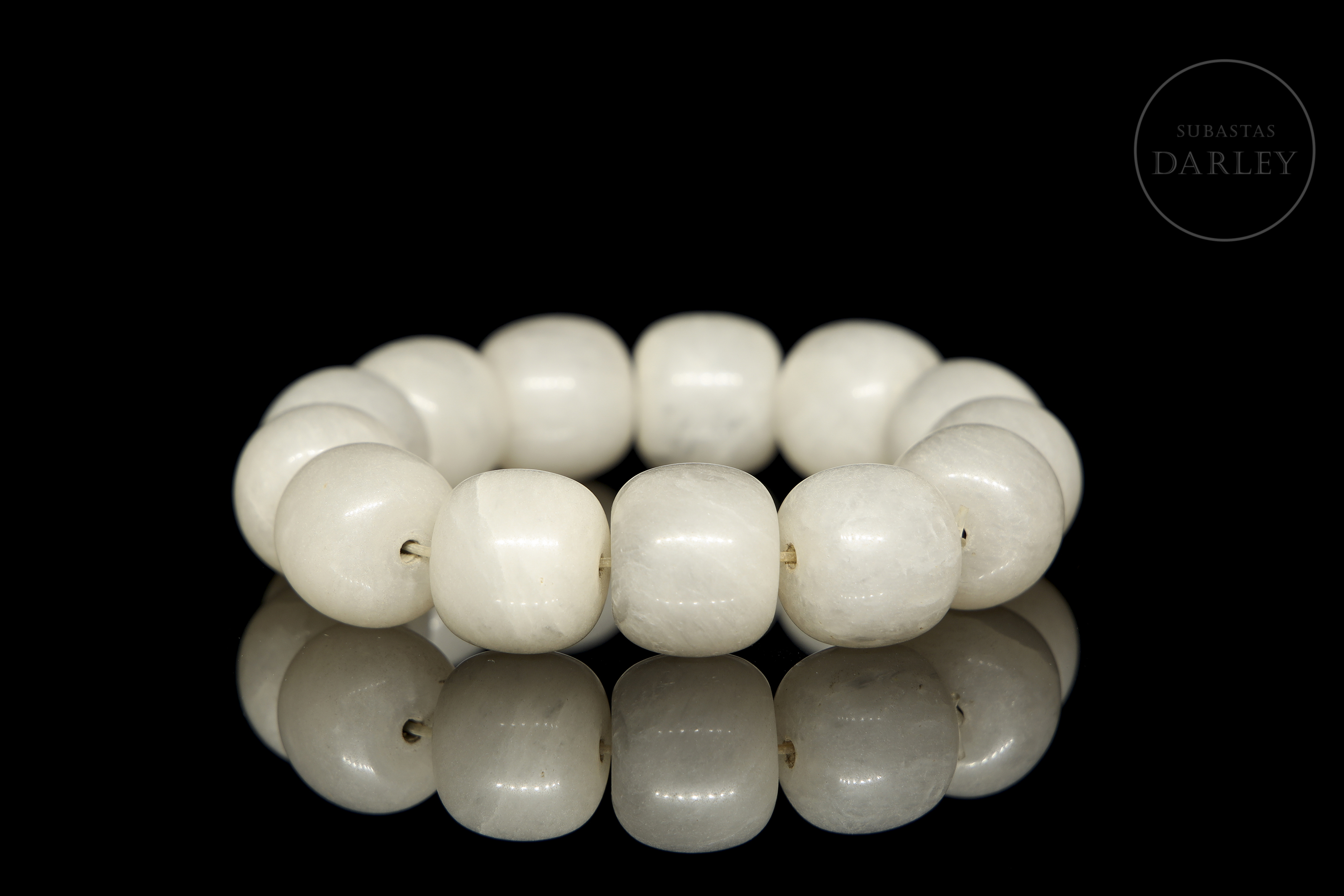 Bracelet made of 13 carved stone beads in translucent white tones, with slight irregularities characteristic of hand carving. The material, with a milky appearance and soft internal veins, has a satin sheen. Strung on modern elastic thread.