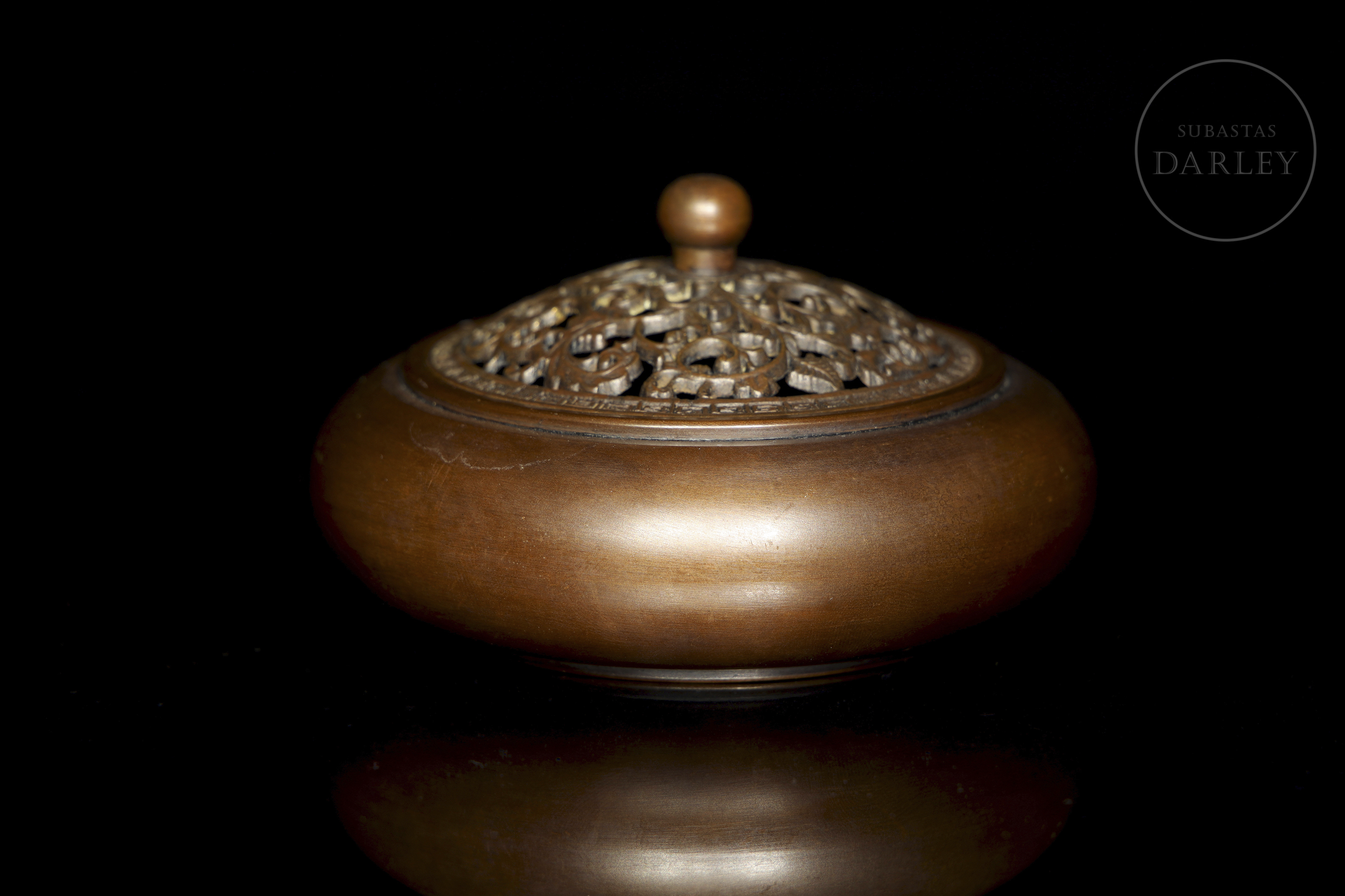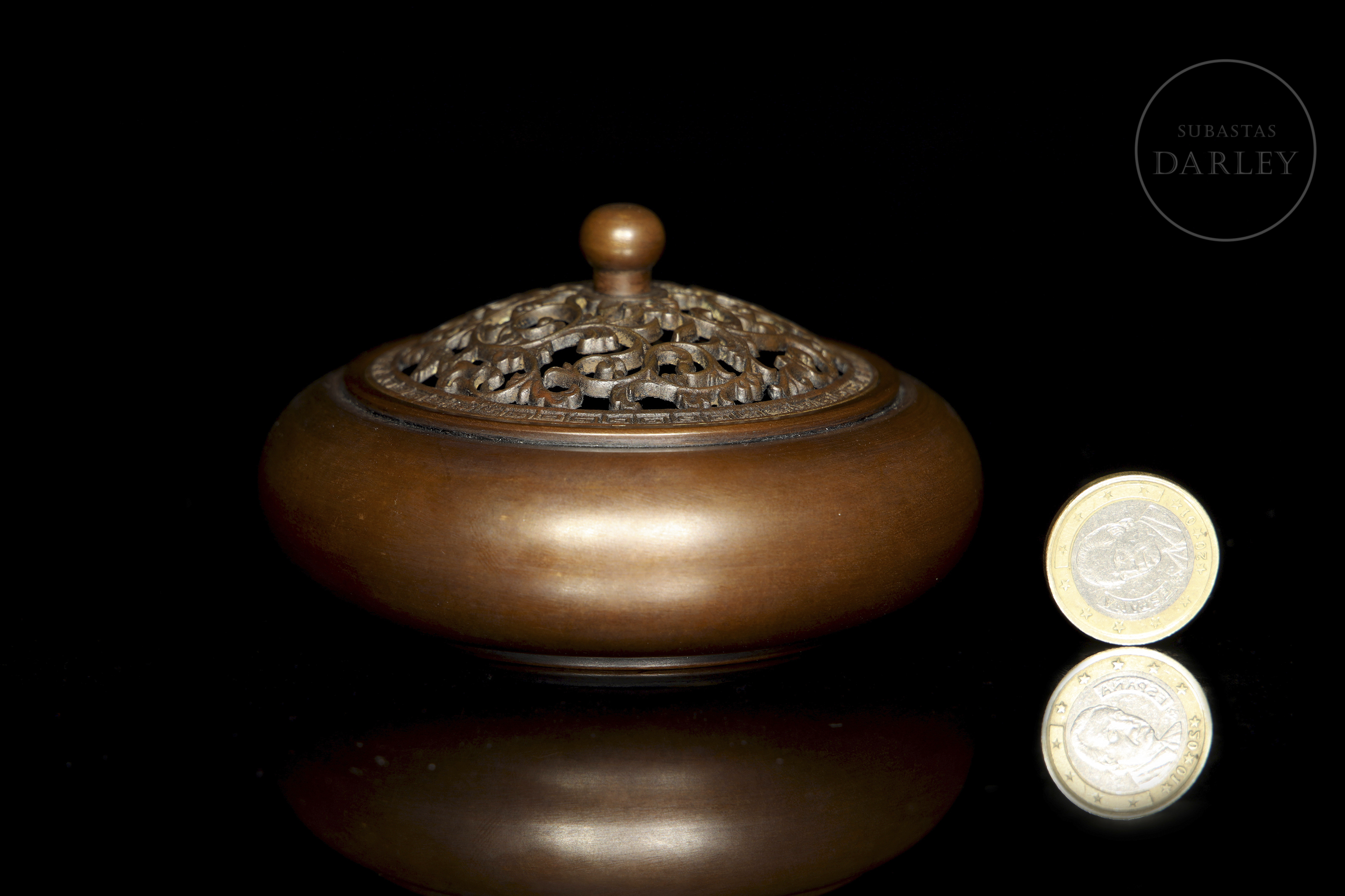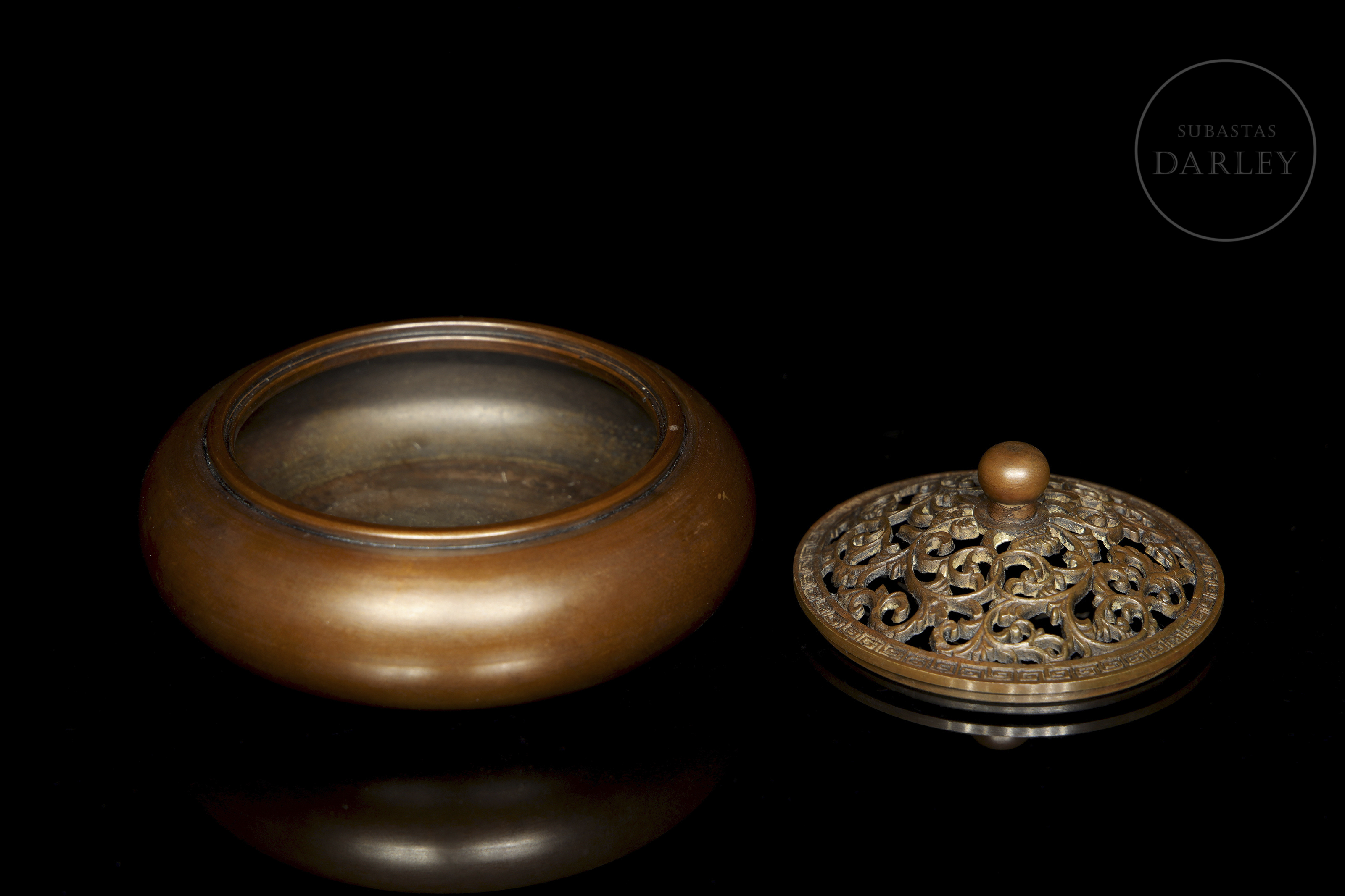Patinated bronze incense burner with a circular, flat body that narrows at the mouth, topped by a concave lid decorated with openwork plant motifs and a small spherical knob. The base features the character ‘宣’ in low relief.
