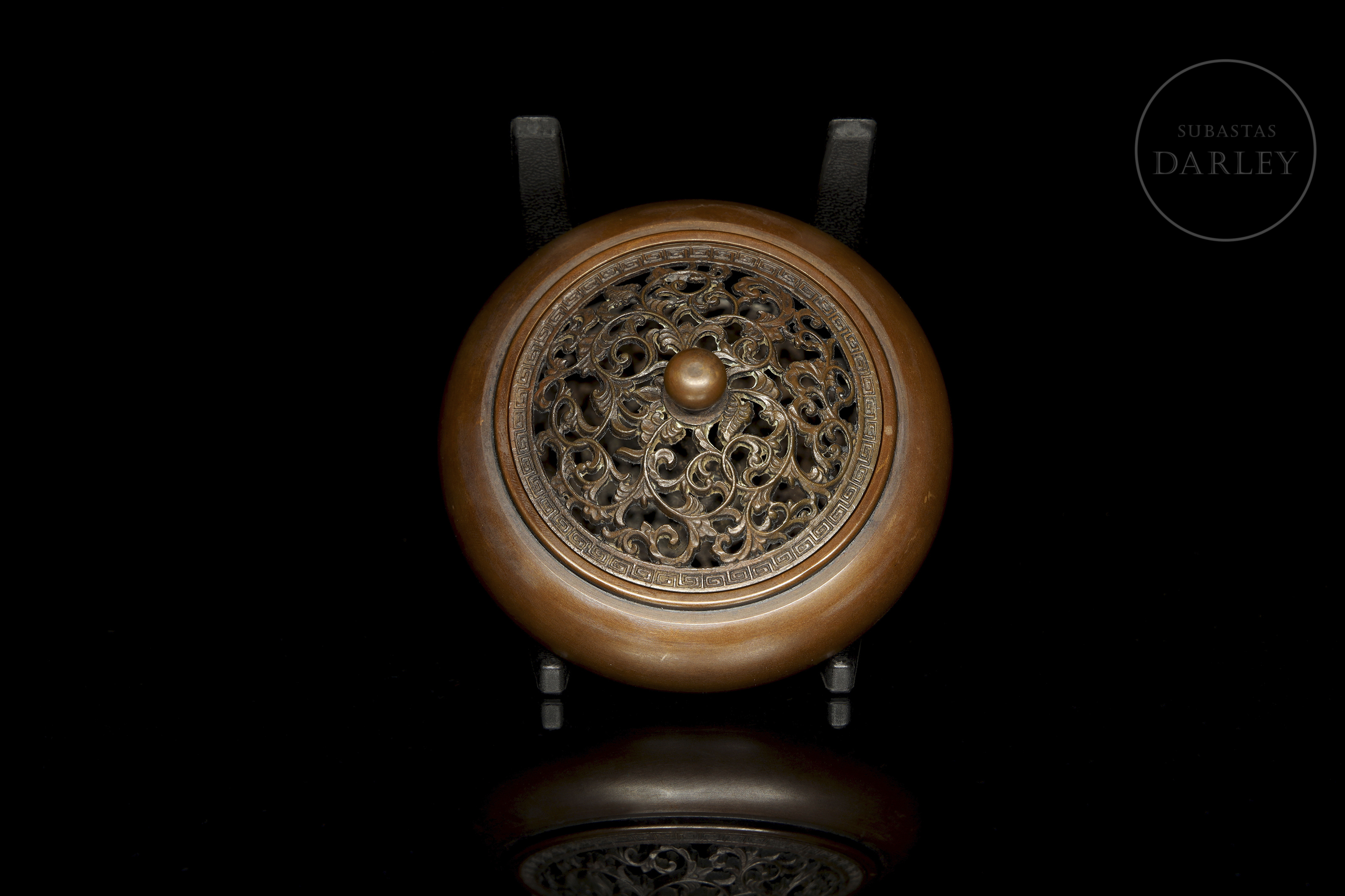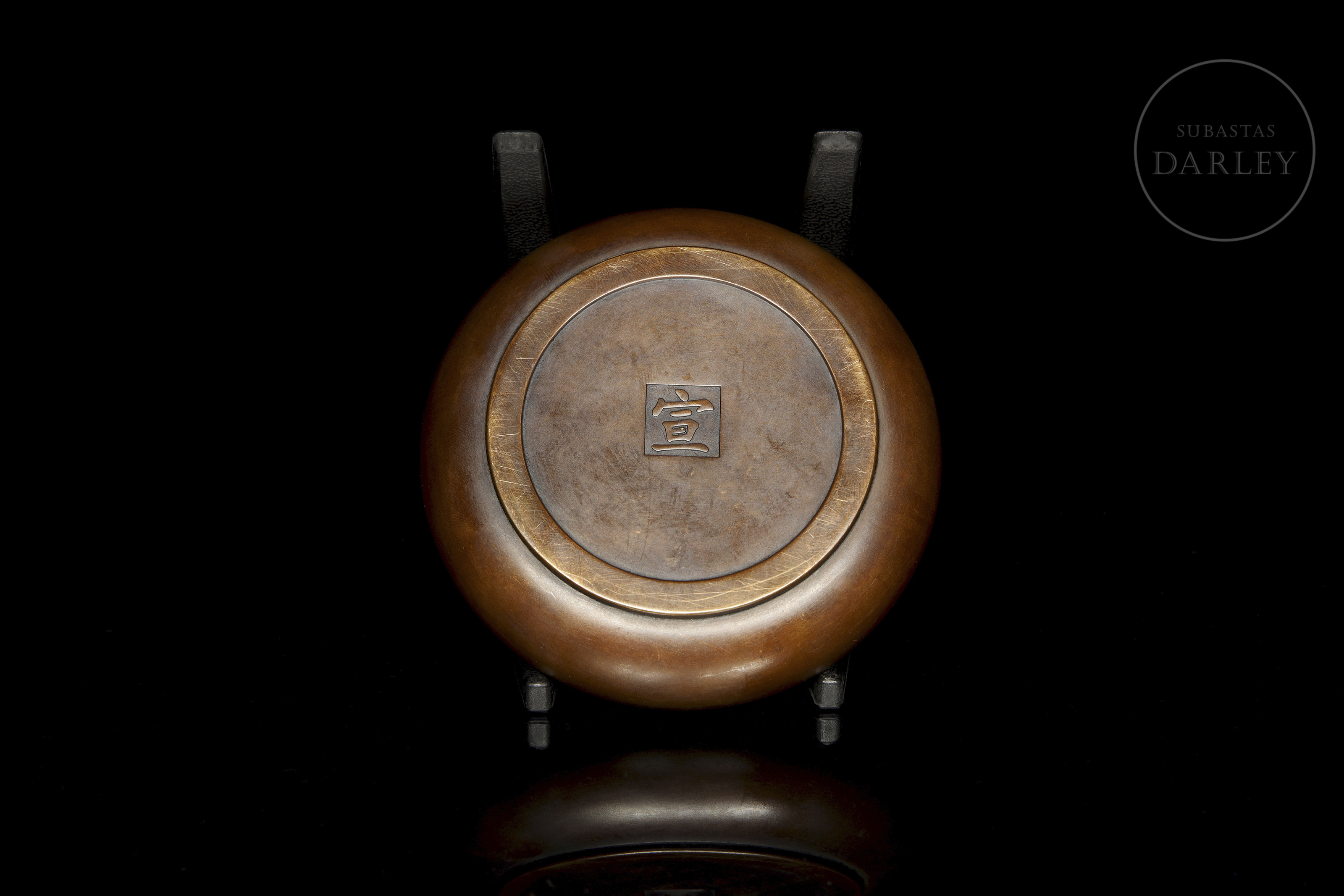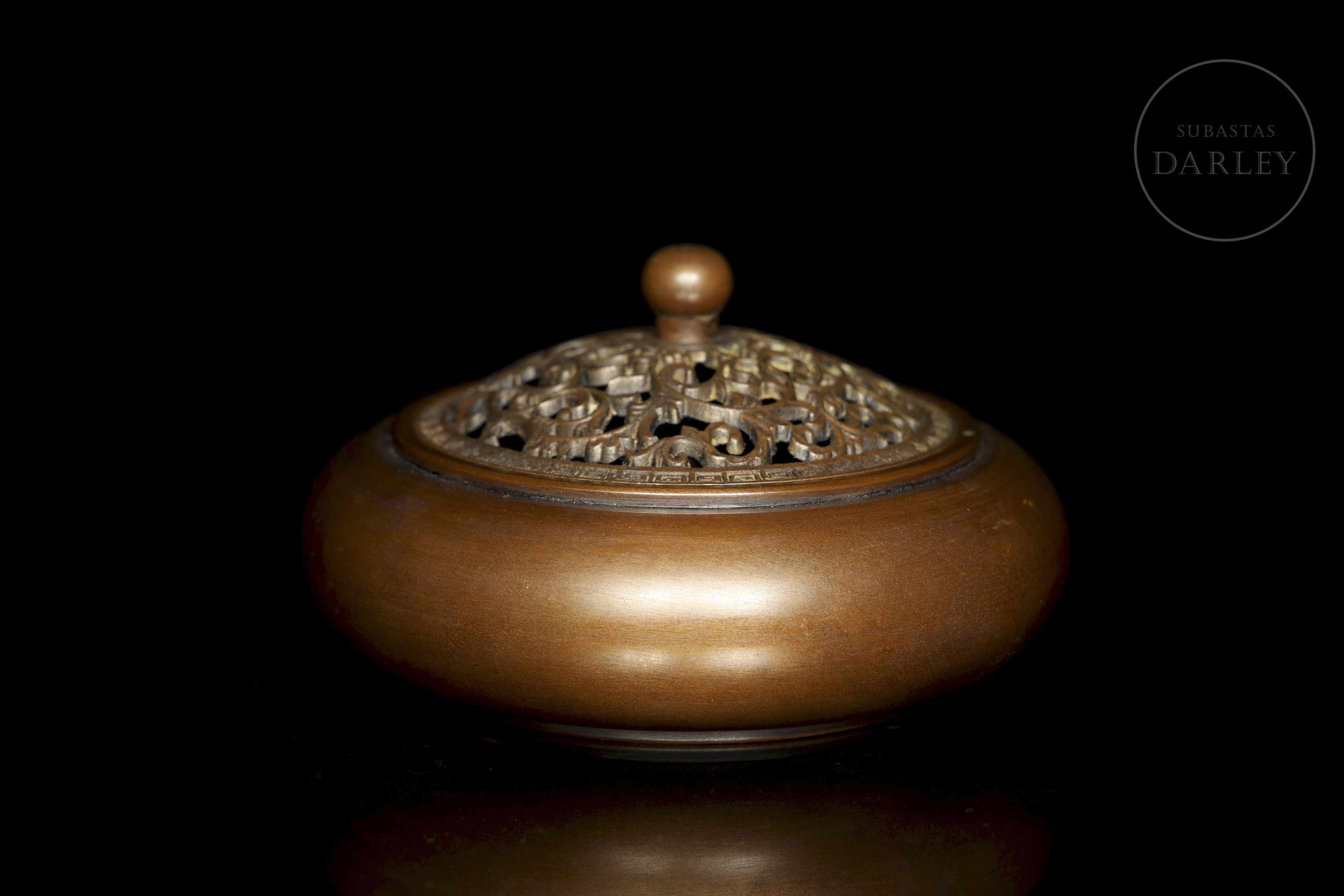 Patinated bronze incense burner with a circular, flat body that narrows at the mouth, topped by a concave lid decorated with openwork plant motifs and a small spherical knob. The base features the character ‘宣’ in low relief.