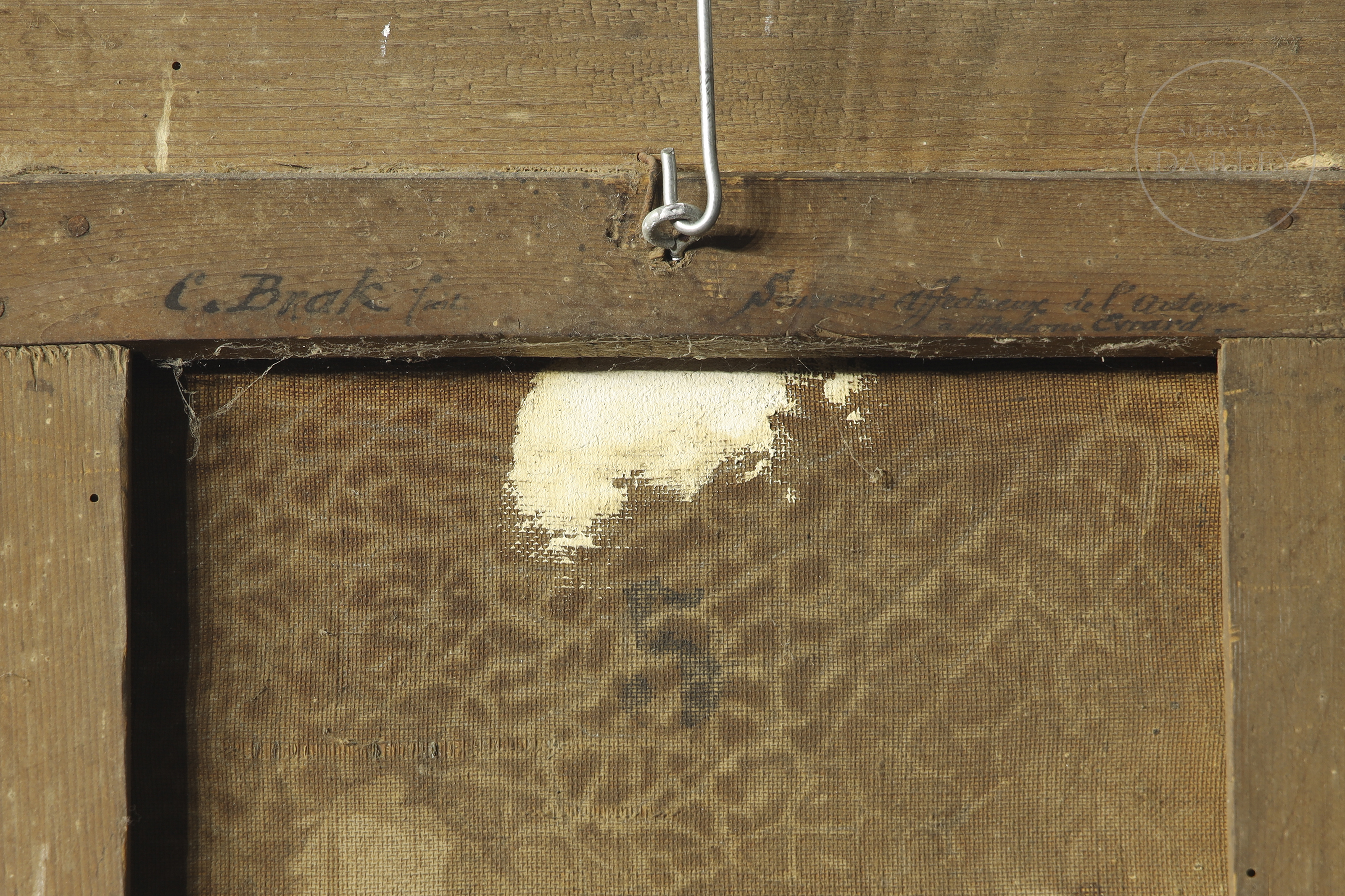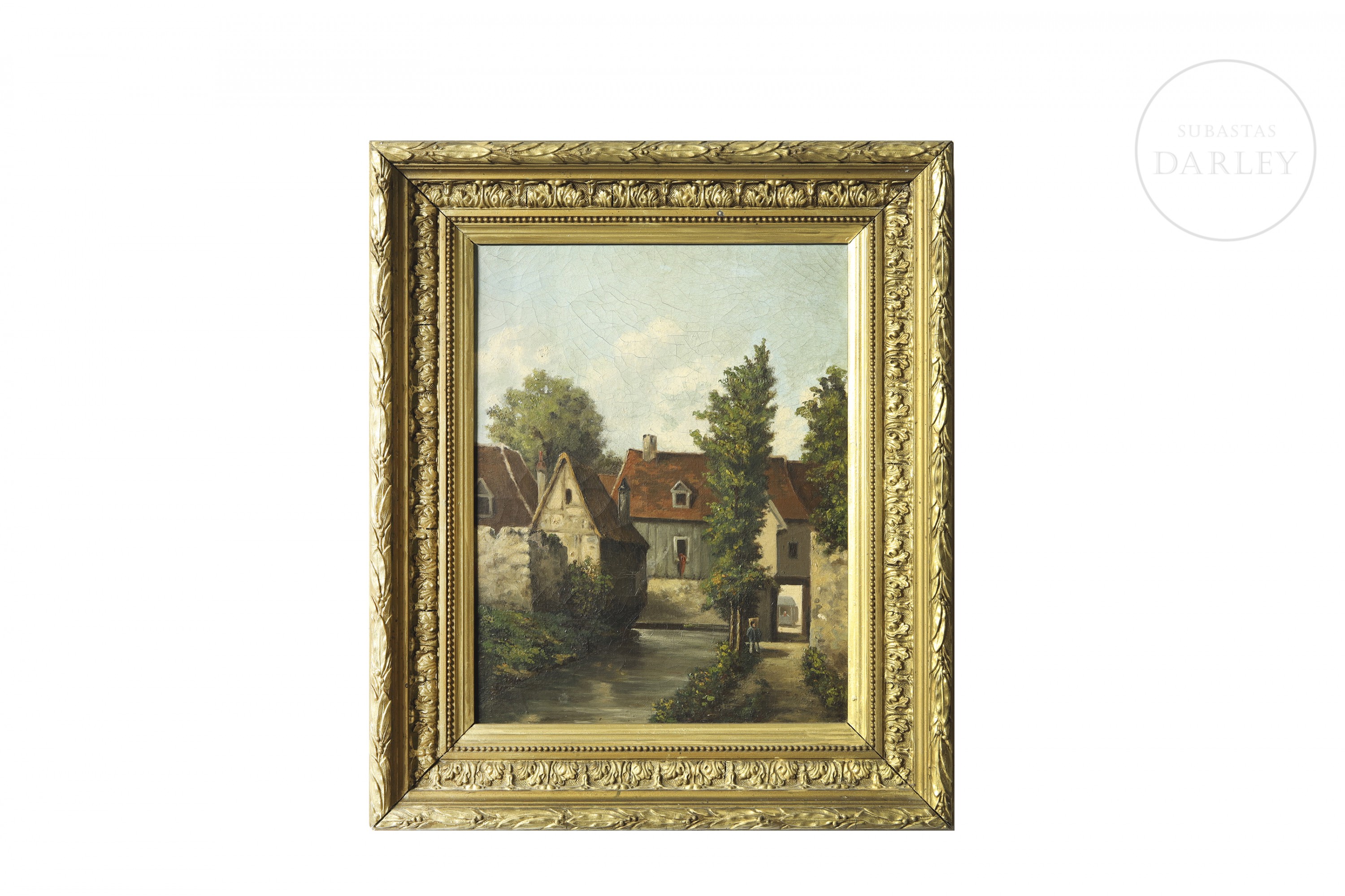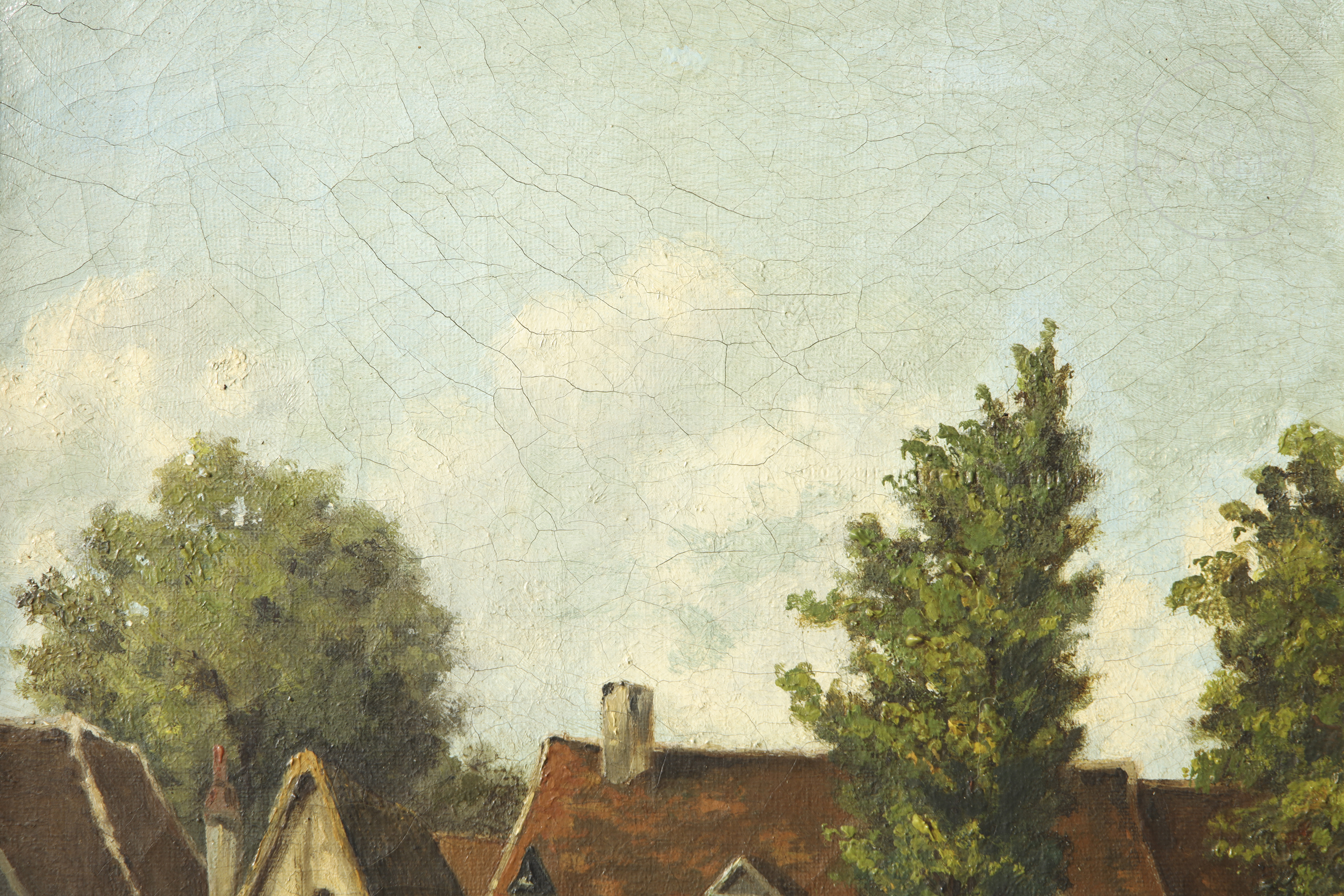 Oil on canvas, signed in the lower right corner. It depicts a group of rural buildings next to a watercourse, with figures in the surroundings and trees framing the composition. Signed ‘C. Bark’ on the stretcher, next to an inscription.
