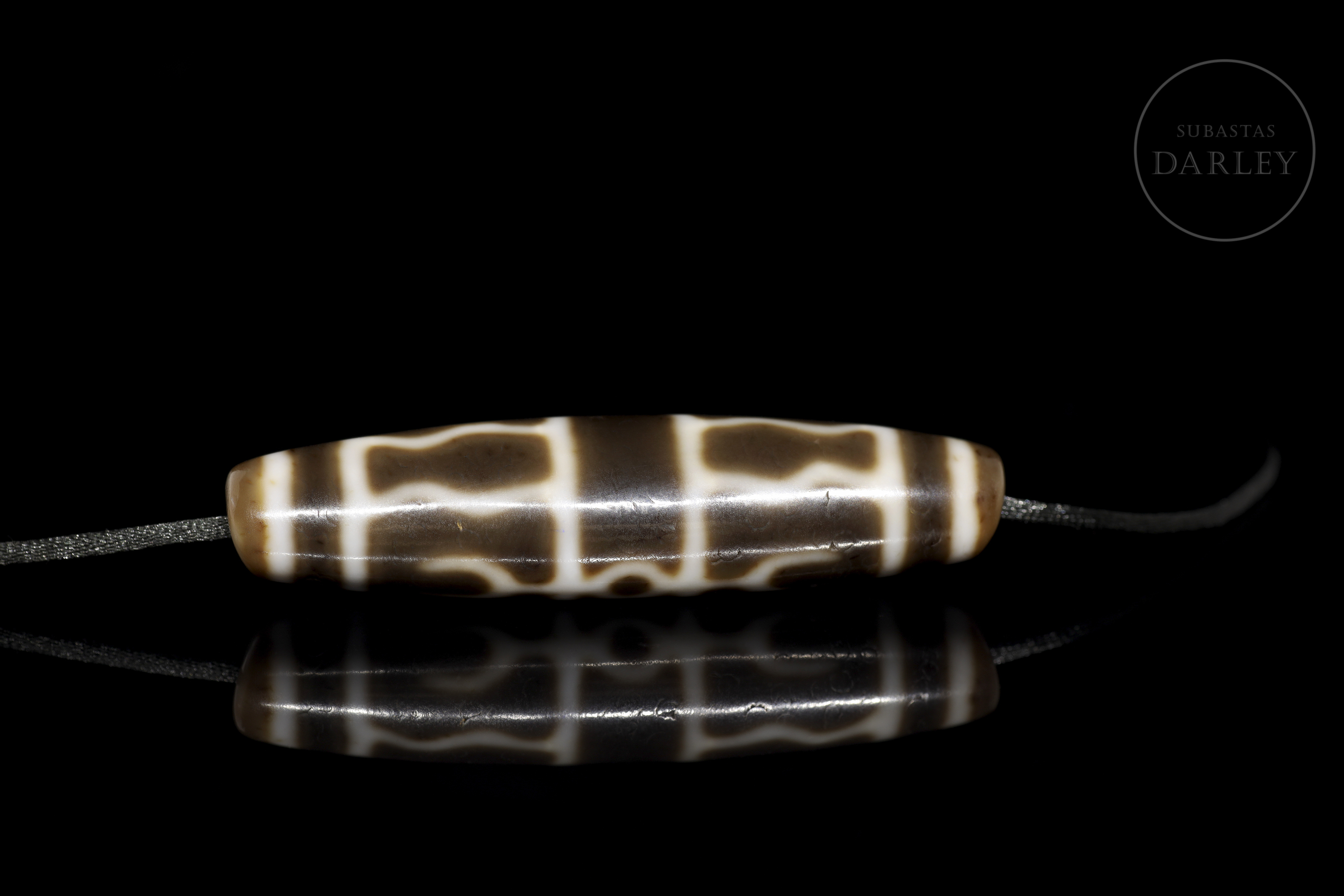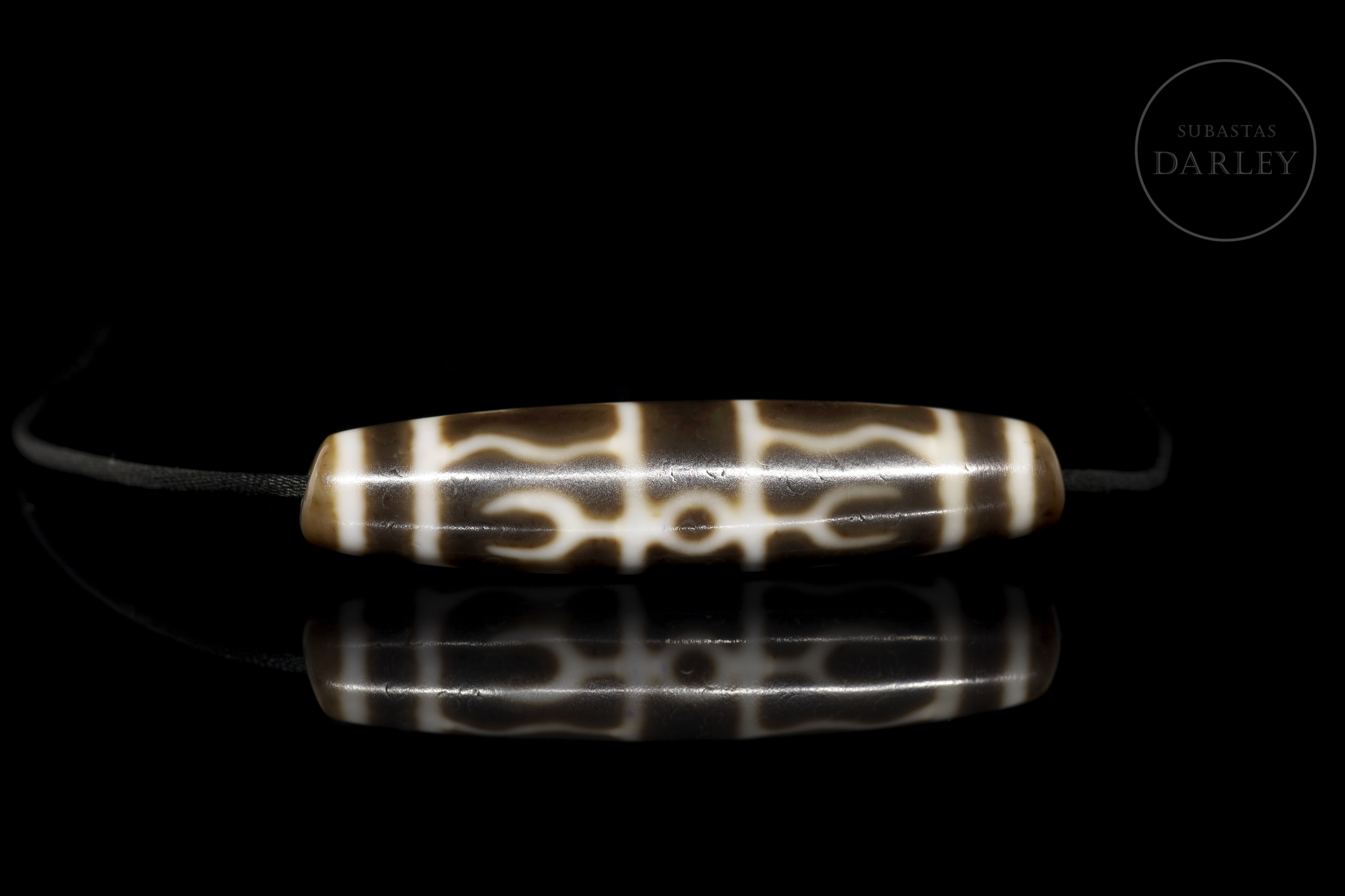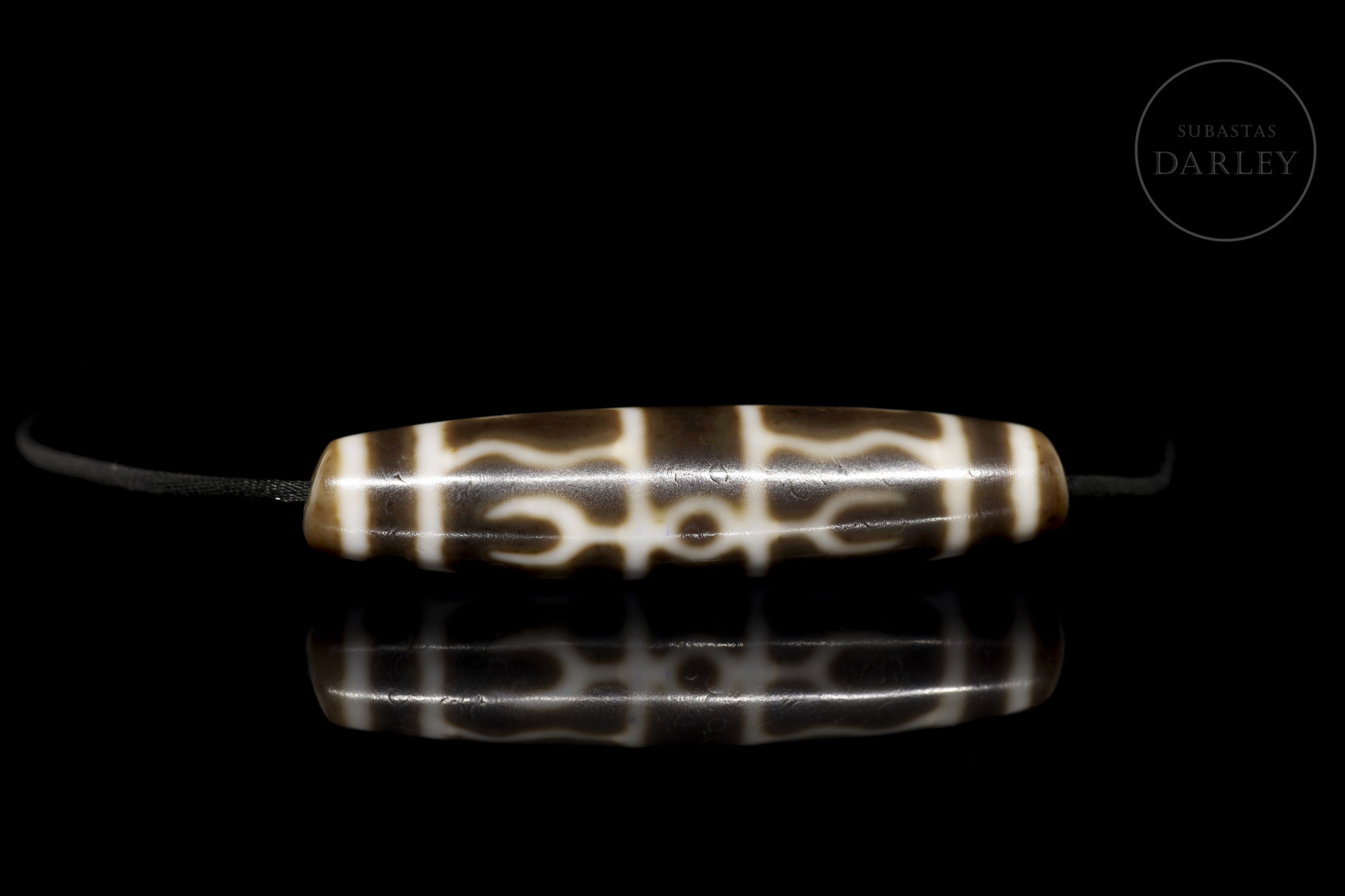 Tubular agate Dzi bead with a rounded cross-section. The dark brown surface is decorated with lines forming geometric patterns in shades of white. Shows patina due to ageing.