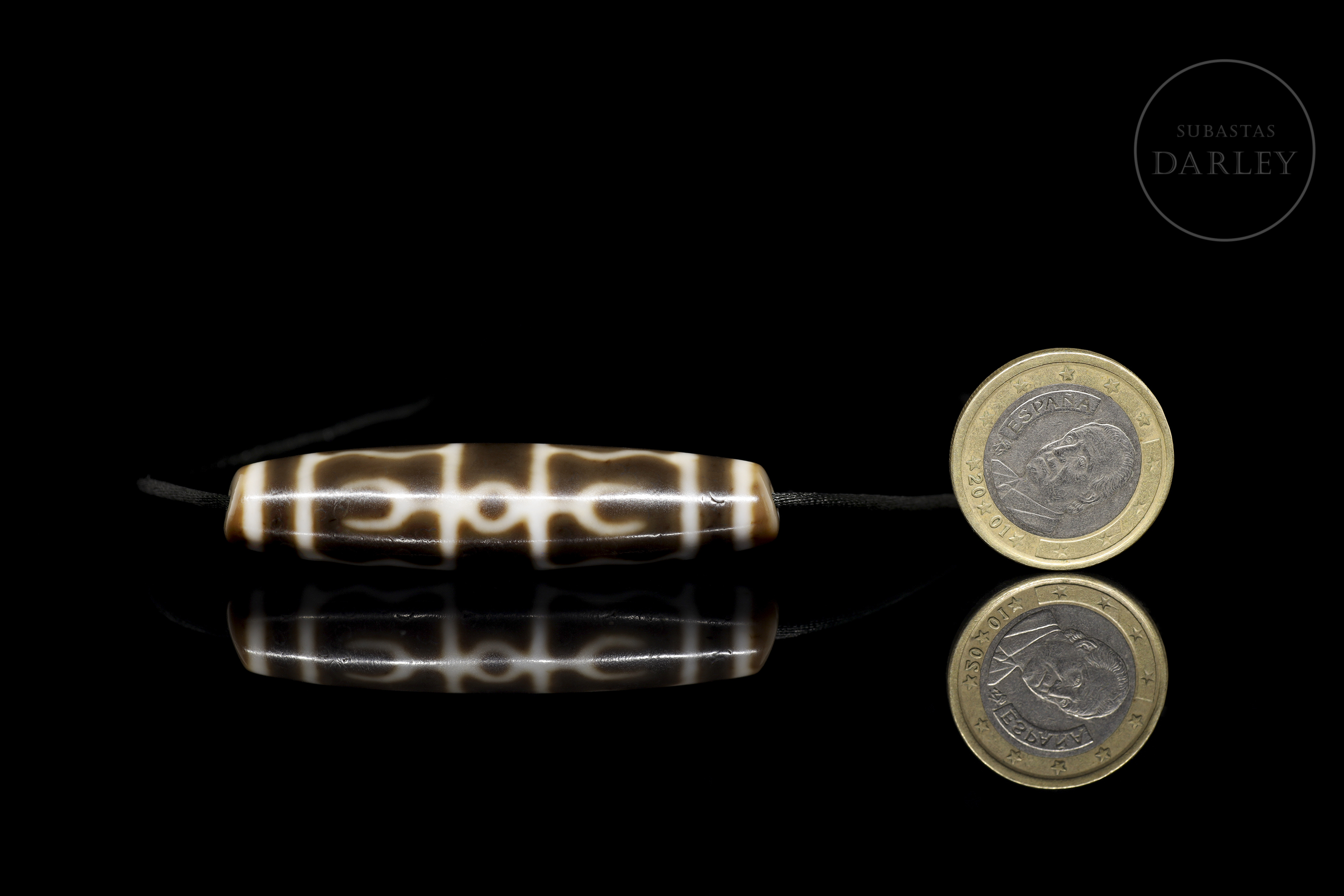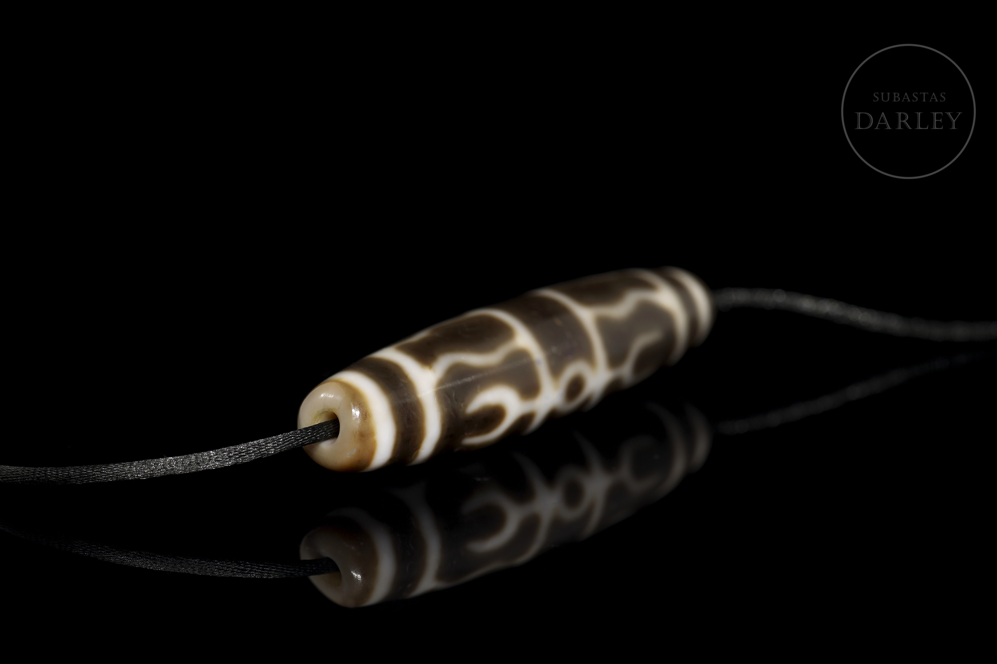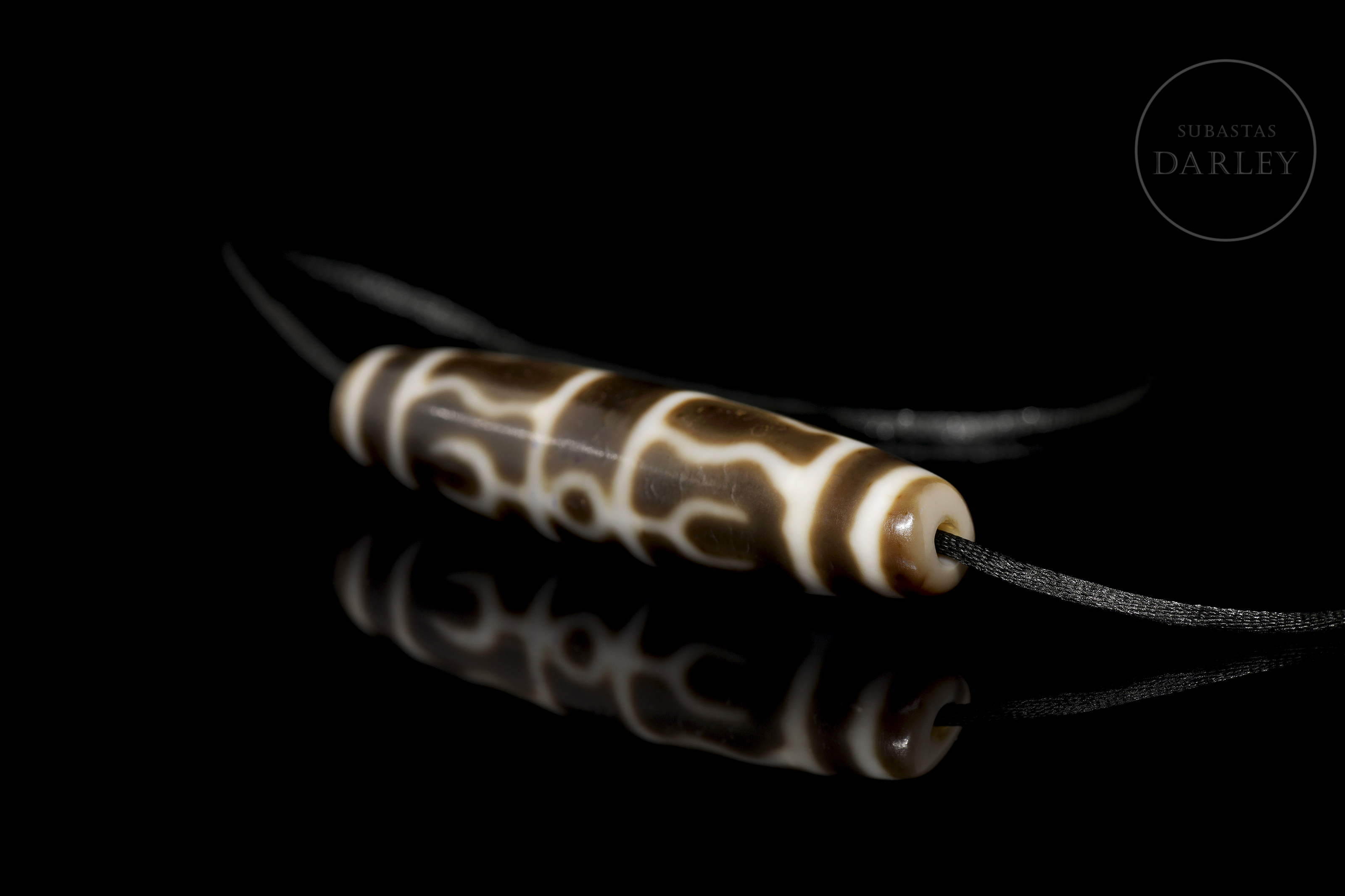 Tubular agate Dzi bead with a rounded cross-section. The dark brown surface is decorated with lines forming geometric patterns in shades of white. Shows patina due to ageing.