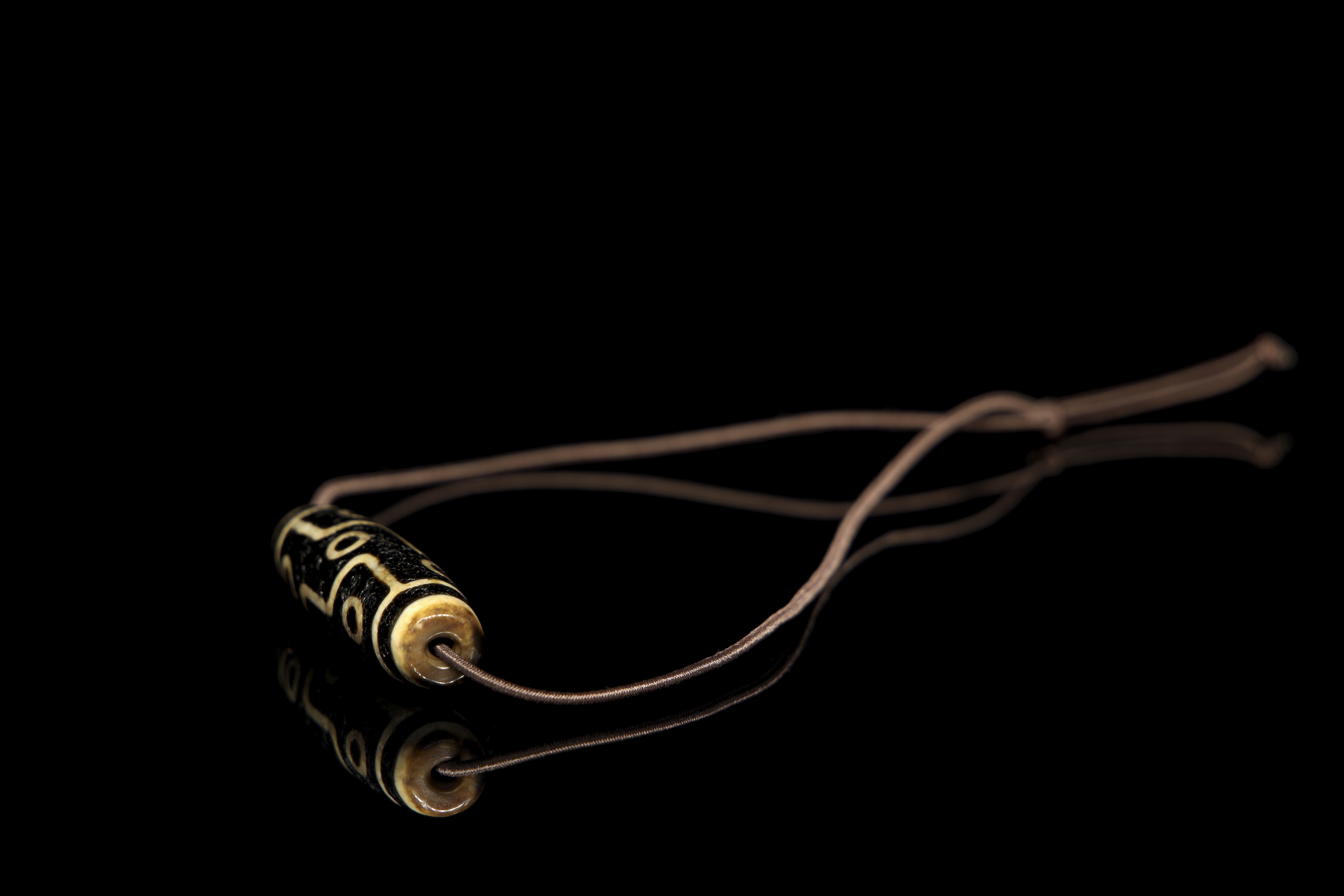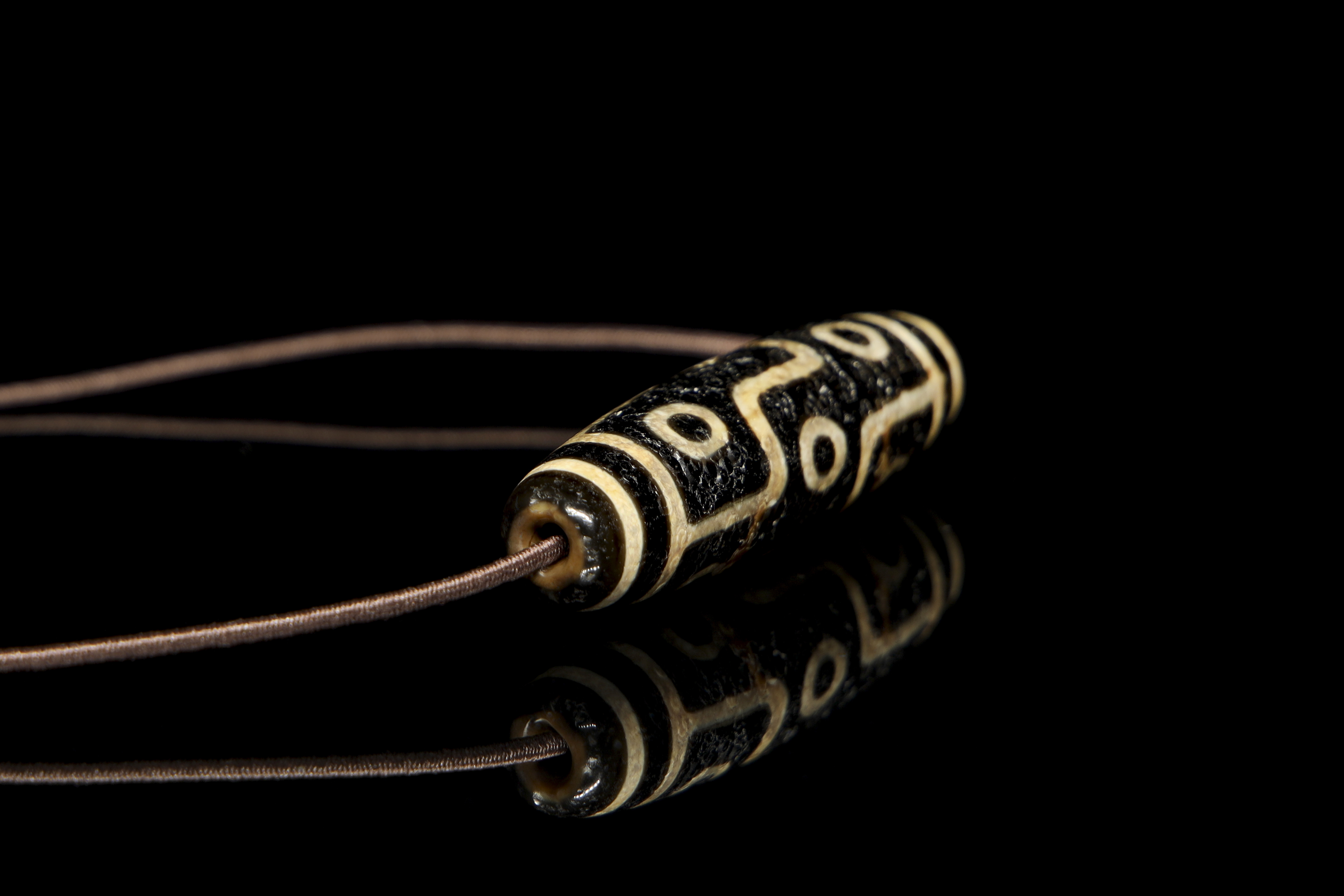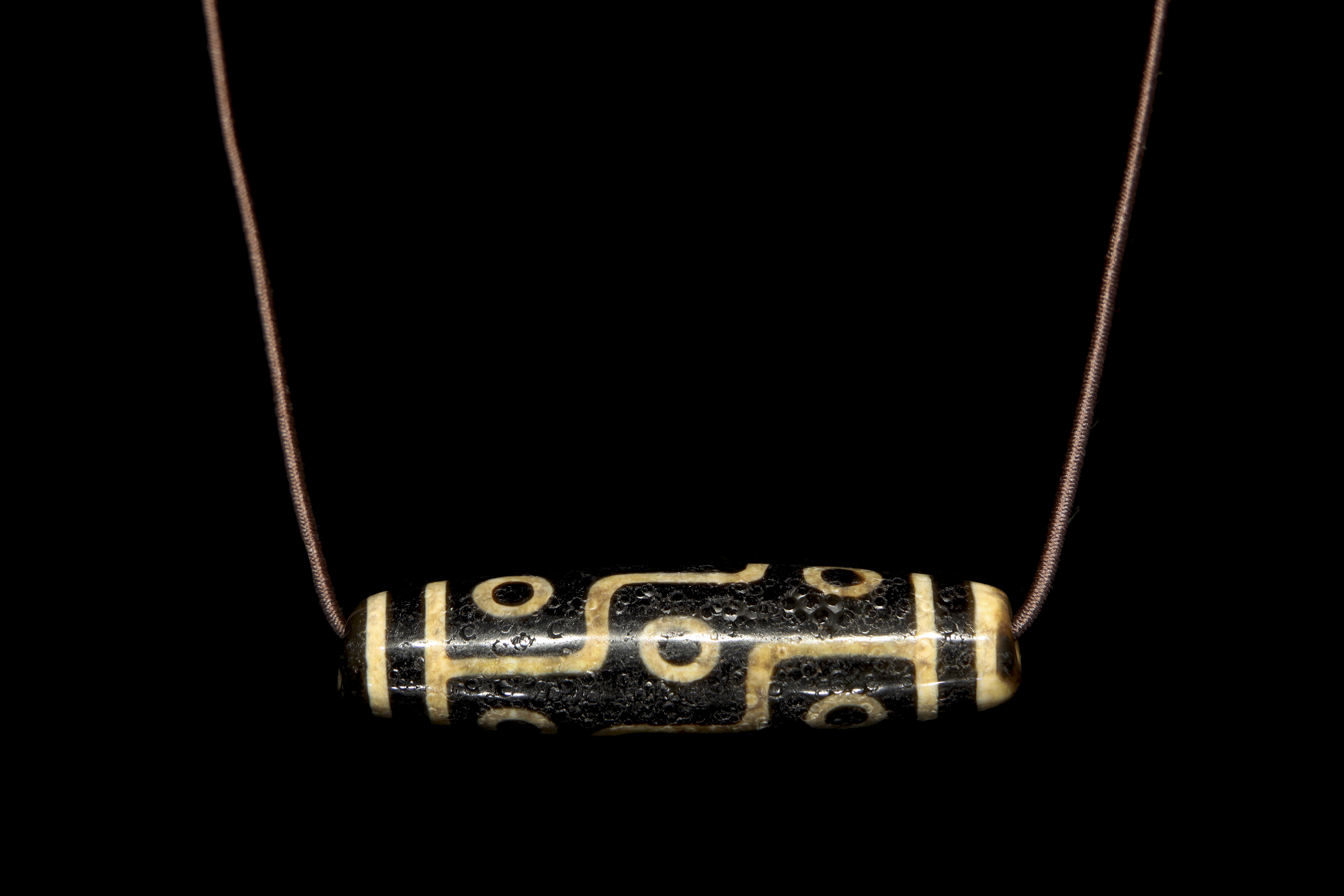 Agate Dzi bead, tubular and slightly barrel-shaped. The surface of the dark brown stone is decorated with spheres and lines in ochre tones. The decoration represents the “nine eyes” motif, interspersed with wave patterns and geometric motifs.