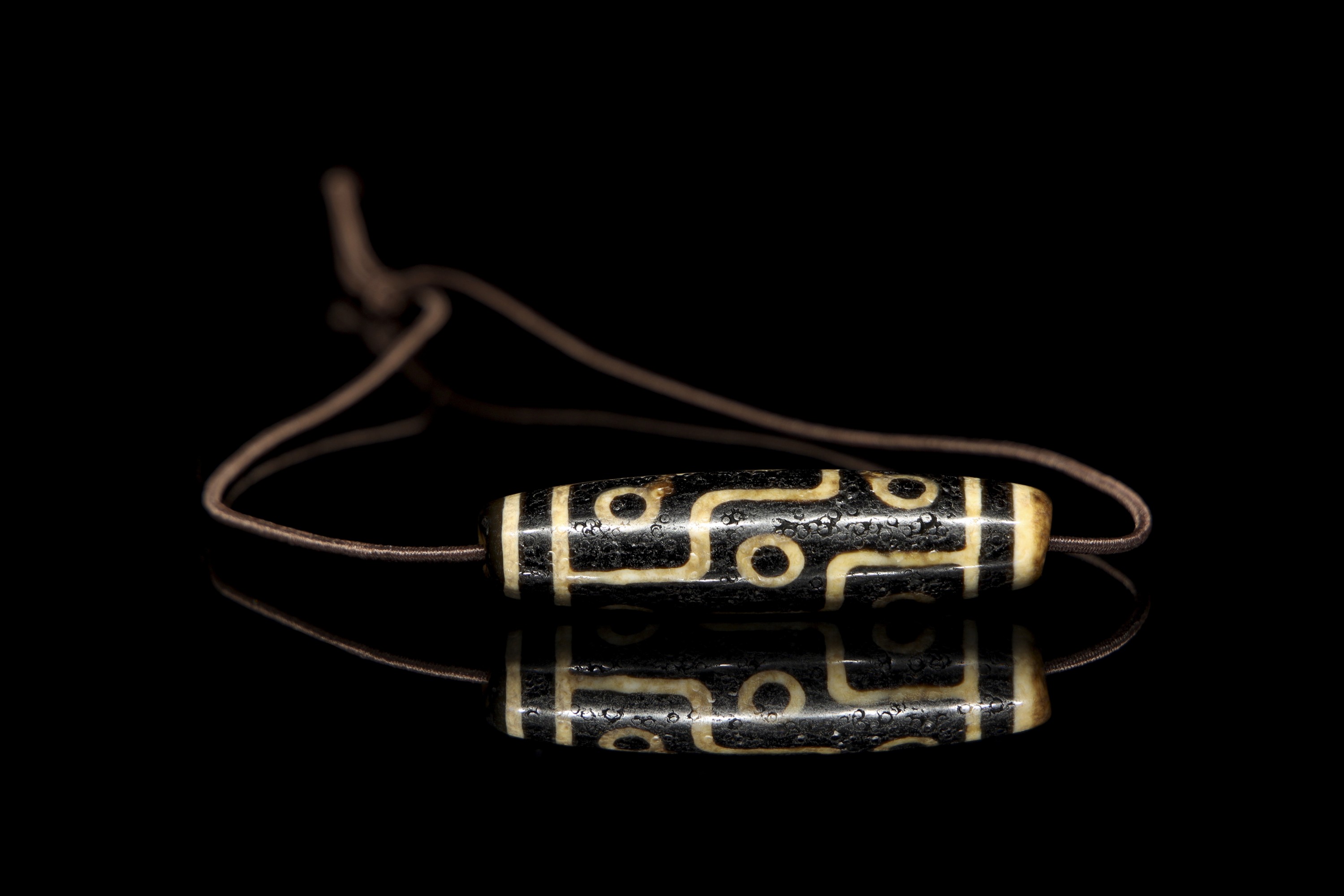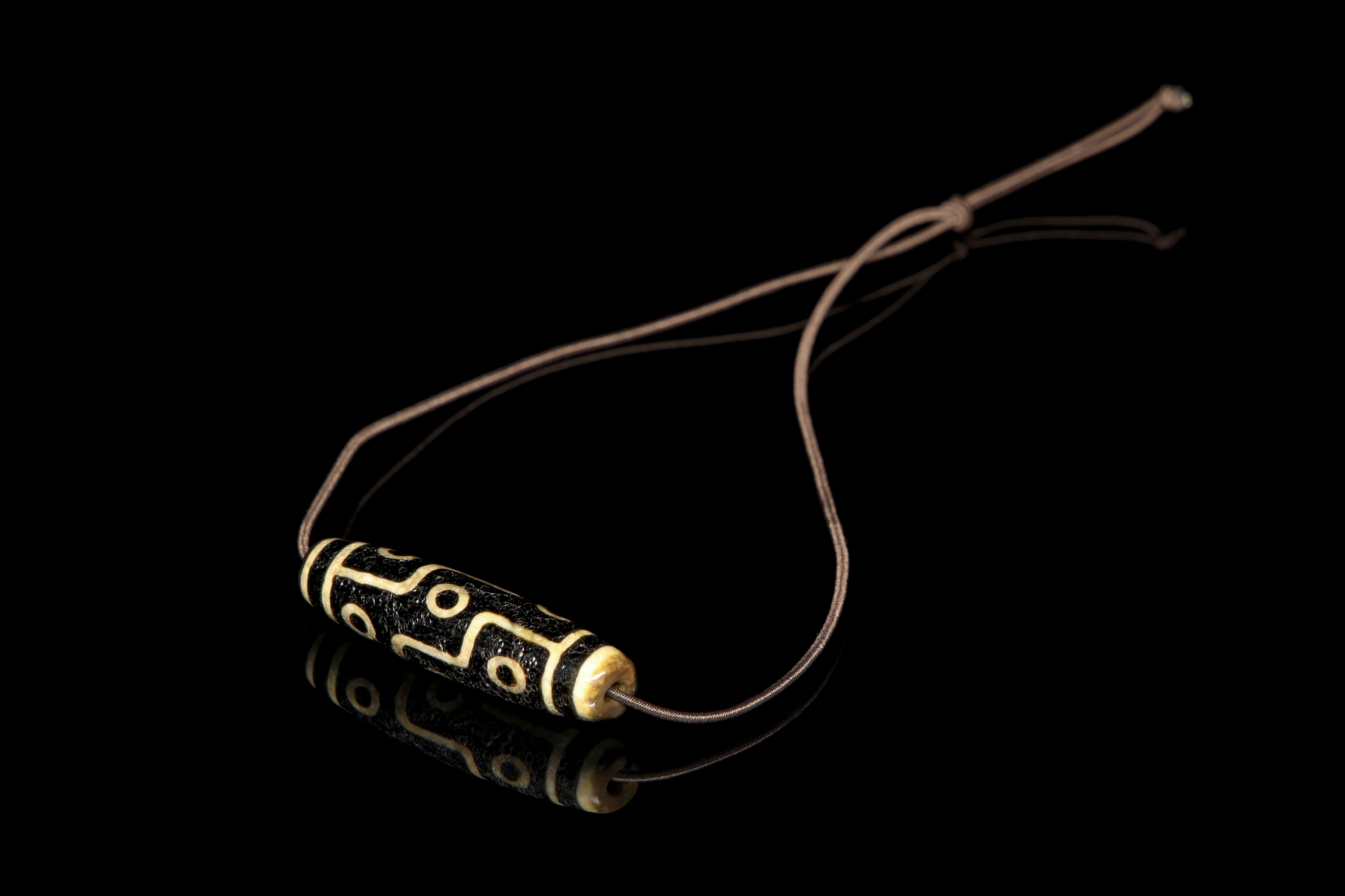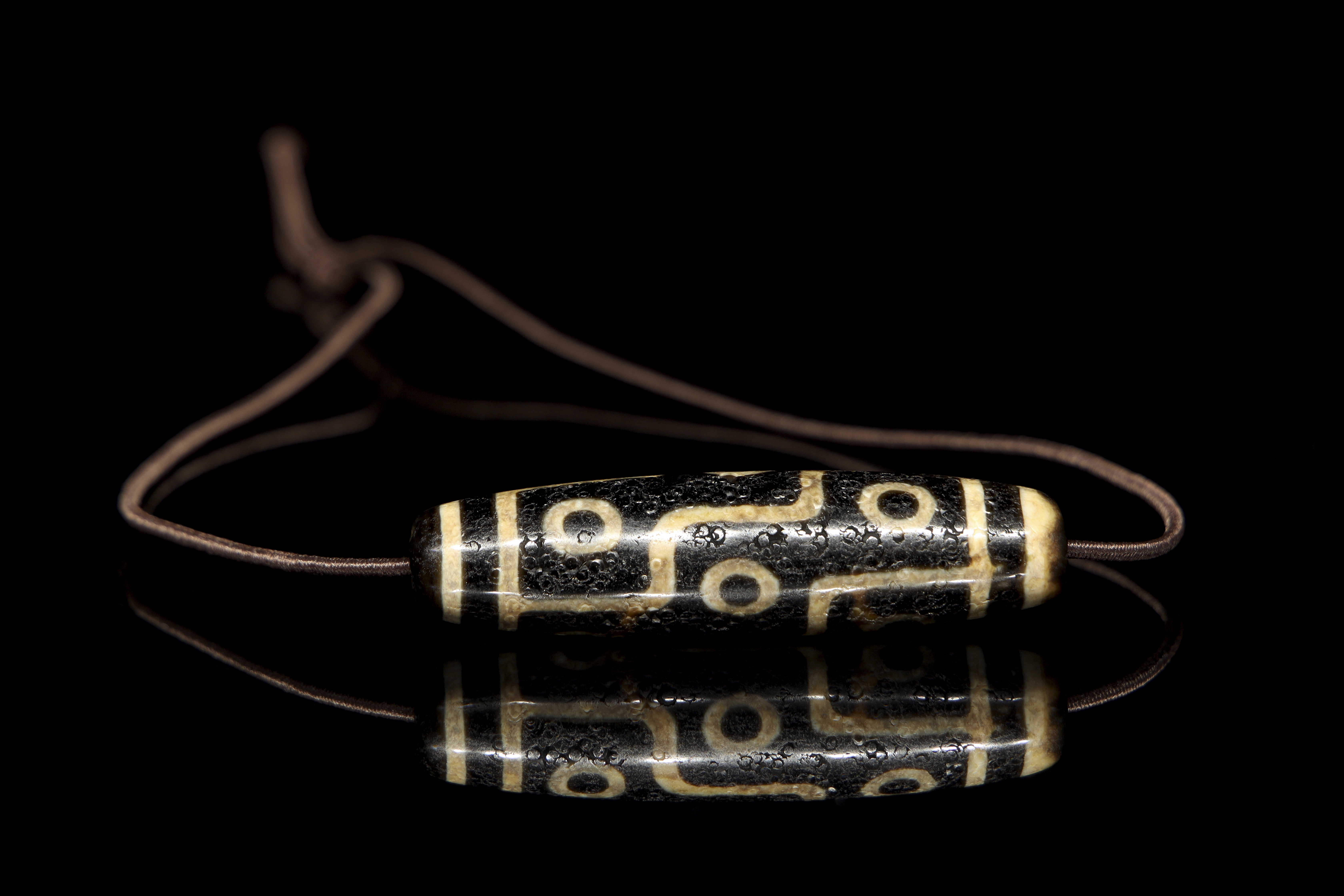 Agate Dzi bead, tubular and slightly barrel-shaped. The surface of the dark brown stone is decorated with spheres and lines in ochre tones. The decoration represents the “nine eyes” motif, interspersed with wave patterns and geometric motifs.