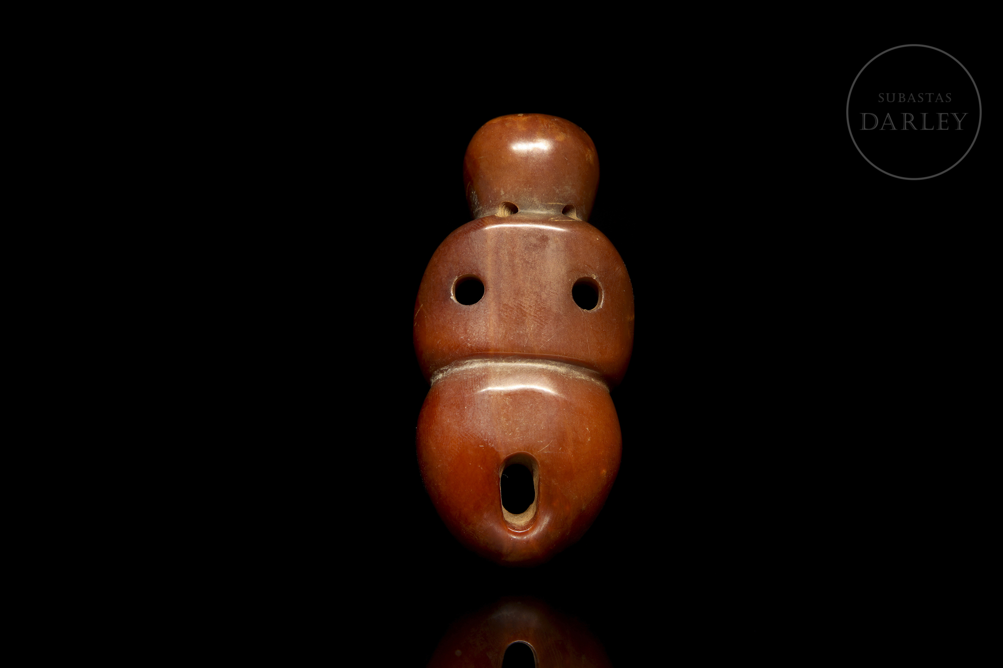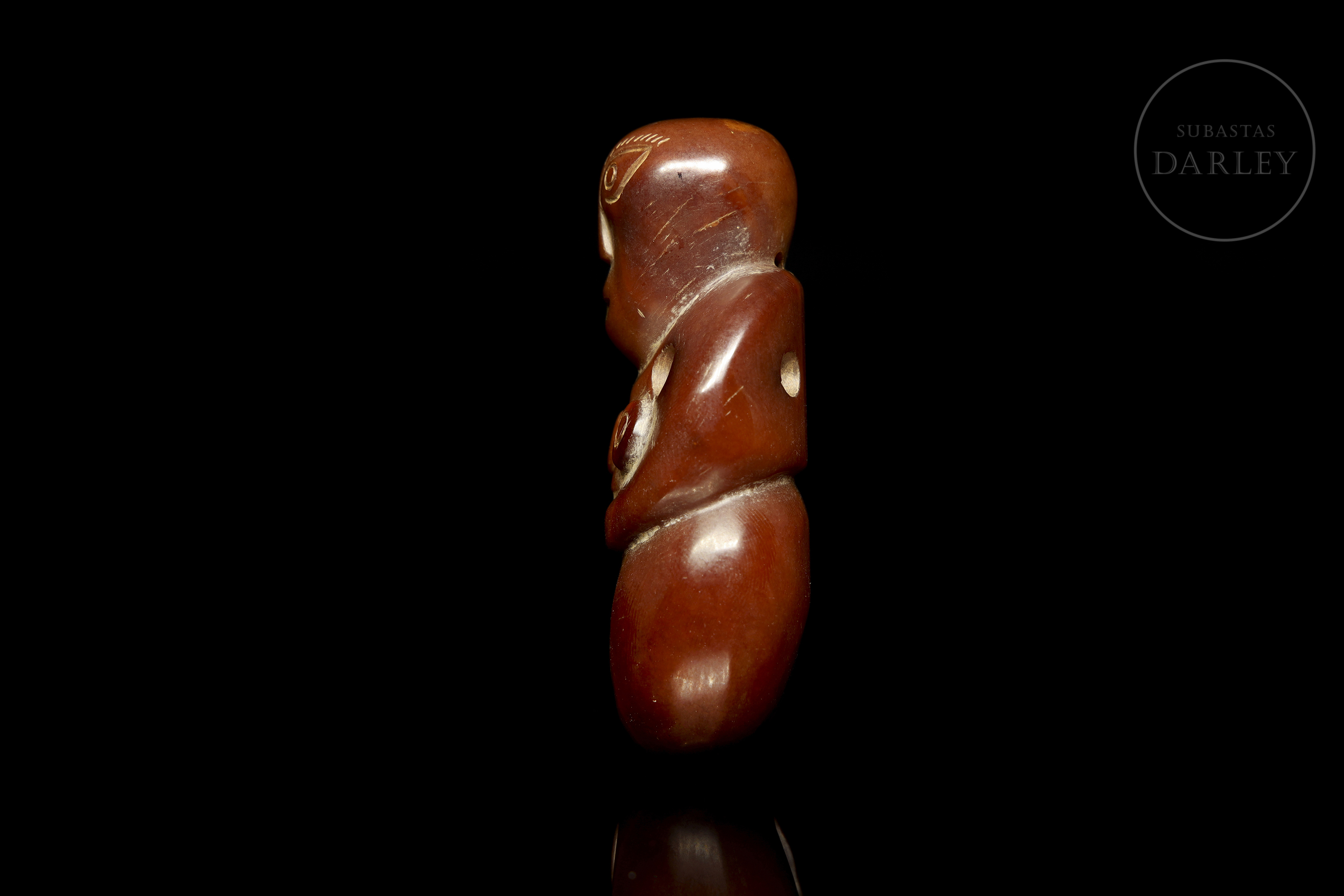 Reddish jade carved figure representing a highly stylised anthropomorphic figure or ‘monkey-person’. The piece, which is round and polished, schematically defines the head, torso, breasts and limbs. It has three large holes for possible use as a pendant.
