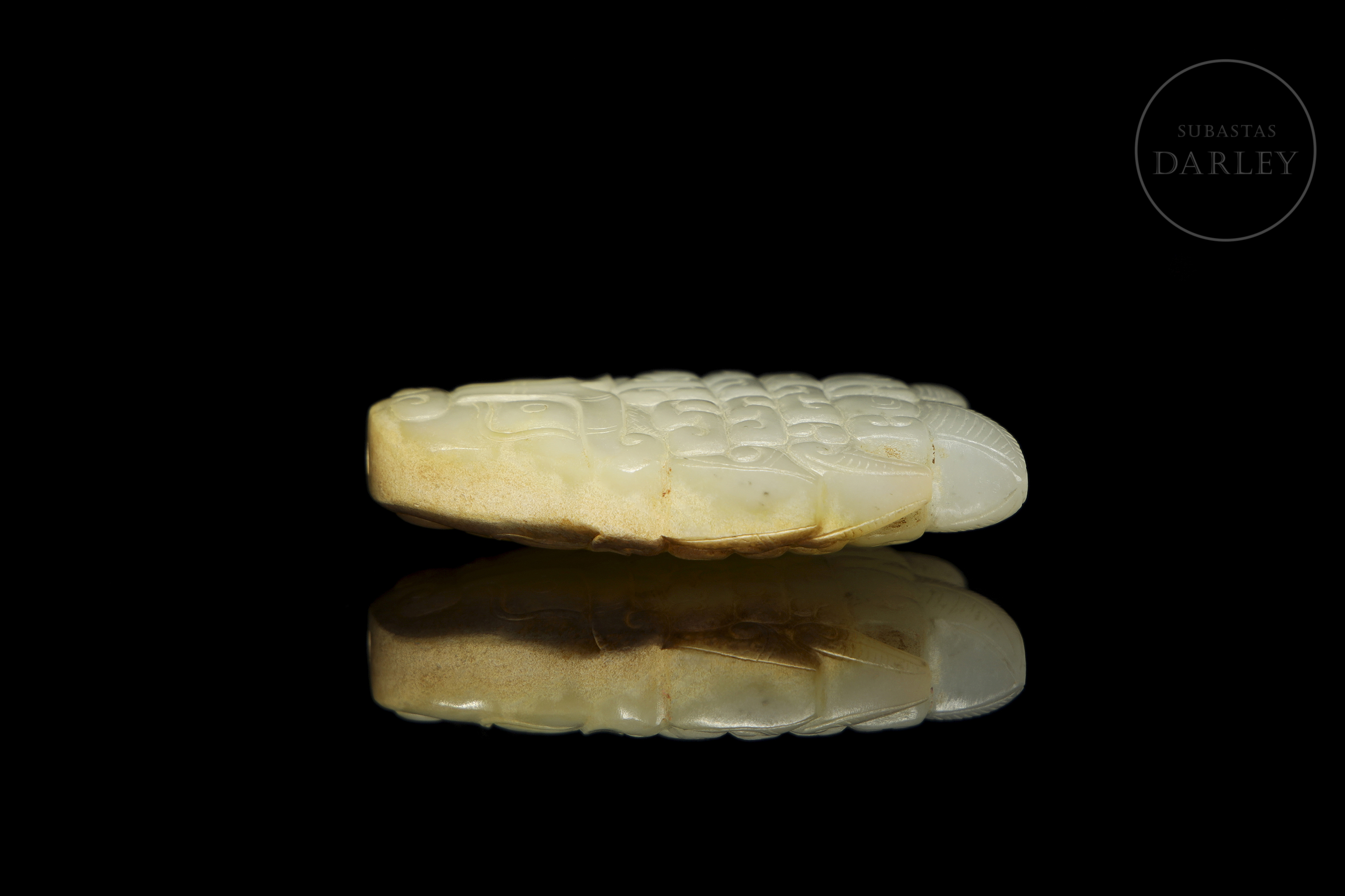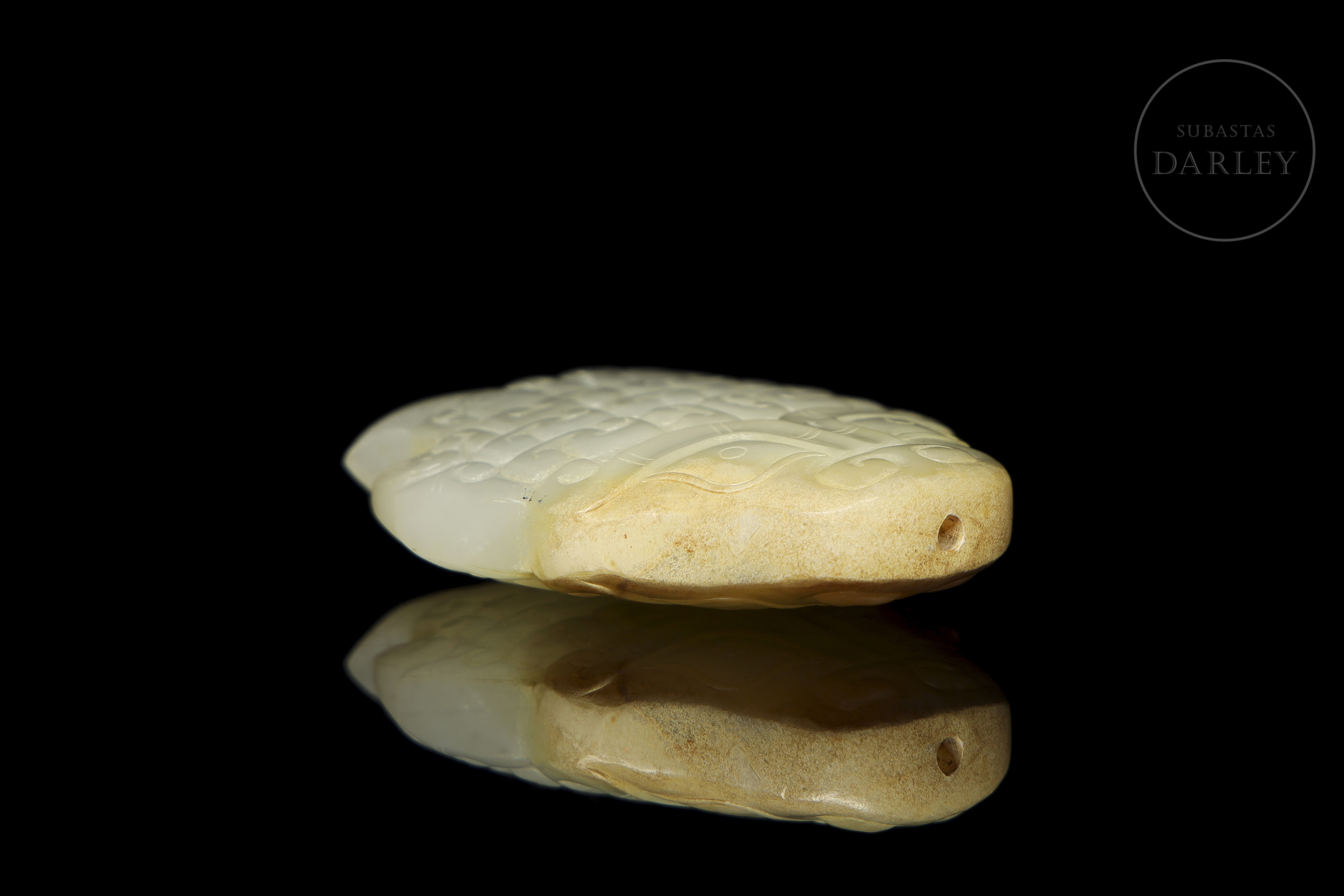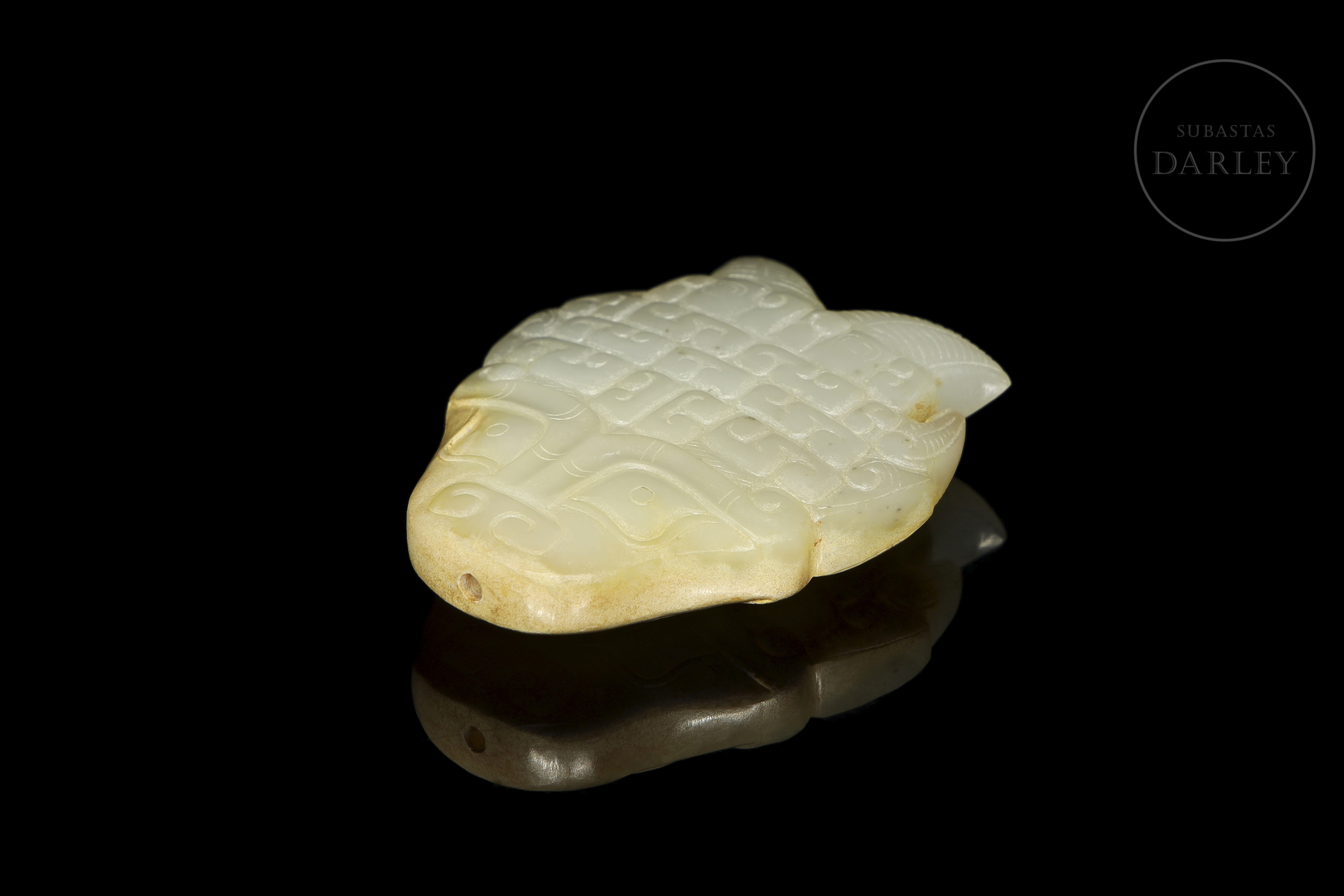 White carved jade with areas of ochre-coloured patina, all with a translucent finish. The piece depicts the face of a ram, with a penetrating gaze, curly coat and pointed horns, all rendered in incised detail in an archaic style. It shows signs of wear due to ageing. Han Dynasty (206 BC - 220 AD) or later.