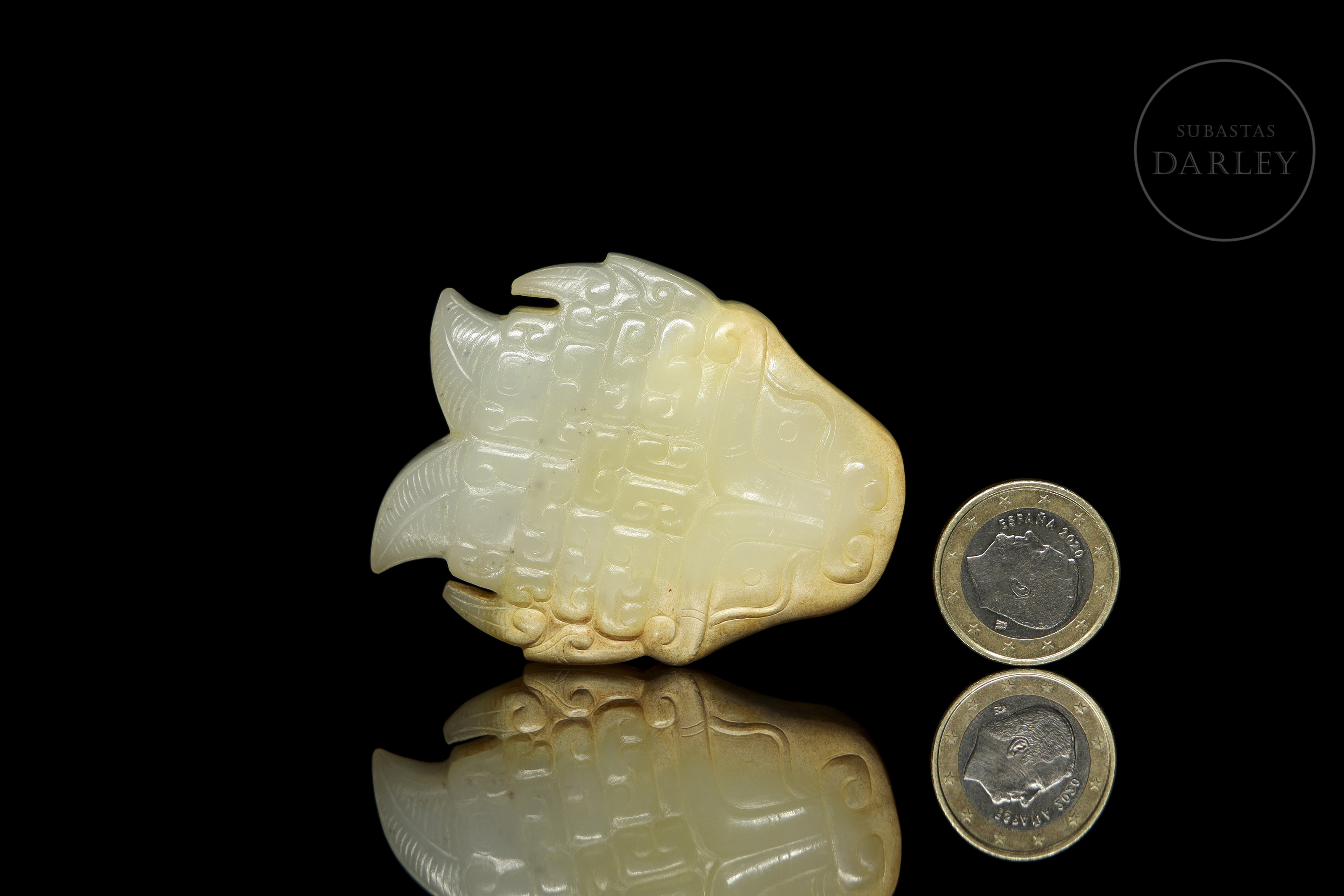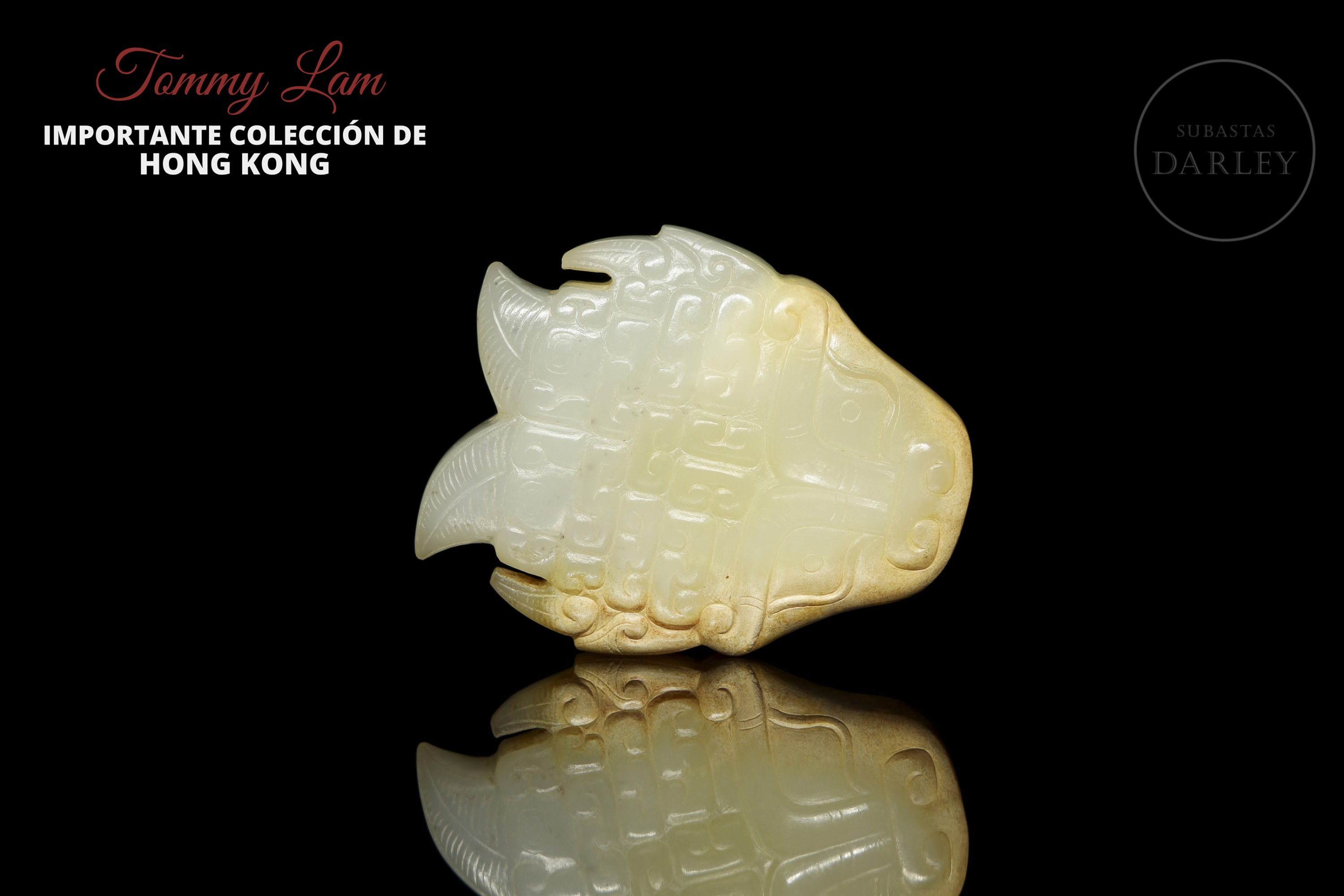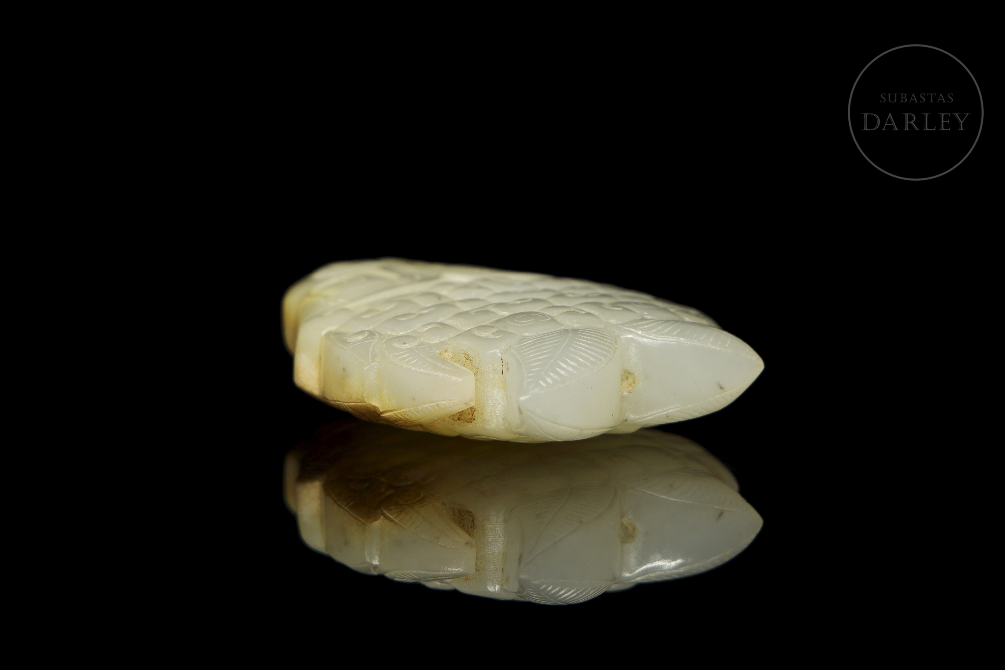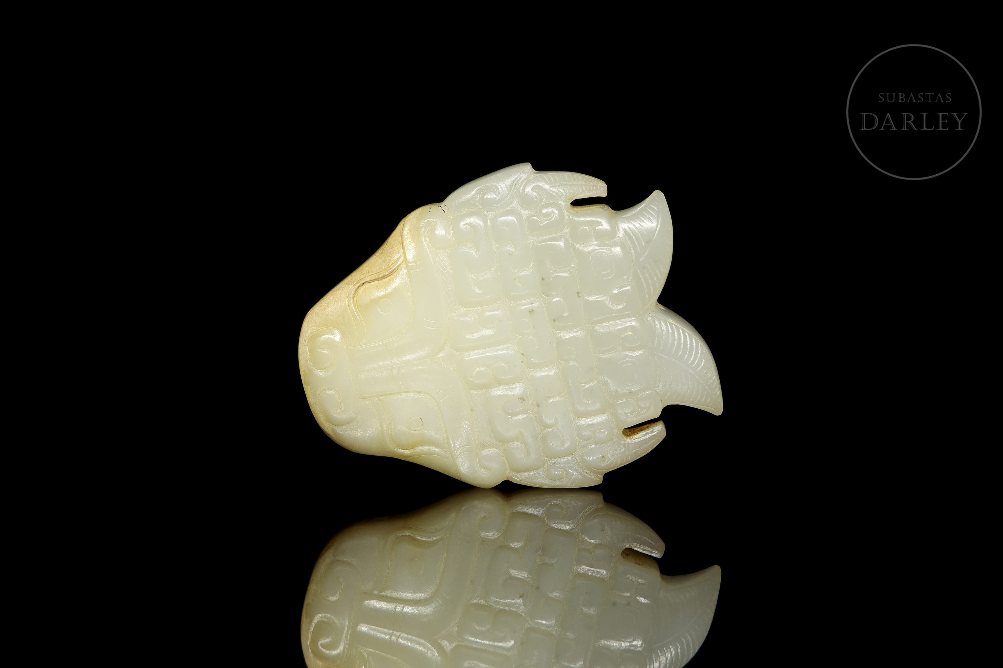 White carved jade with areas of ochre-coloured patina, all with a translucent finish. The piece depicts the face of a ram, with a penetrating gaze, curly coat and pointed horns, all rendered in incised detail in an archaic style. It shows signs of wear due to ageing. Han Dynasty (206 BC - 220 AD) or later.