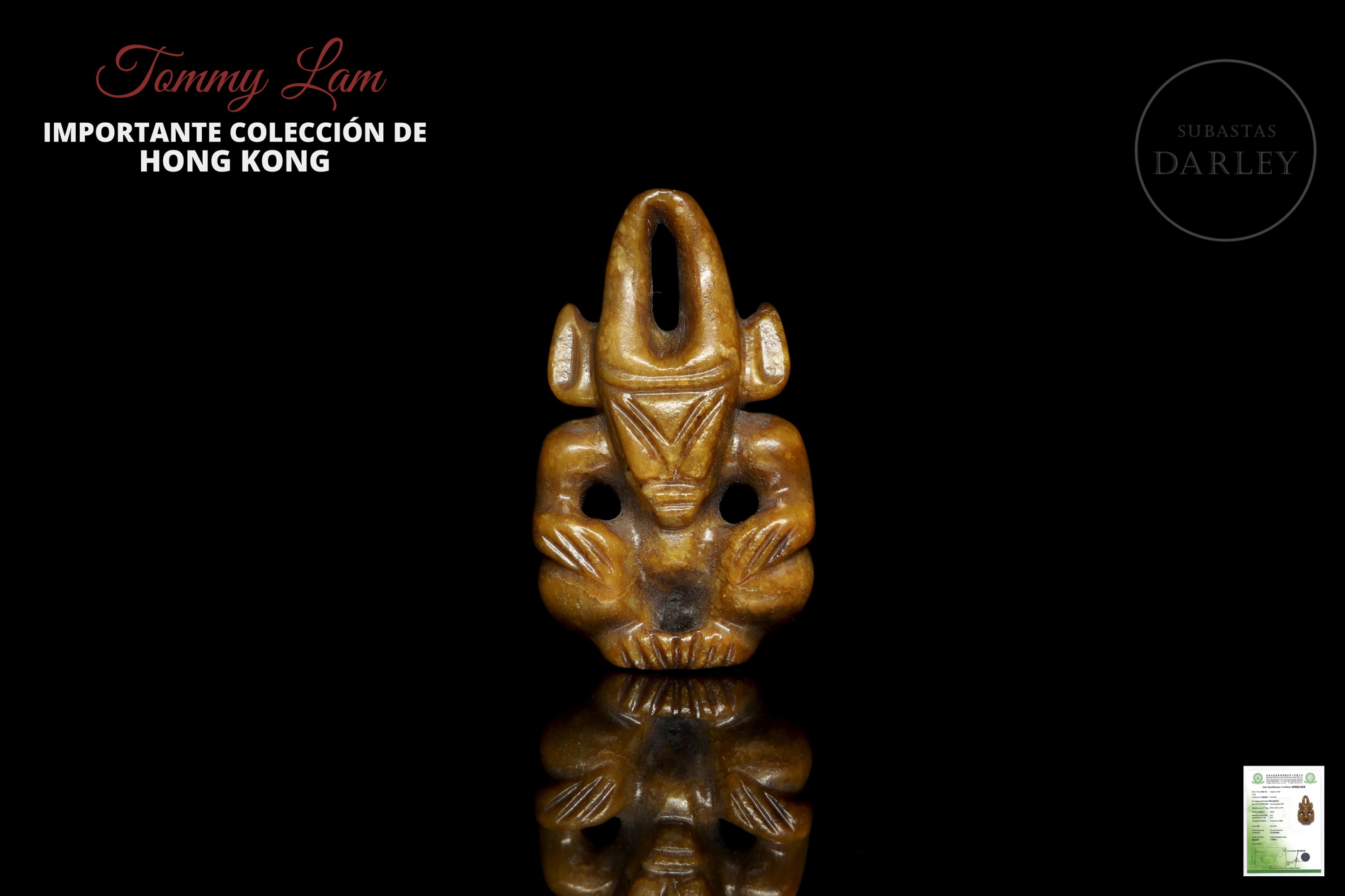Amulet carved from honey-colored jade stone. It depicts a seated anthropomorphic deity, sometimes identified as a “sun god.” The highly stylized and abstract figure has a head with a pointed headdress and large ears or horns. It is depicted in a squatting position, with its arms bent and resting on its knees.