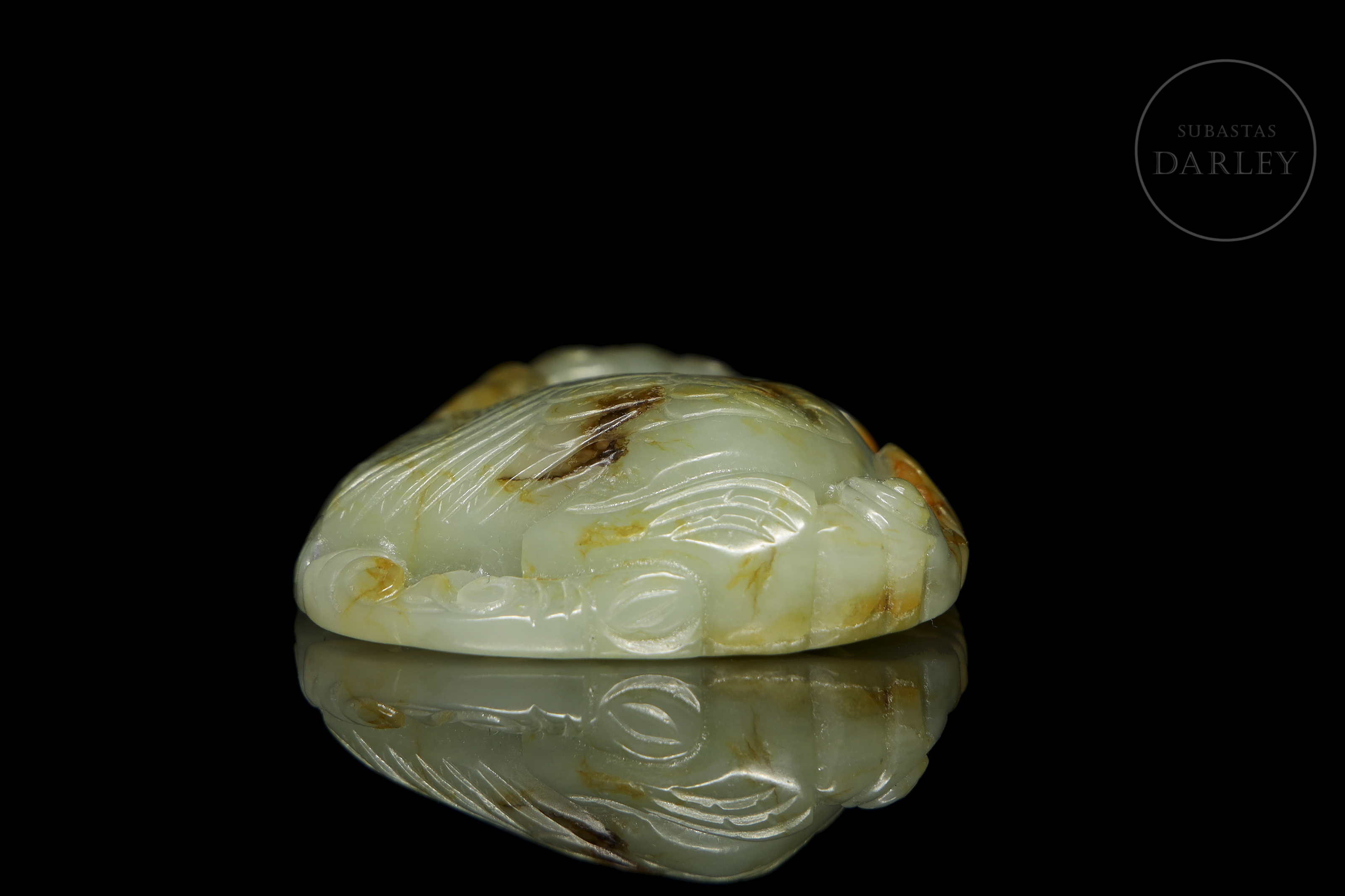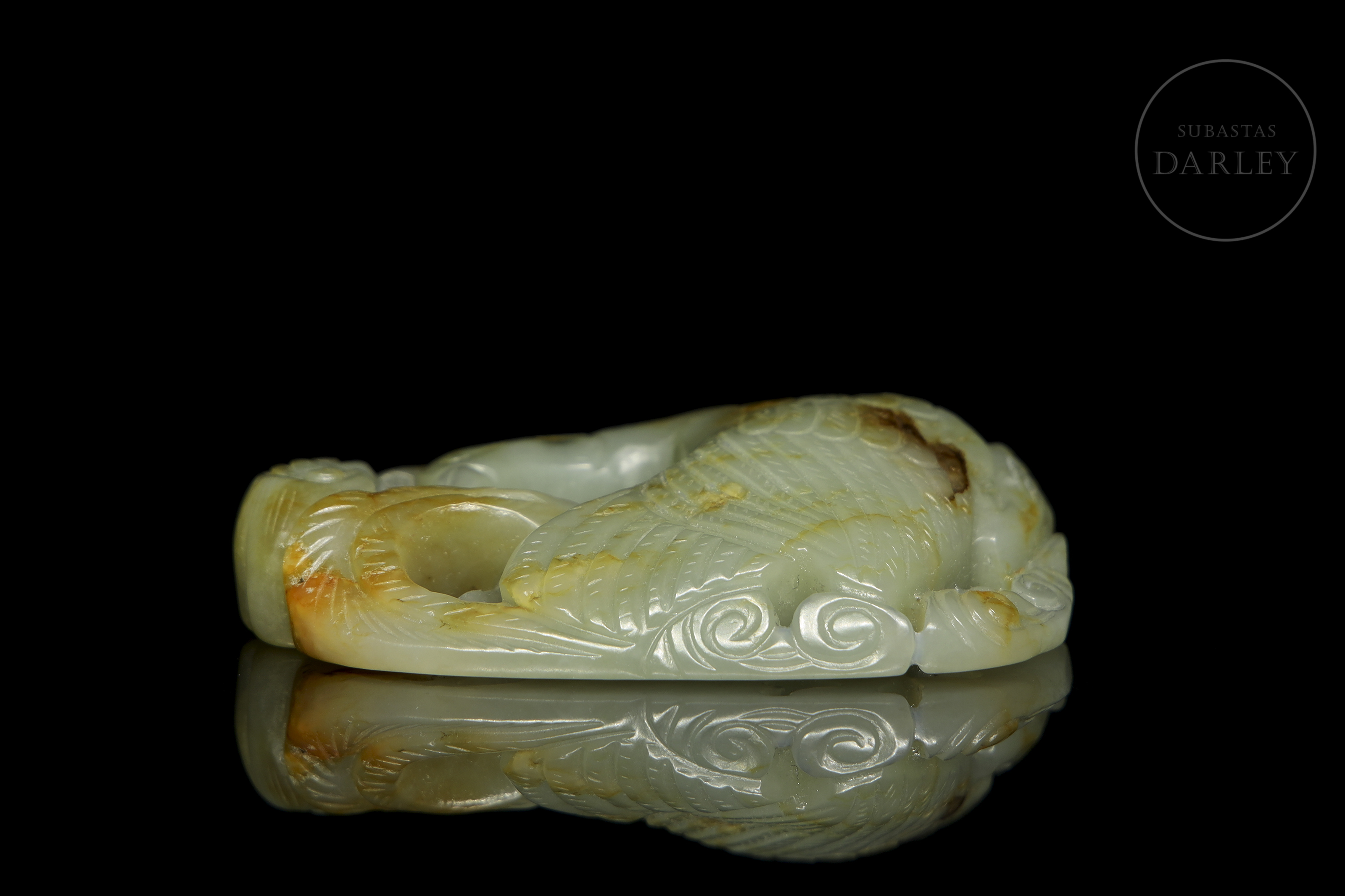 Openwork pendant in greenish jade with brown and orange veins, depicting a bird in profile with its wings folded and its head looking towards its back, among stylised branches and ruyis. The piece shows detailed work on the plumage and the openwork of the branches surrounding the bird. Qing Dynasty (1644–1912).