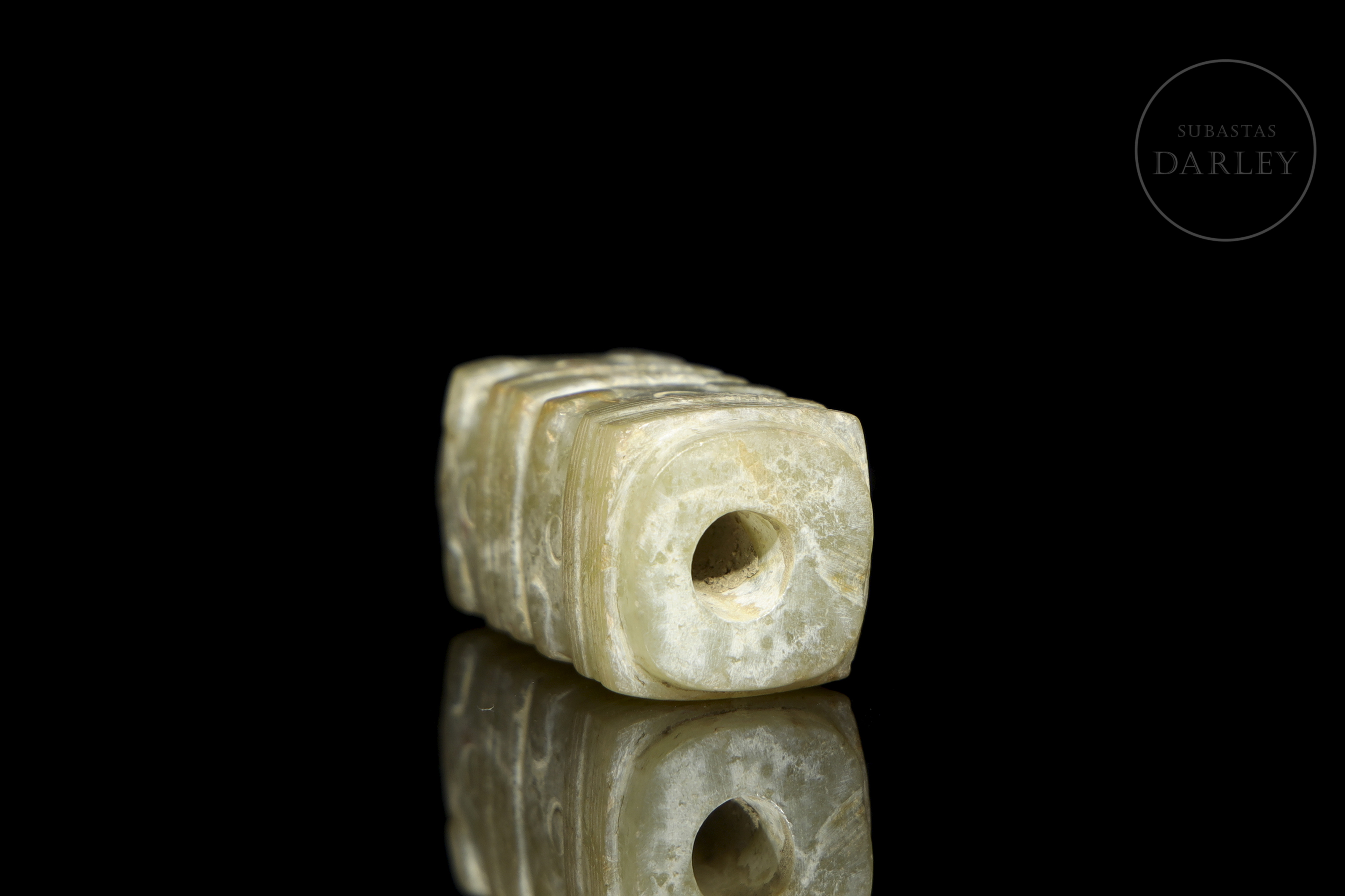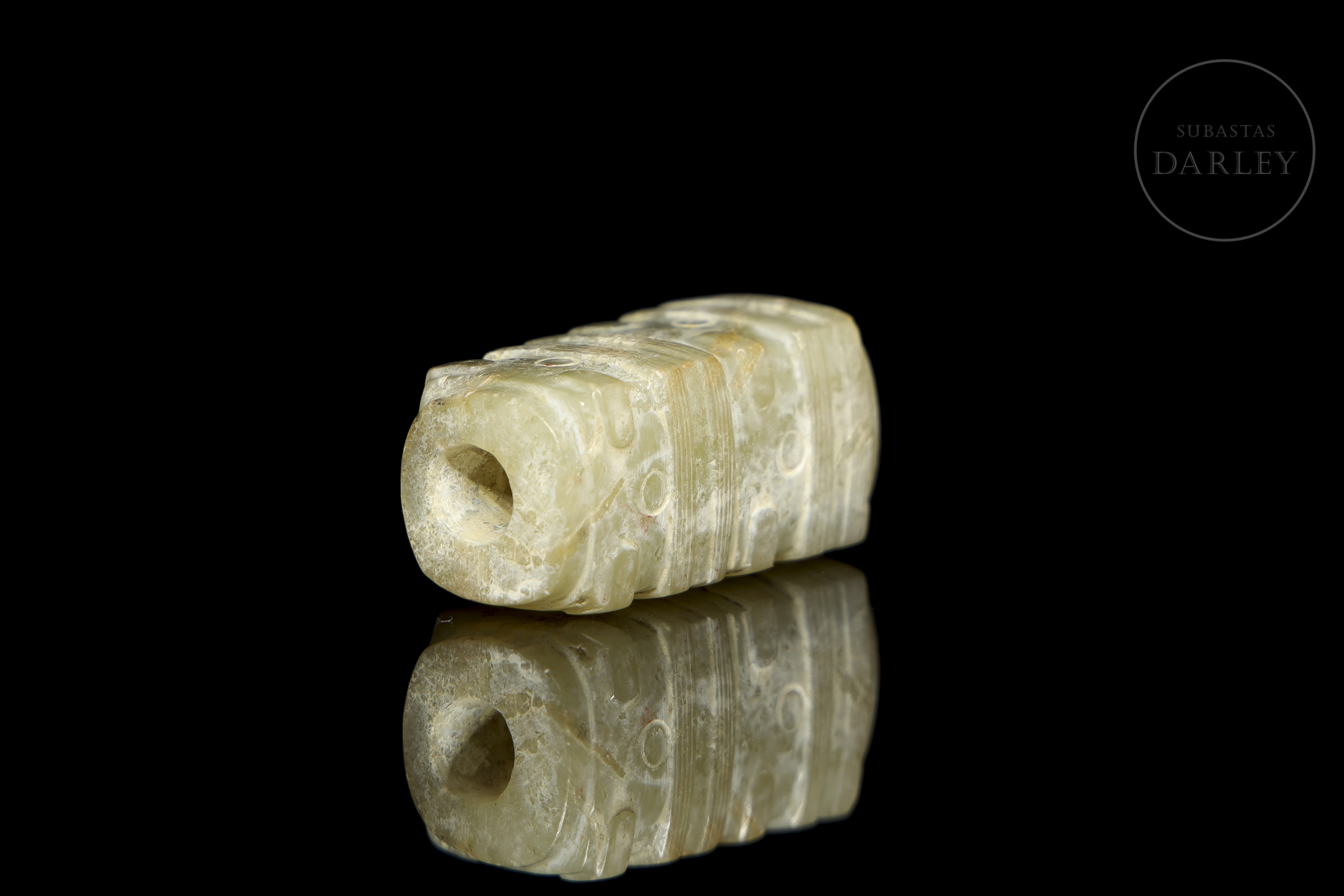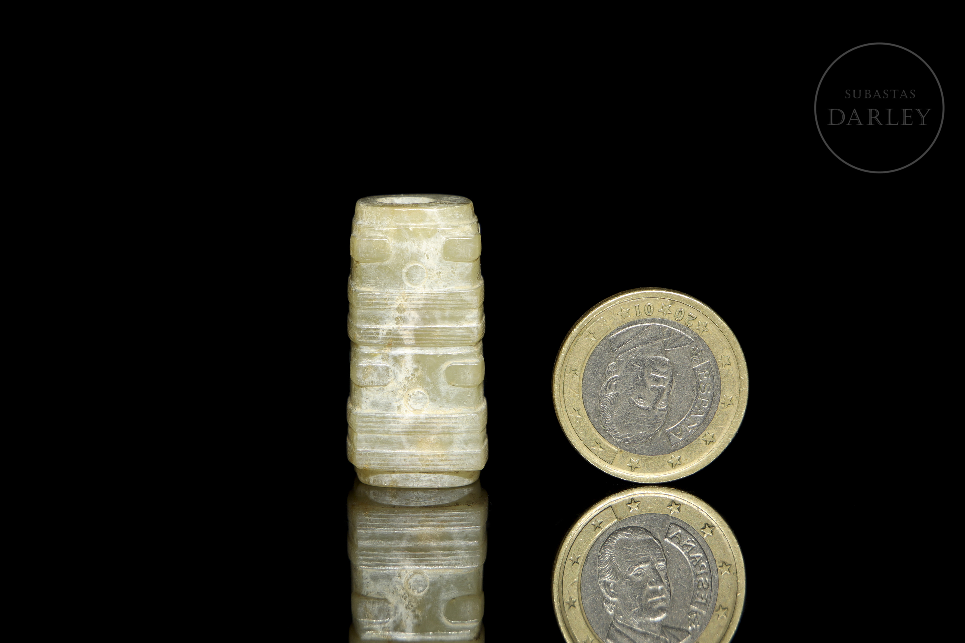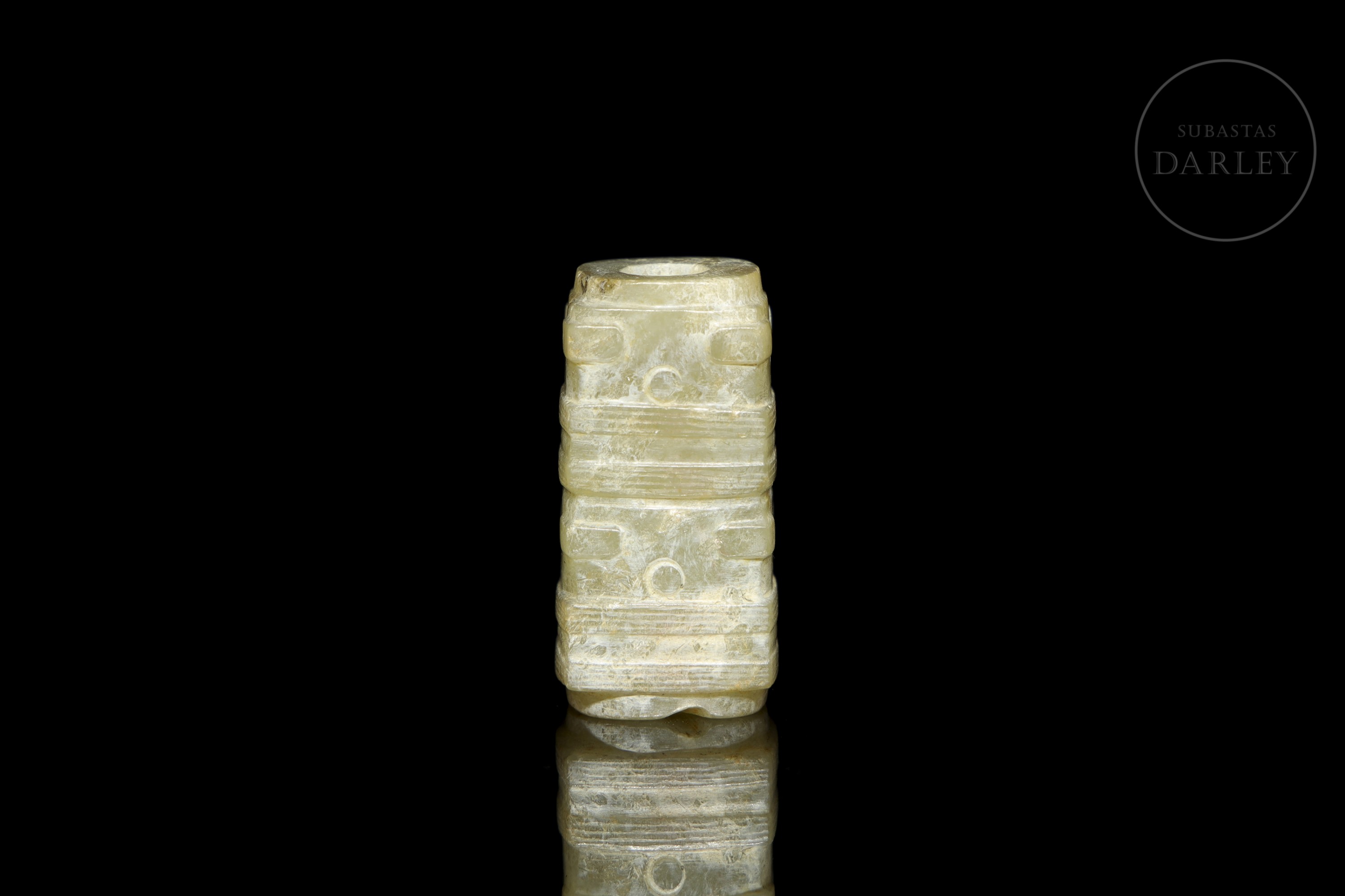 Whitish jade pendant with brown veins and surface patina. The piece is shaped like a cong, with a cylindrical interior, perforated lengthwise, and a square exterior decorated with linear incisions and circles in relief.