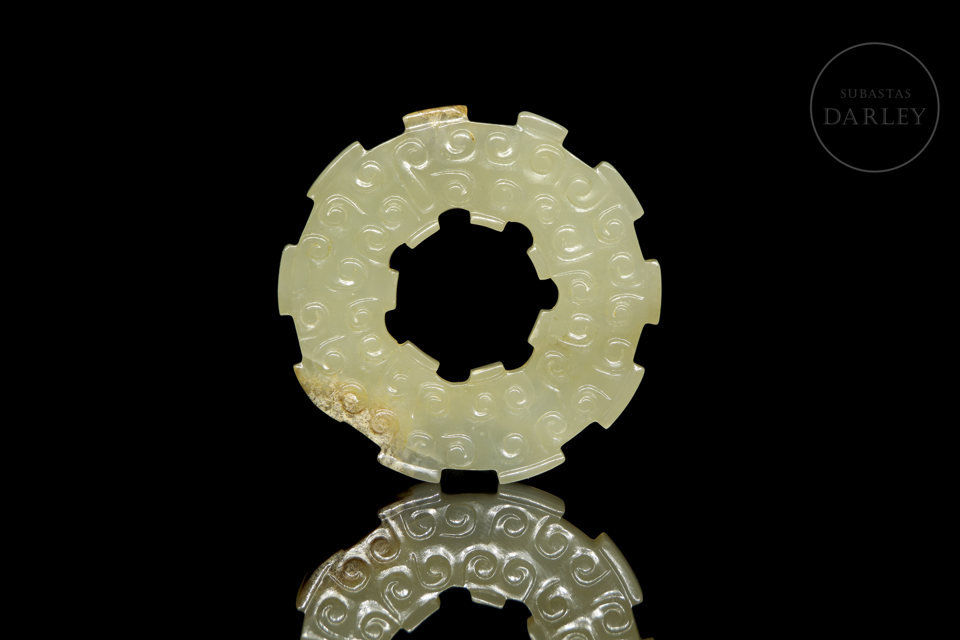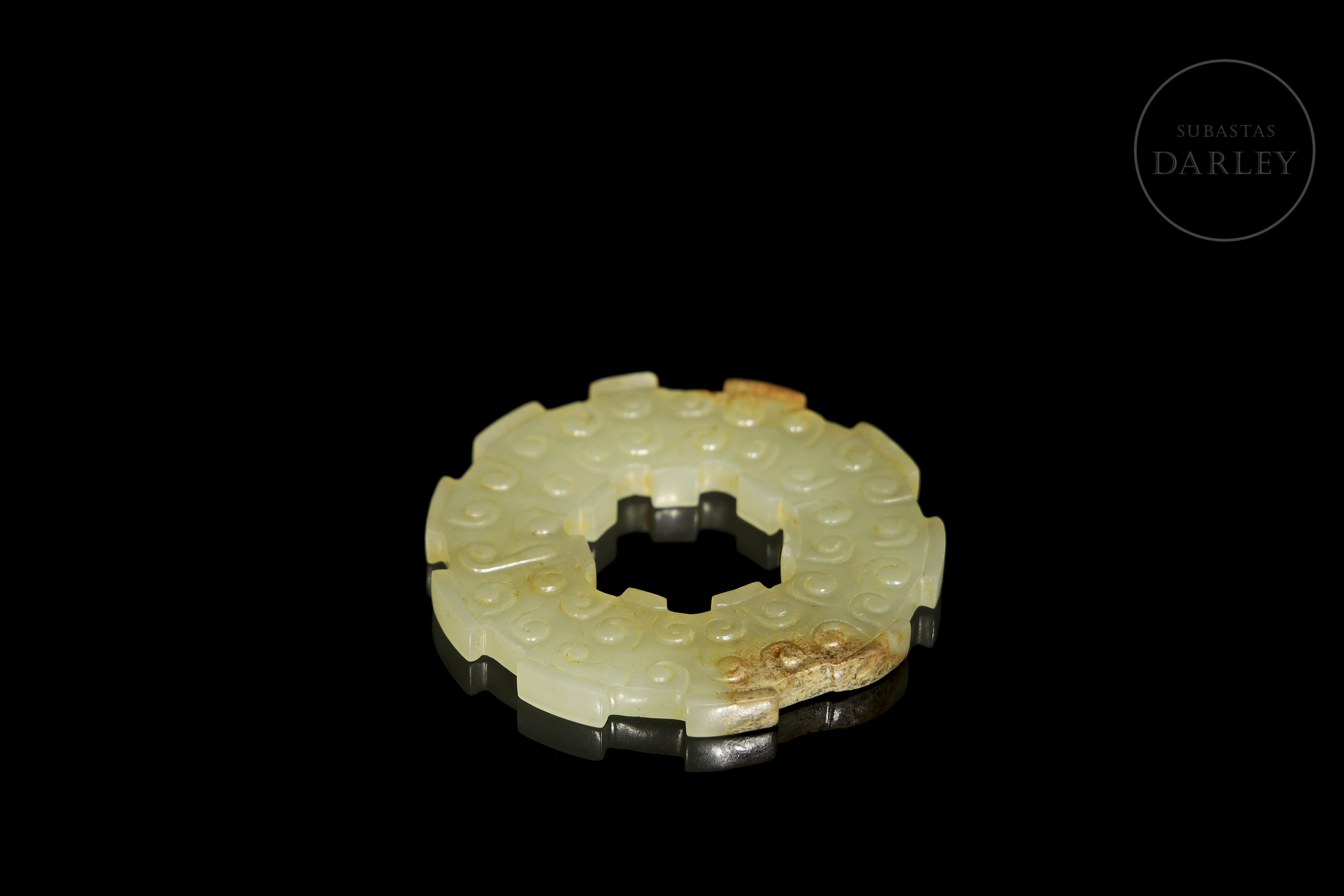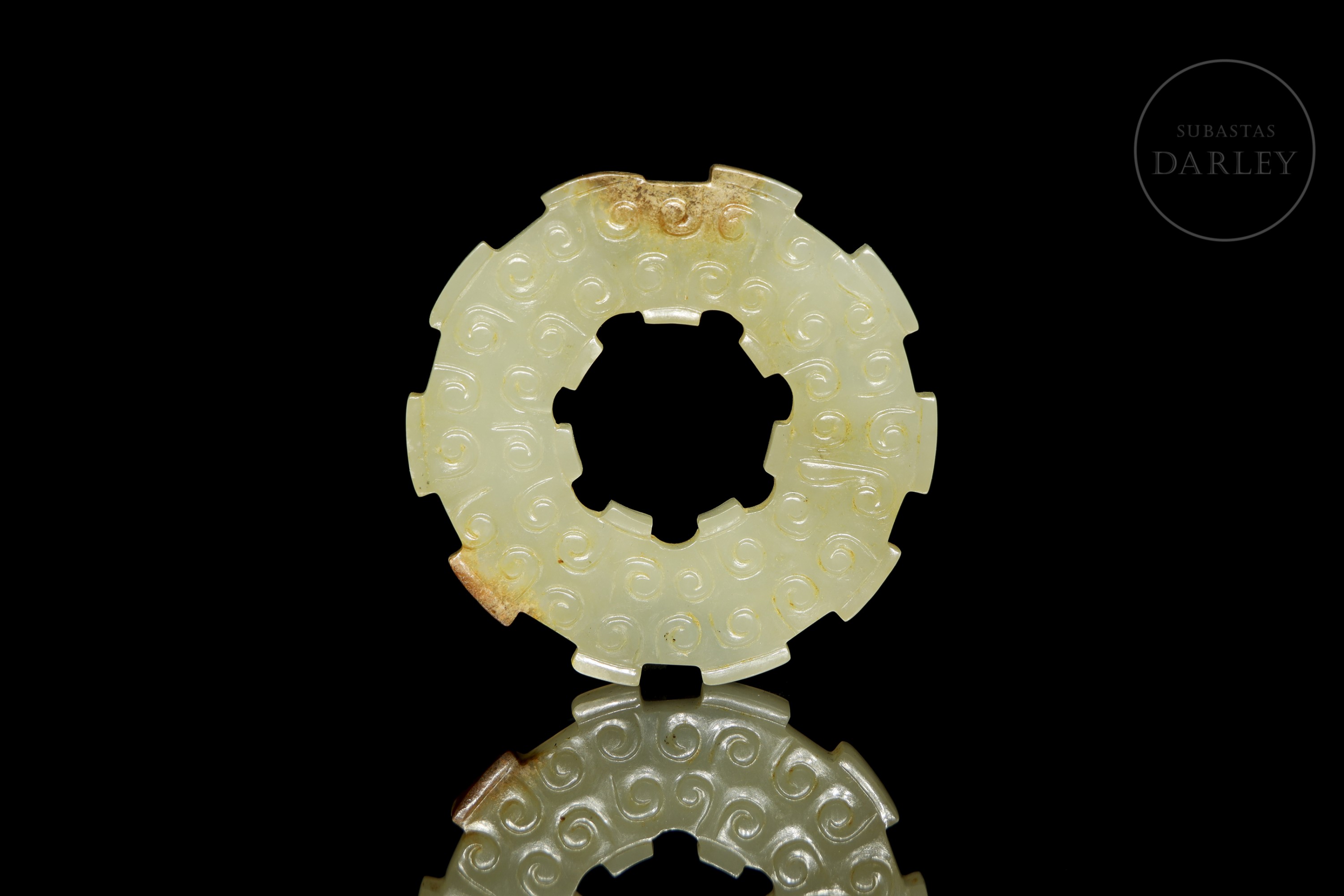 Circular jade pendant in a light shade with slight areas of amber and ochre patina. It has a serrated outer edge, decorated with incised spiral ‘leiwen’ motifs. The central hole is also serrated. It shows patina due to ageing.